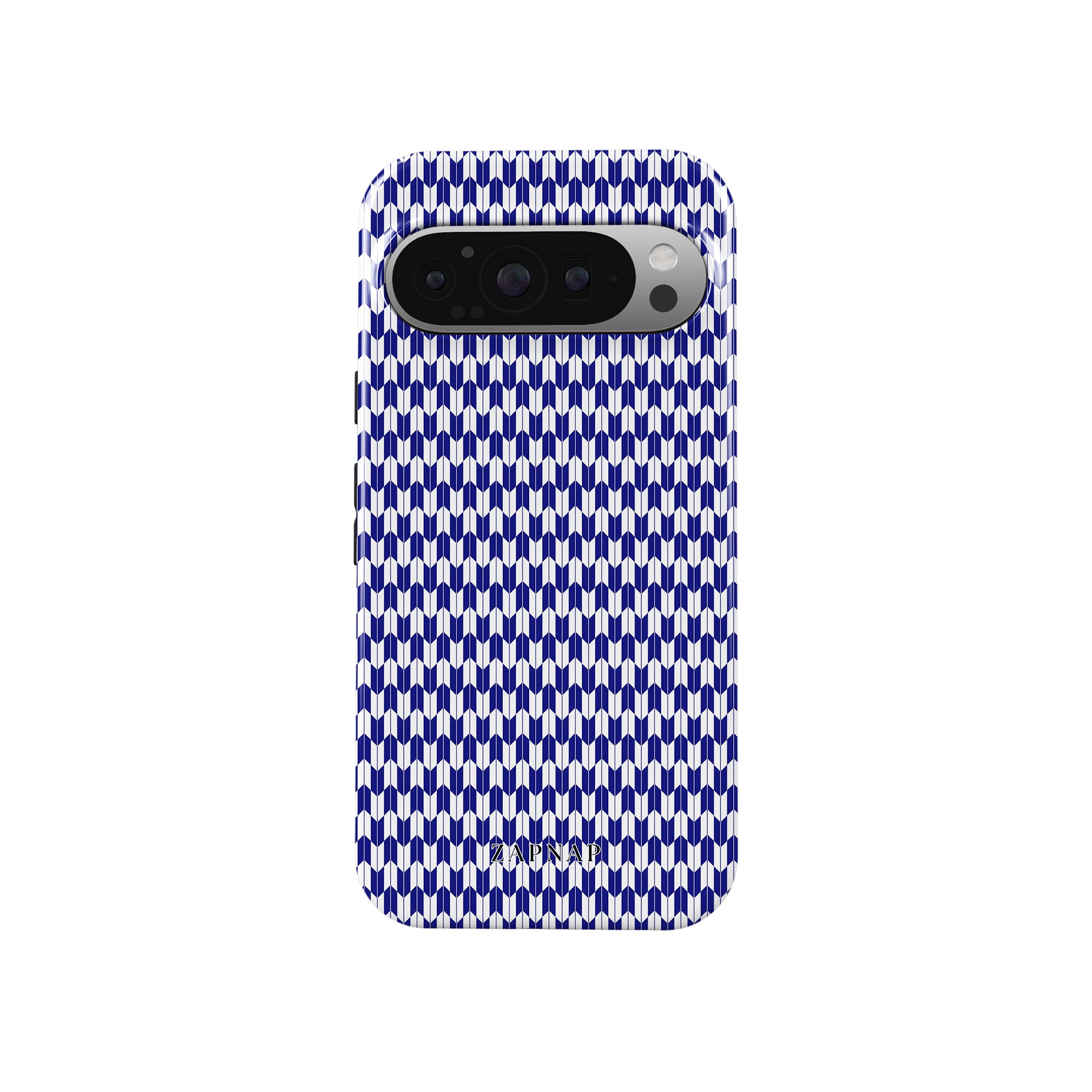 The design features interlocking blue and white geometric shapes, creating a bold yet elegant optical effect. Its clean lines and striking contrasts make it perfect for adding a modern, sophisticated touch to any item.