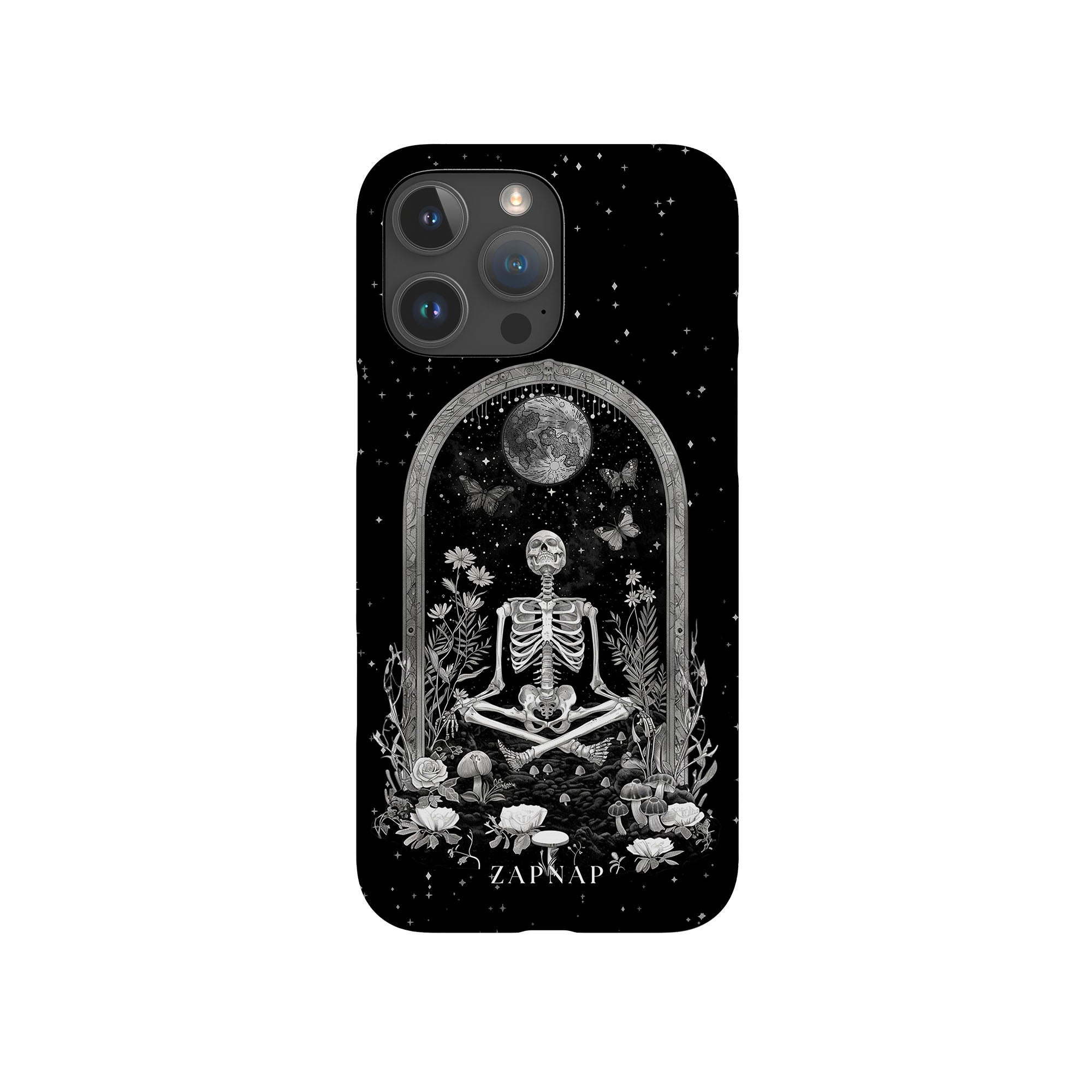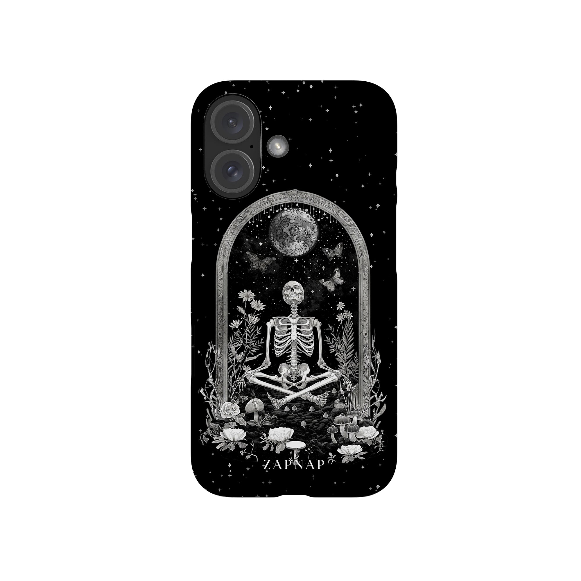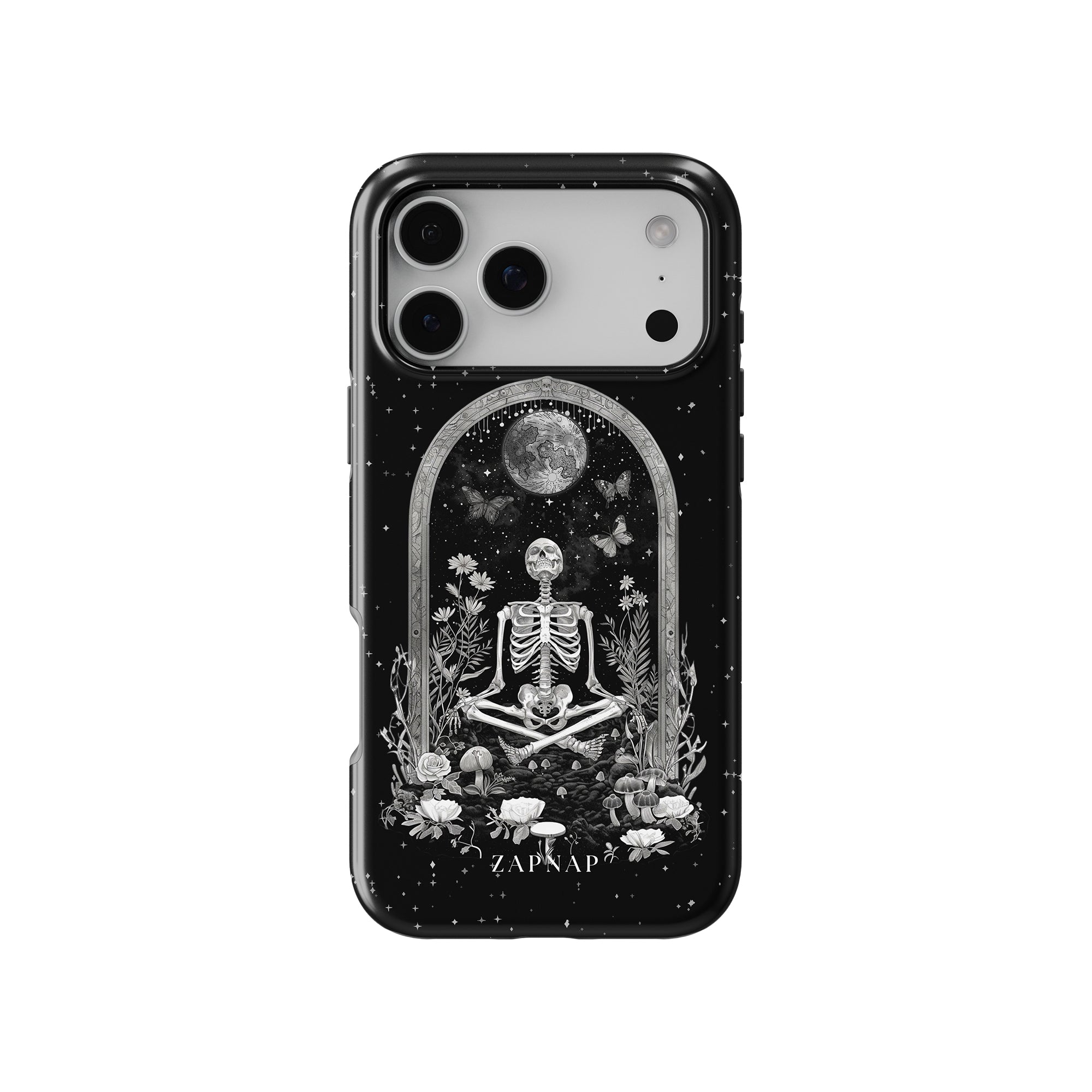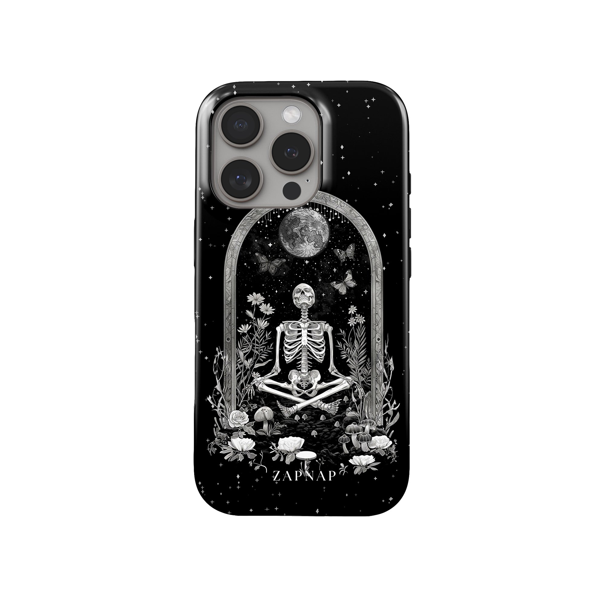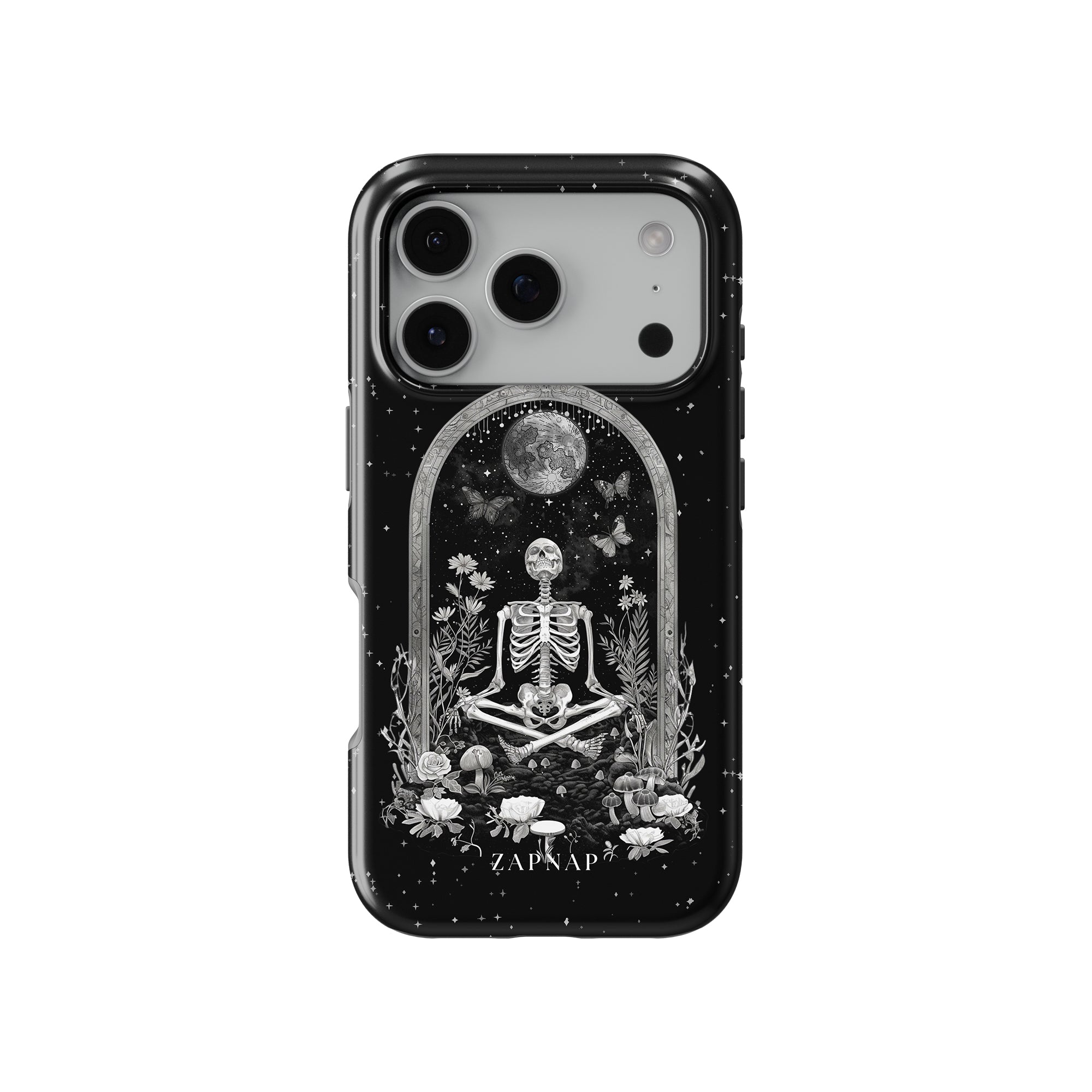 In “Astral Reflection,” a skeleton meditates amidst flowers and mushrooms under an ornate arch. Butterflies flutter around, and the celestial backdrop of stars and the moon enhances the gothic scene, symbolising a peaceful union between the earthly and the cosmic realms.