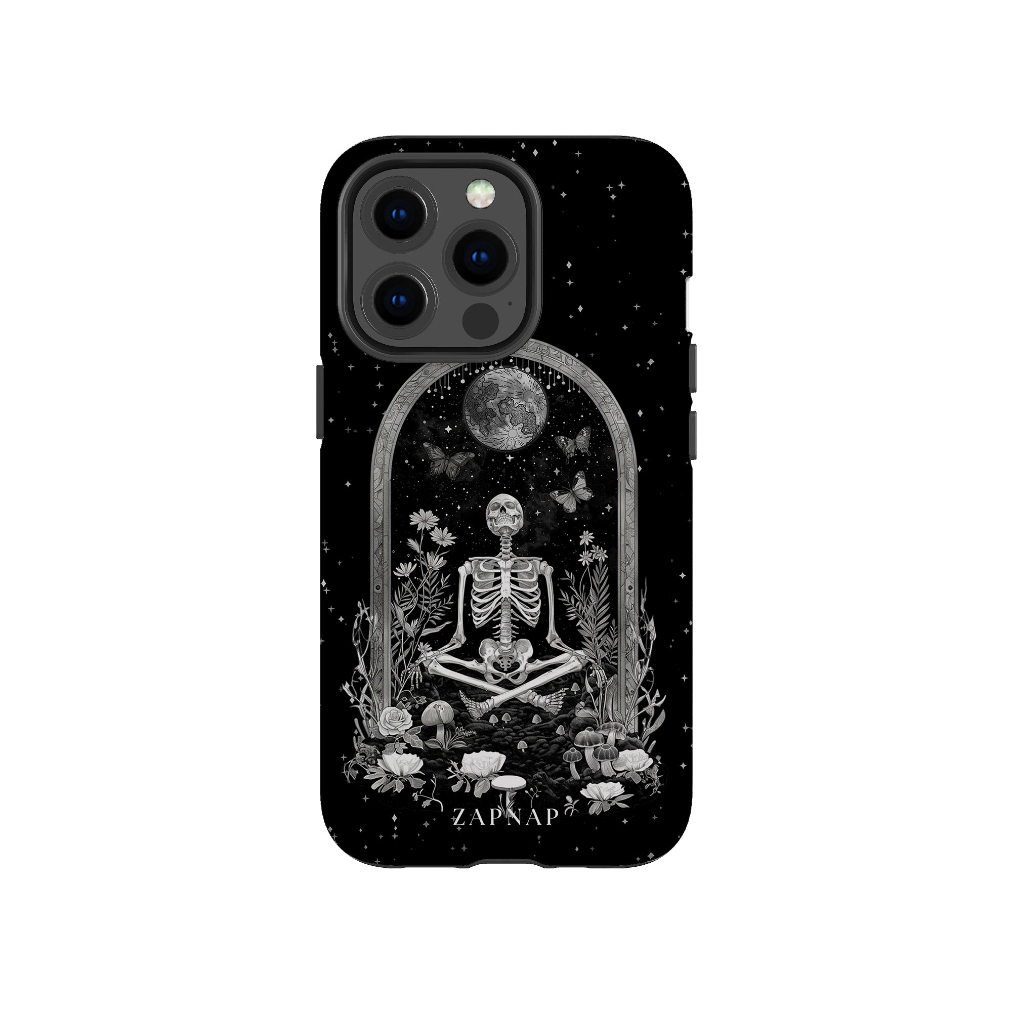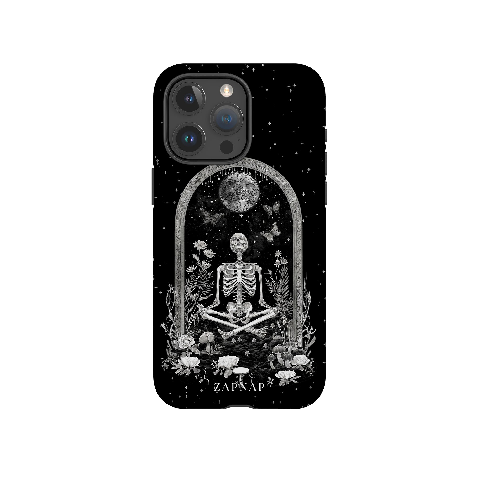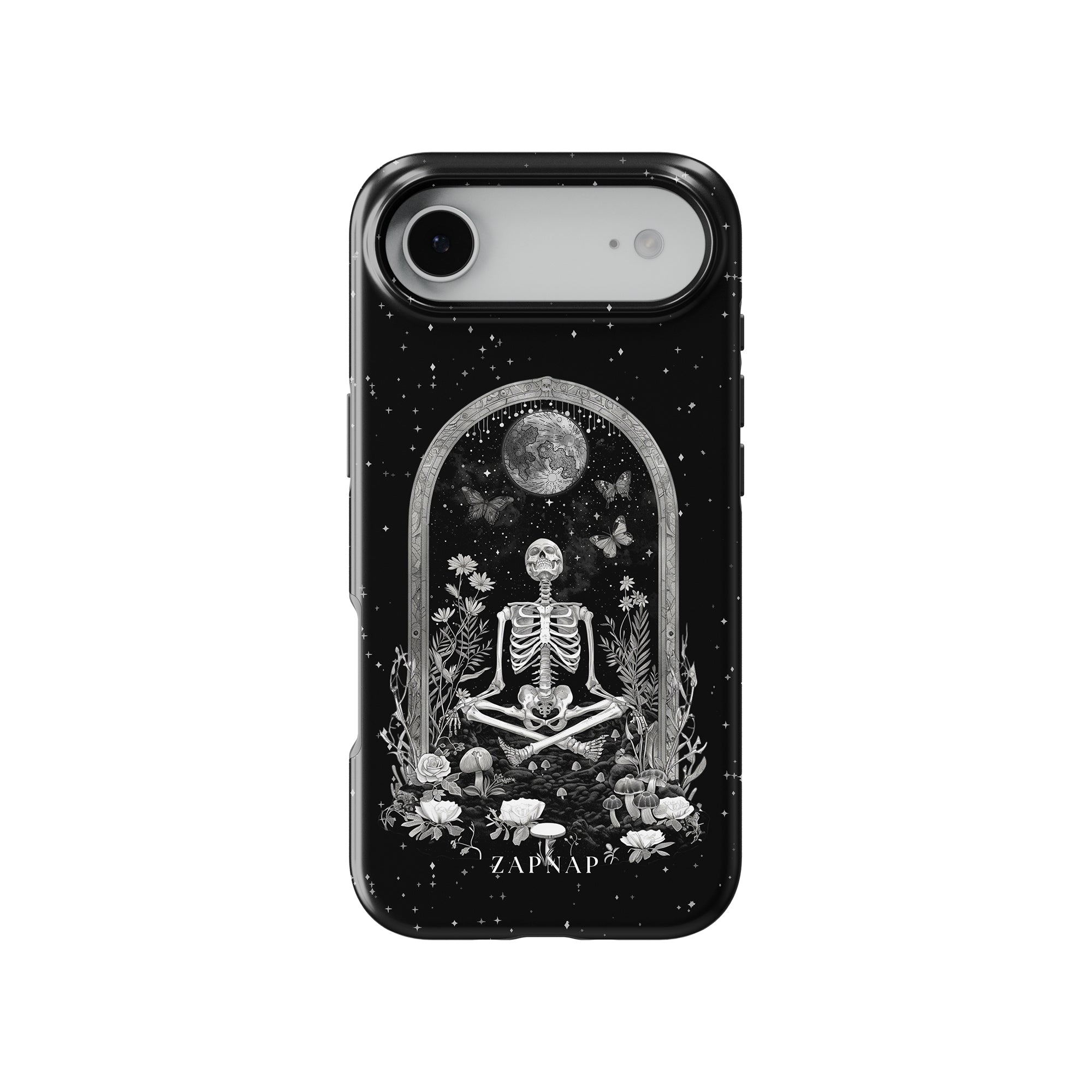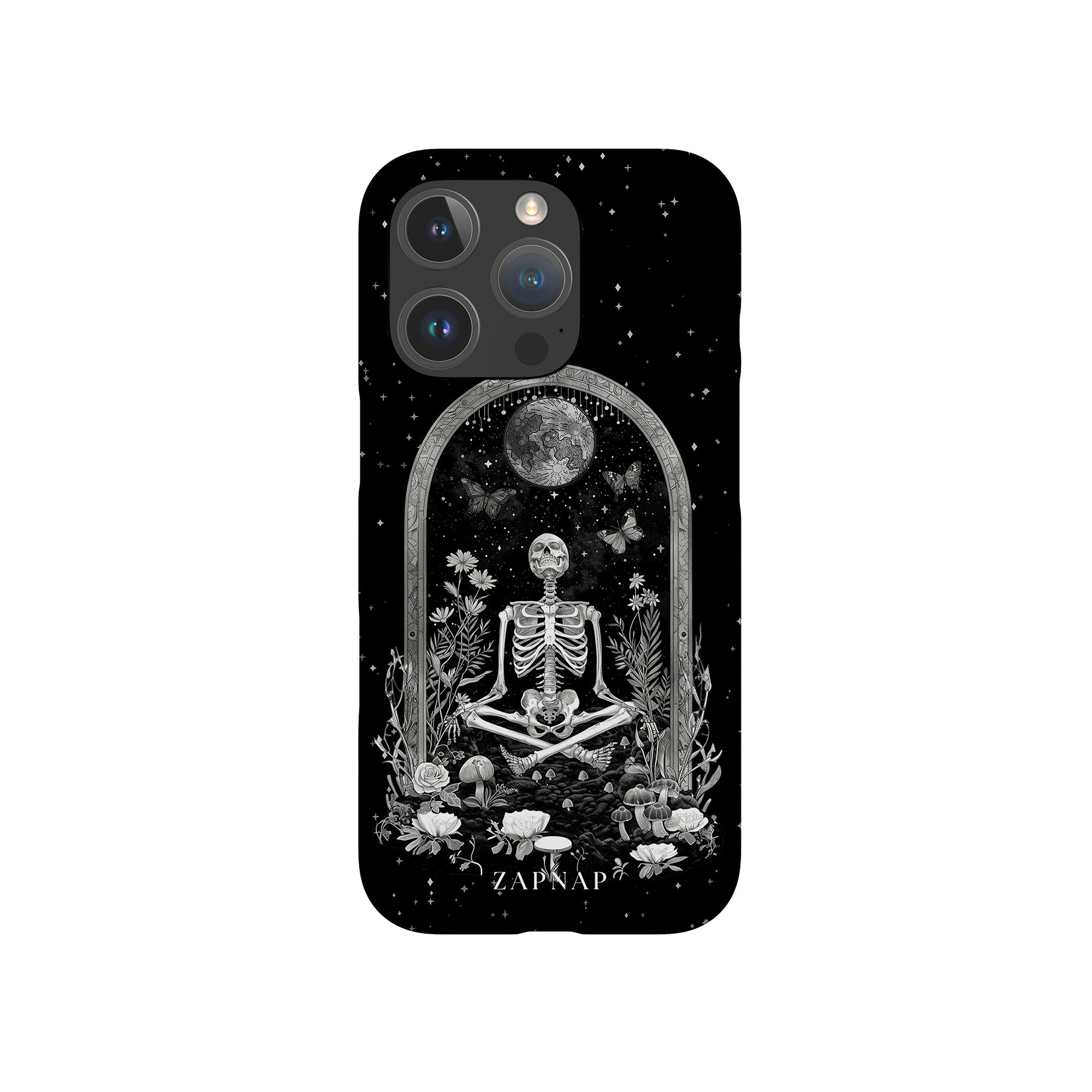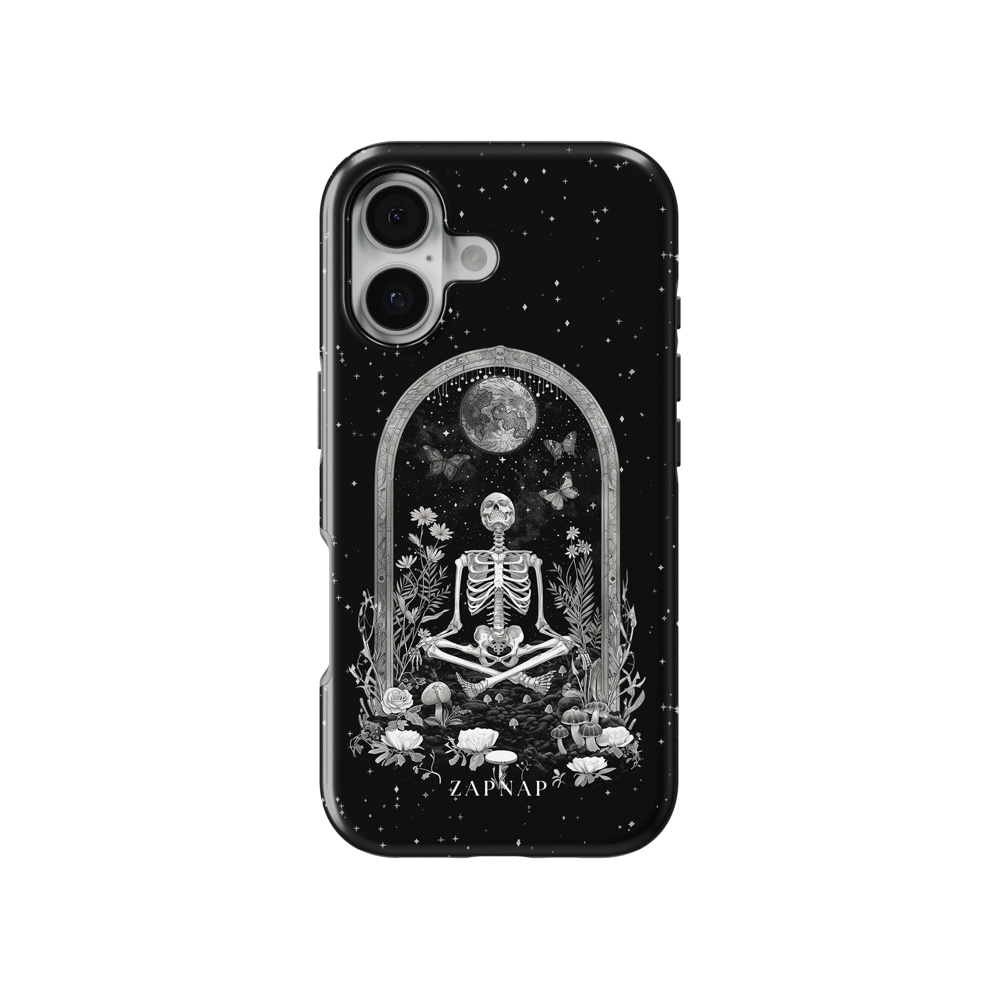In “Astral Reflection,” a skeleton meditates amidst flowers and mushrooms under an ornate arch. Butterflies flutter around, and the celestial backdrop of stars and the moon enhances the gothic scene, symbolising a peaceful union between the earthly and the cosmic realms.