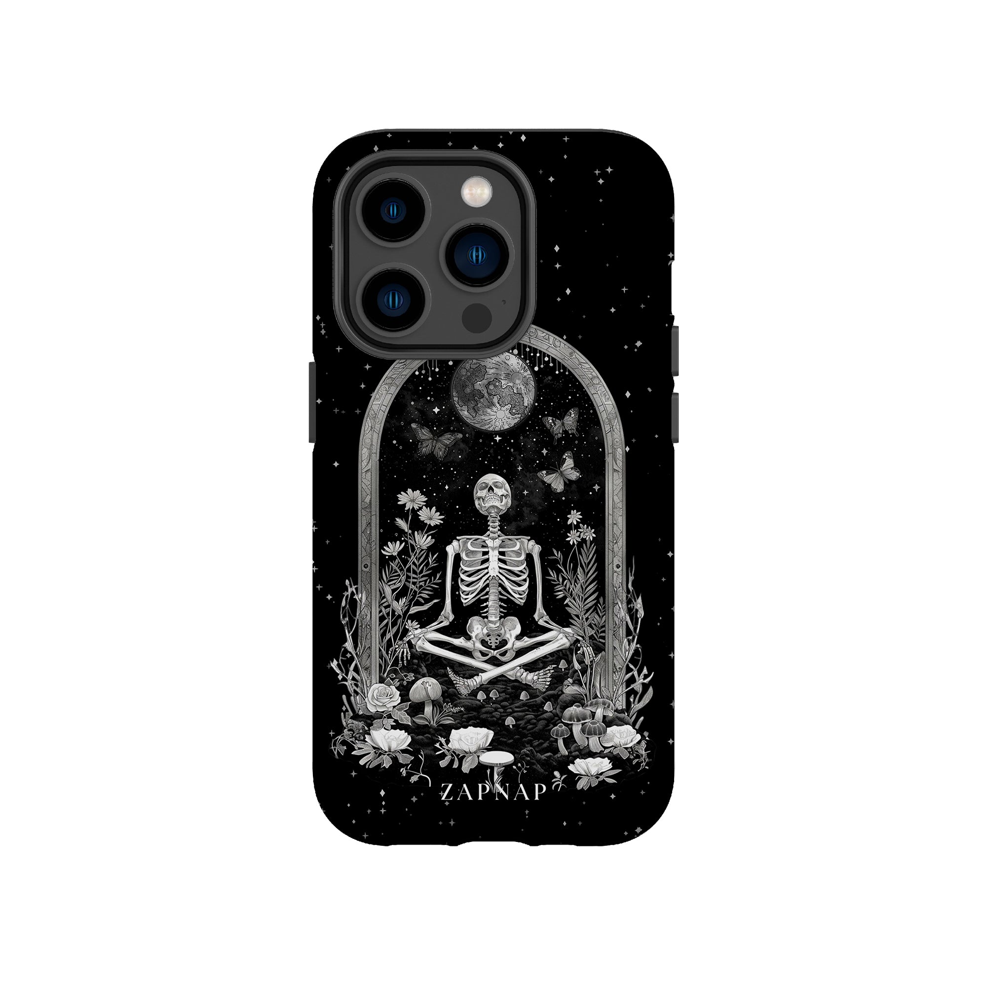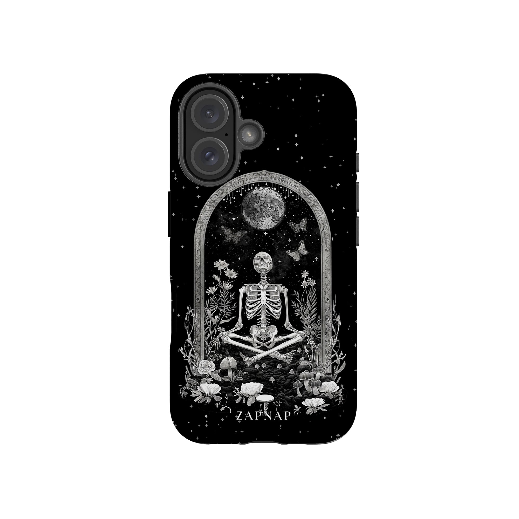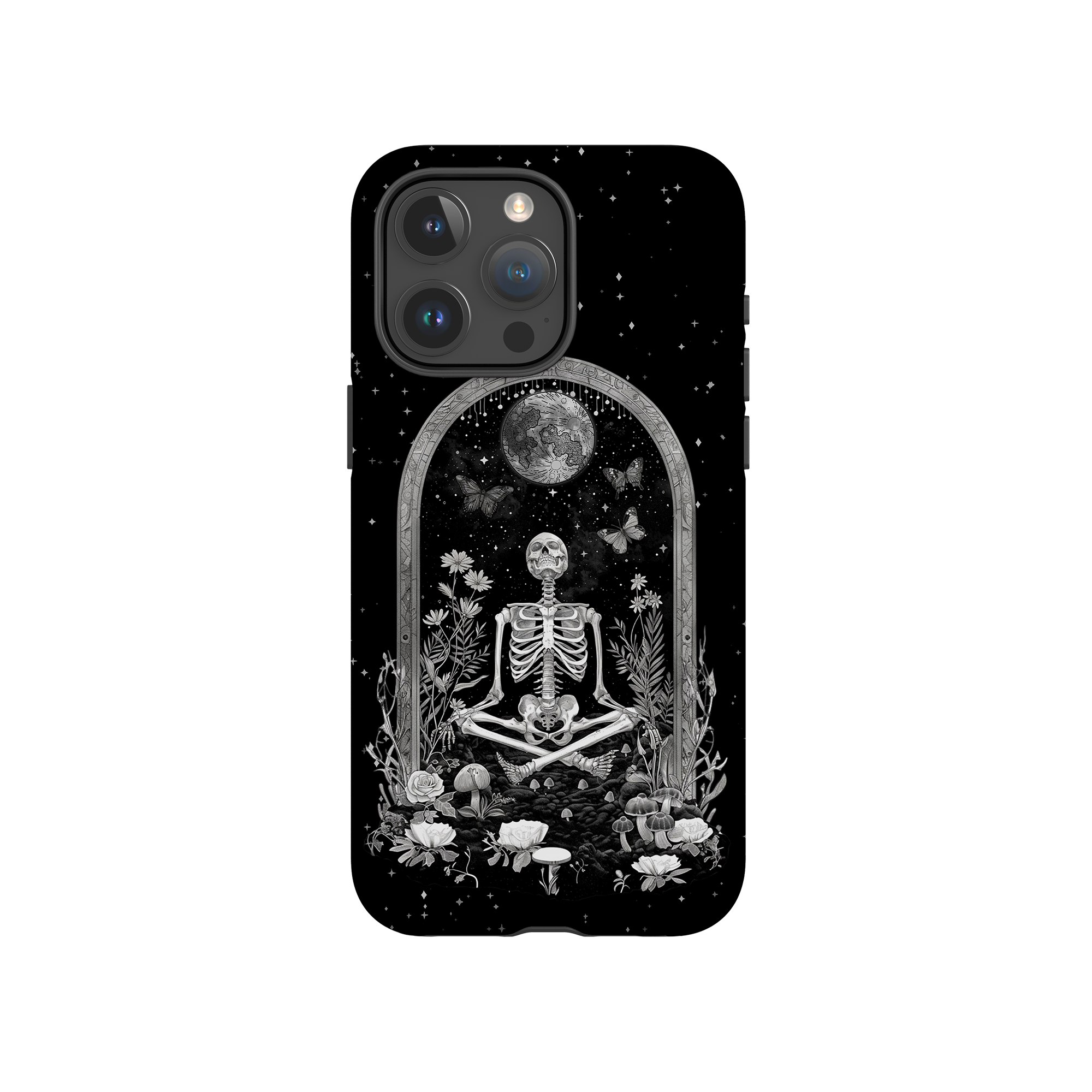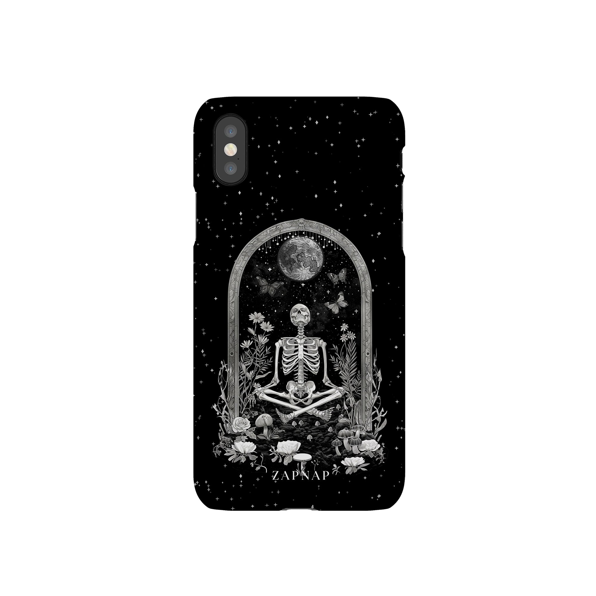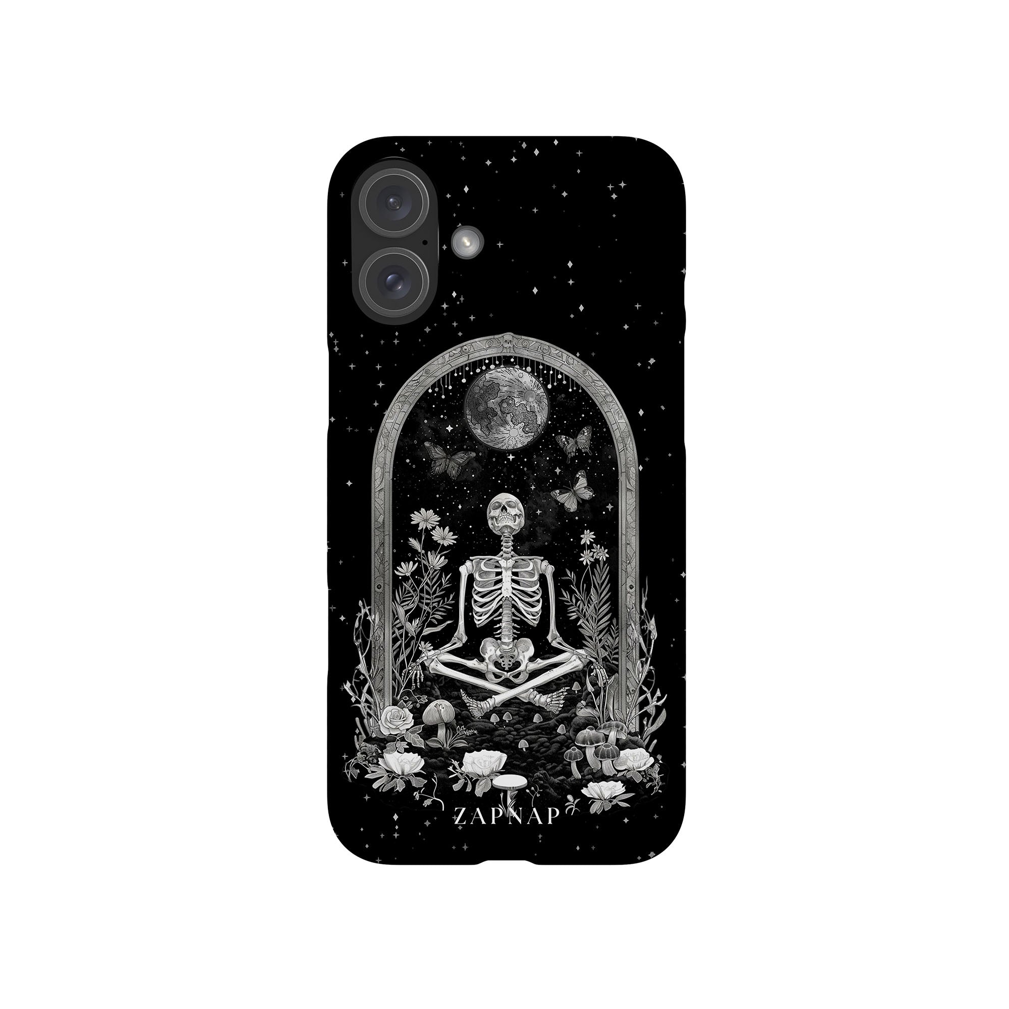 In “Astral Reflection,” a skeleton meditates amidst flowers and mushrooms under an ornate arch. Butterflies flutter around, and the celestial backdrop of stars and the moon enhances the gothic scene, symbolising a peaceful union between the earthly and the cosmic realms.