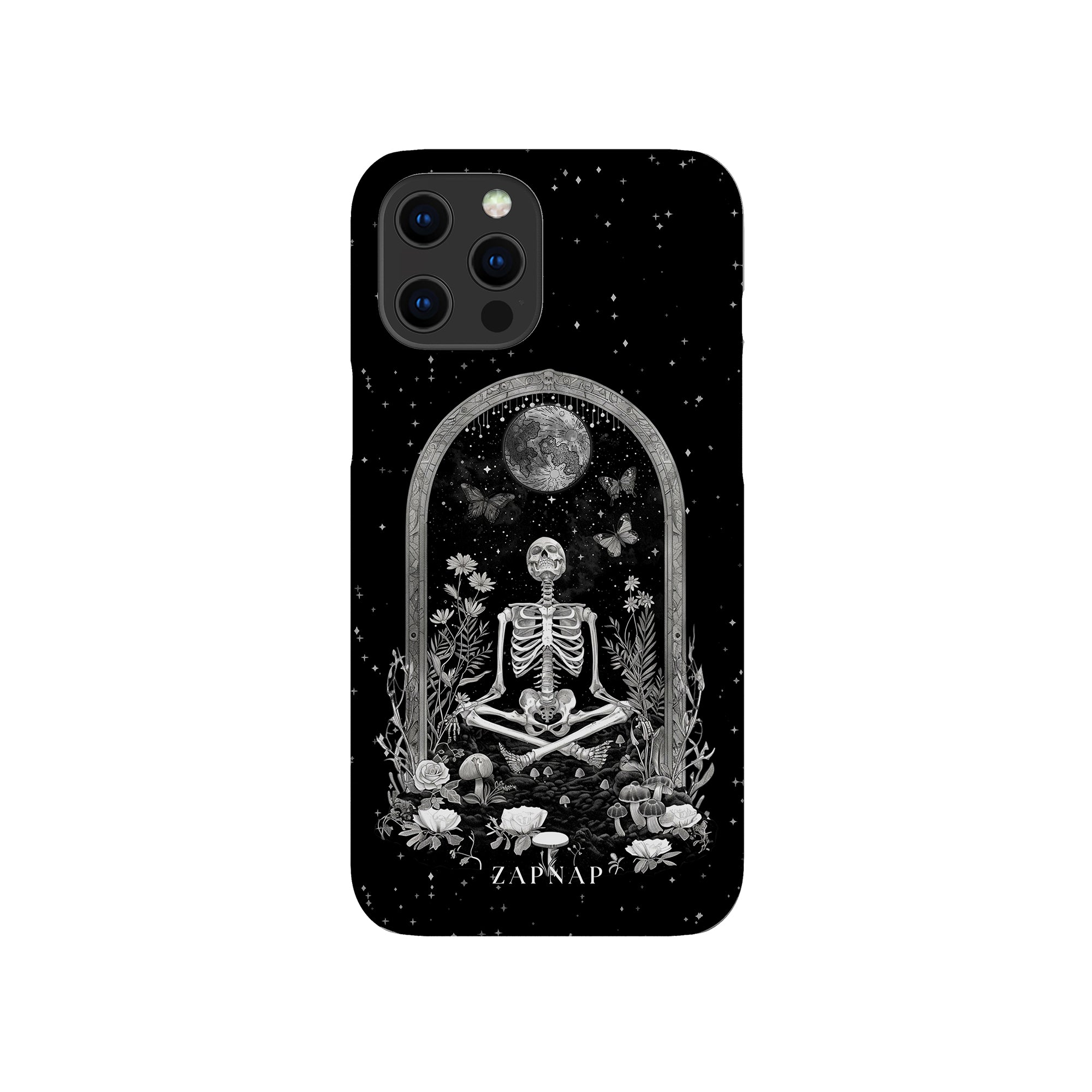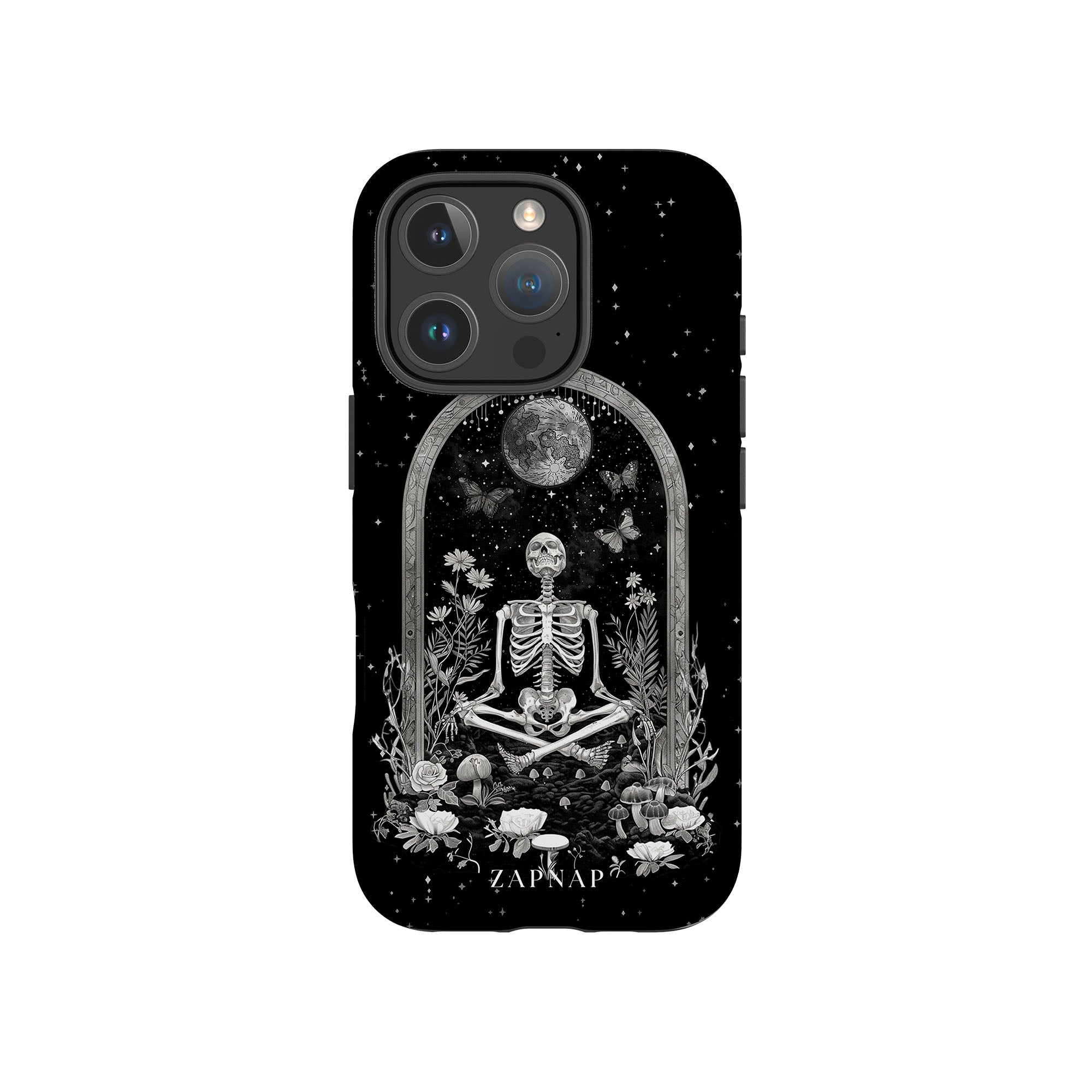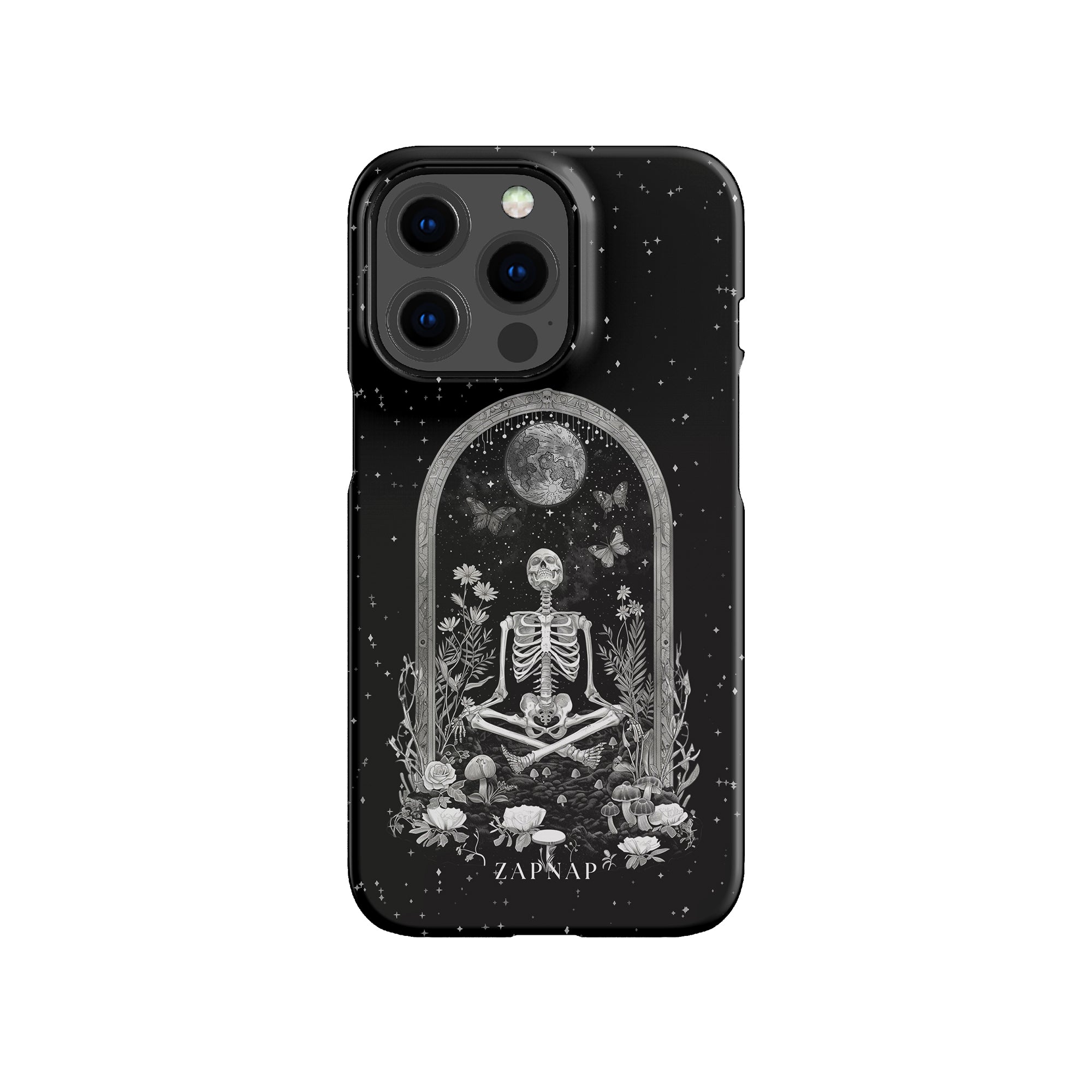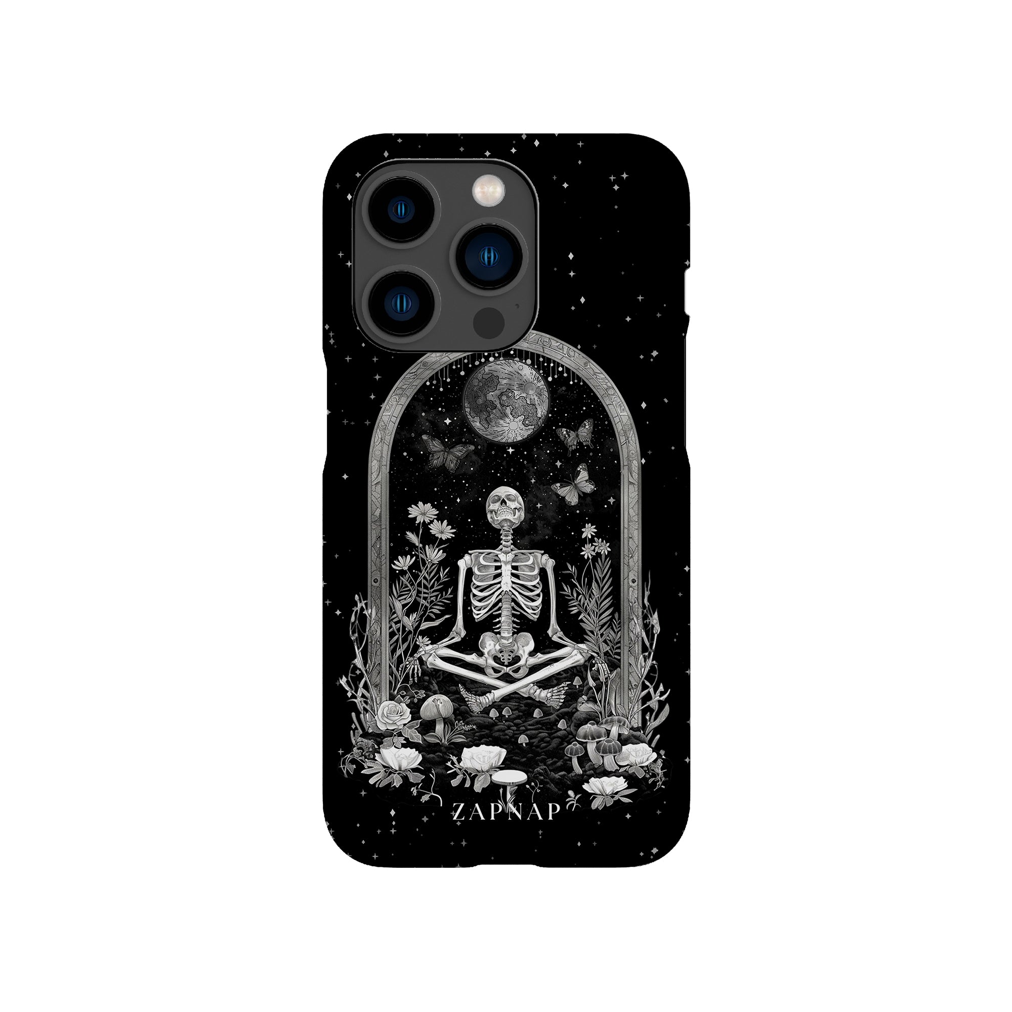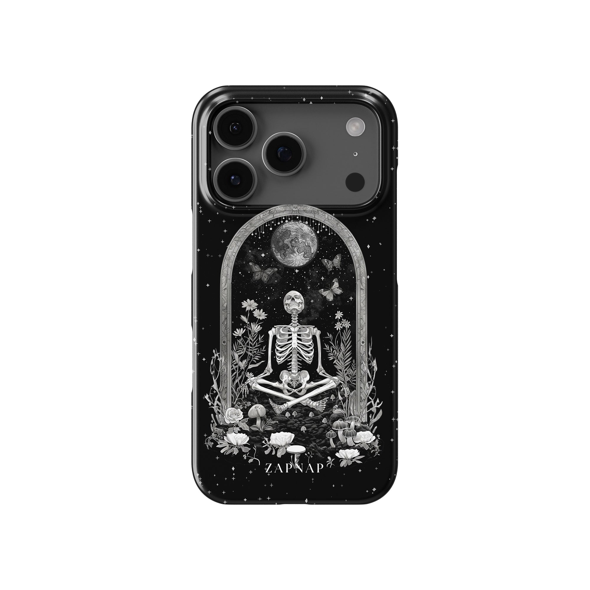 In “Astral Reflection,” a skeleton meditates amidst flowers and mushrooms under an ornate arch. Butterflies flutter around, and the celestial backdrop of stars and the moon enhances the gothic scene, symbolising a peaceful union between the earthly and the cosmic realms.
