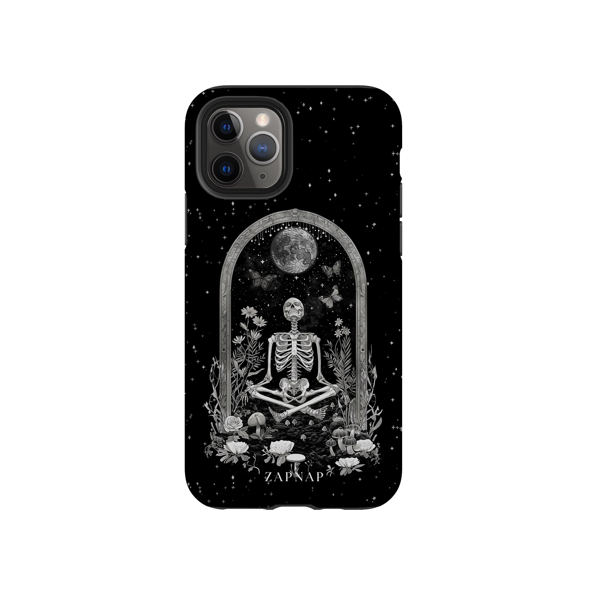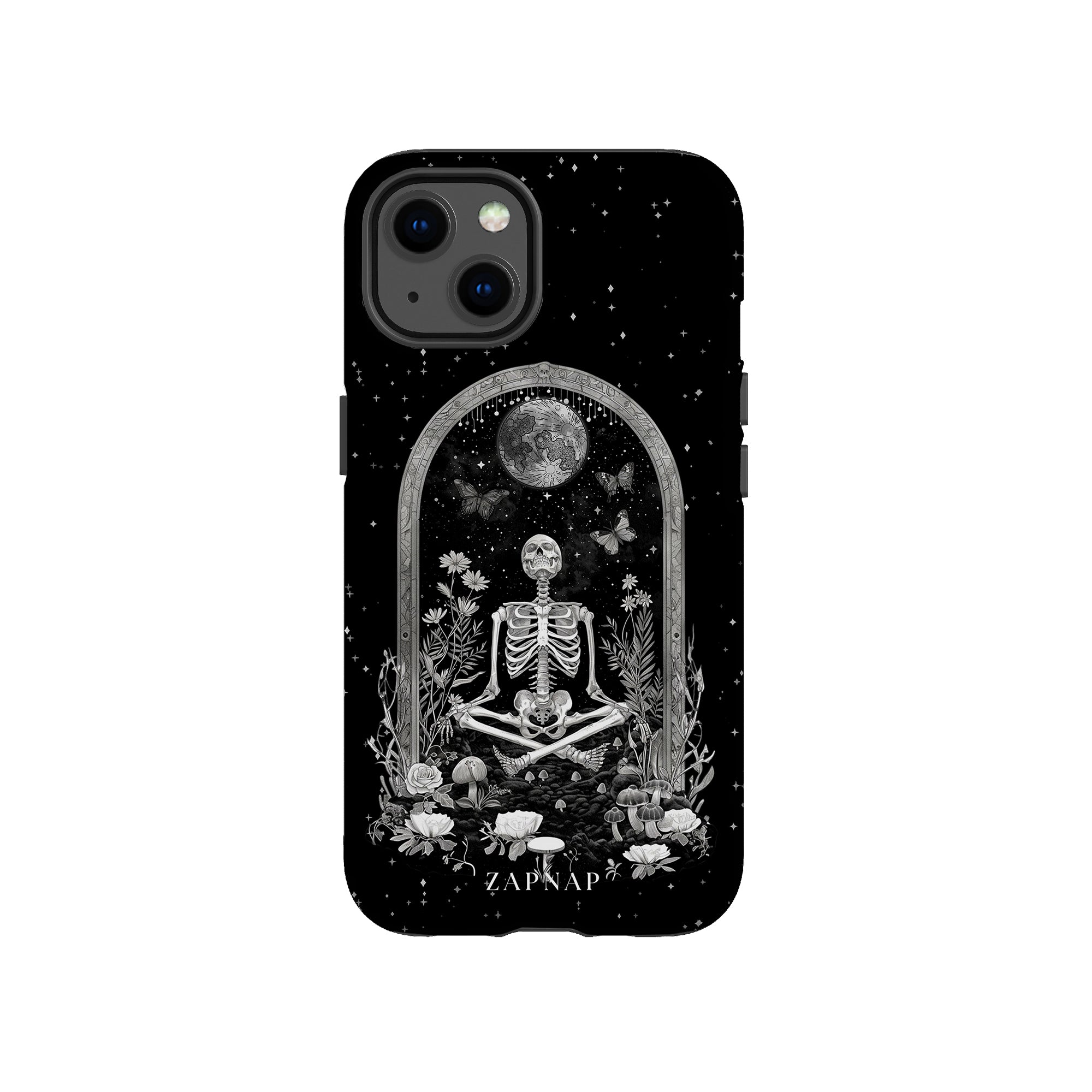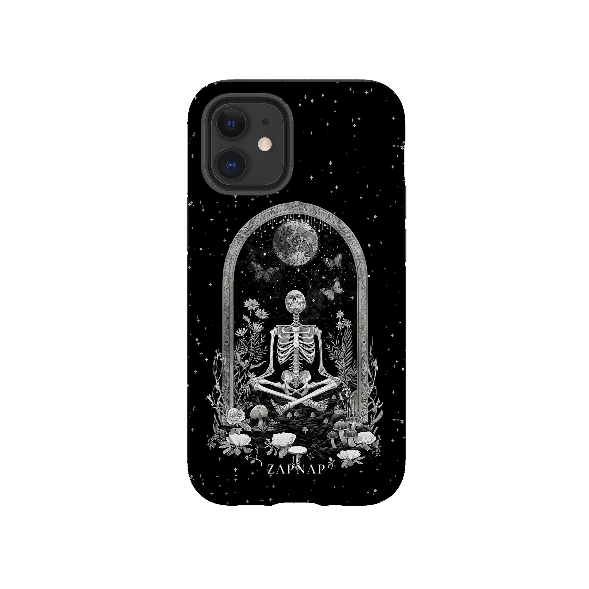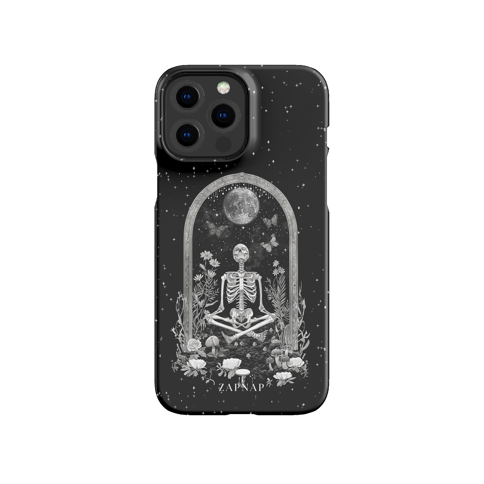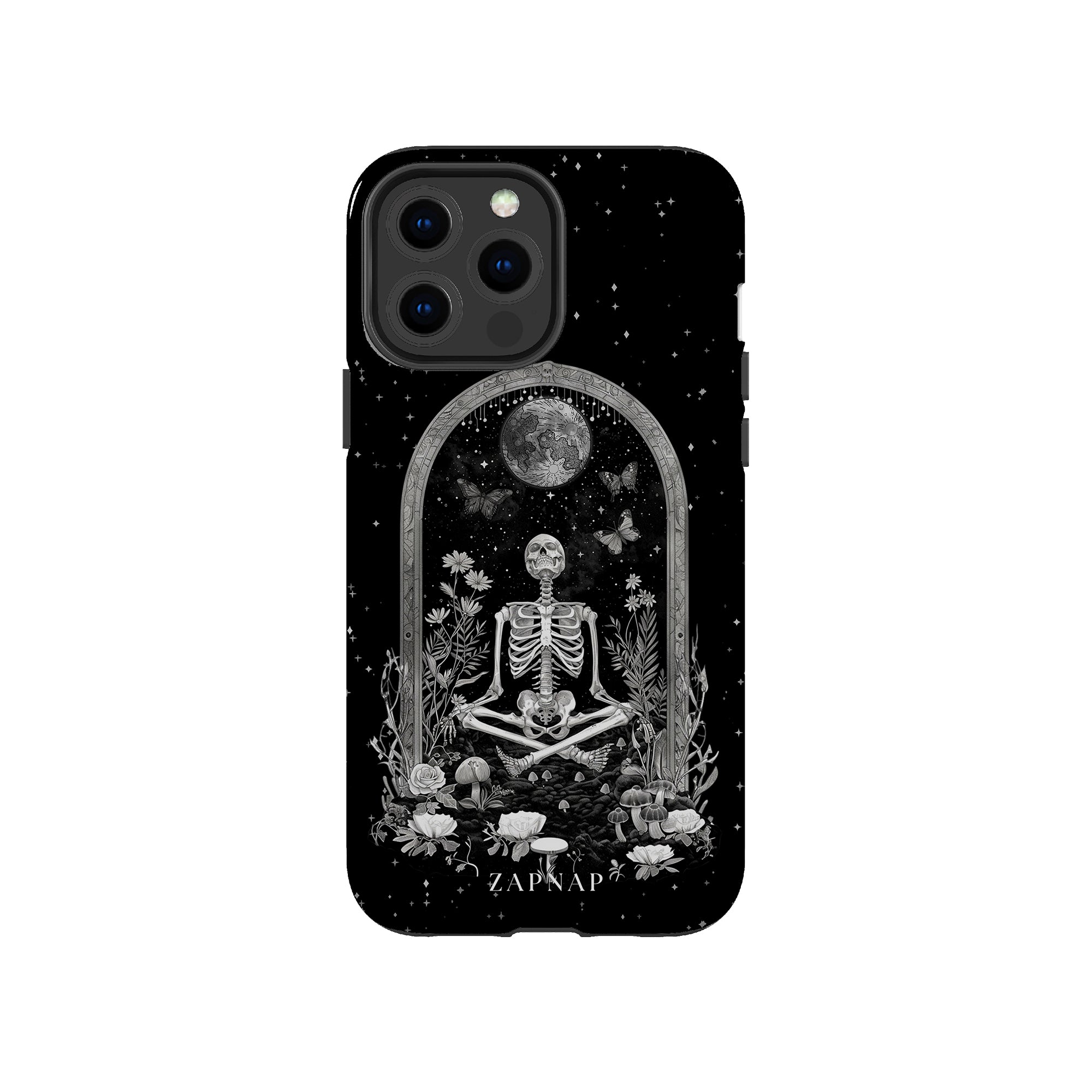 In “Astral Reflection,” a skeleton meditates amidst flowers and mushrooms under an ornate arch. Butterflies flutter around, and the celestial backdrop of stars and the moon enhances the gothic scene, symbolising a peaceful union between the earthly and the cosmic realms.