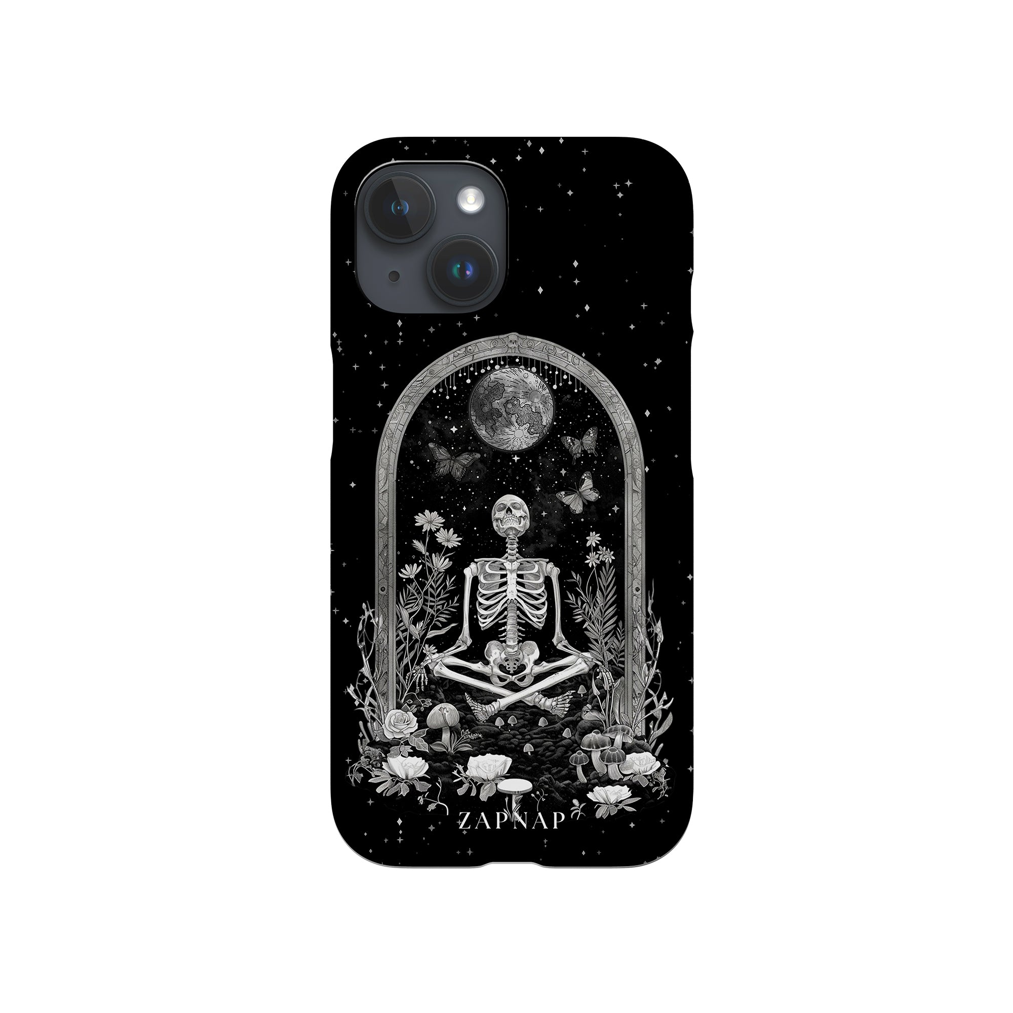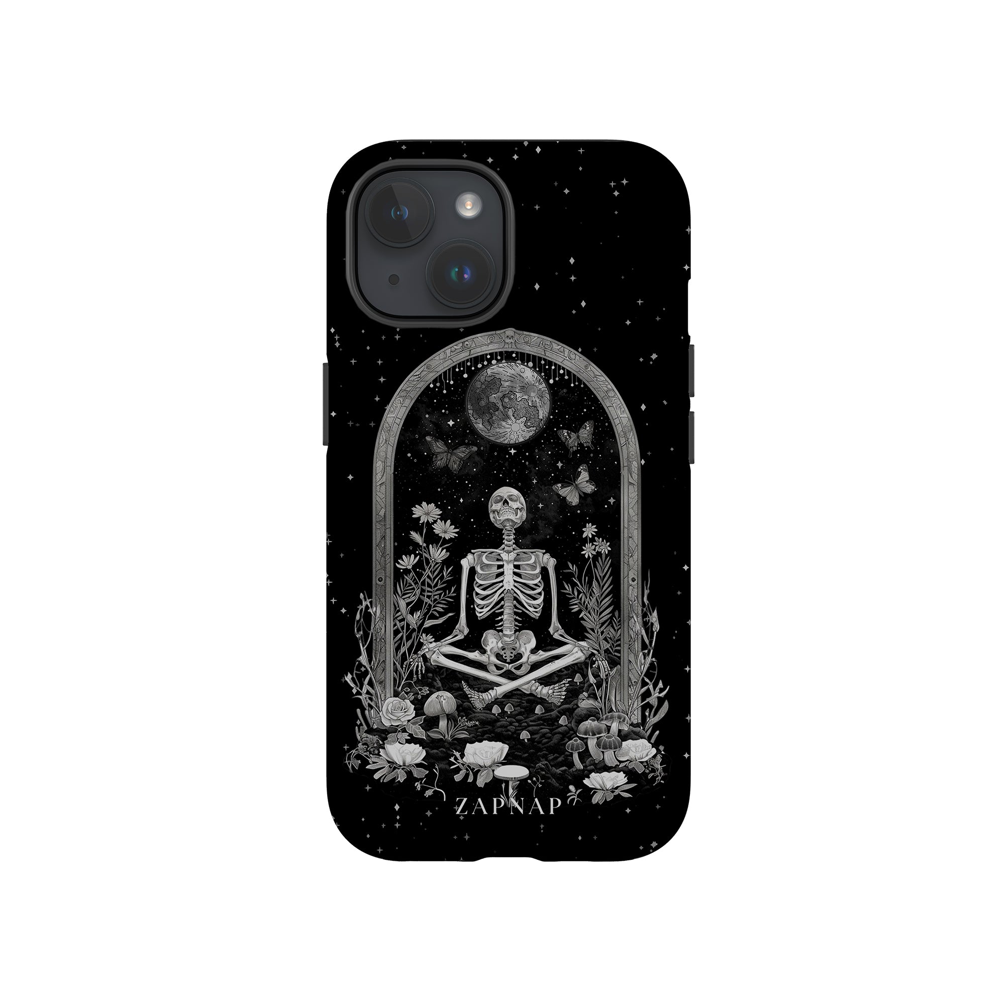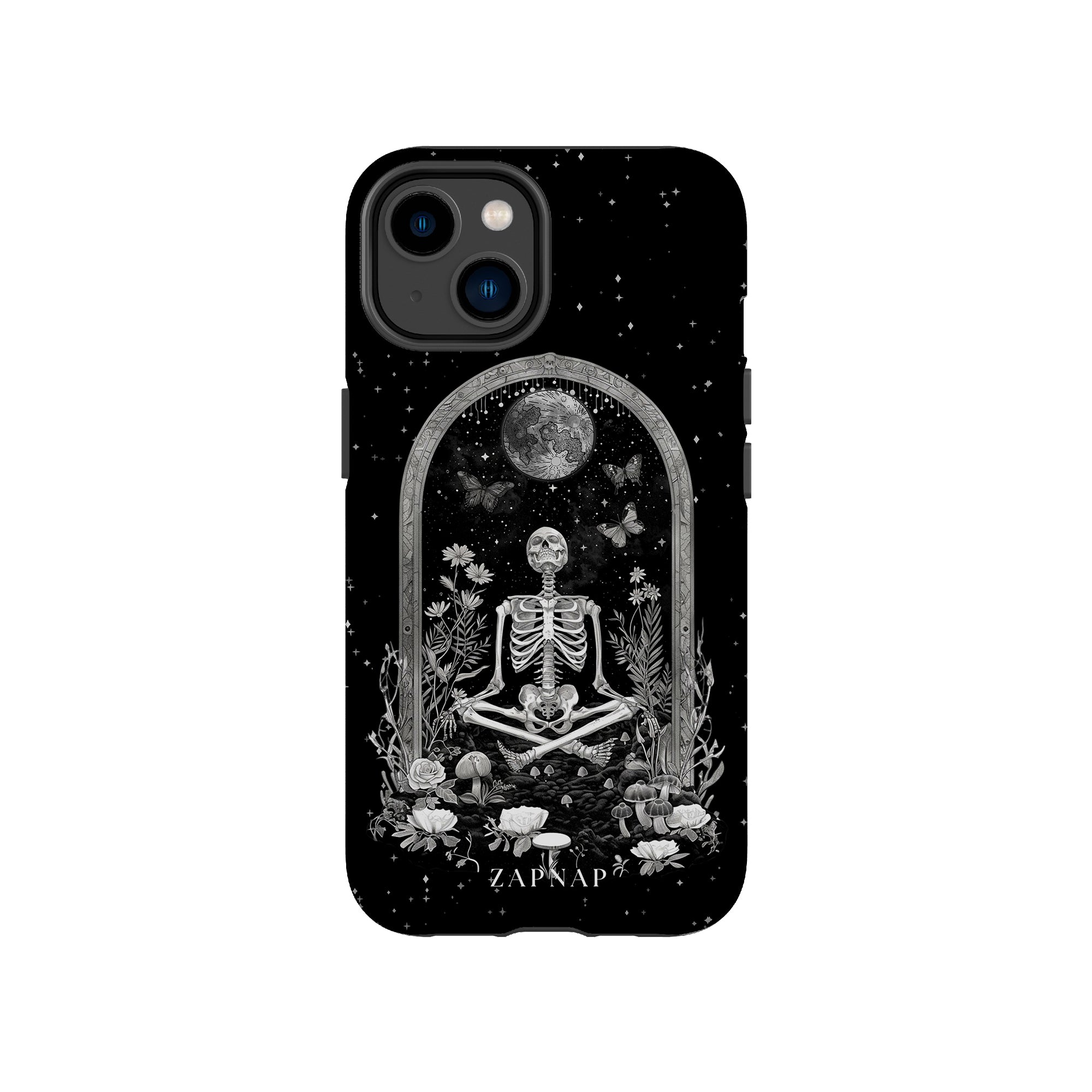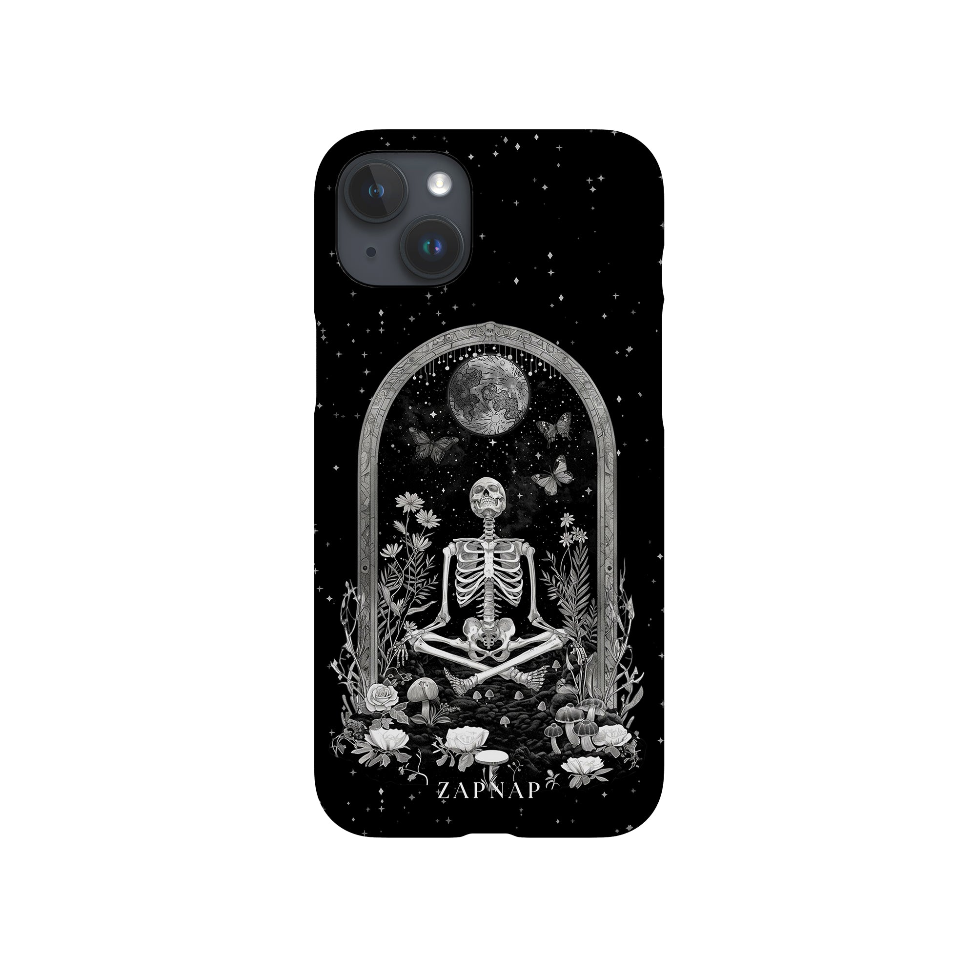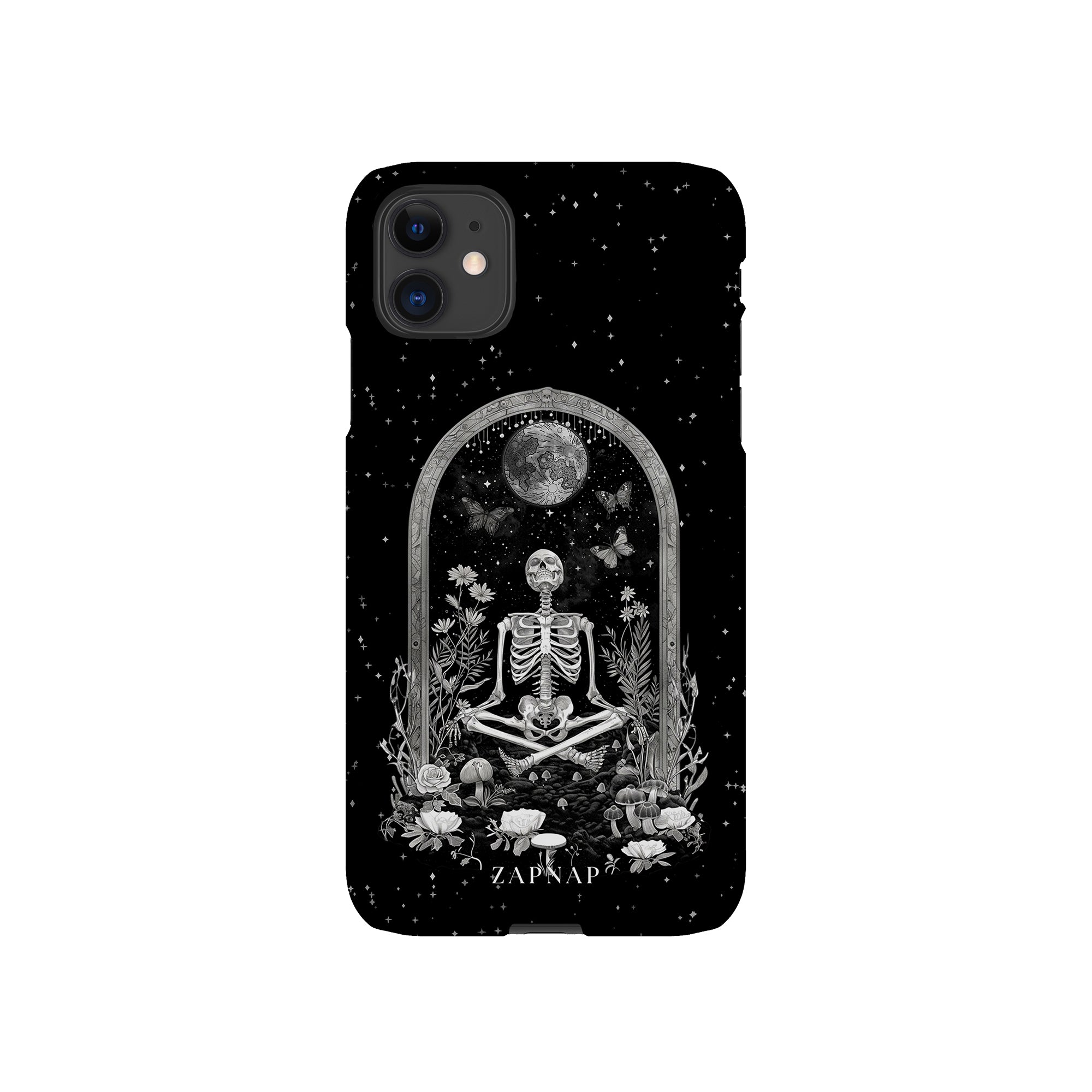 In “Astral Reflection,” a skeleton meditates amidst flowers and mushrooms under an ornate arch. Butterflies flutter around, and the celestial backdrop of stars and the moon enhances the gothic scene, symbolising a peaceful union between the earthly and the cosmic realms.