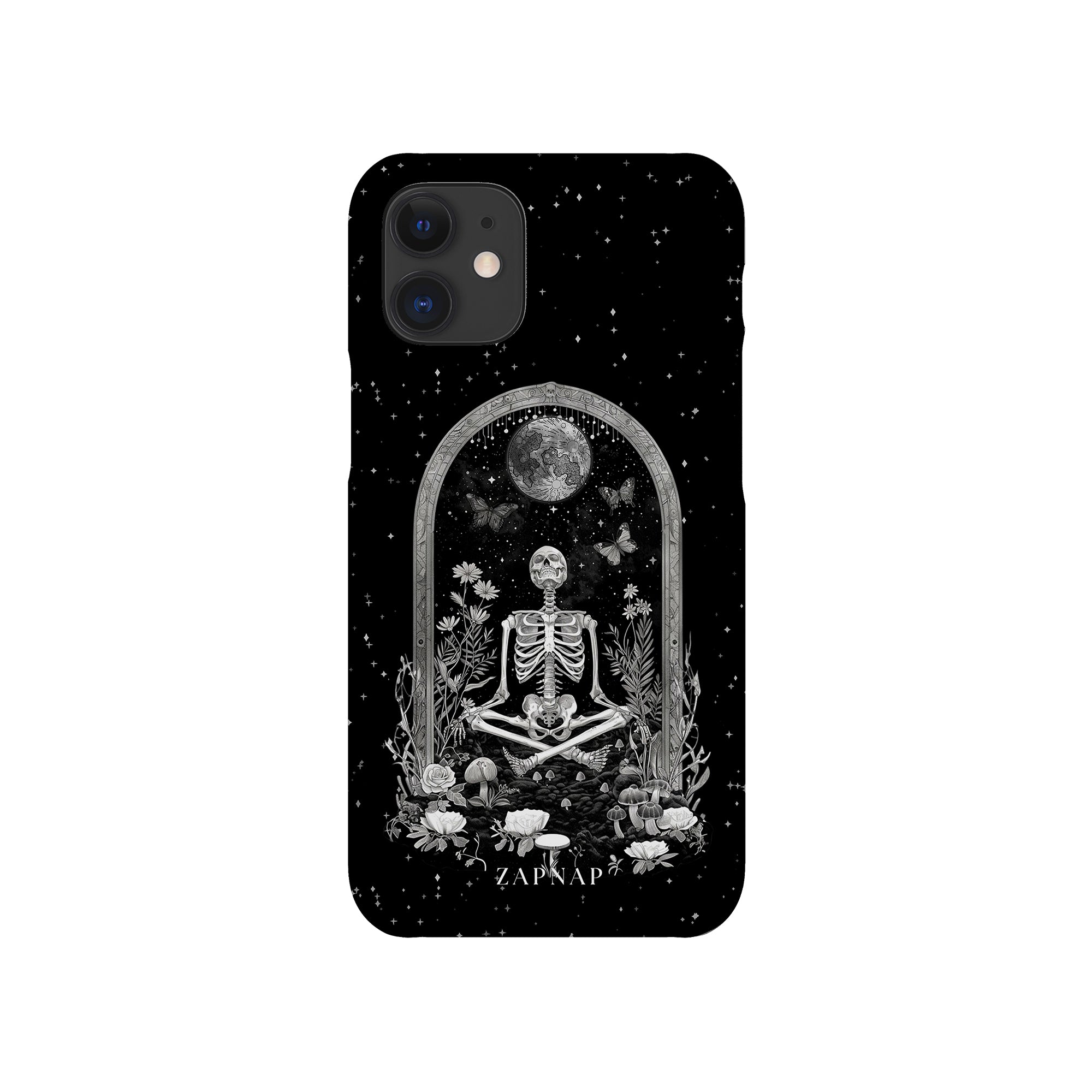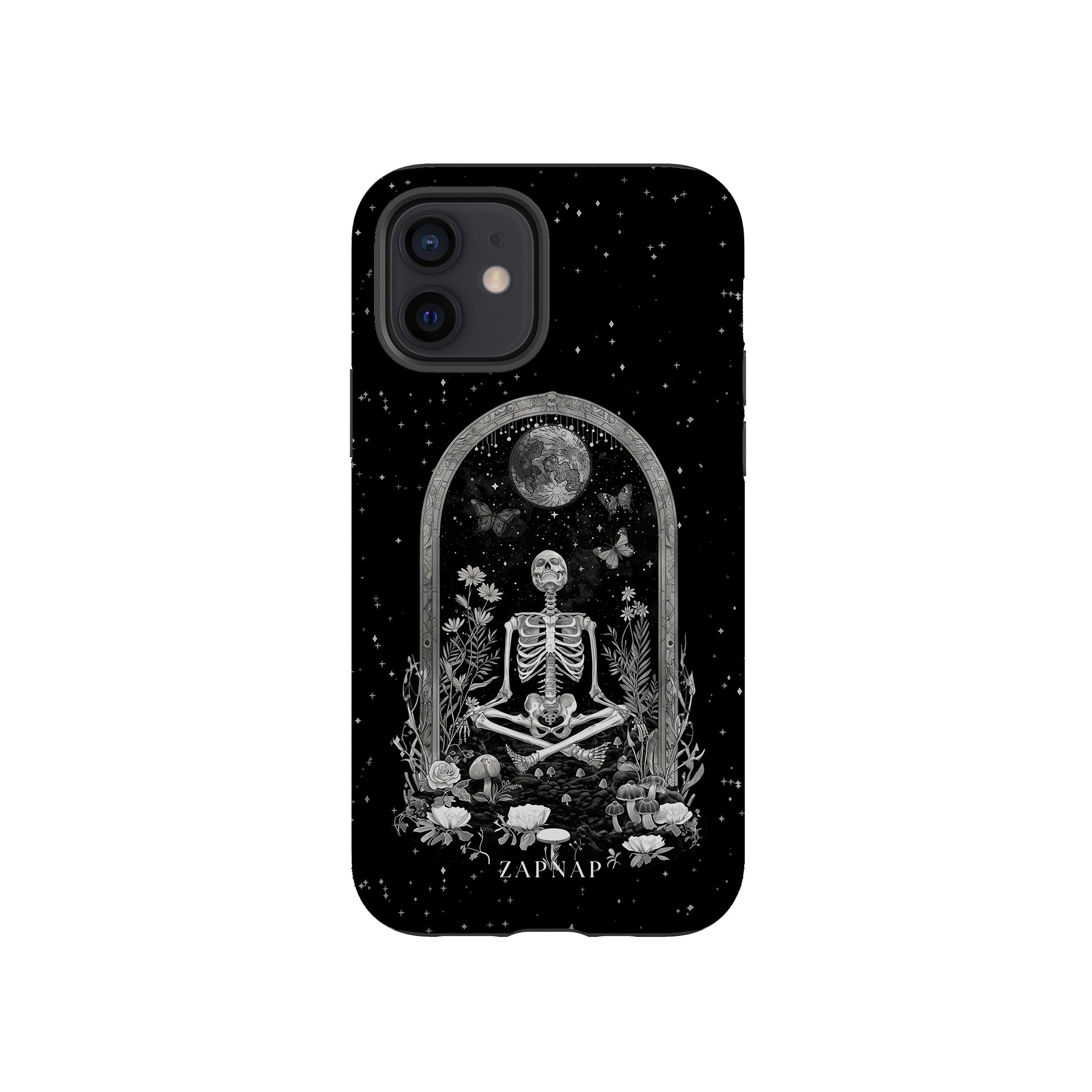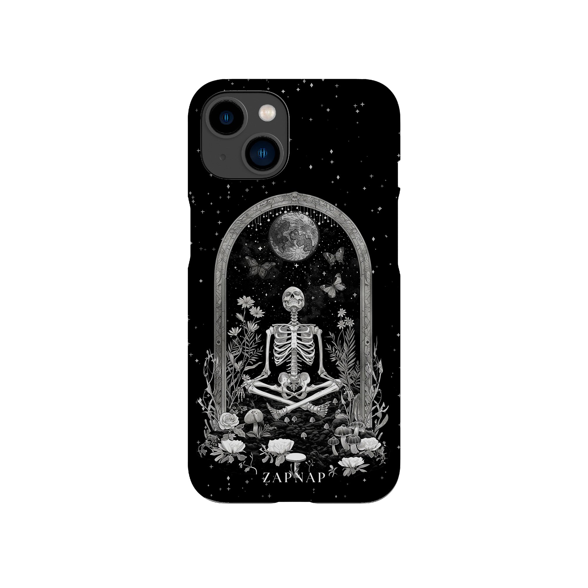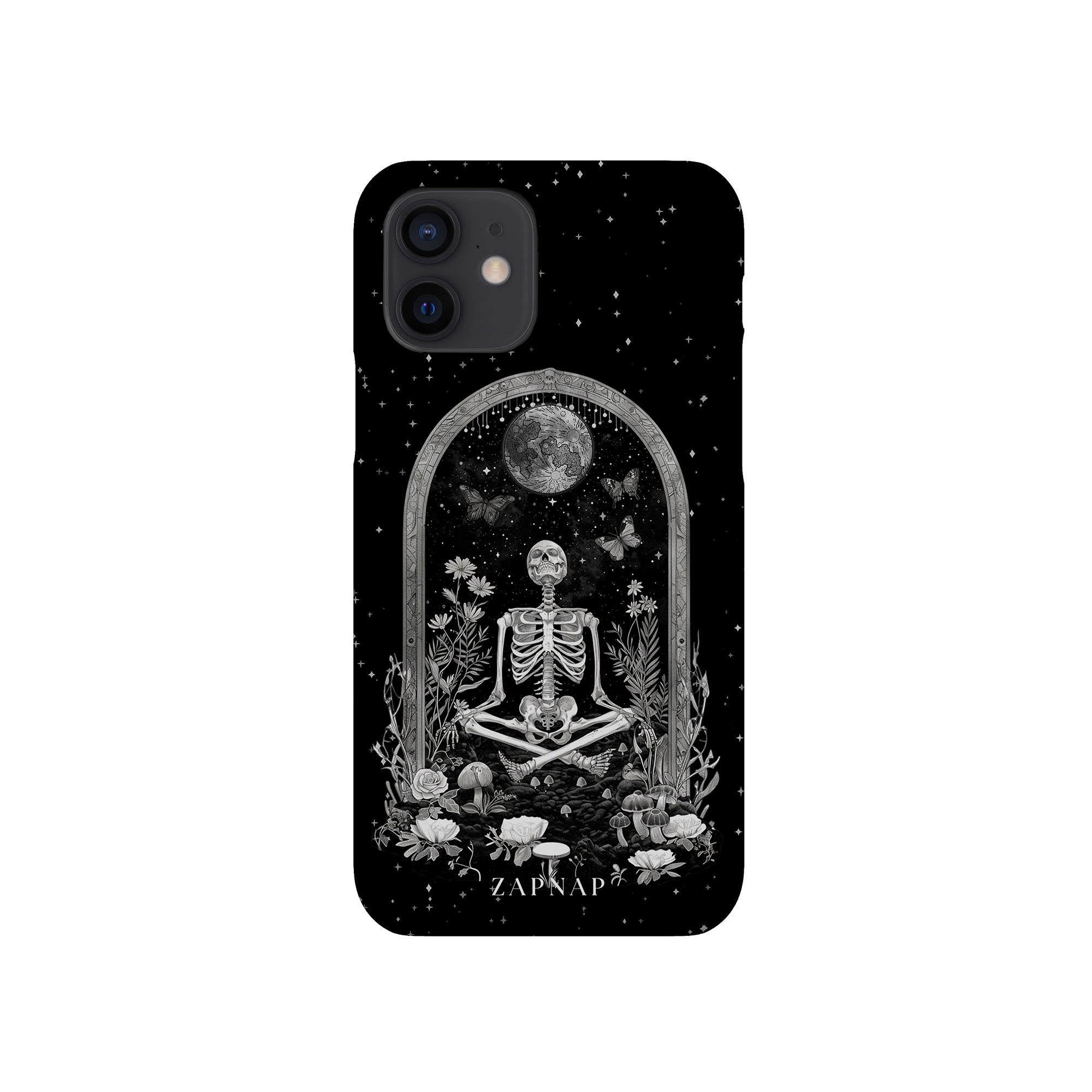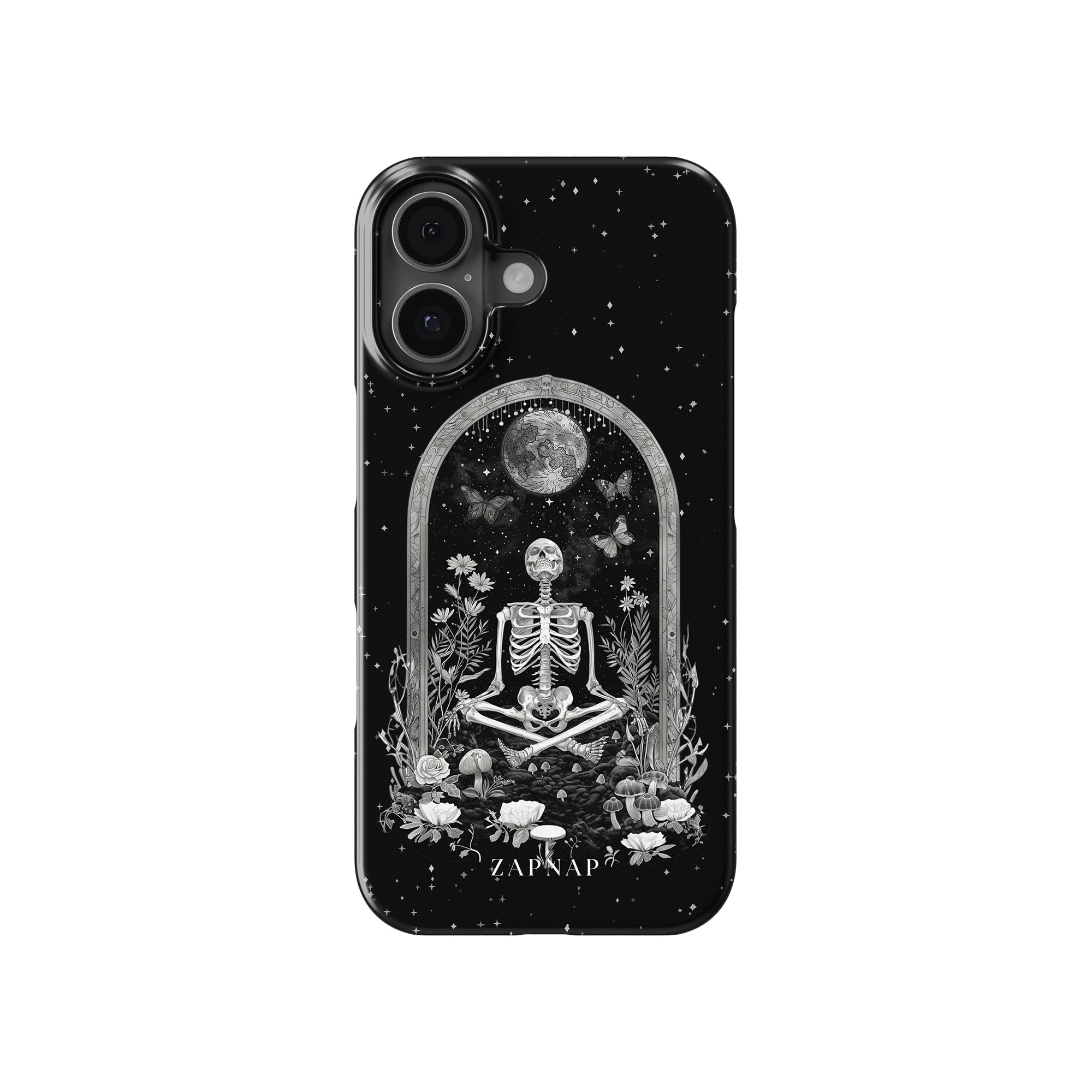 In “Astral Reflection,” a skeleton meditates amidst flowers and mushrooms under an ornate arch. Butterflies flutter around, and the celestial backdrop of stars and the moon enhances the gothic scene, symbolising a peaceful union between the earthly and the cosmic realms.