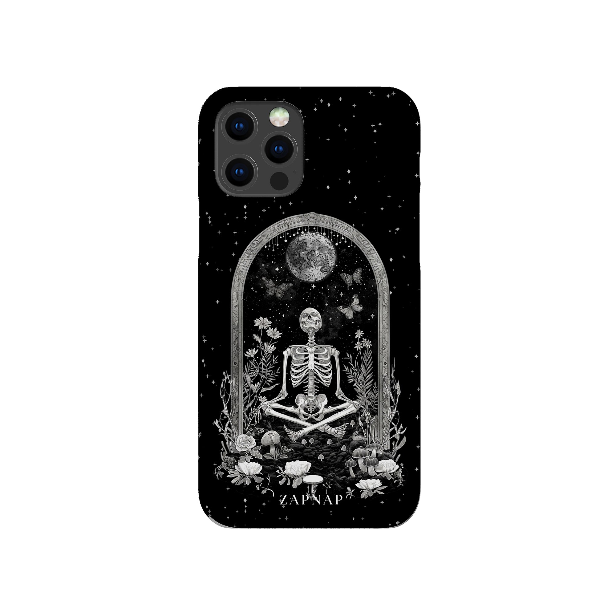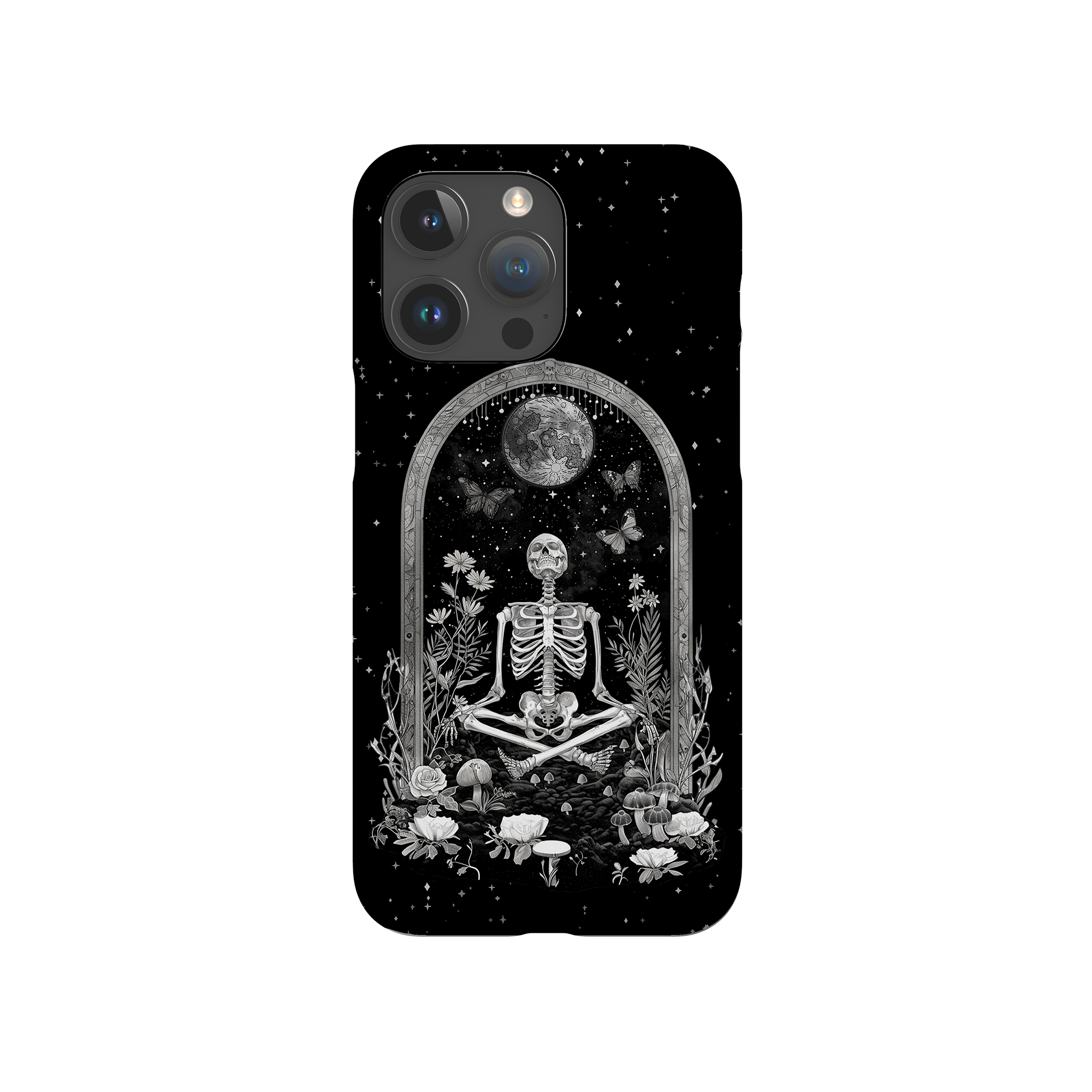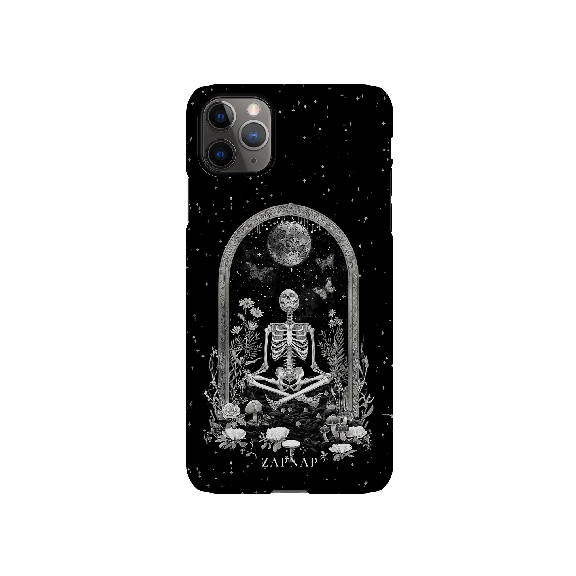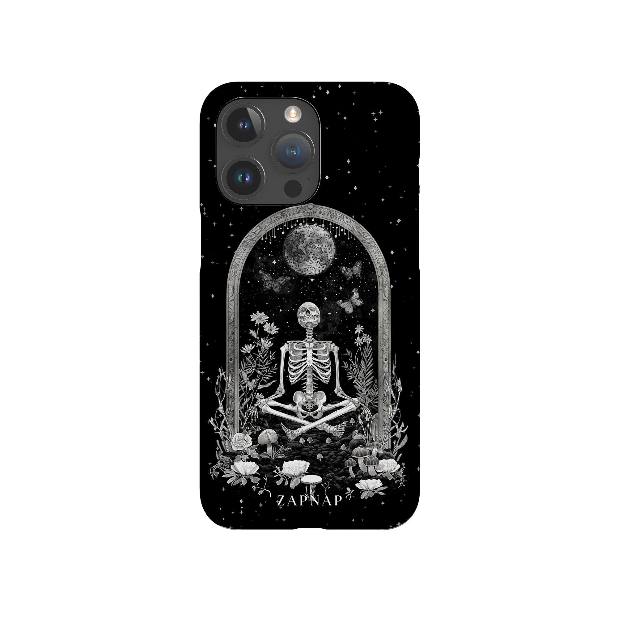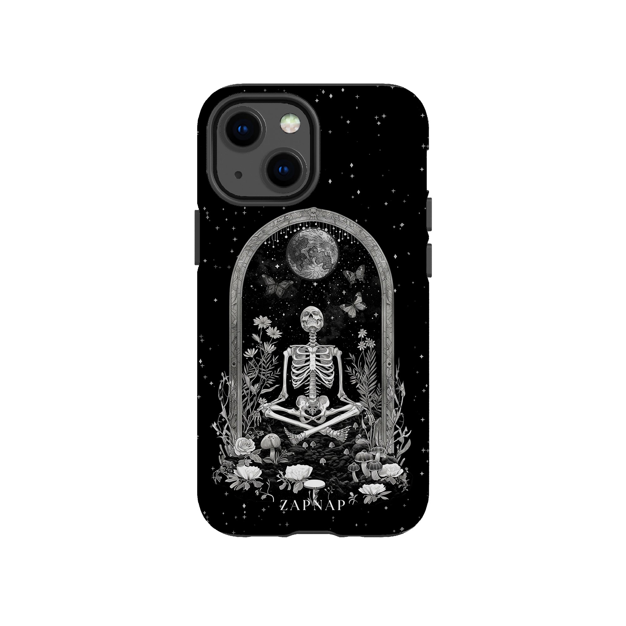 In “Astral Reflection,” a skeleton meditates amidst flowers and mushrooms under an ornate arch. Butterflies flutter around, and the celestial backdrop of stars and the moon enhances the gothic scene, symbolising a peaceful union between the earthly and the cosmic realms.