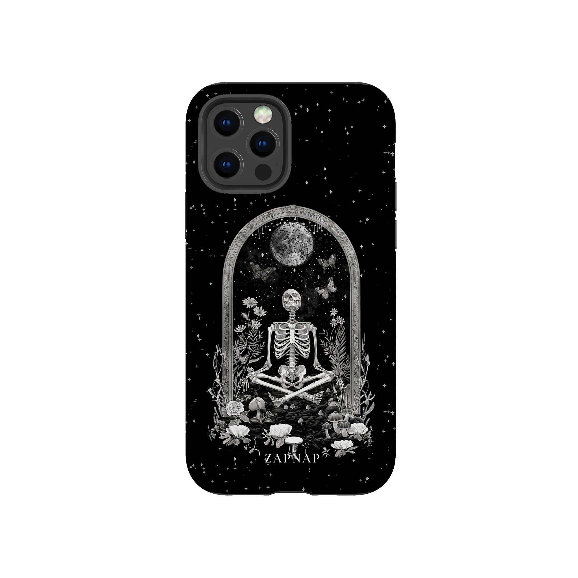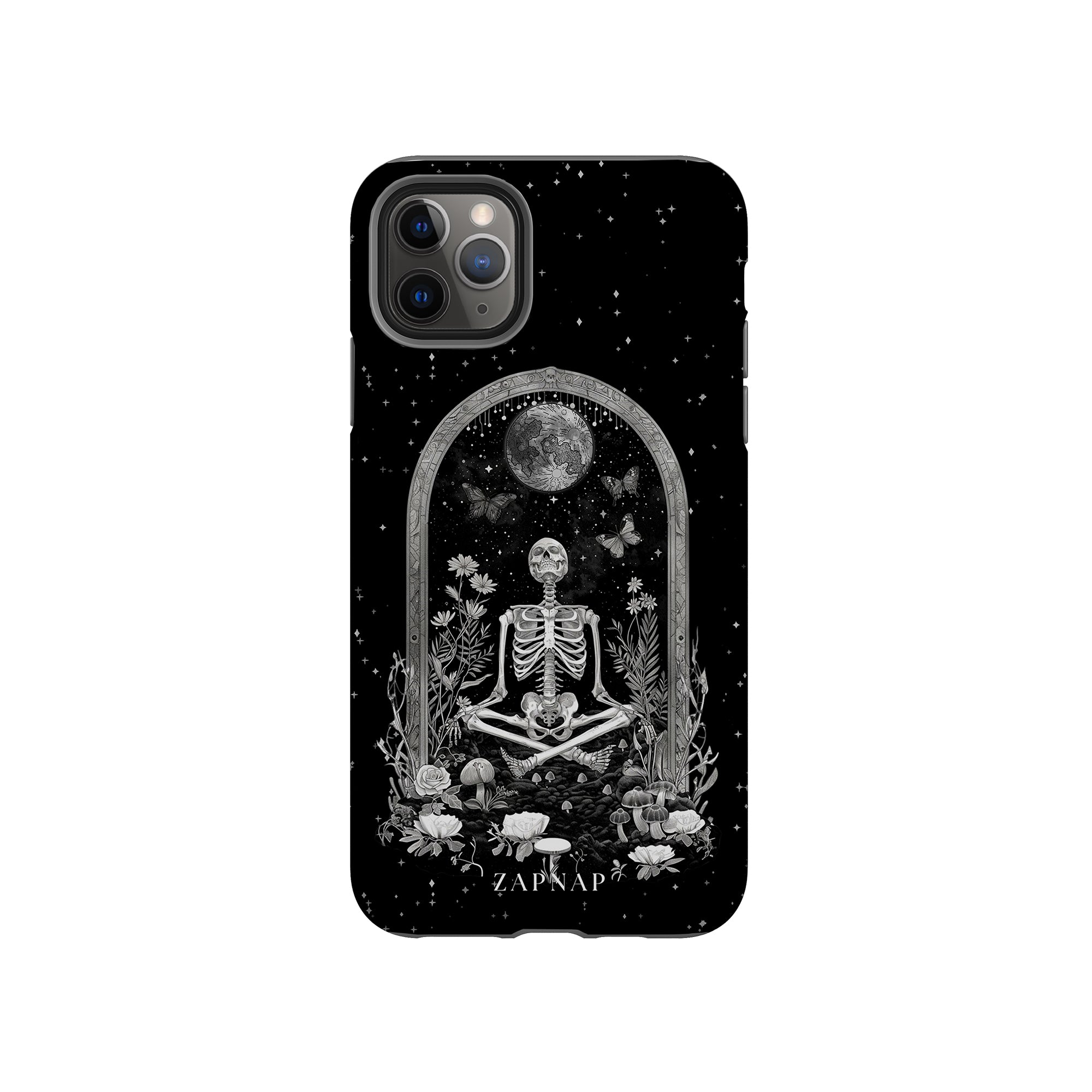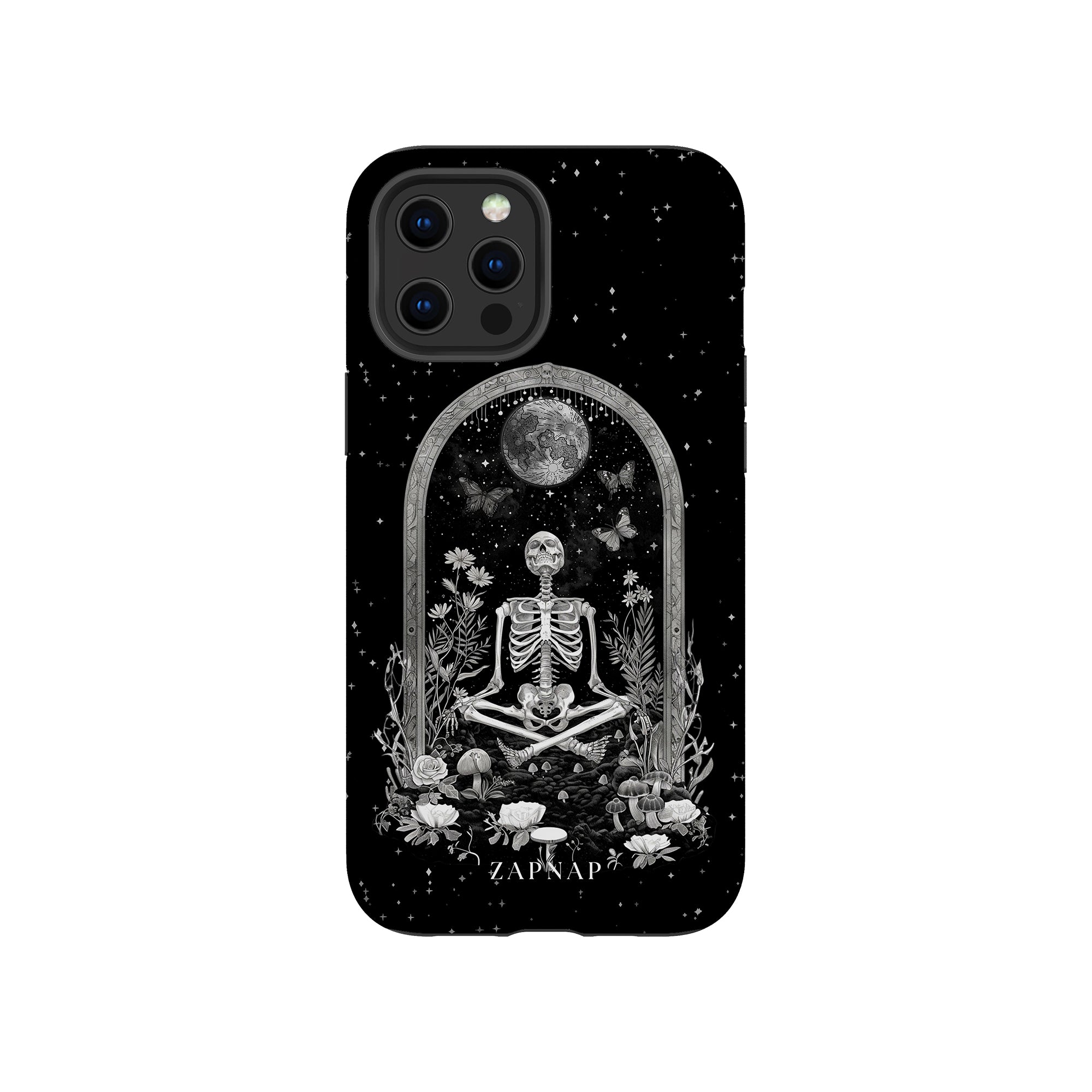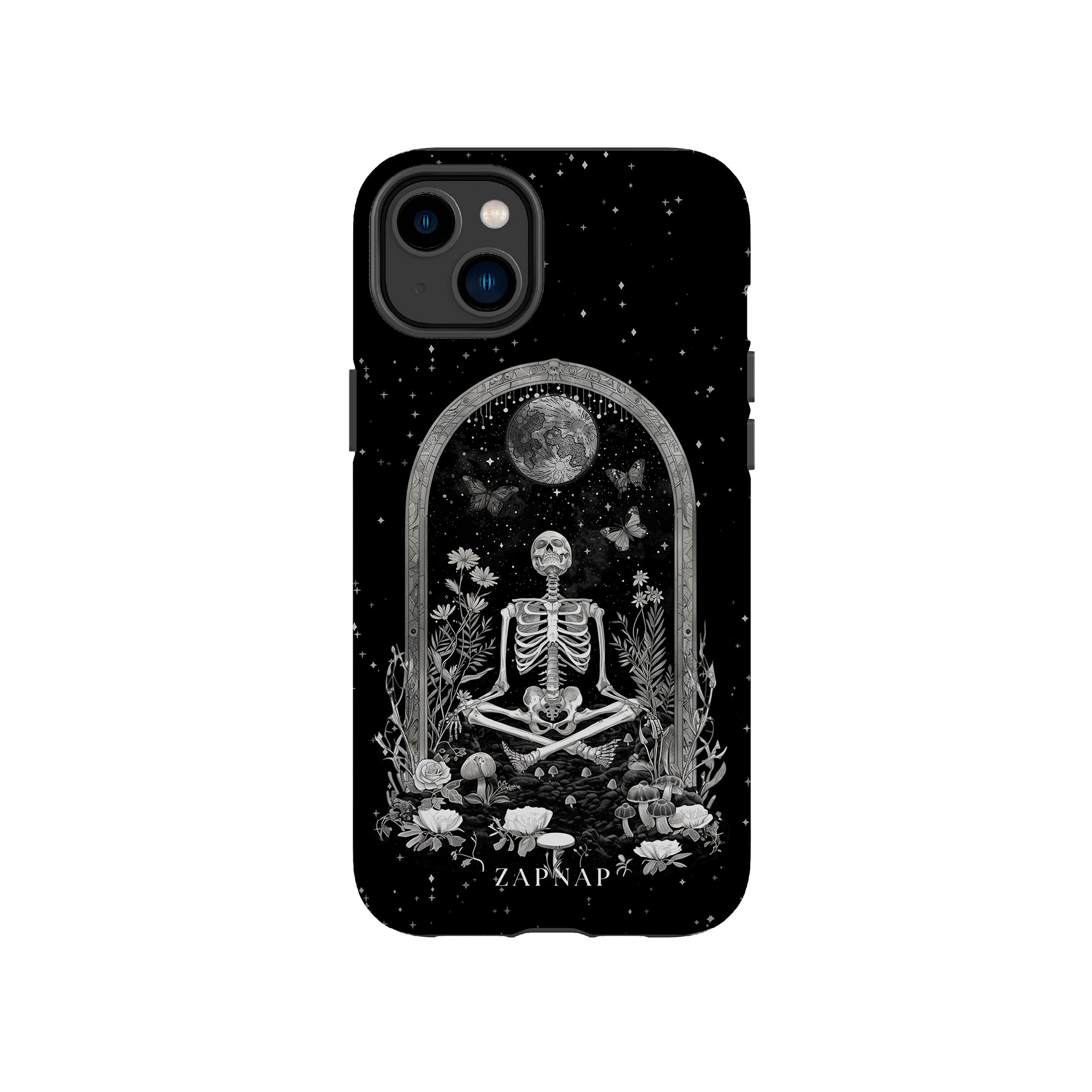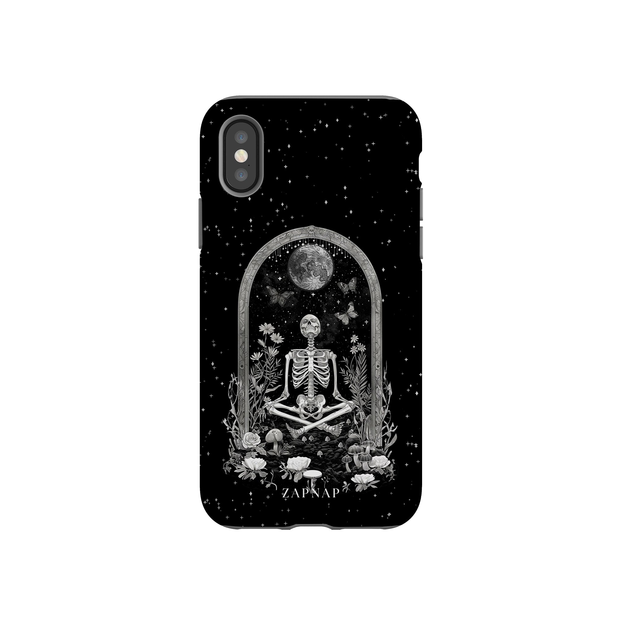 In “Astral Reflection,” a skeleton meditates amidst flowers and mushrooms under an ornate arch. Butterflies flutter around, and the celestial backdrop of stars and the moon enhances the gothic scene, symbolising a peaceful union between the earthly and the cosmic realms.