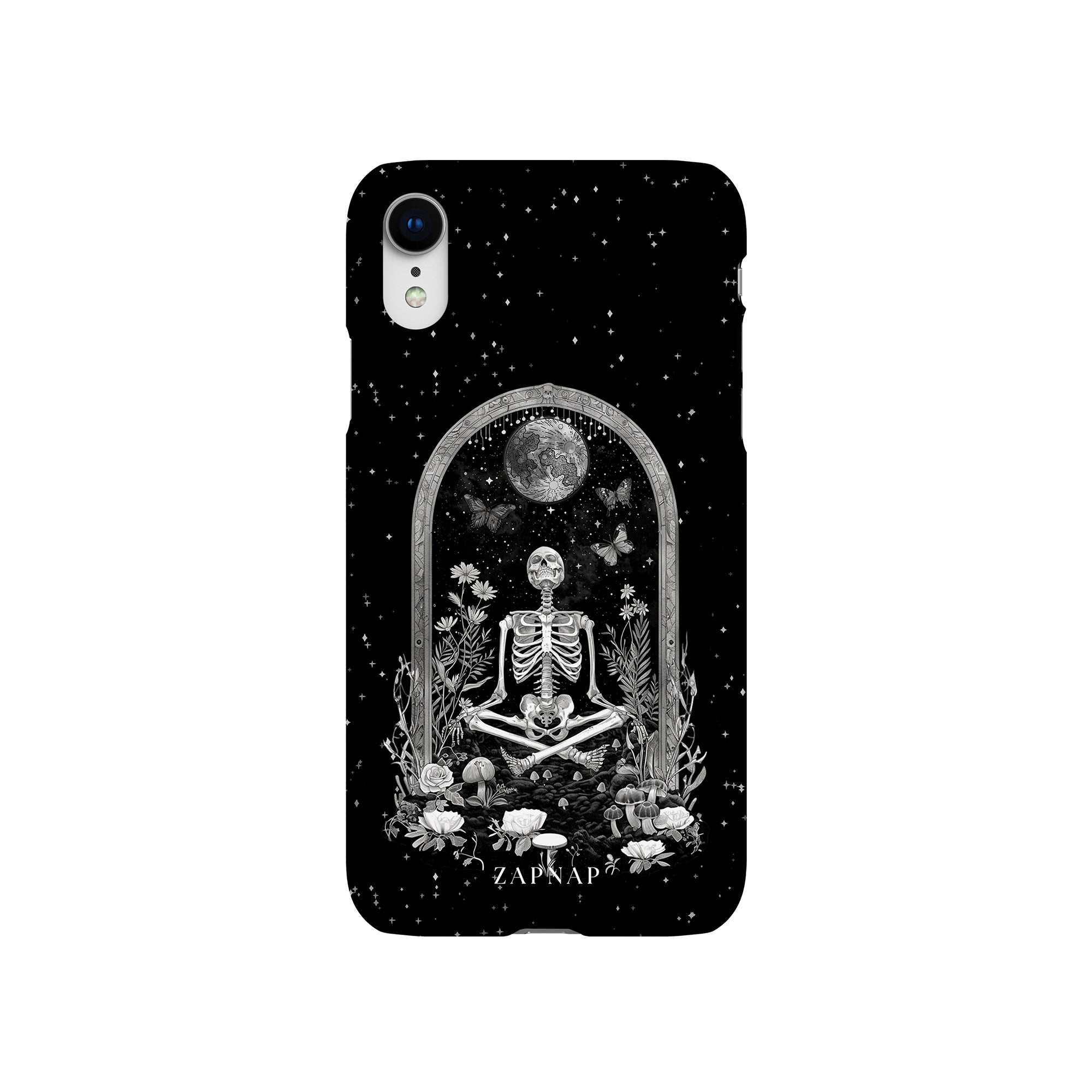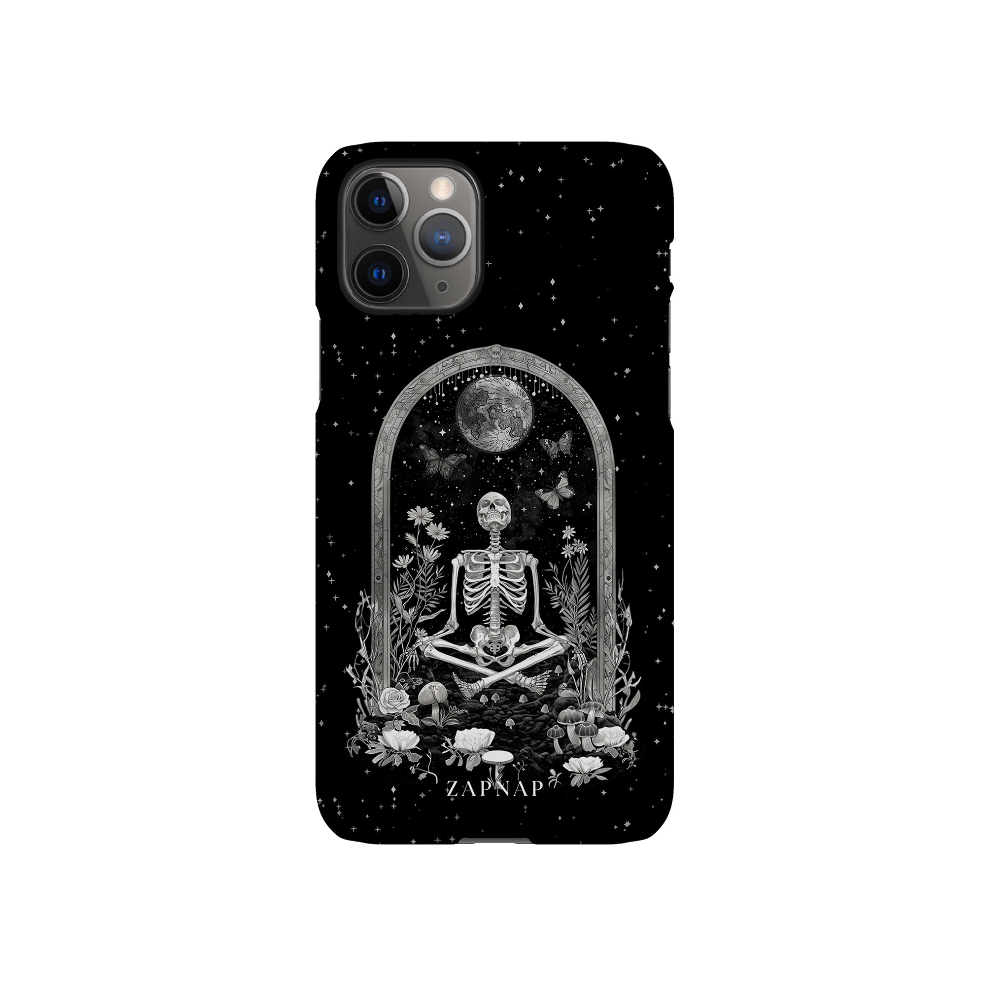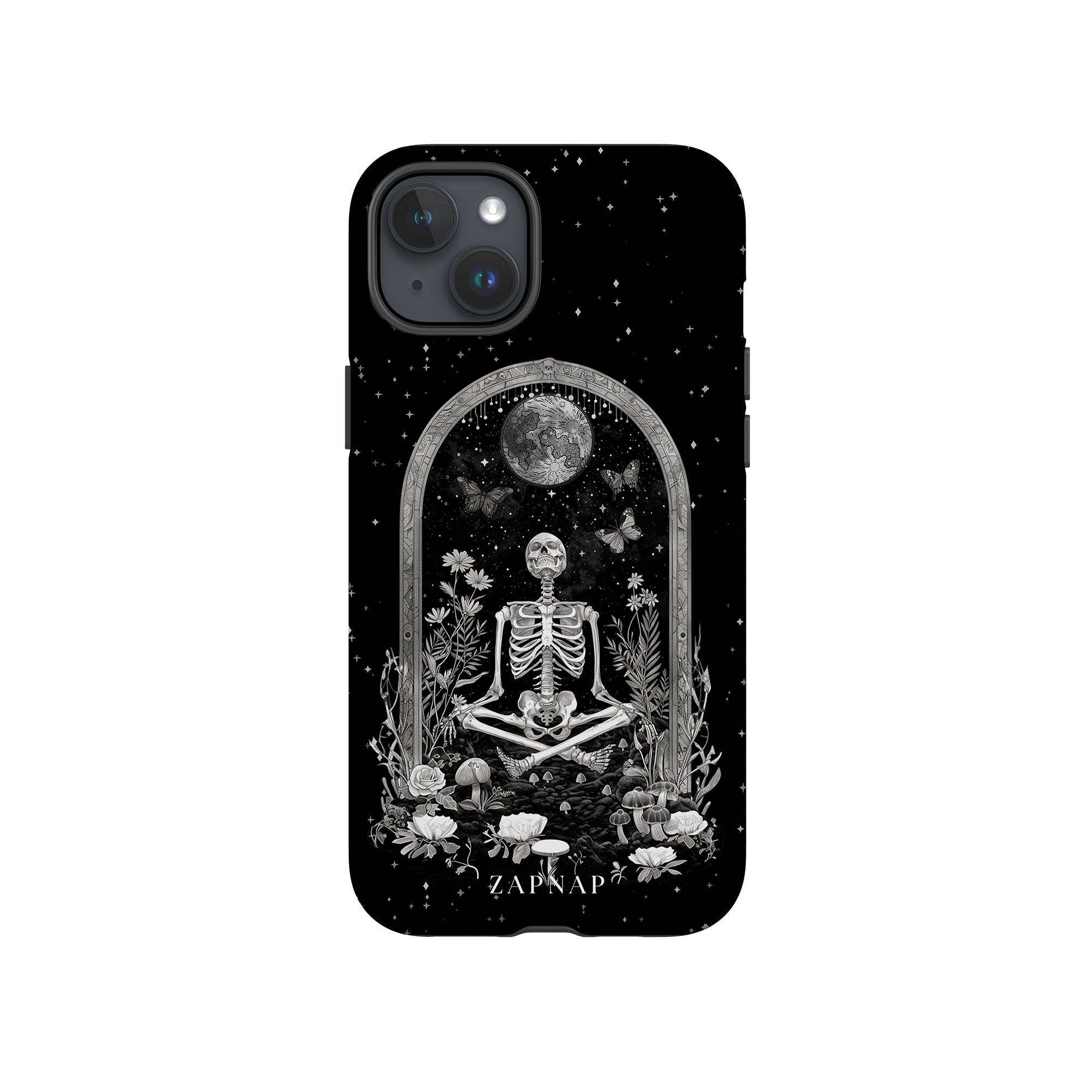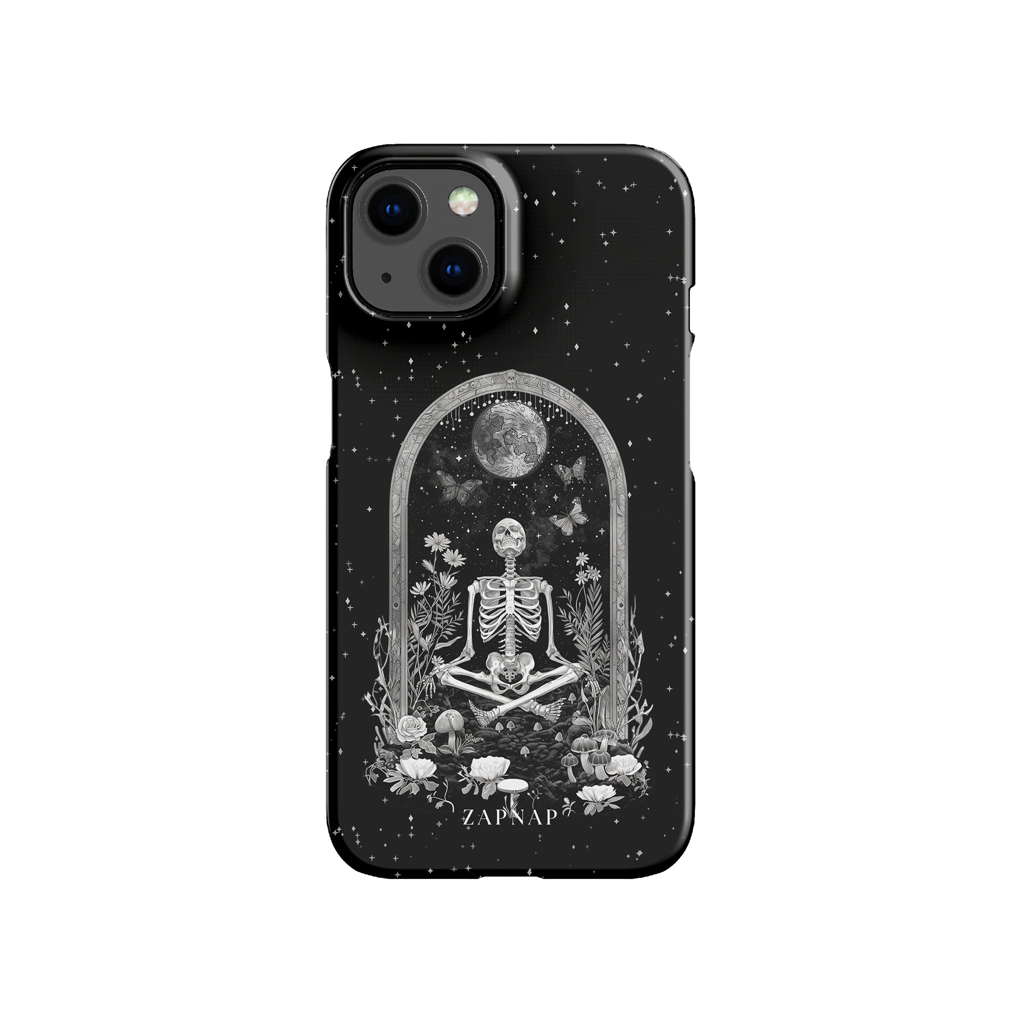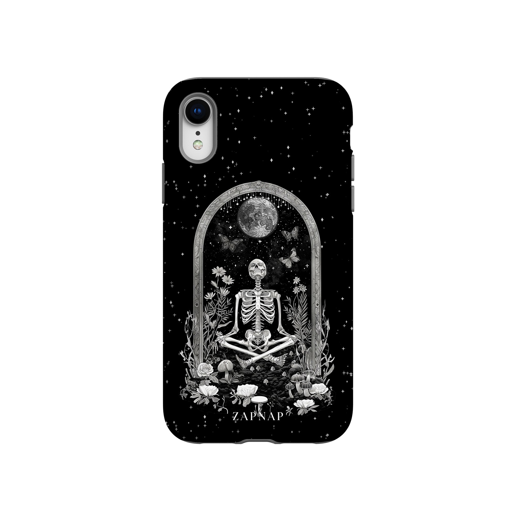 In “Astral Reflection,” a skeleton meditates amidst flowers and mushrooms under an ornate arch. Butterflies flutter around, and the celestial backdrop of stars and the moon enhances the gothic scene, symbolising a peaceful union between the earthly and the cosmic realms.