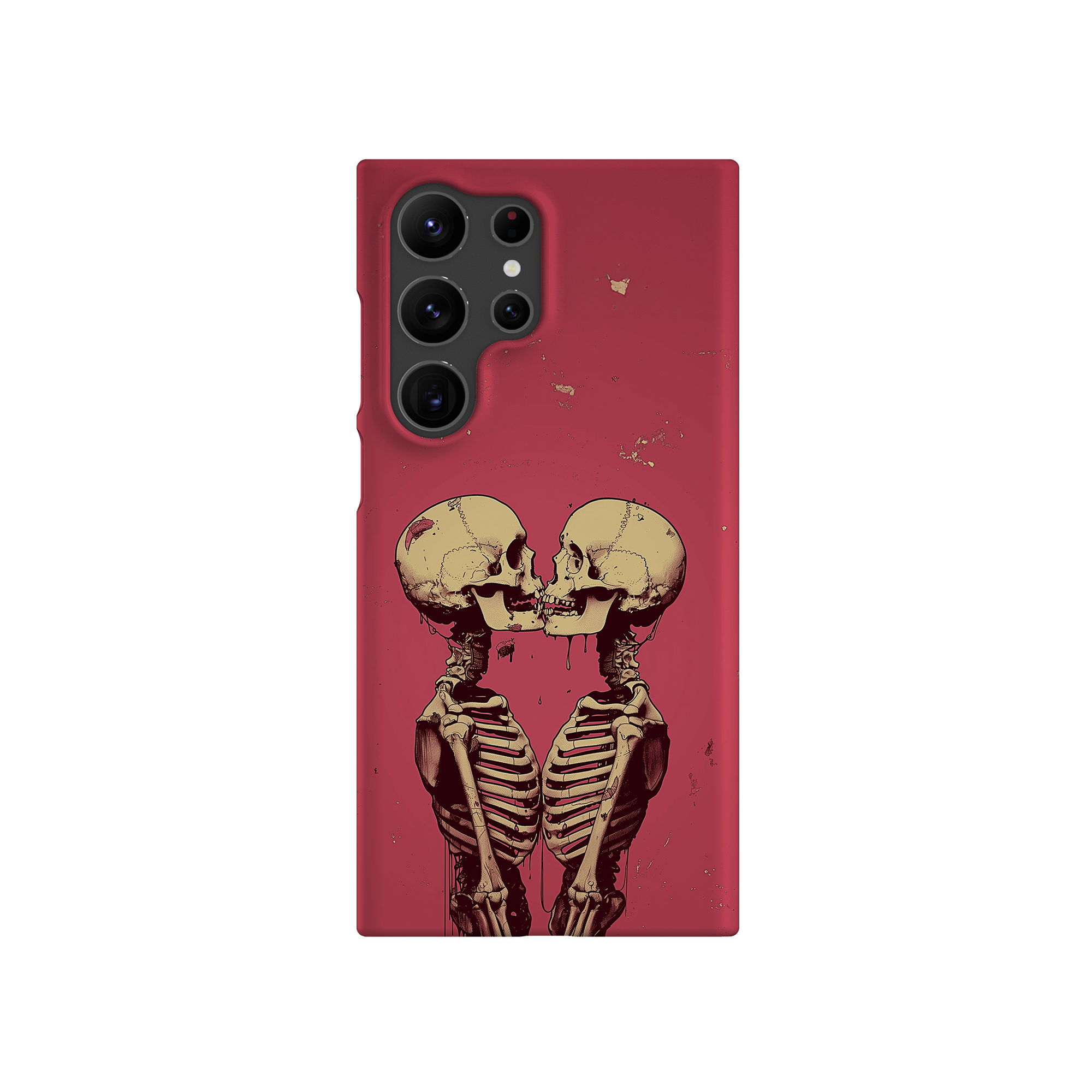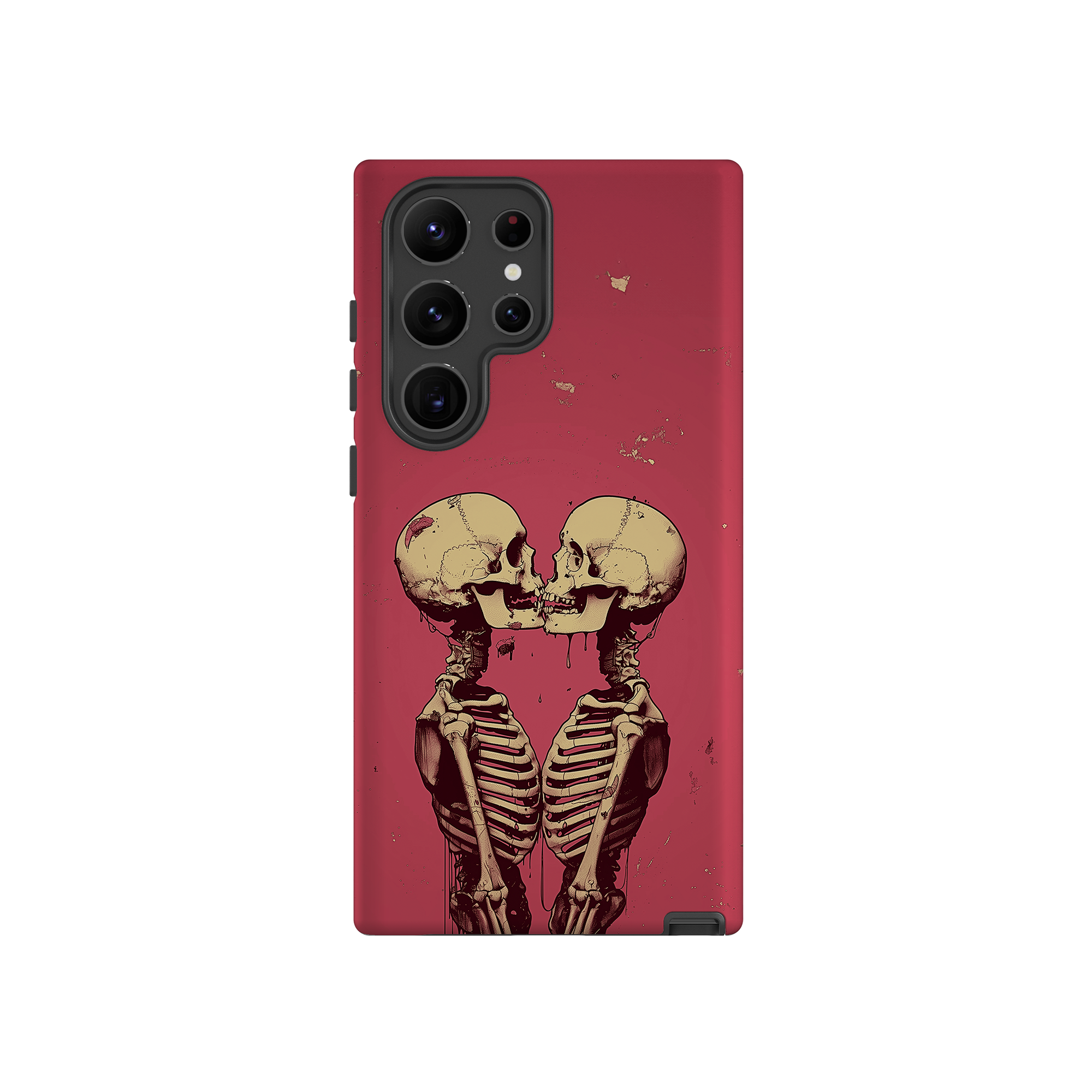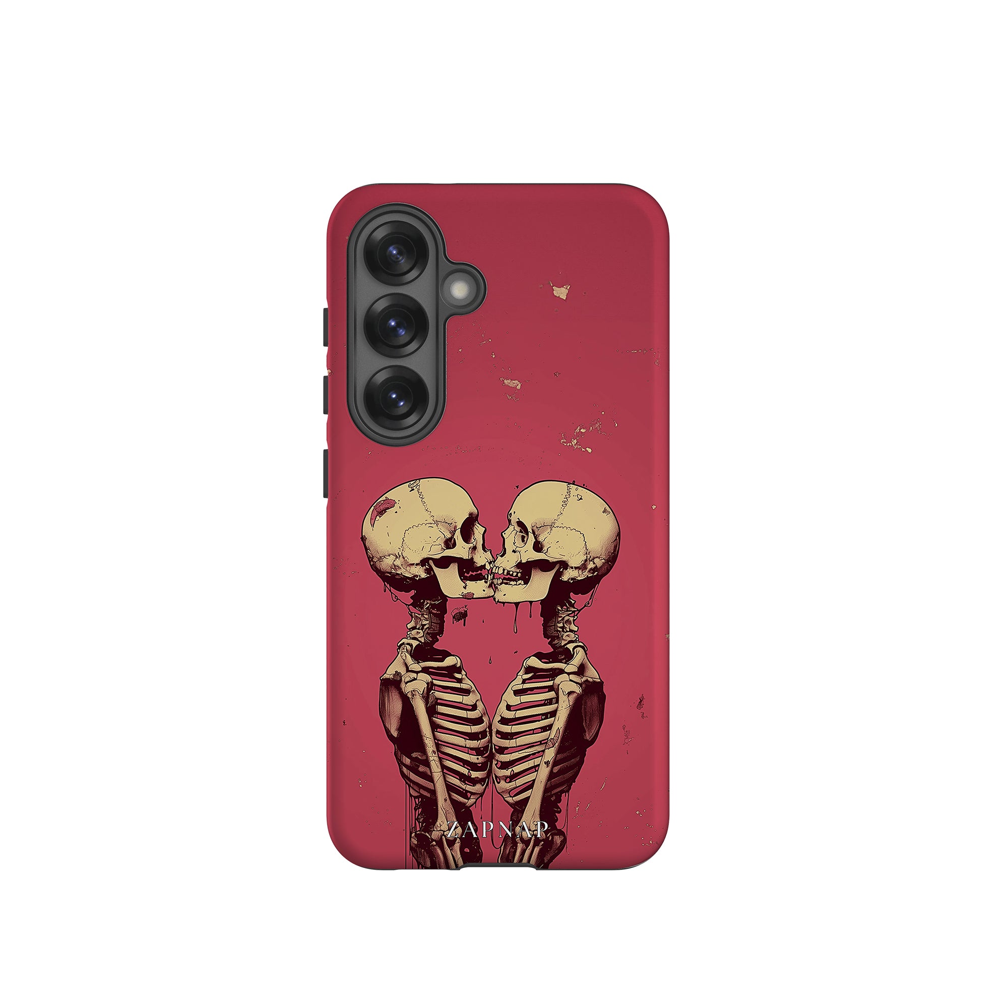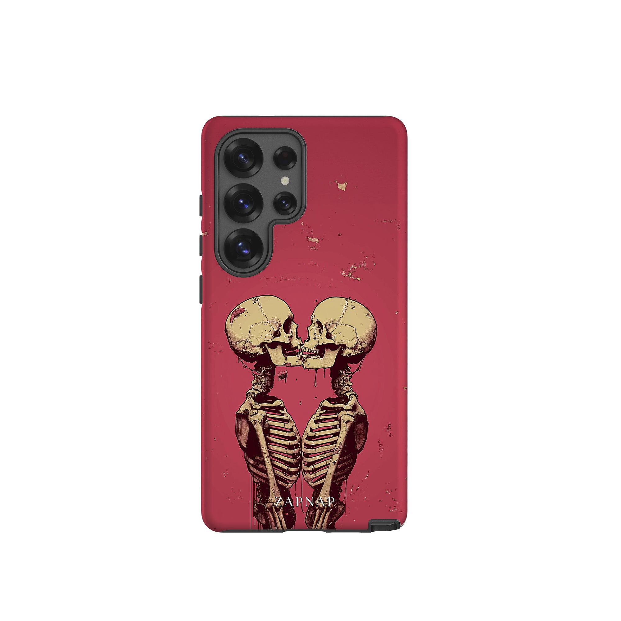 Eternal Embrace depicts two skeletons locked in a tender kiss against a vivid red background. This artwork combines elements of love and mortality, creating a poignant and captivating visual. The skeletal figures, stripped of all but their bones, symbolise enduring affection that transcends life itself.
