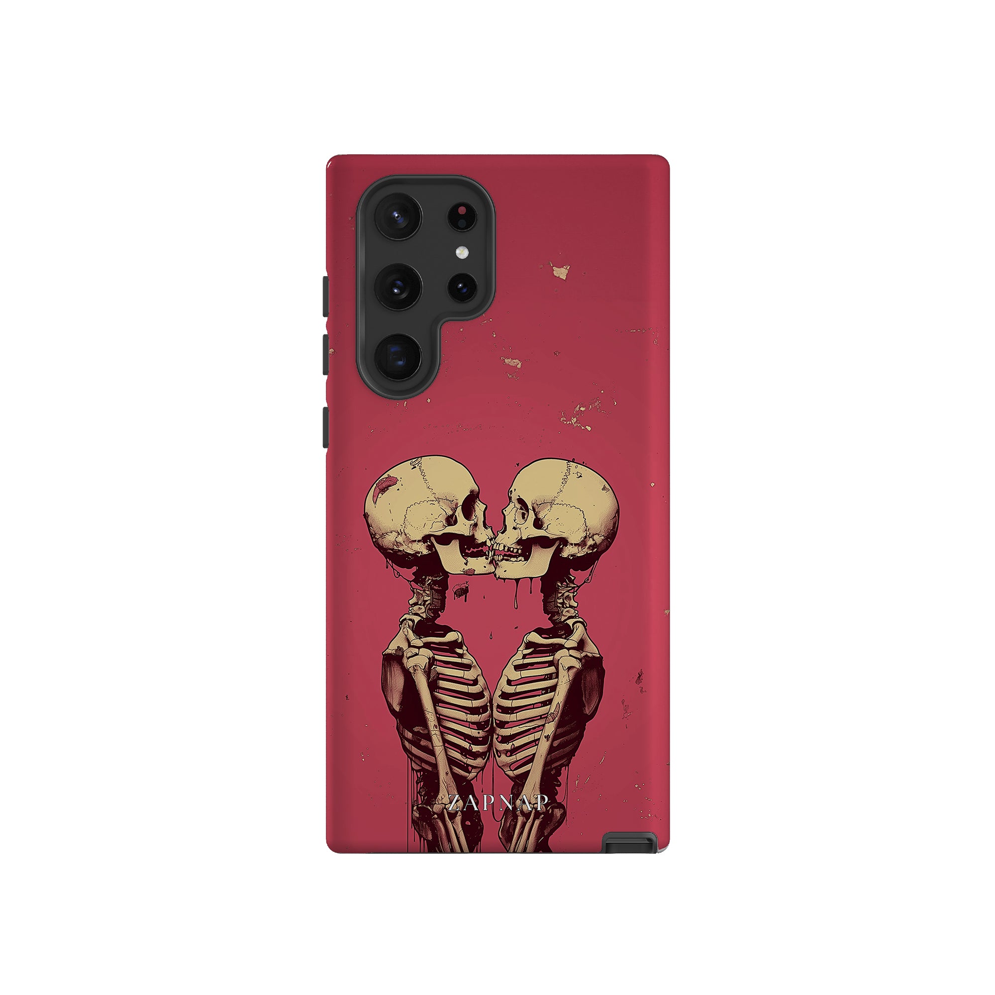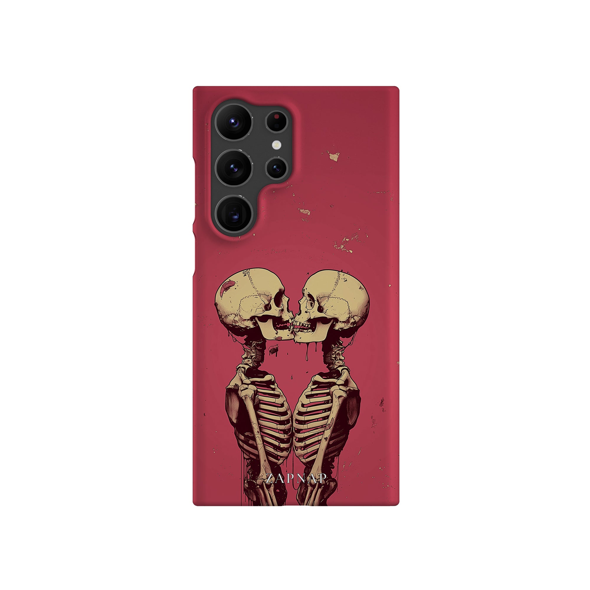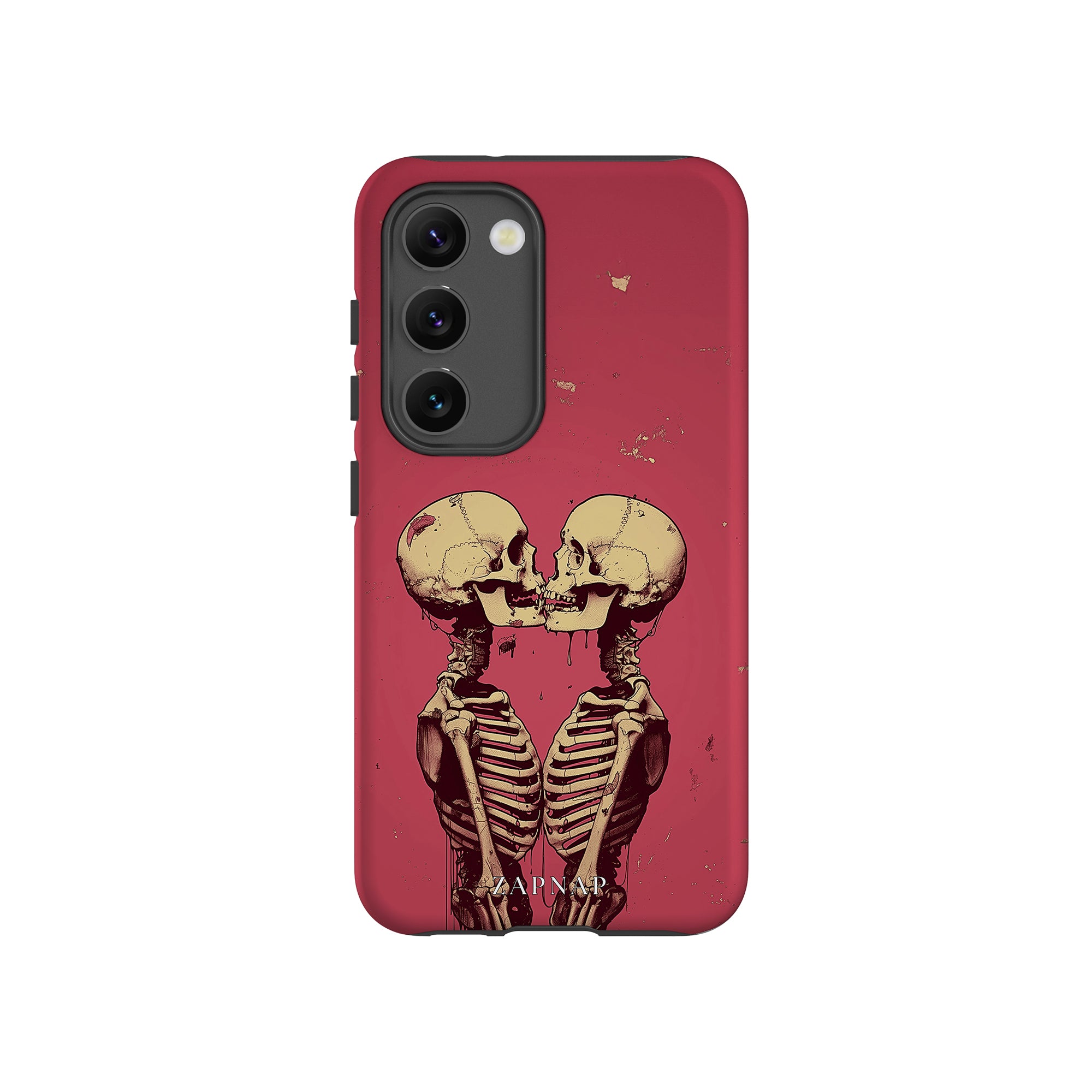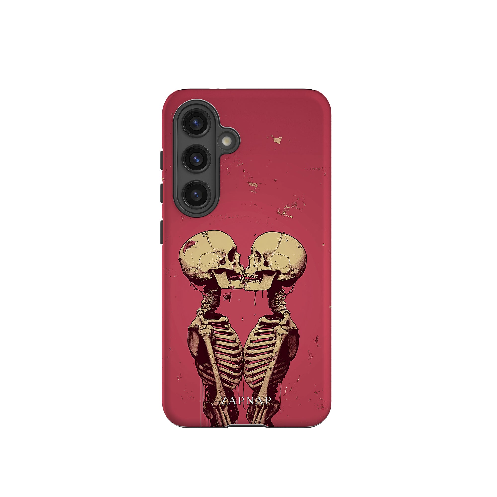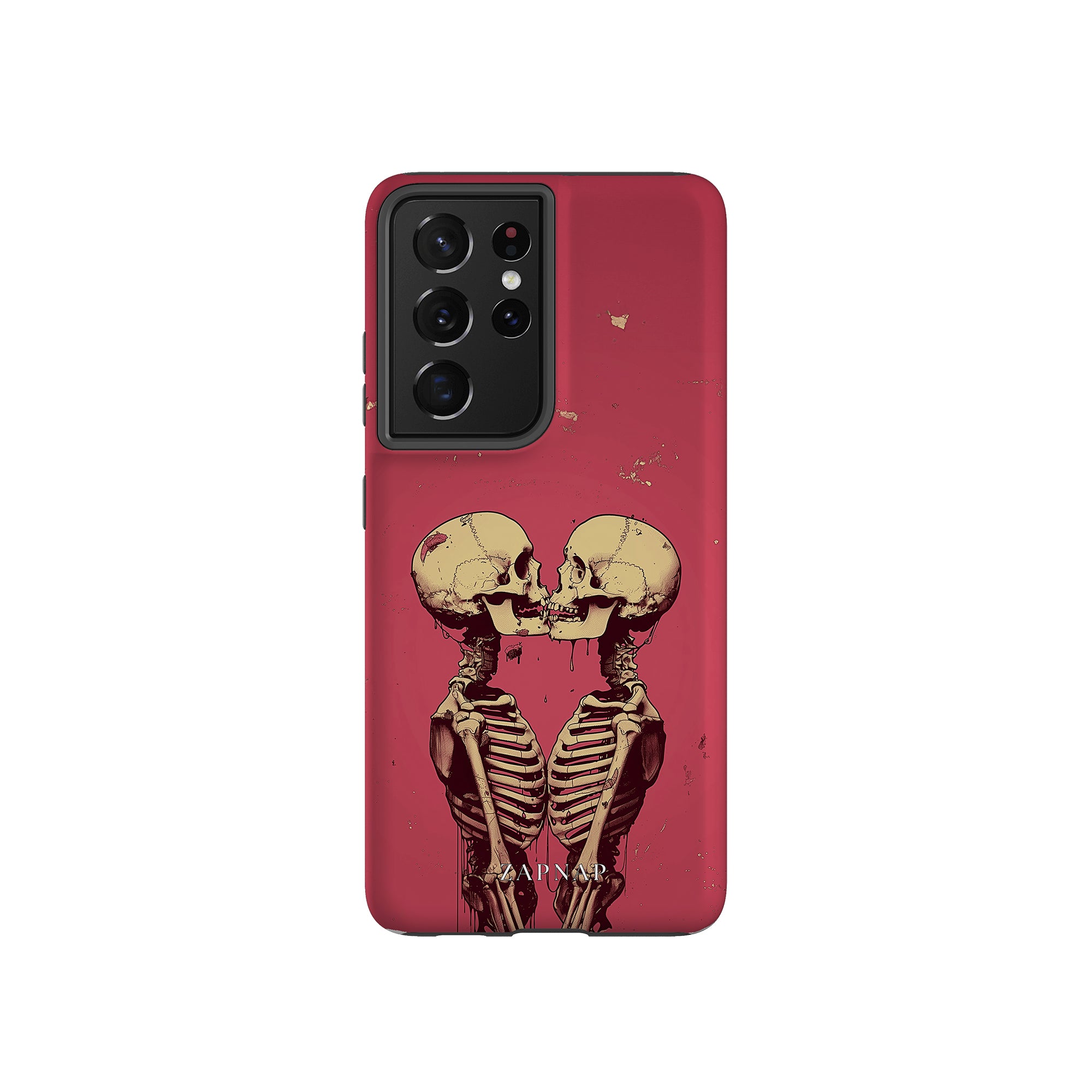 Eternal Embrace depicts two skeletons locked in a tender kiss against a vivid red background. This artwork combines elements of love and mortality, creating a poignant and captivating visual. The skeletal figures, stripped of all but their bones, symbolise enduring affection that transcends life itself.