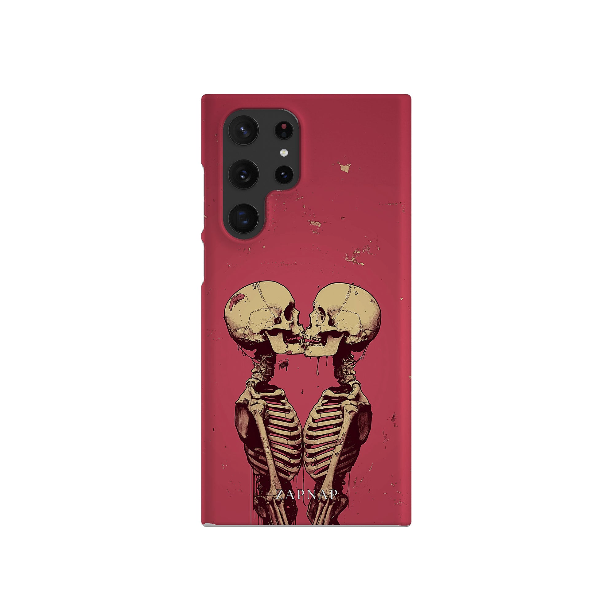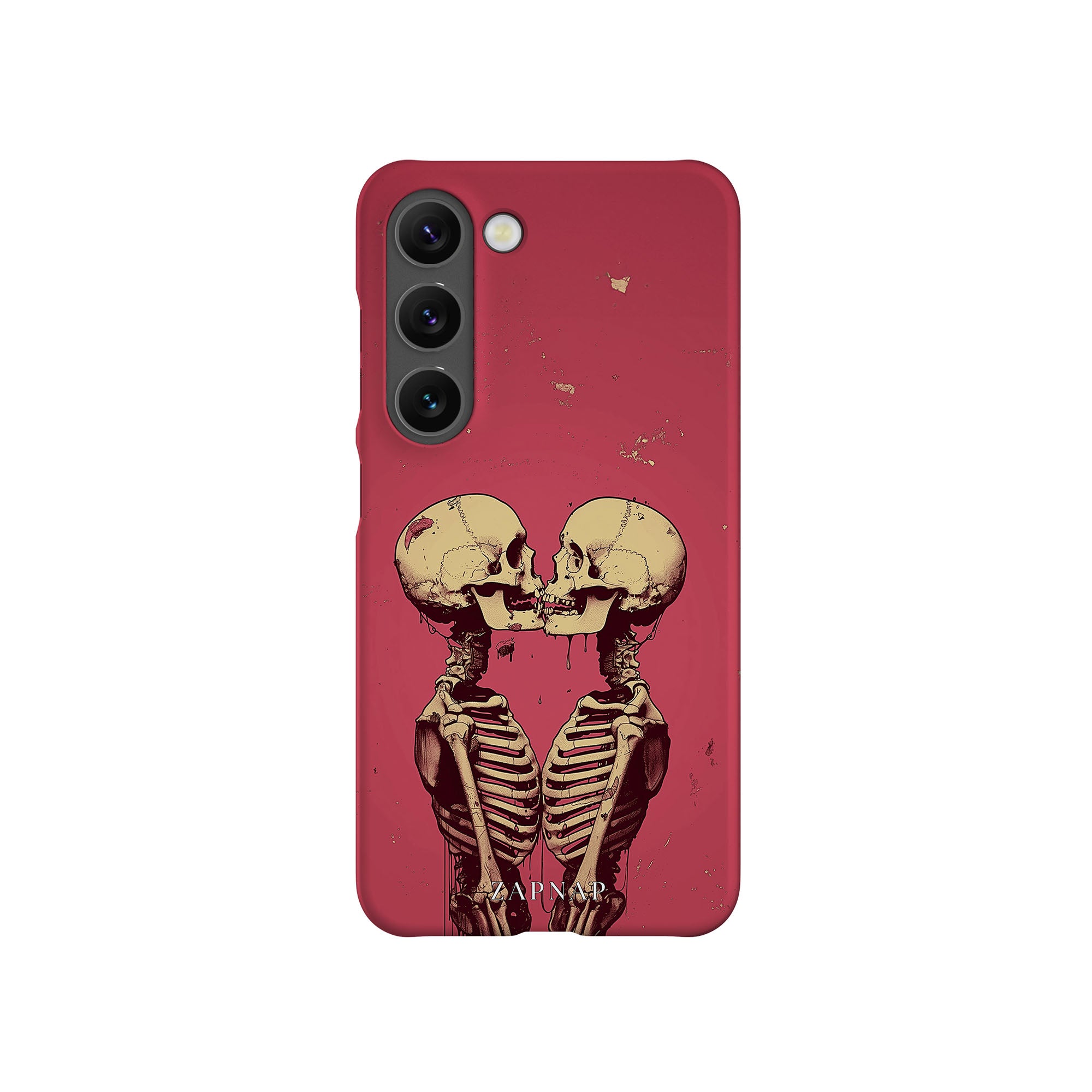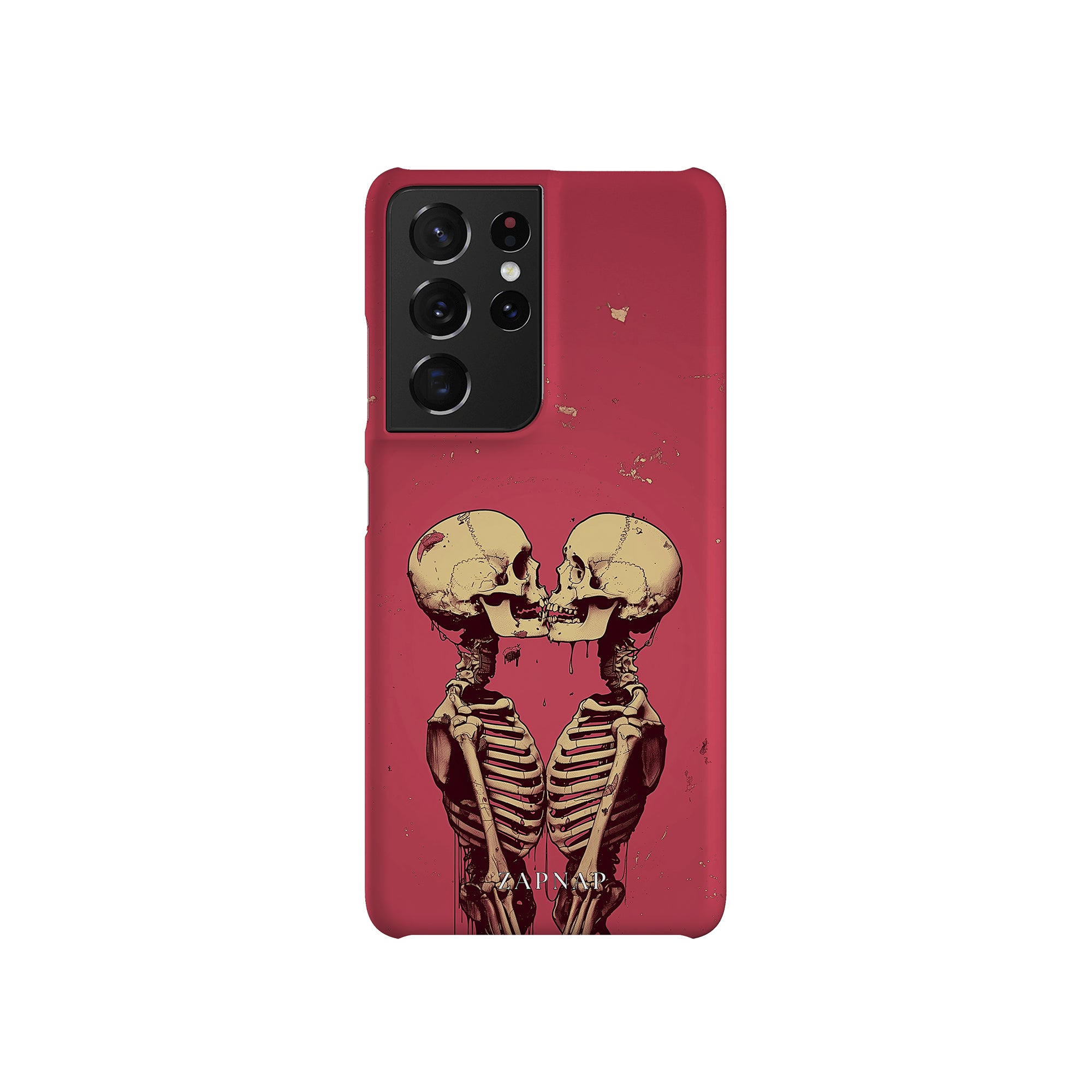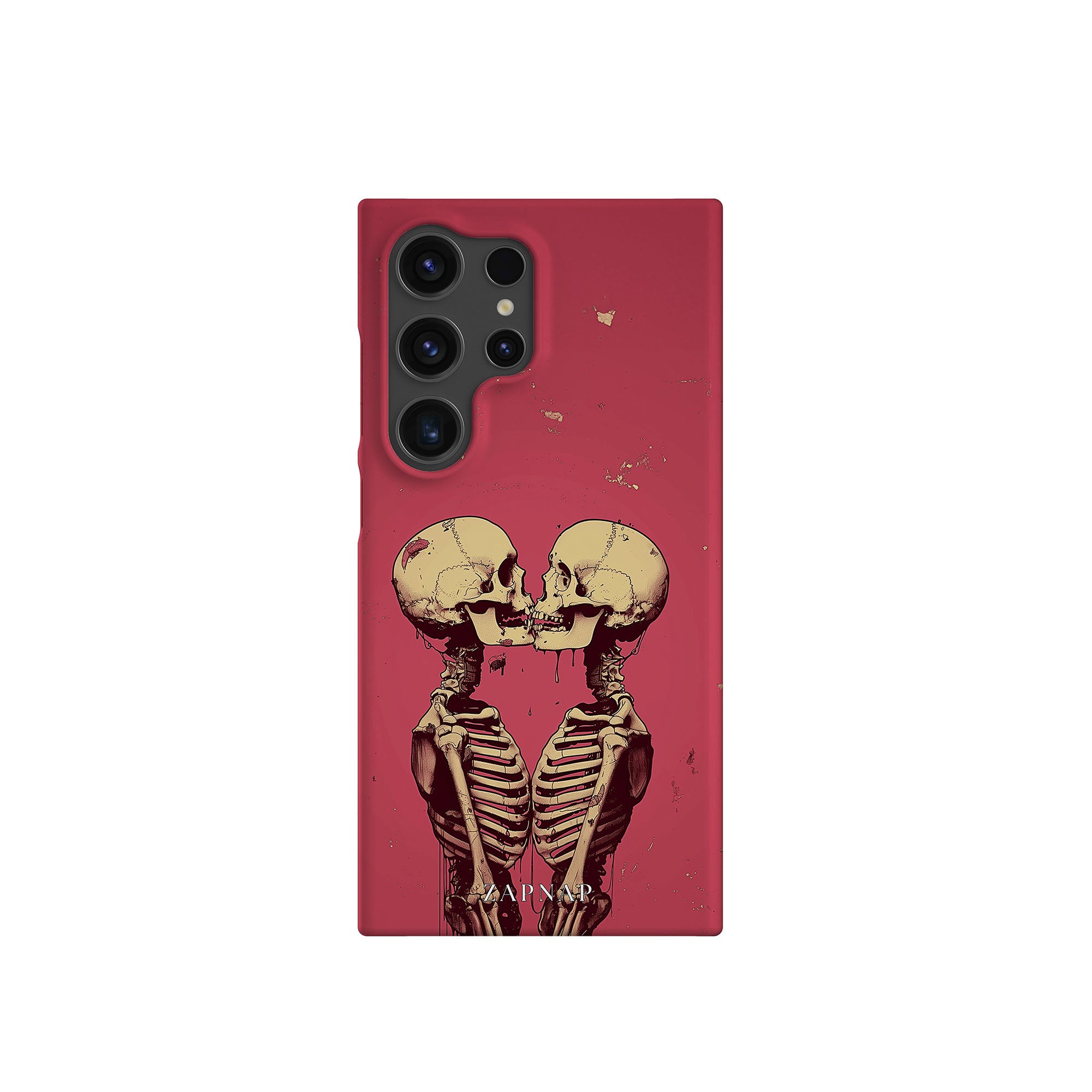 Eternal Embrace depicts two skeletons locked in a tender kiss against a vivid red background. This artwork combines elements of love and mortality, creating a poignant and captivating visual. The skeletal figures, stripped of all but their bones, symbolise enduring affection that transcends life itself.
