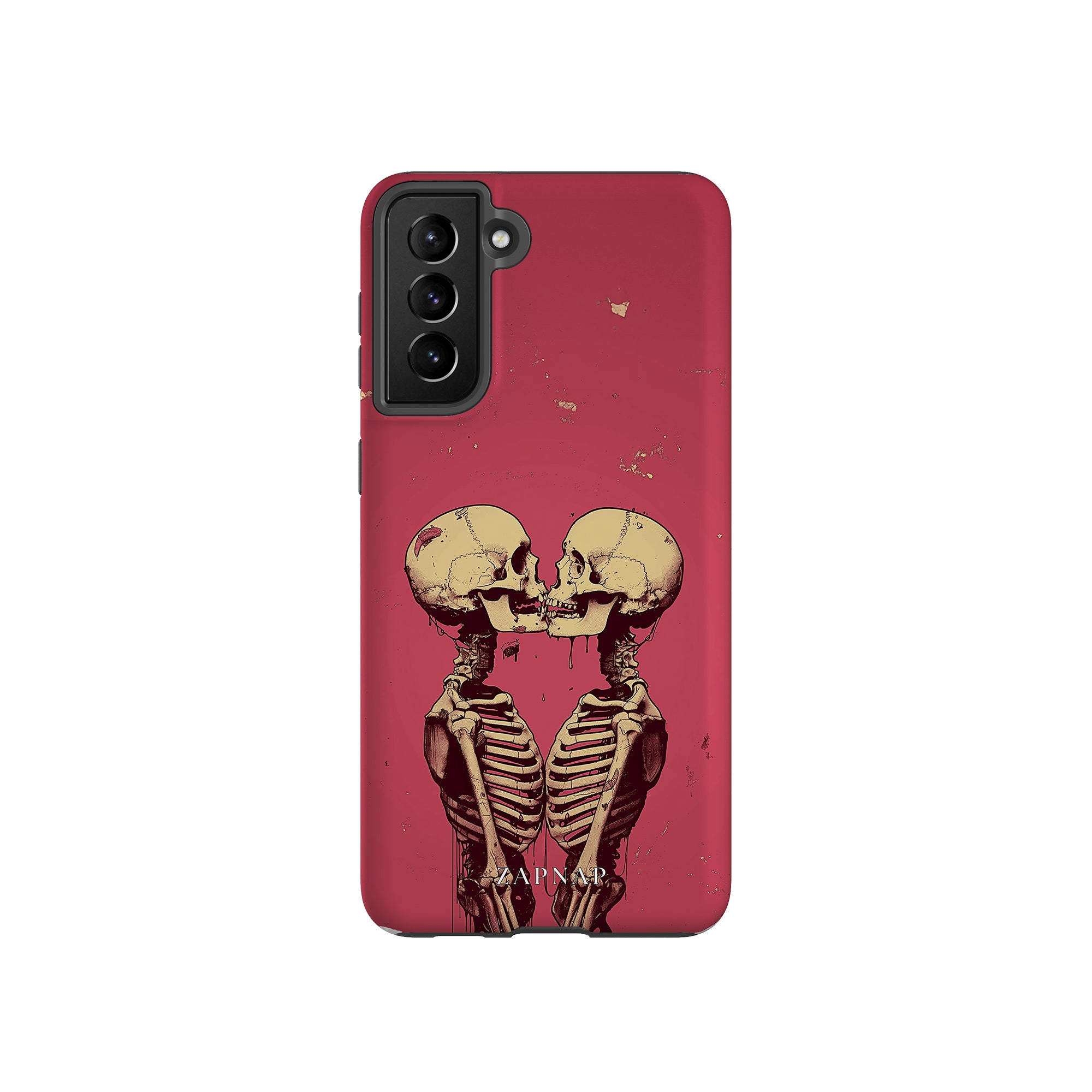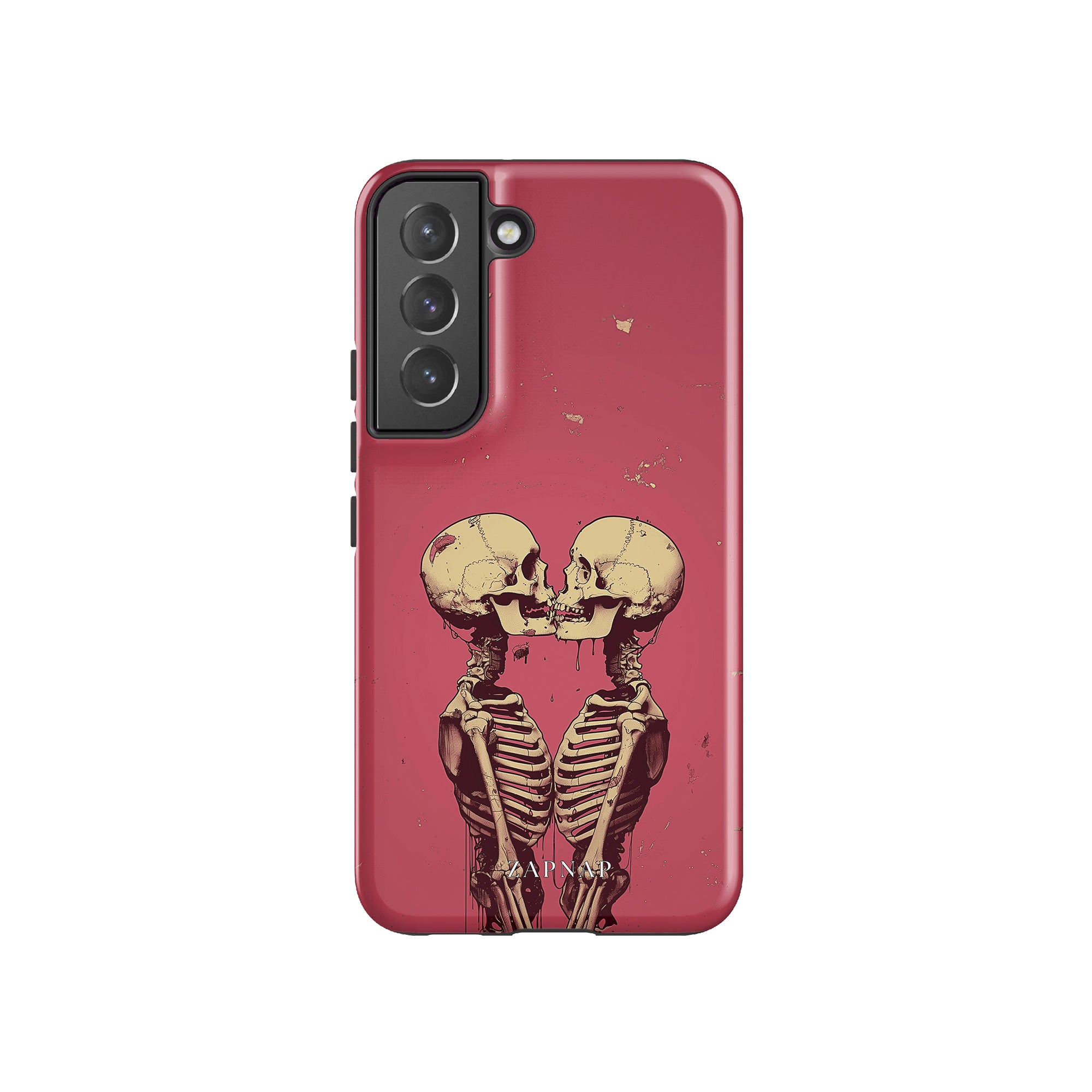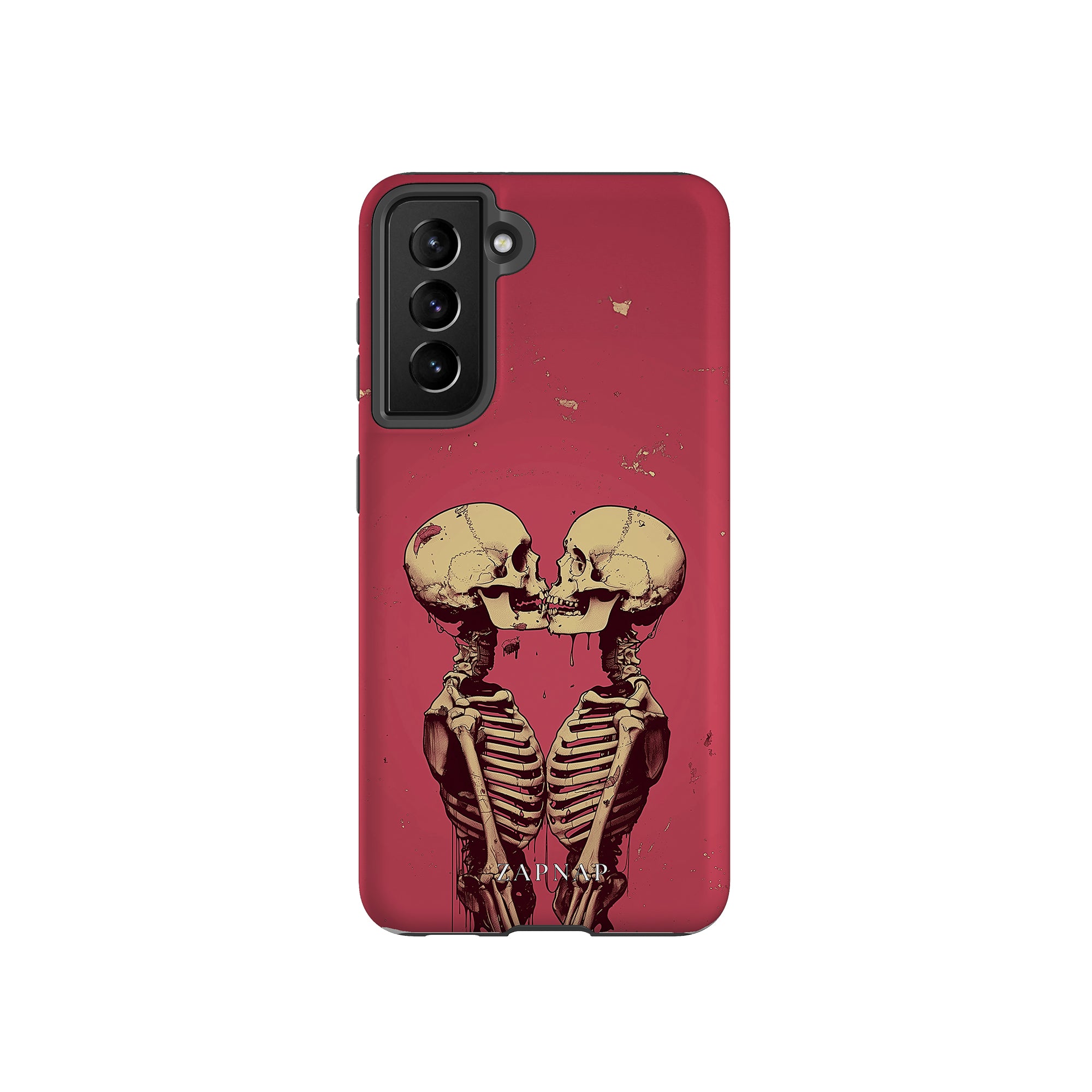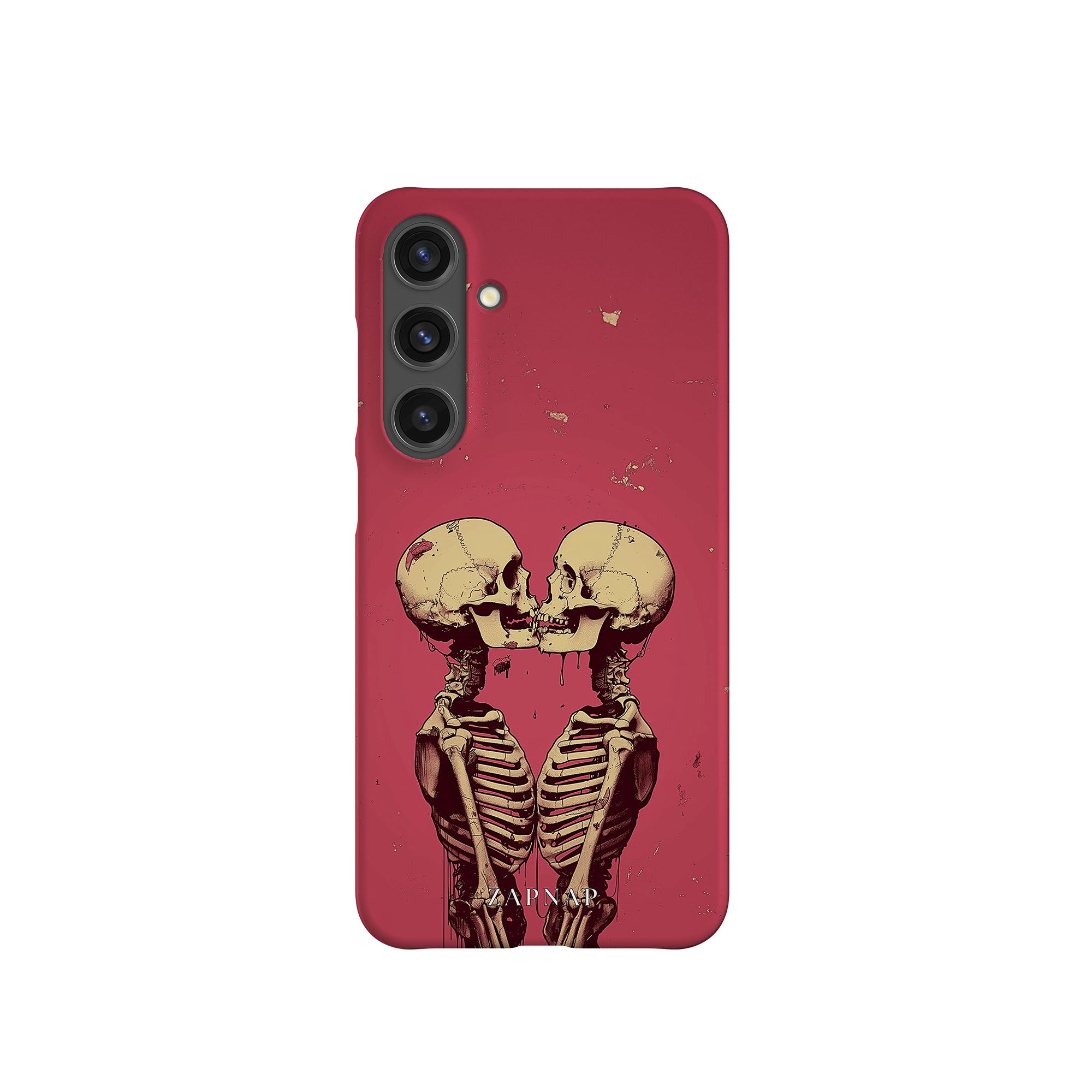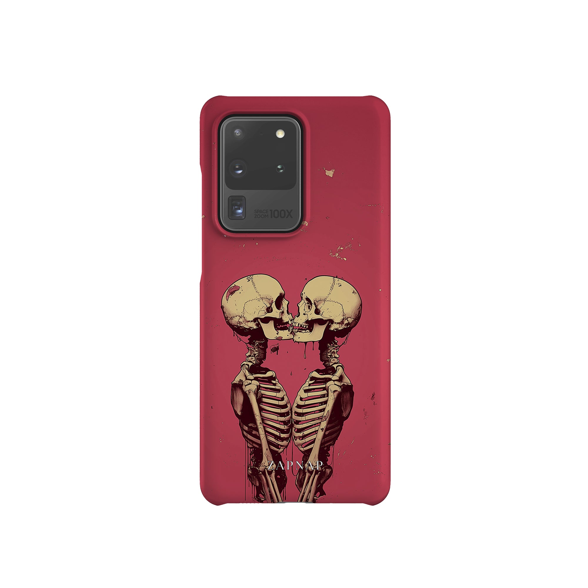 Eternal Embrace depicts two skeletons locked in a tender kiss against a vivid red background. This artwork combines elements of love and mortality, creating a poignant and captivating visual. The skeletal figures, stripped of all but their bones, symbolise enduring affection that transcends life itself.