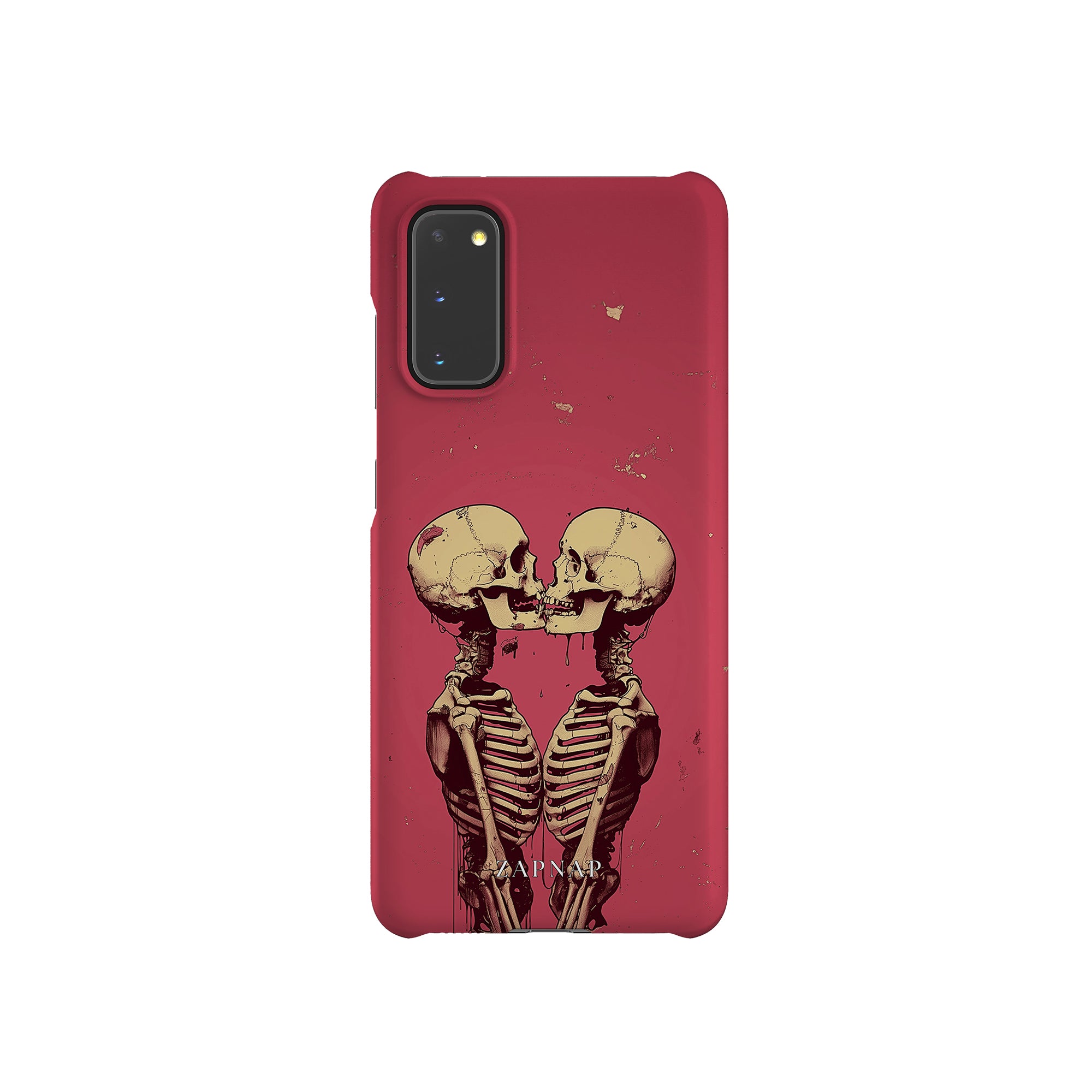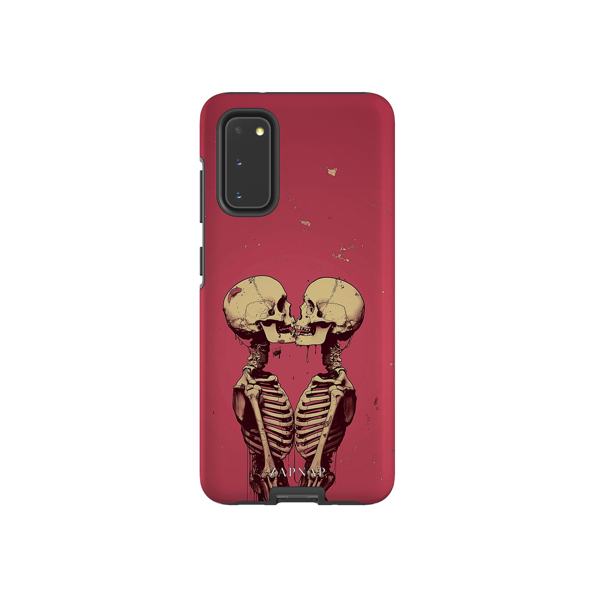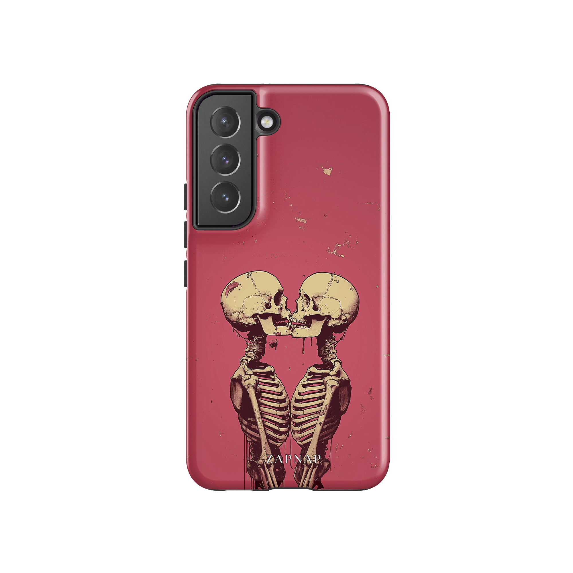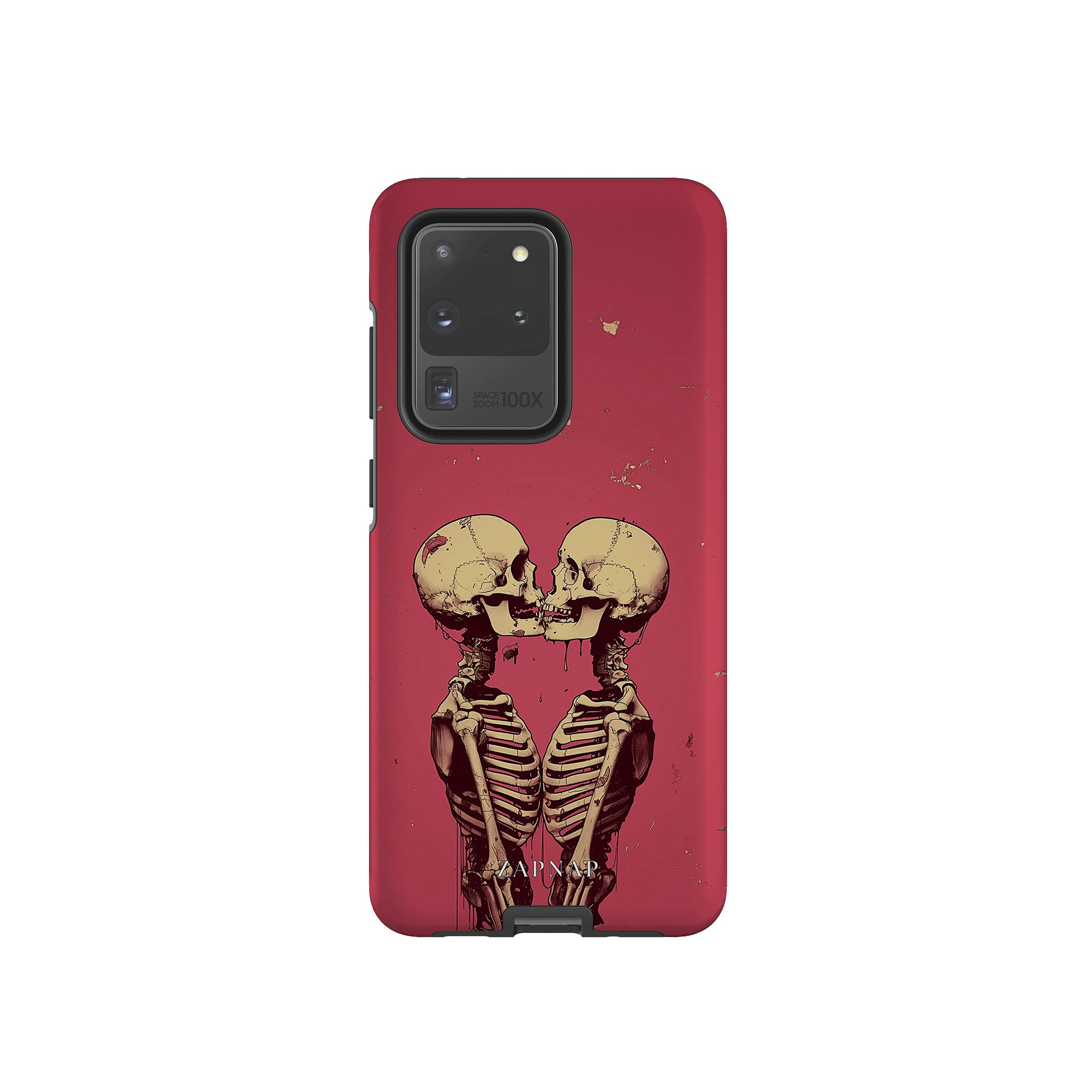 Eternal Embrace depicts two skeletons locked in a tender kiss against a vivid red background. This artwork combines elements of love and mortality, creating a poignant and captivating visual. The skeletal figures, stripped of all but their bones, symbolise enduring affection that transcends life itself.