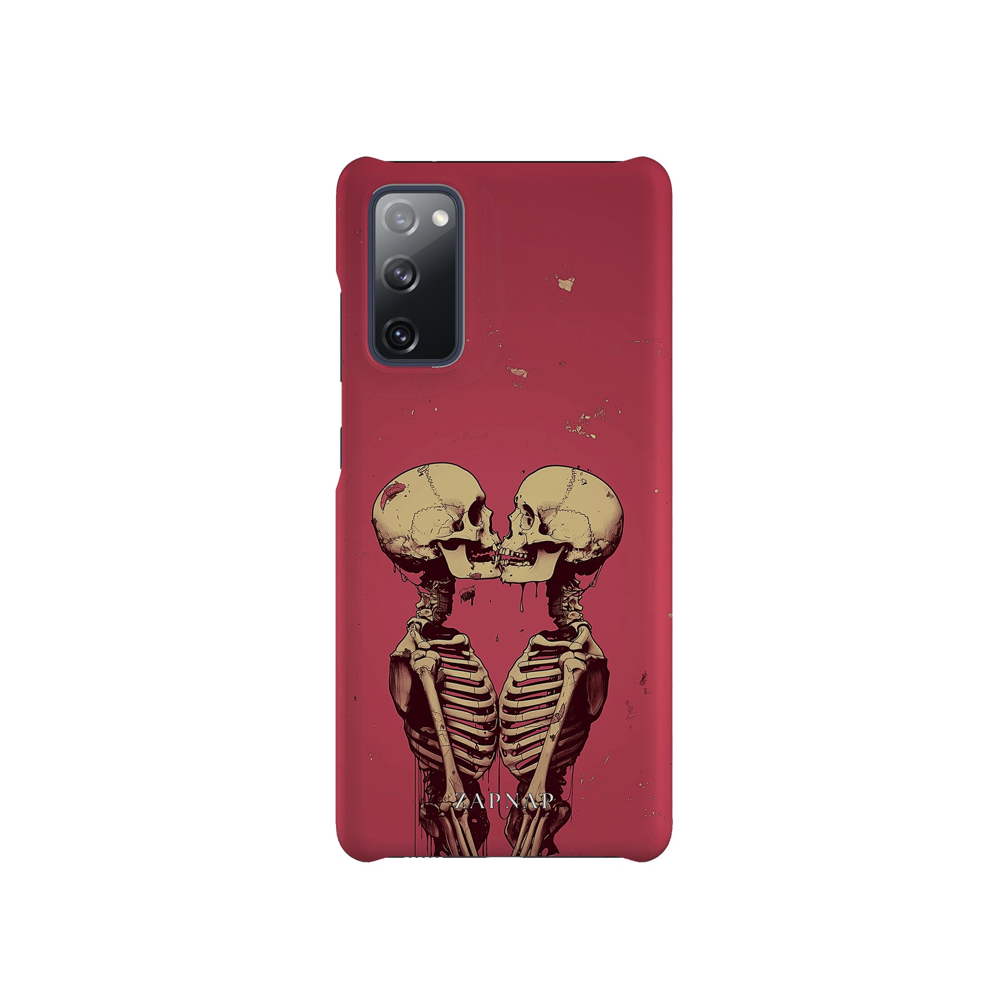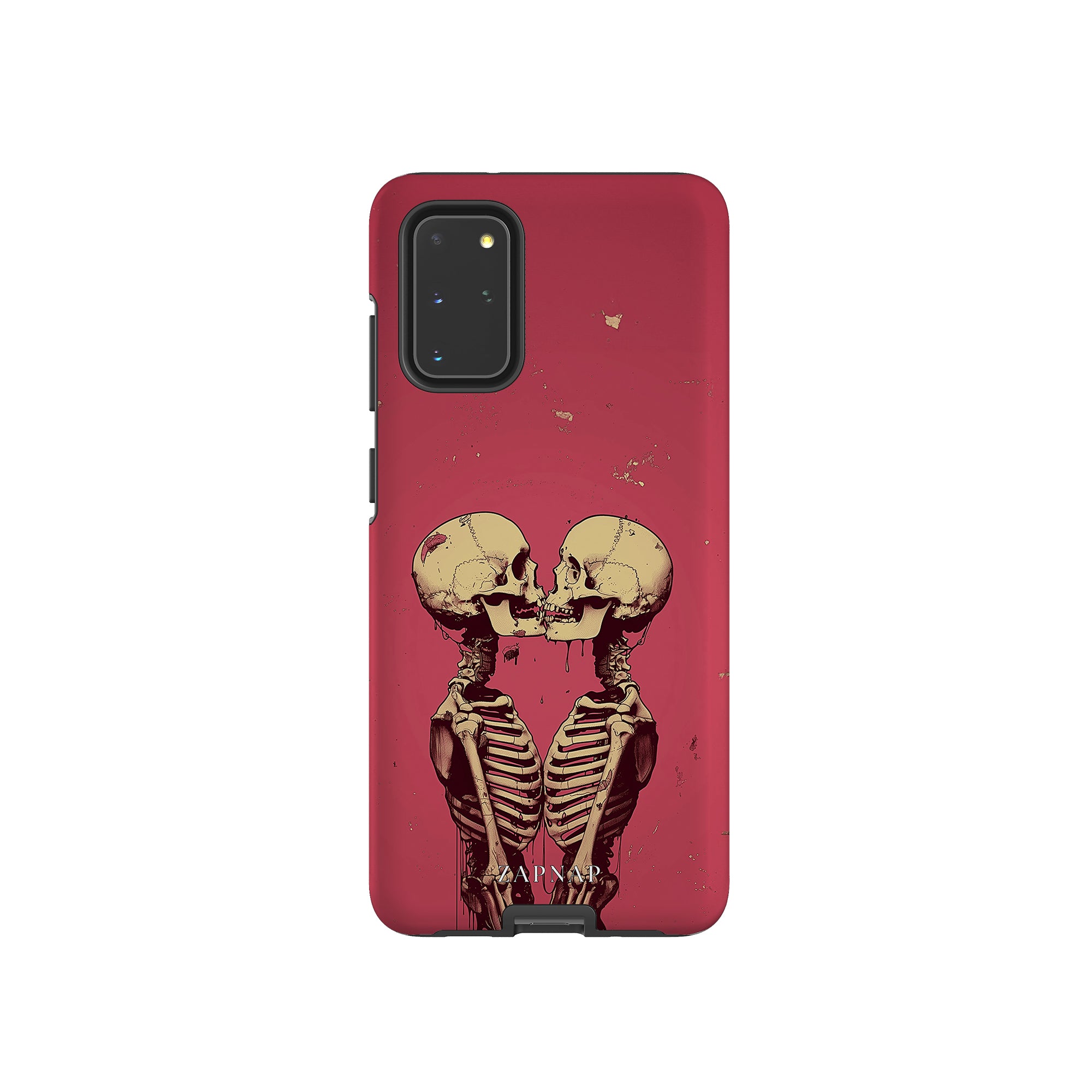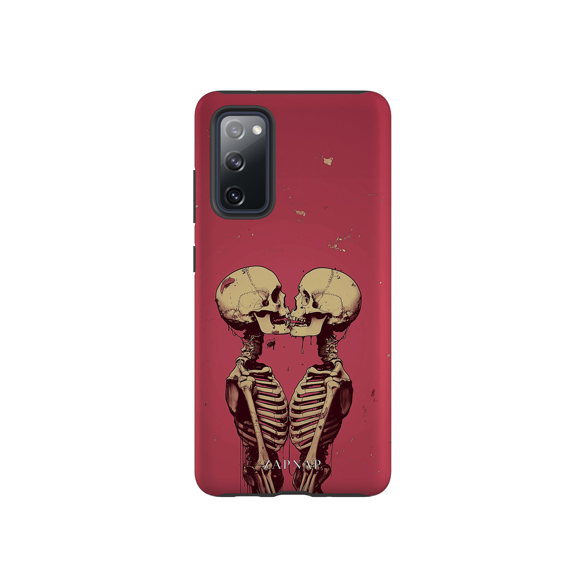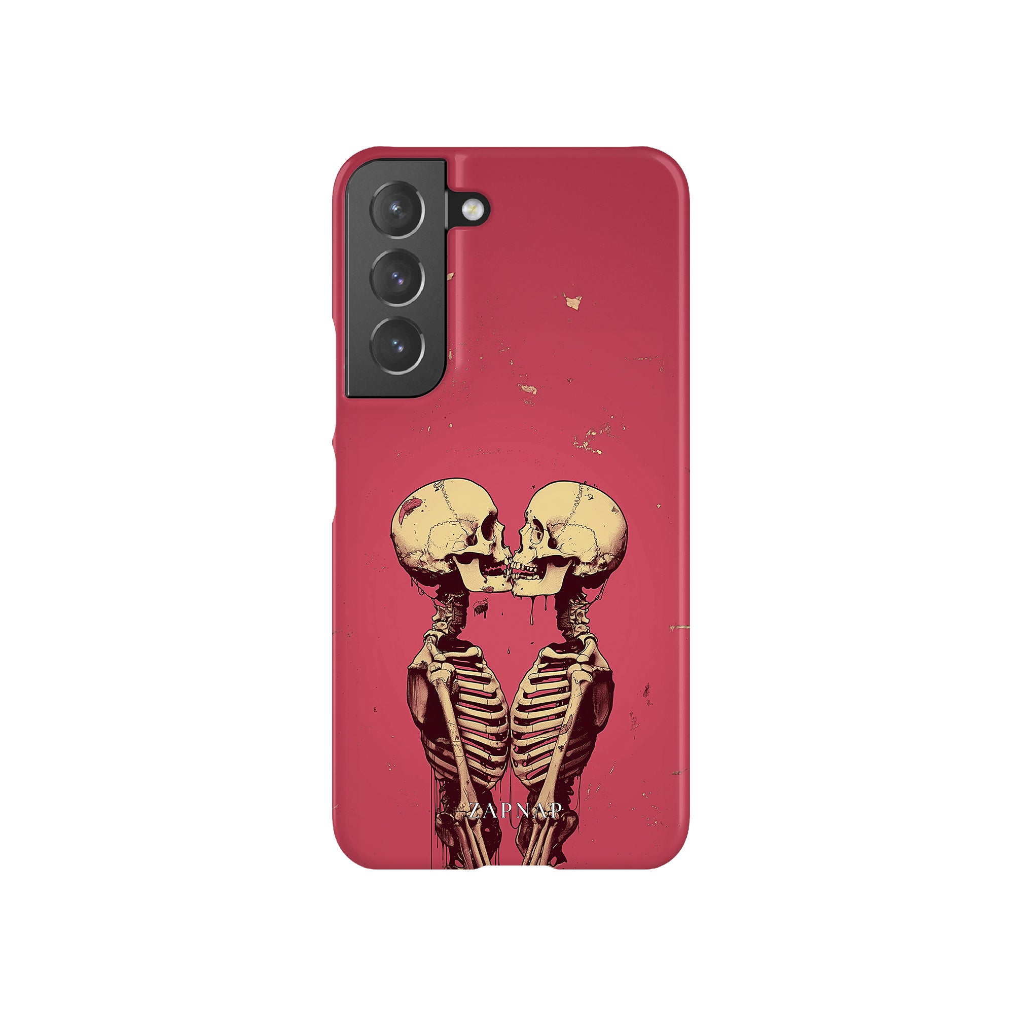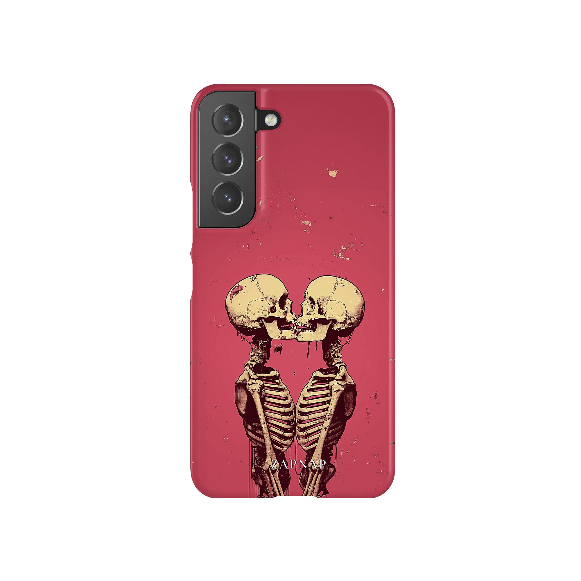 Eternal Embrace depicts two skeletons locked in a tender kiss against a vivid red background. This artwork combines elements of love and mortality, creating a poignant and captivating visual. The skeletal figures, stripped of all but their bones, symbolise enduring affection that transcends life itself.