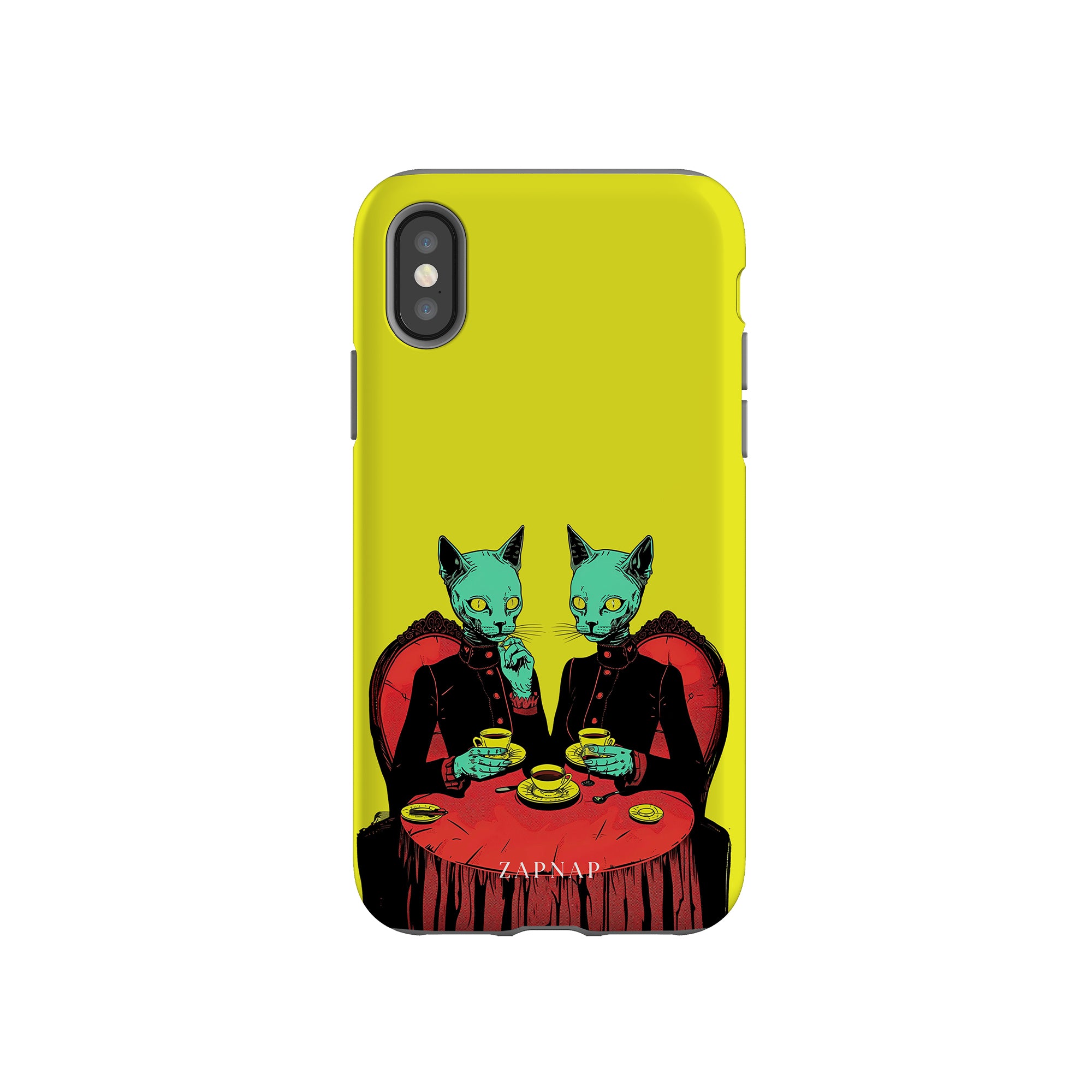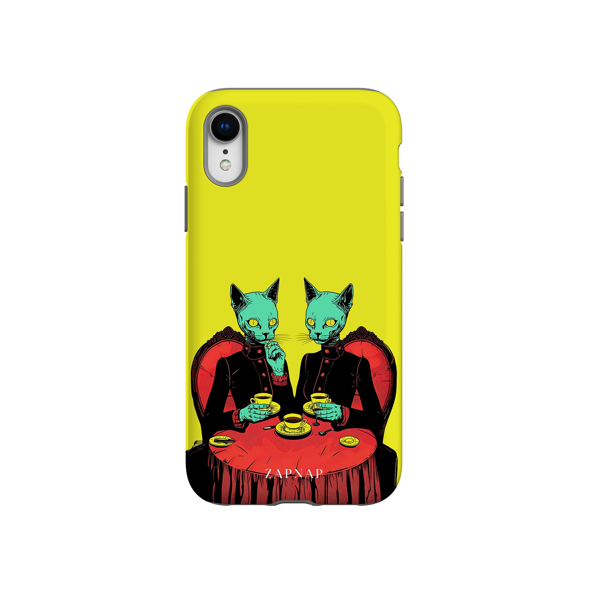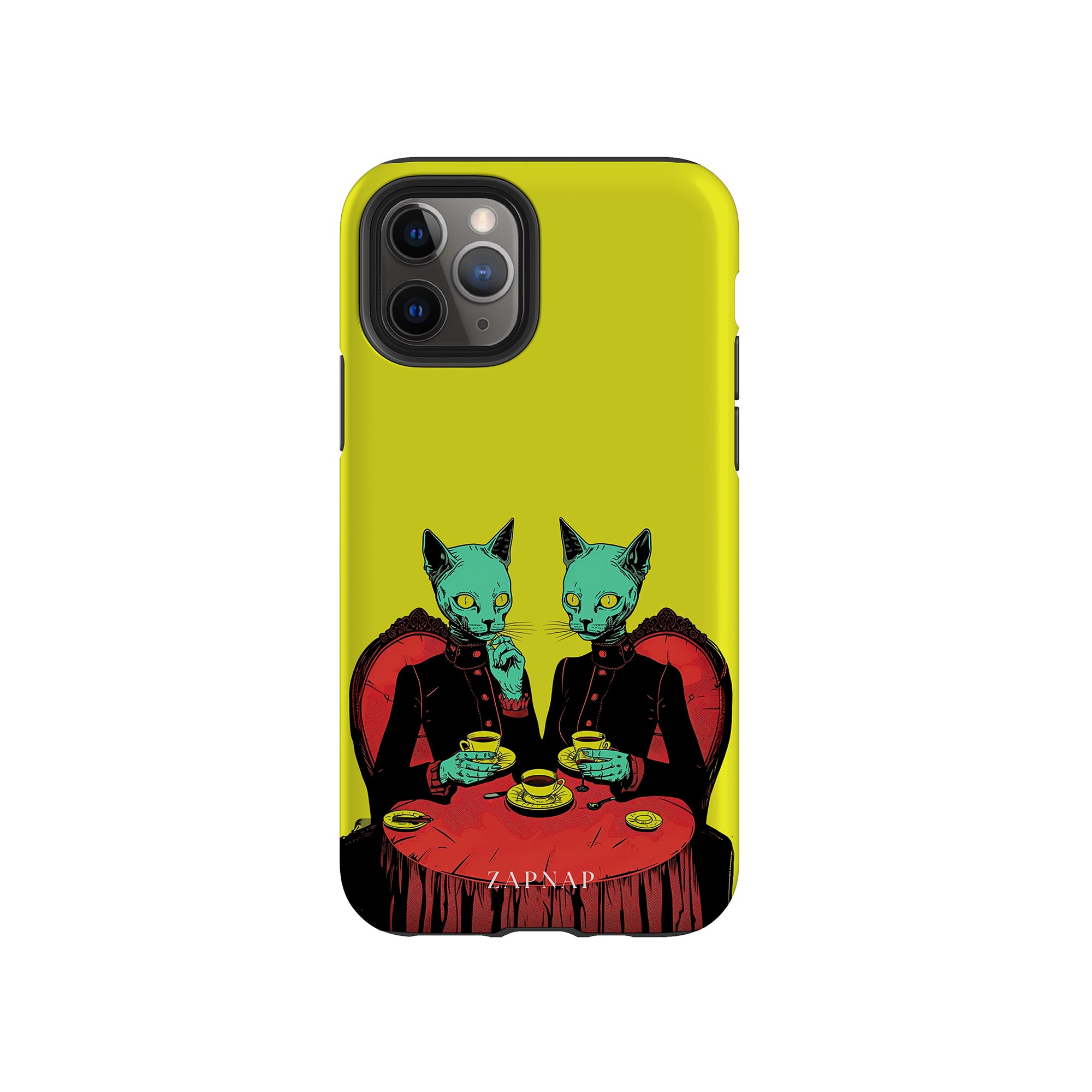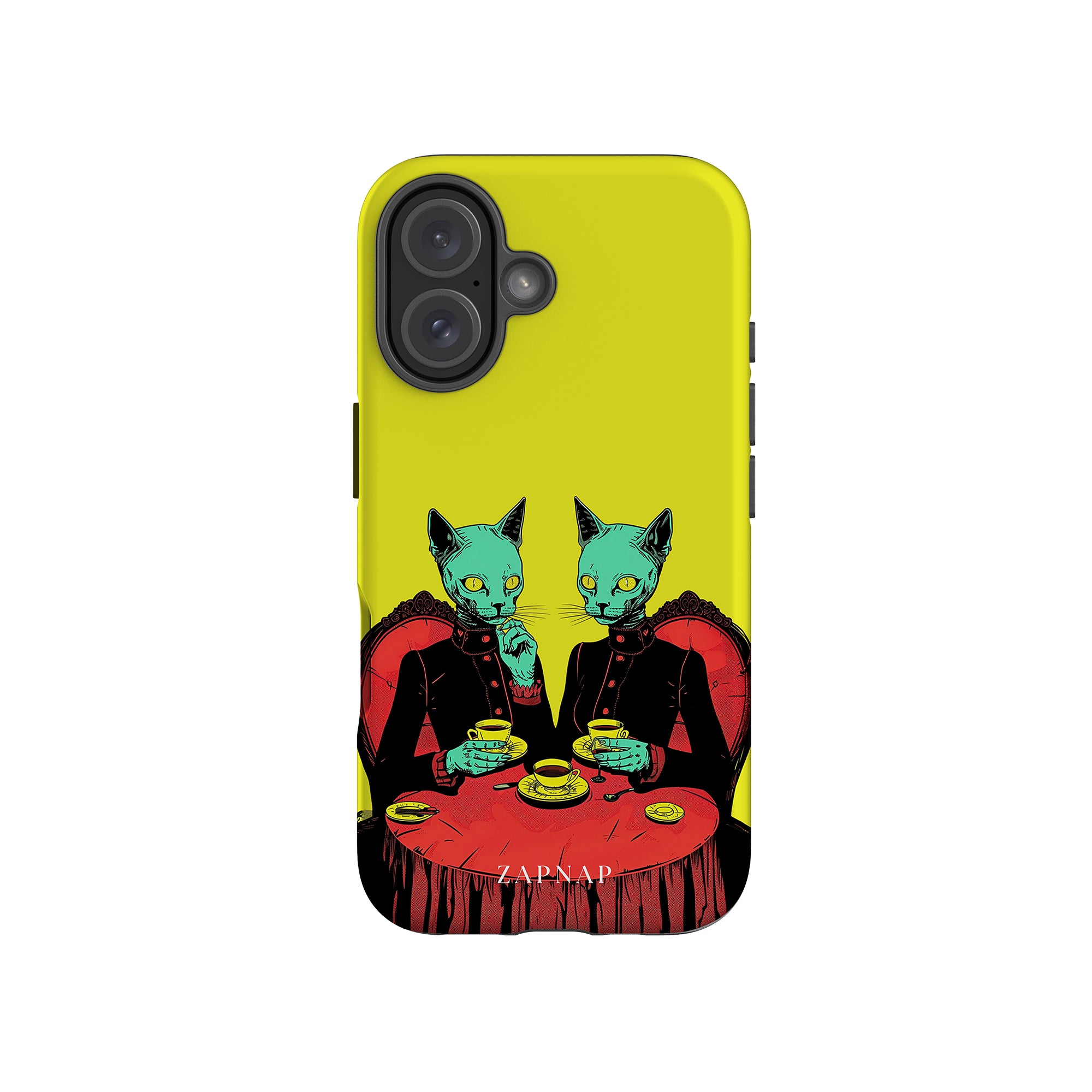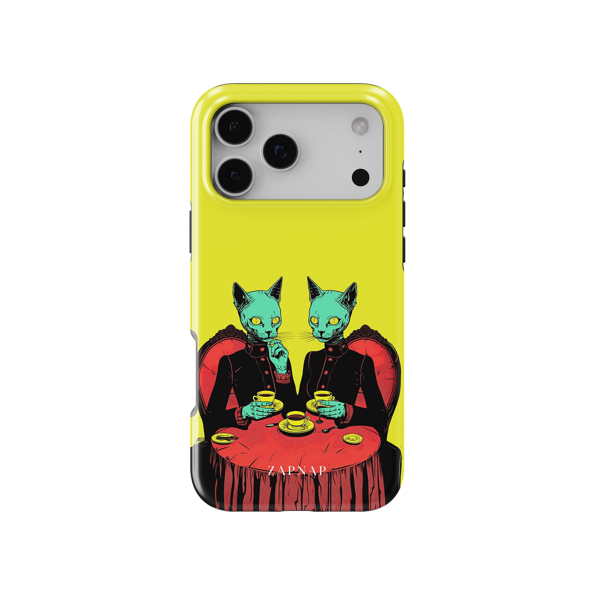 Feline Noir showcases two gothic cats with a striking green hue, seated at a richly adorned table, enjoying their tea. The vivid yellow background sharply contrasts with the deep red and black elements, creating an intense, otherworldly scene. This artwork masterfully blends elegance with the bizarre, making it a captivating piece for those who appreciate dark, surreal aesthetics.