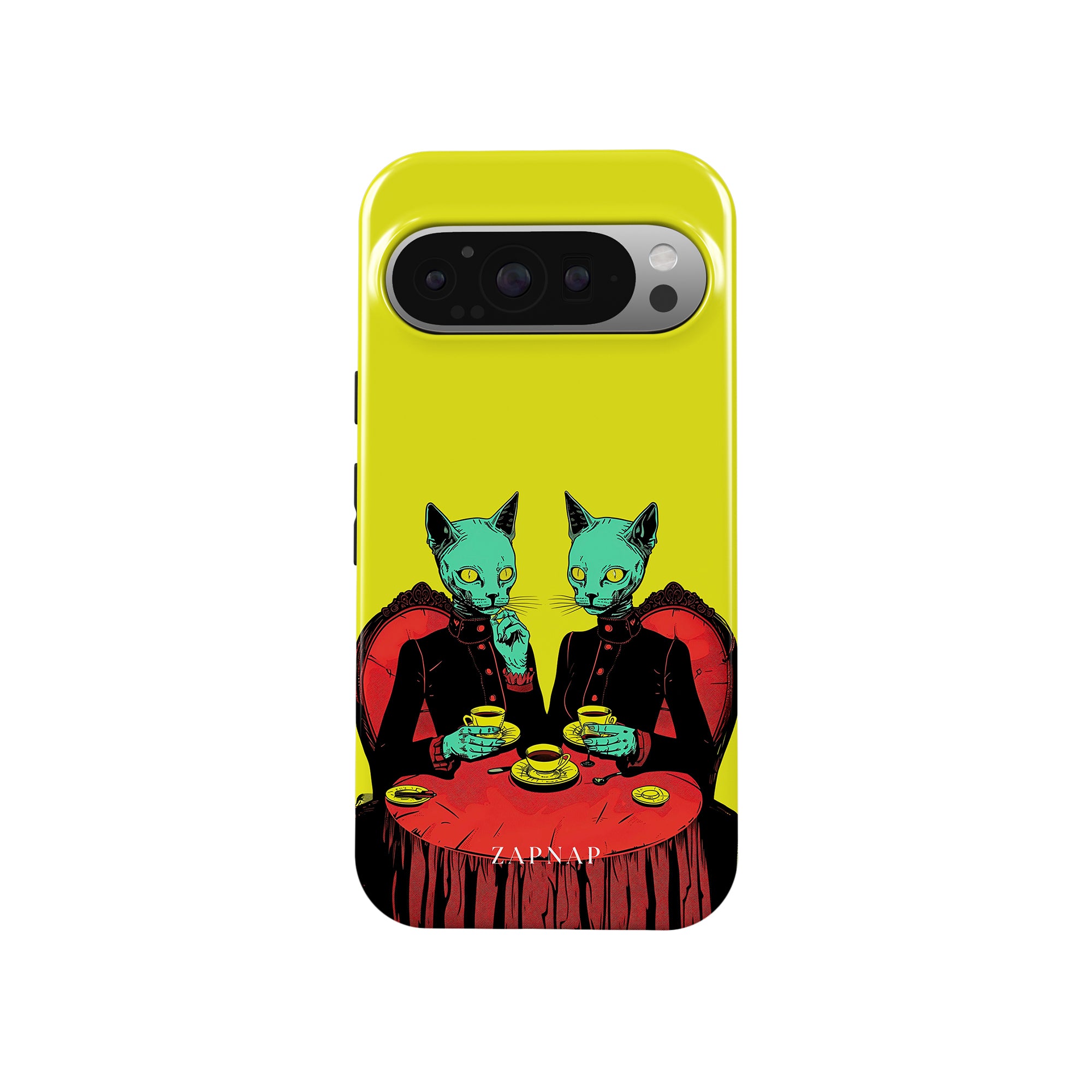 Feline Noir showcases two gothic cats with a striking green hue, seated at a richly adorned table, enjoying their tea. The vivid yellow background sharply contrasts with the deep red and black elements, creating an intense, otherworldly scene. This artwork masterfully blends elegance with the bizarre, making it a captivating piece for those who appreciate dark, surreal aesthetics.