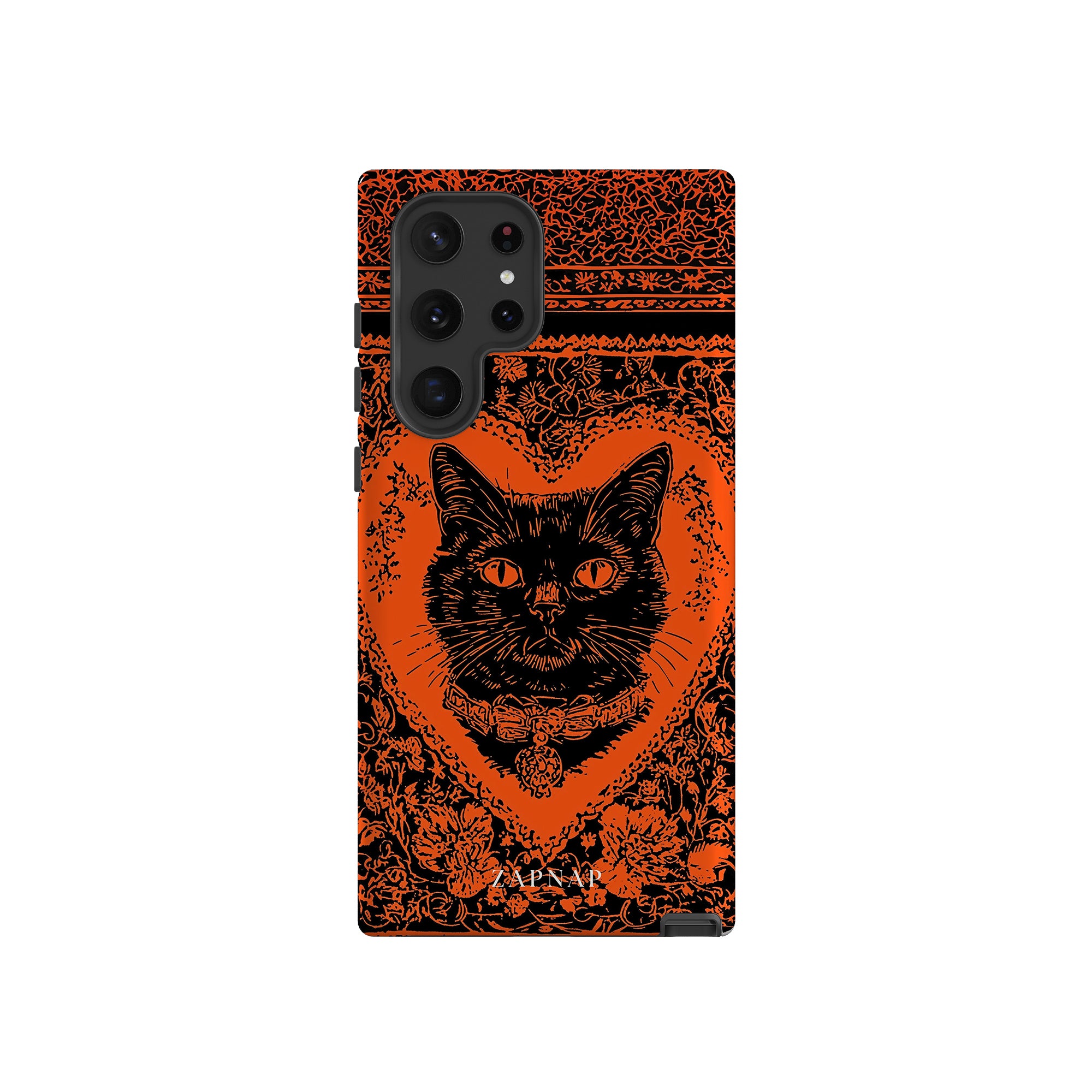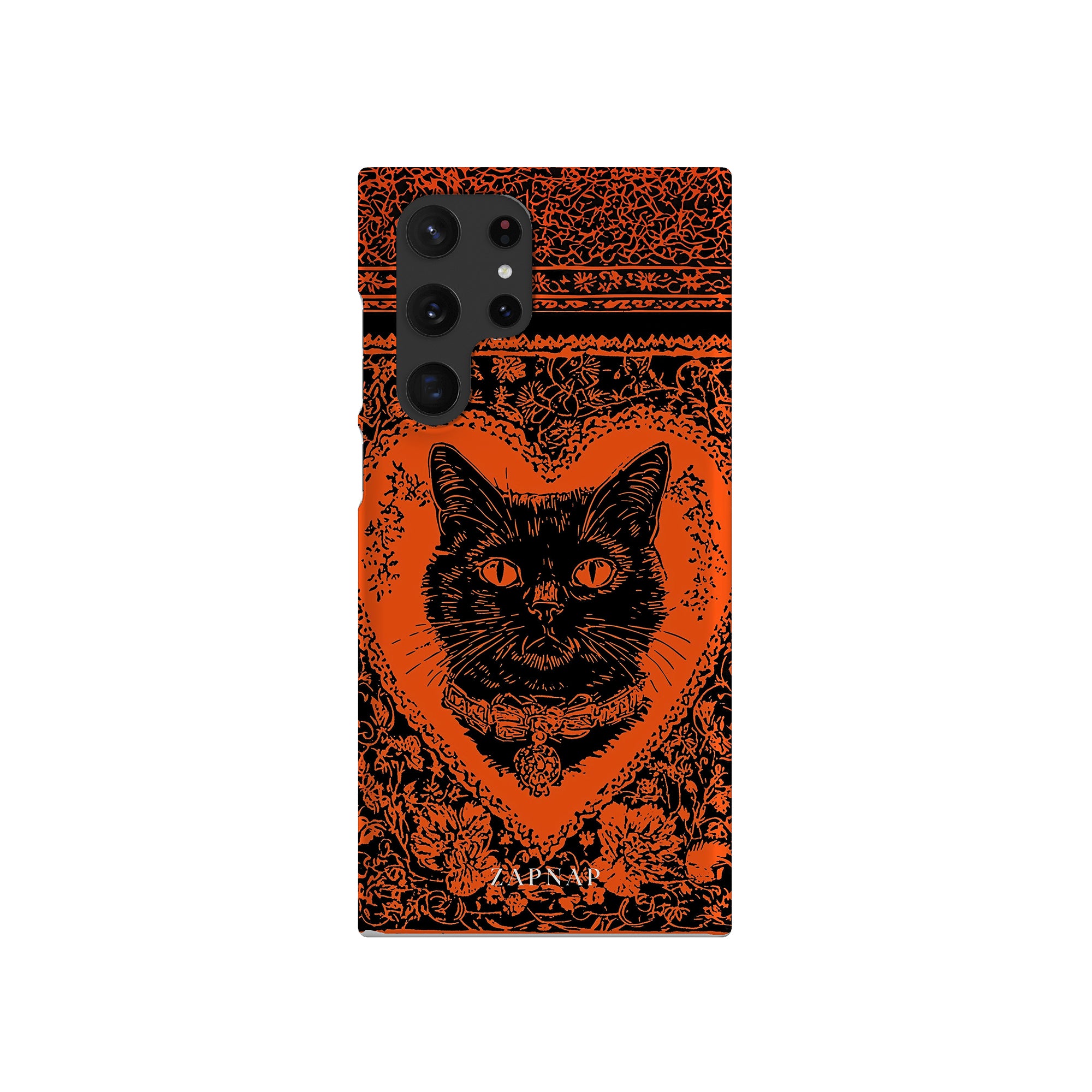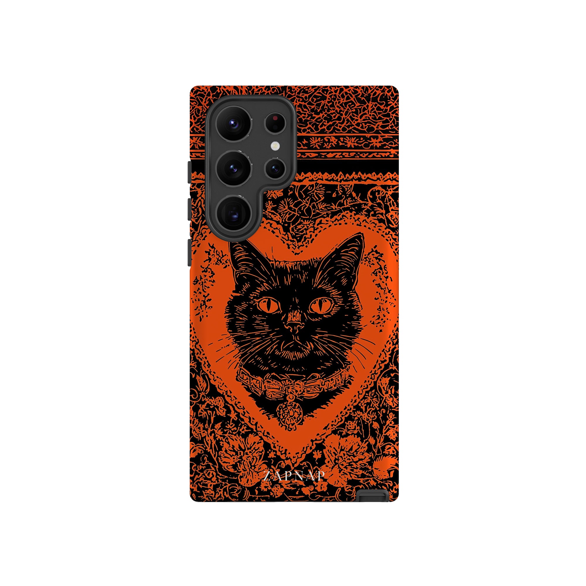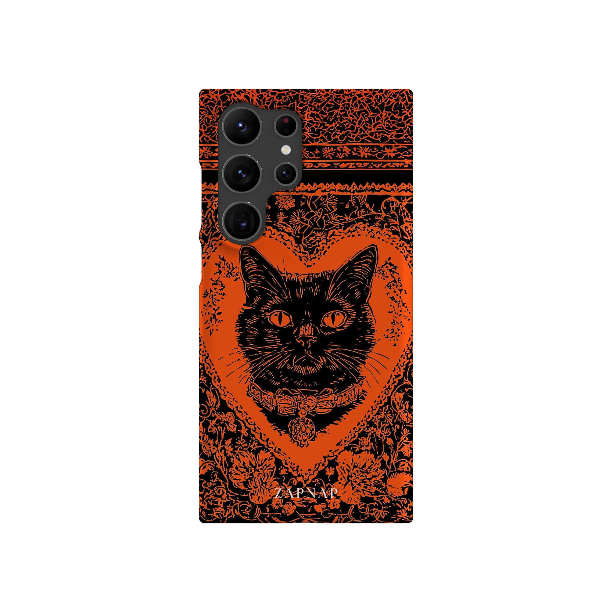 This hauntingly beautiful artwork features a black cat encased in intricate, gothic patterns, exuding mystery and allure. With bold orange and black contrasts, the cat’s intense gaze draws viewers into a world of shadows and secrets, embodying the mystique of the feline spirit.