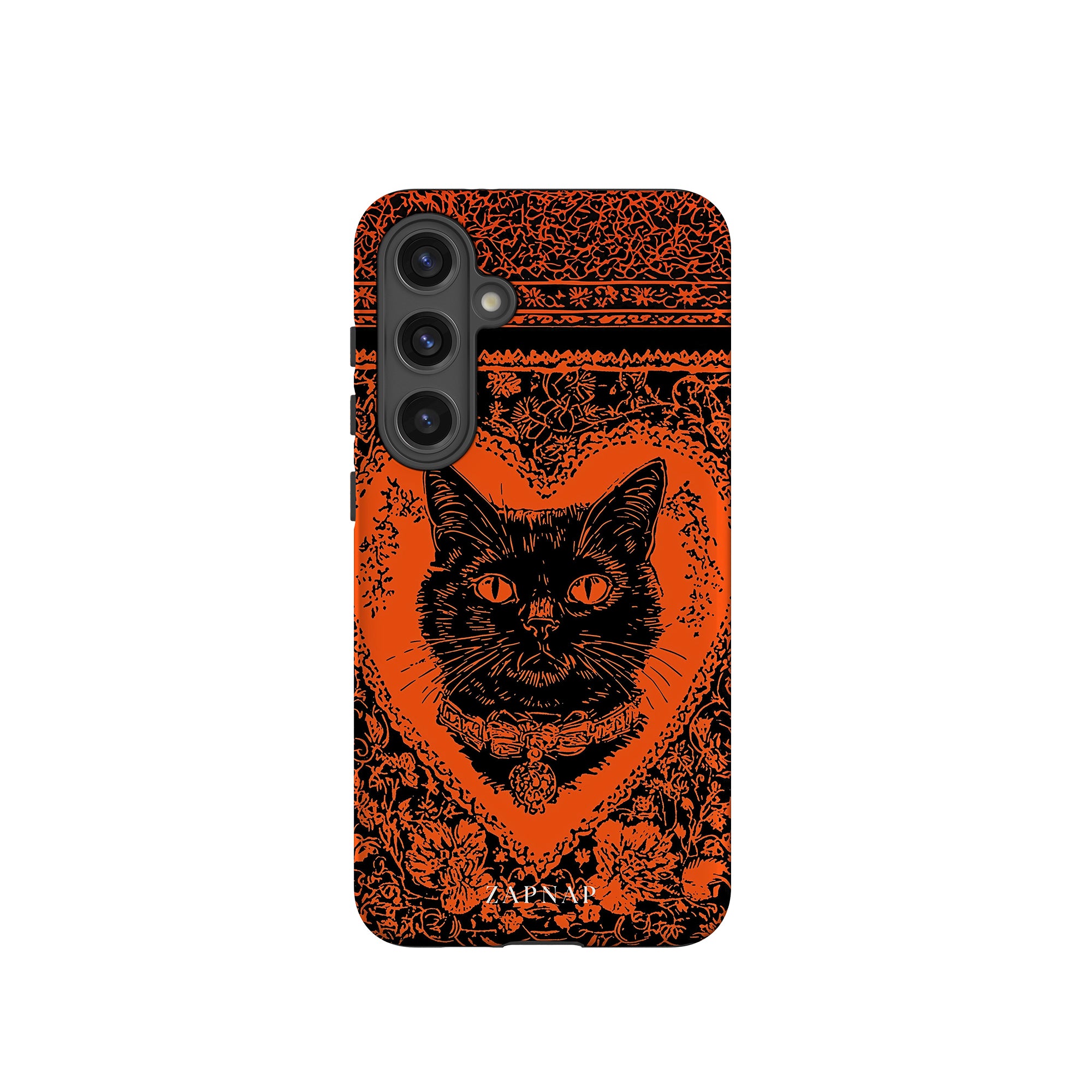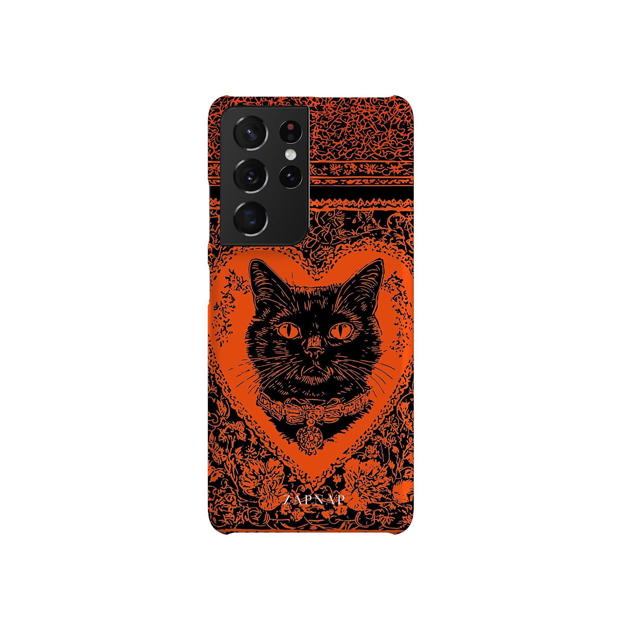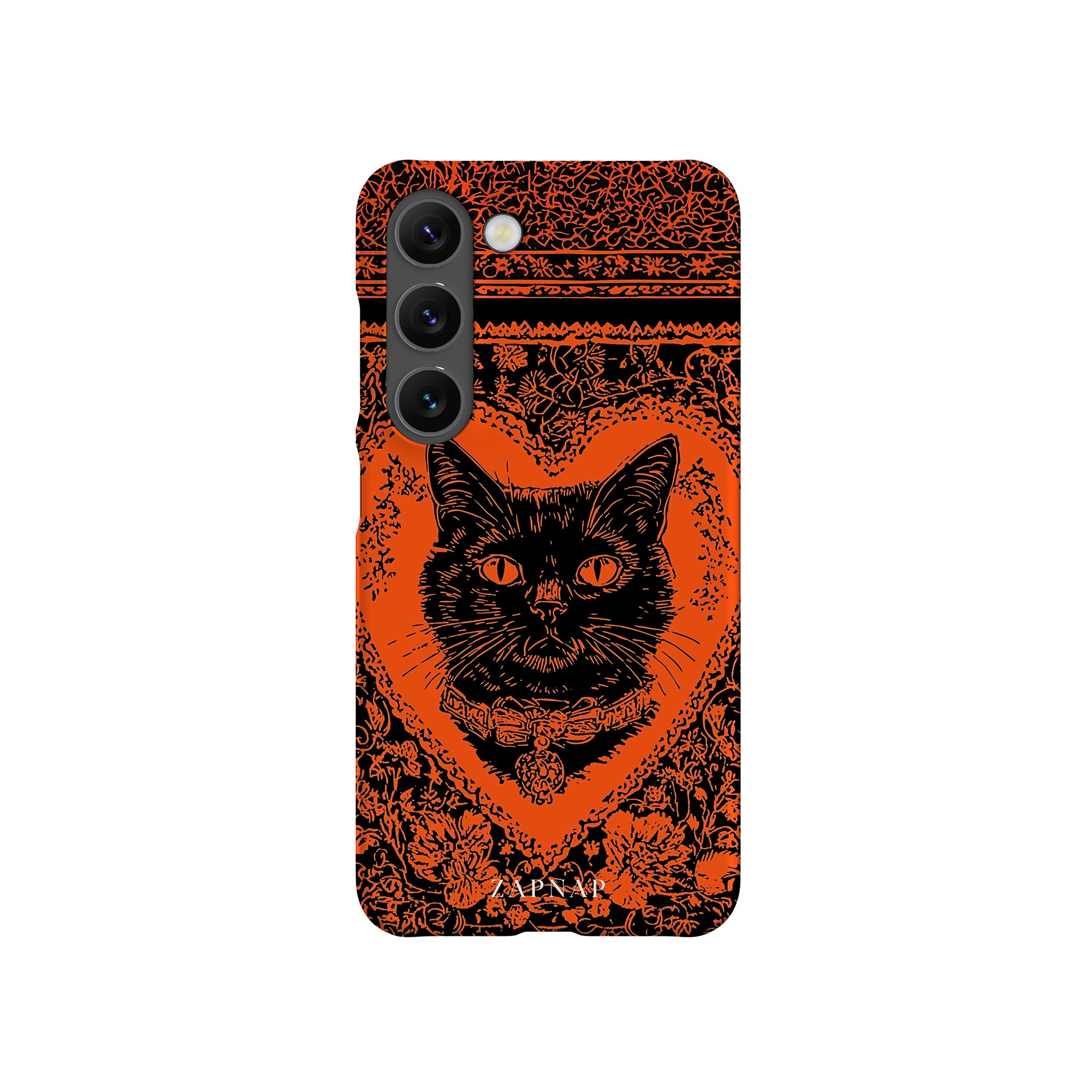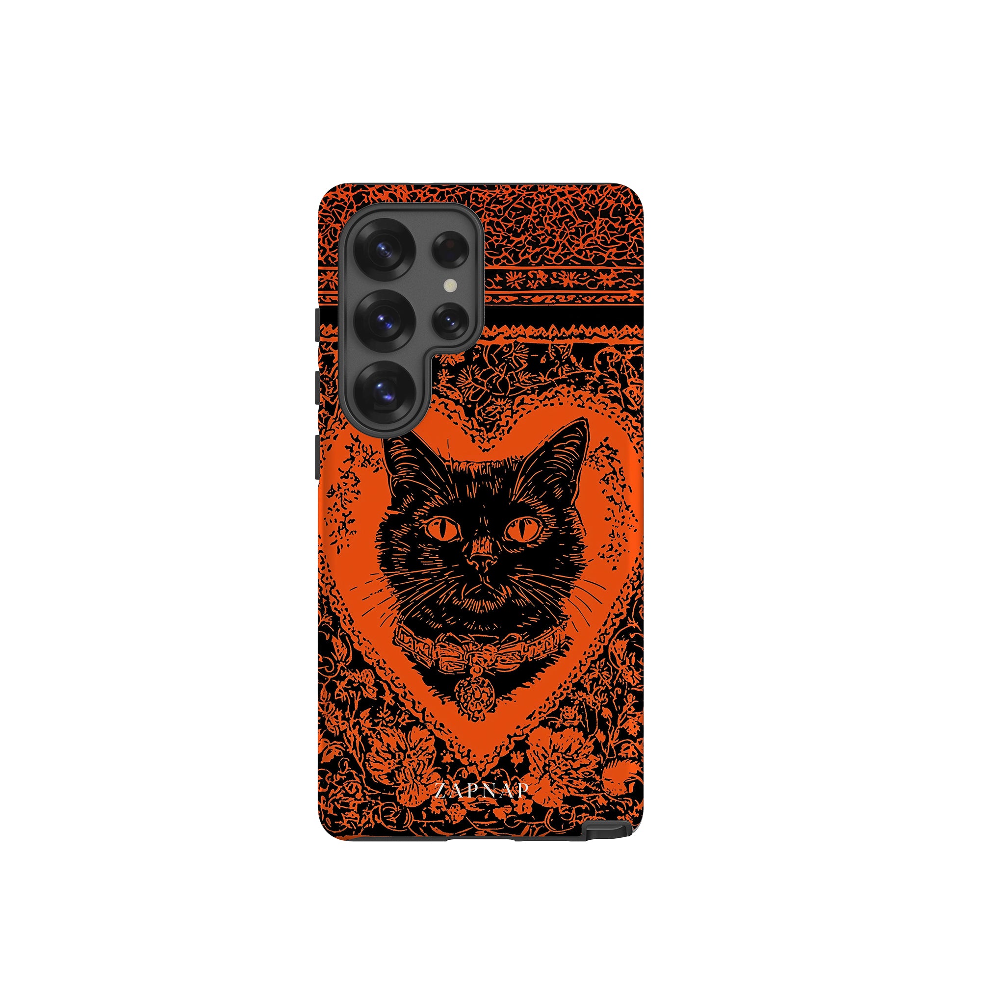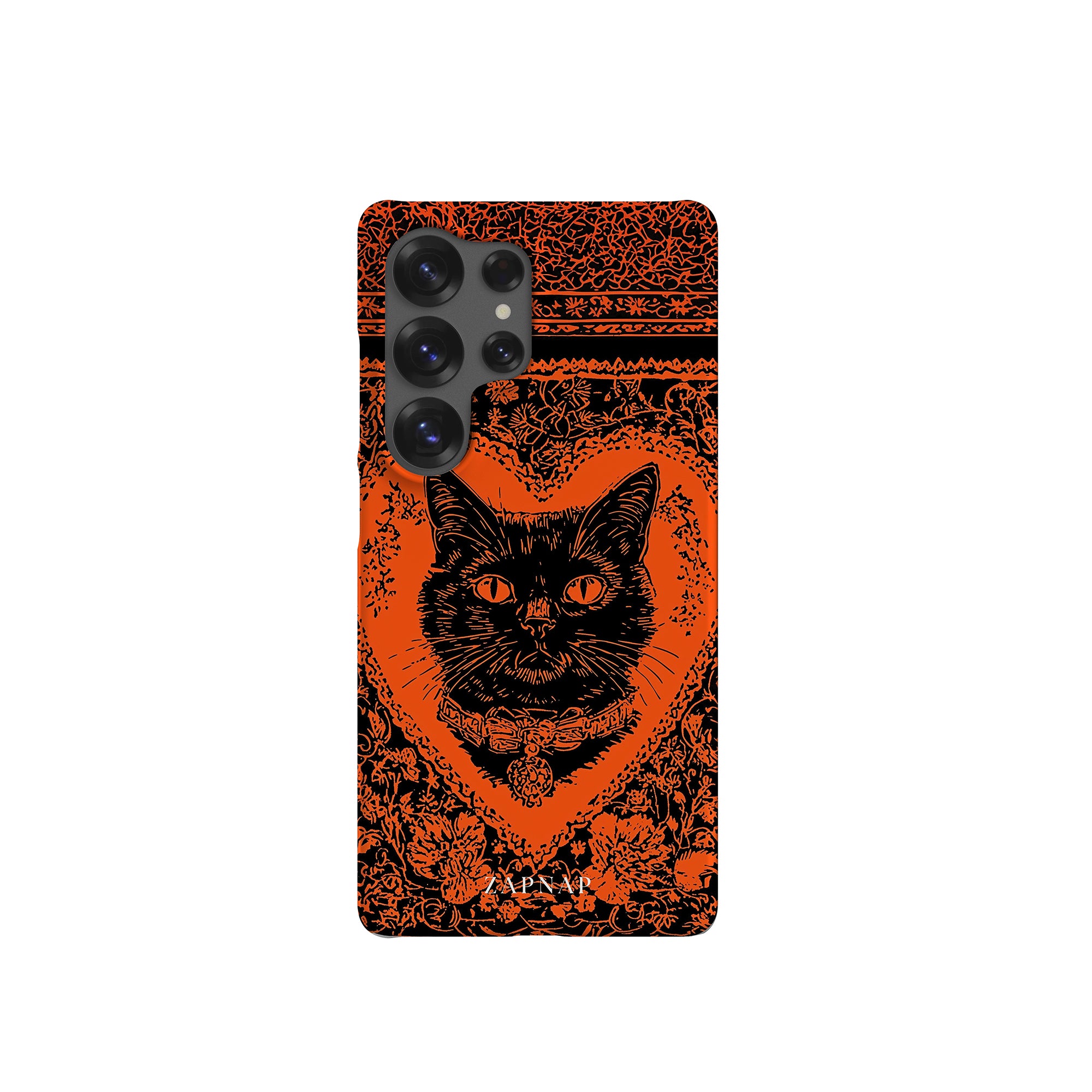 This hauntingly beautiful artwork features a black cat encased in intricate, gothic patterns, exuding mystery and allure. With bold orange and black contrasts, the cat’s intense gaze draws viewers into a world of shadows and secrets, embodying the mystique of the feline spirit.