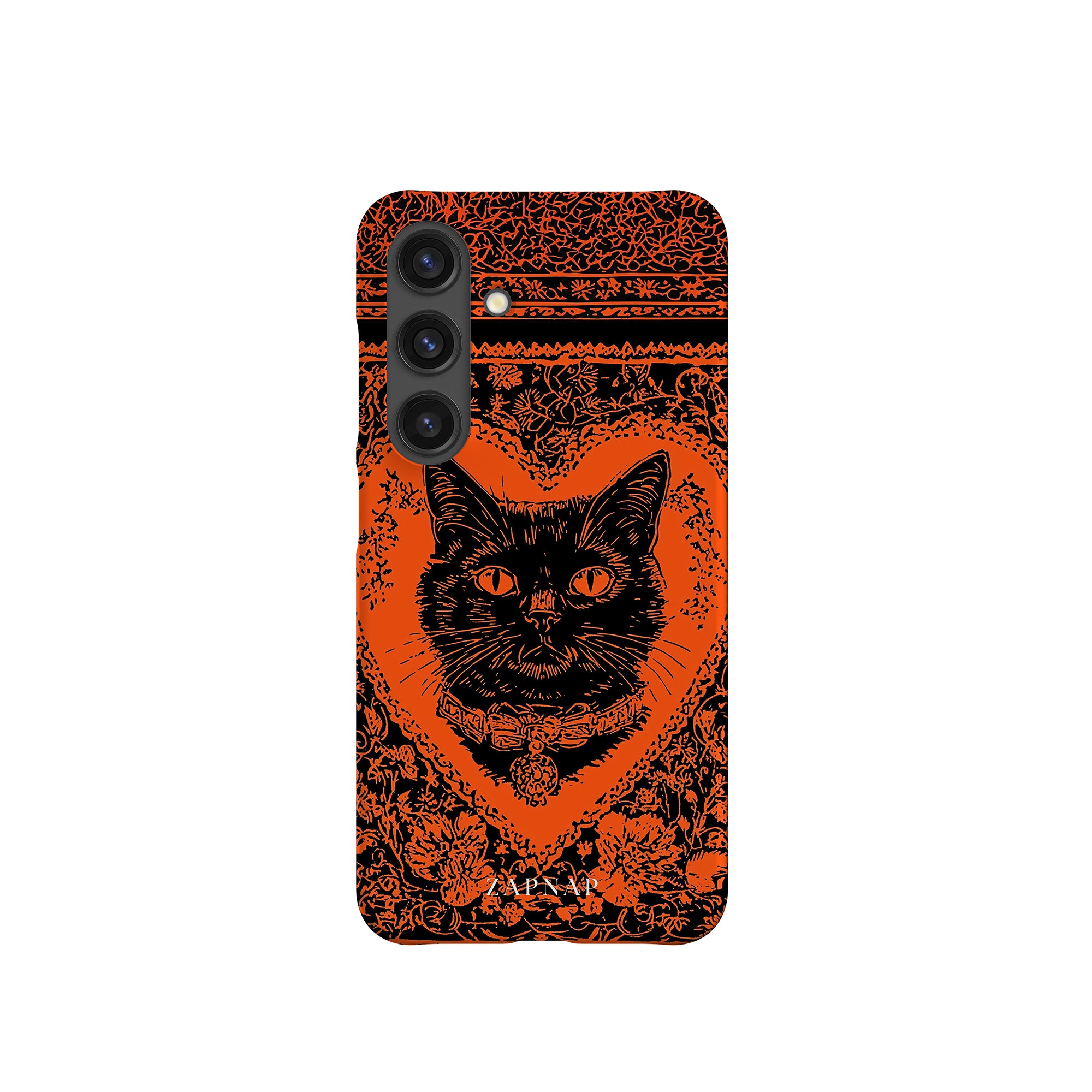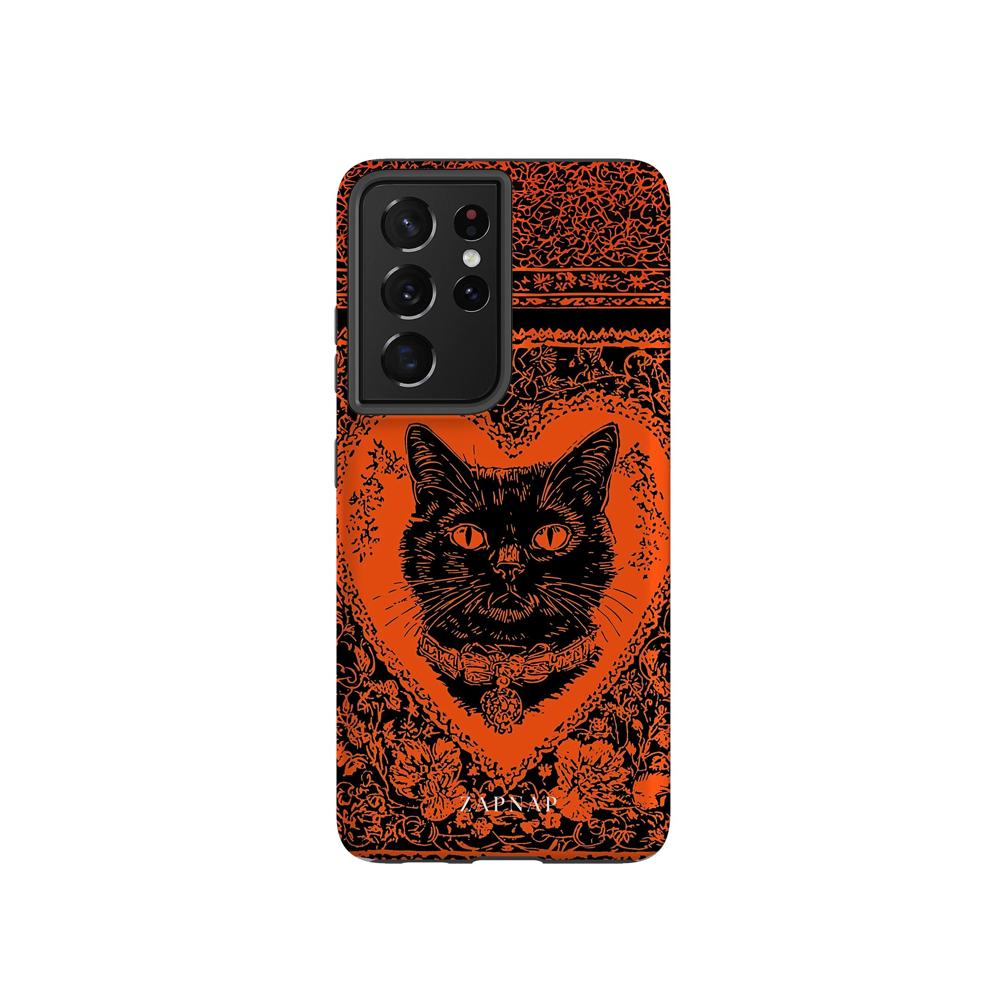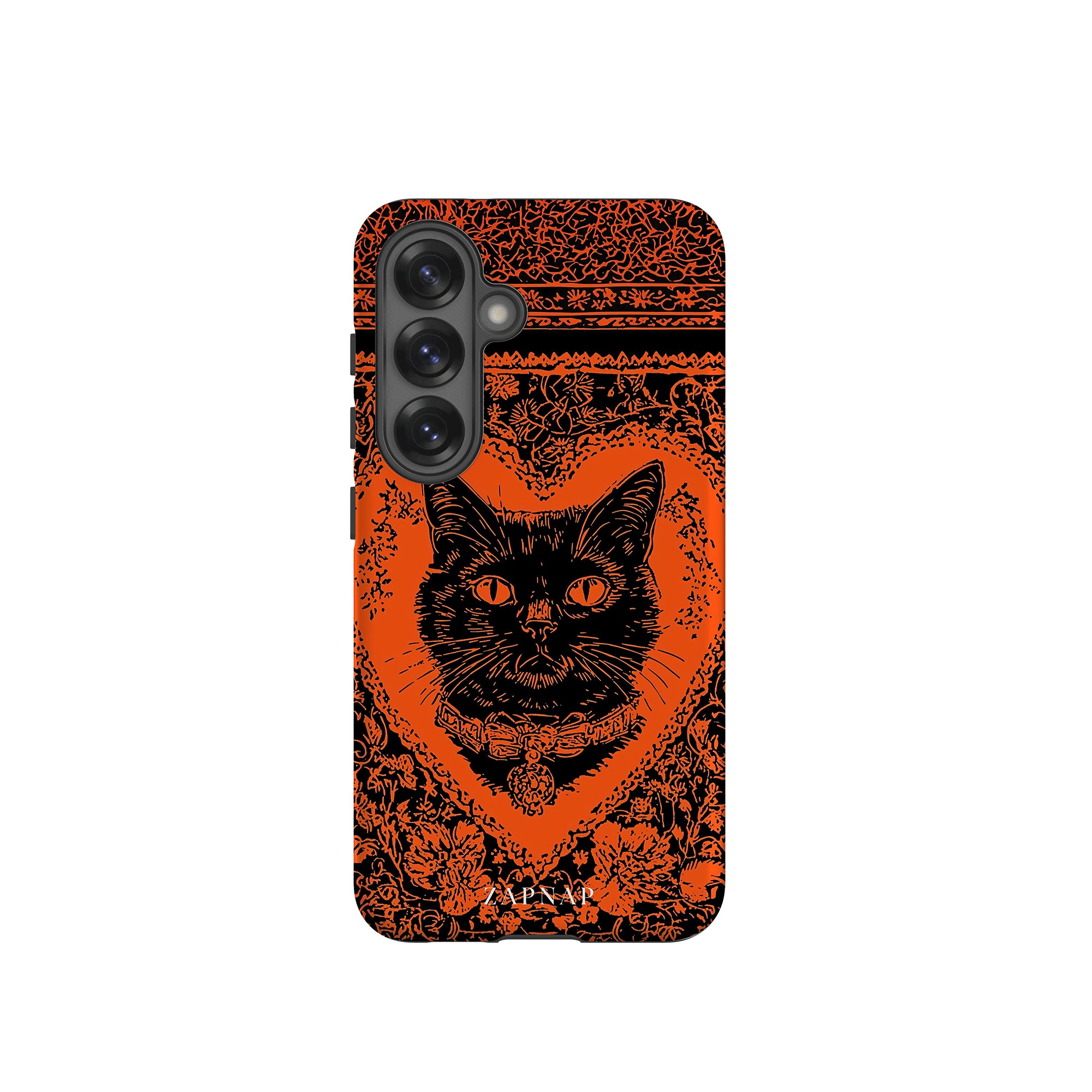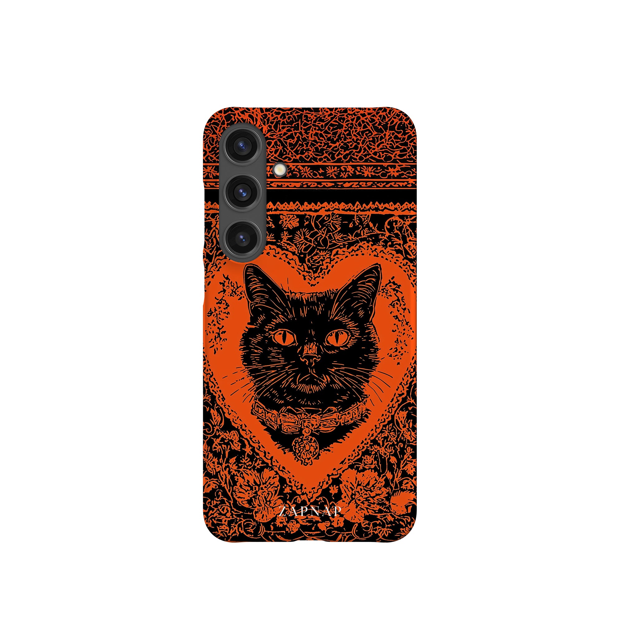 This hauntingly beautiful artwork features a black cat encased in intricate, gothic patterns, exuding mystery and allure. With bold orange and black contrasts, the cat’s intense gaze draws viewers into a world of shadows and secrets, embodying the mystique of the feline spirit.
