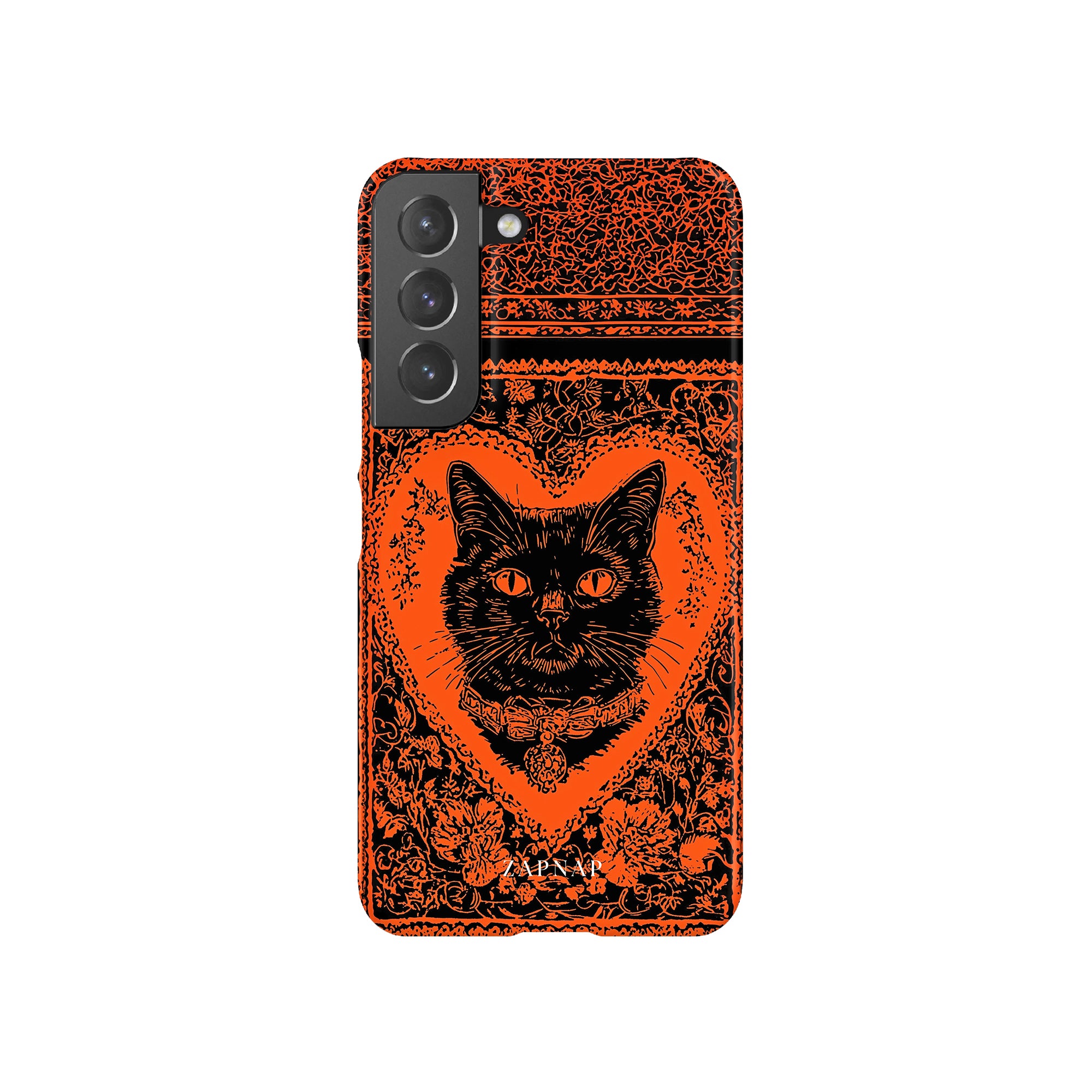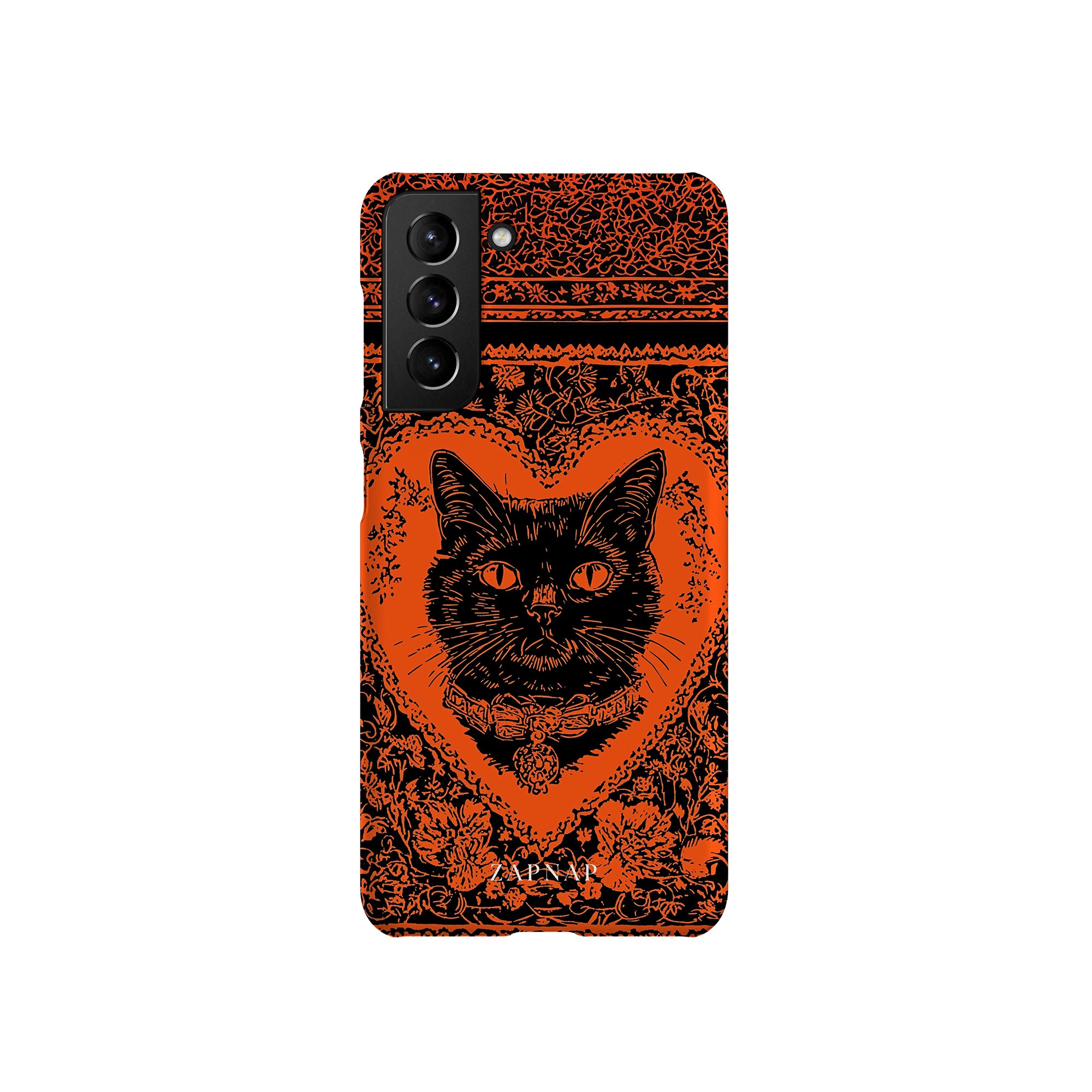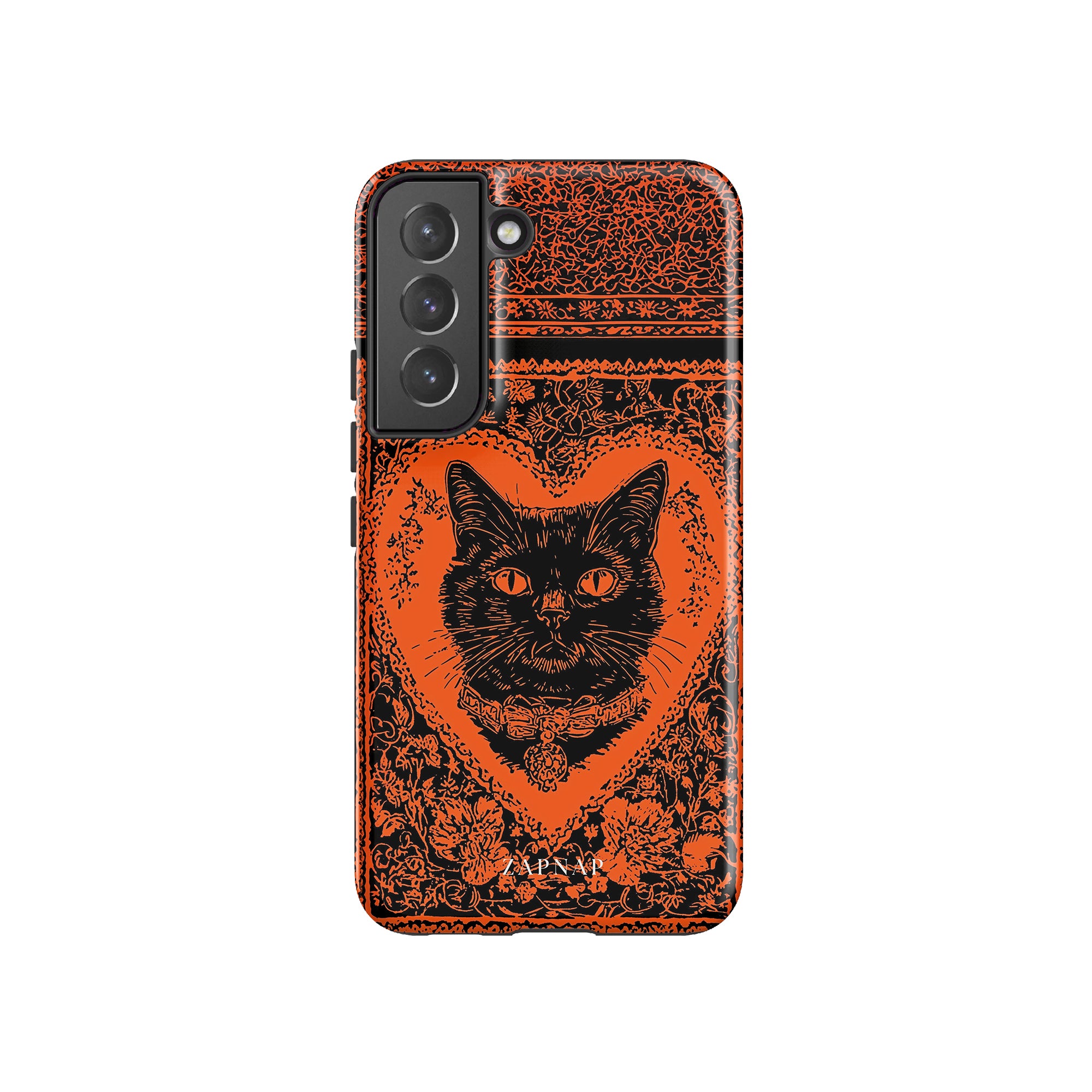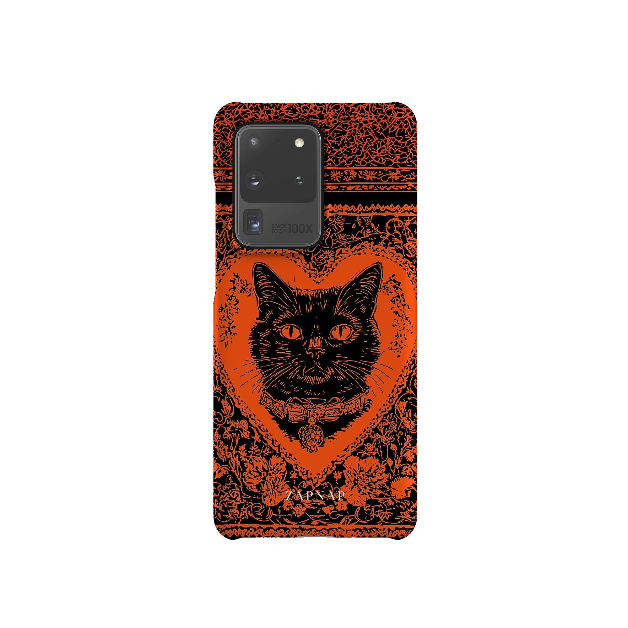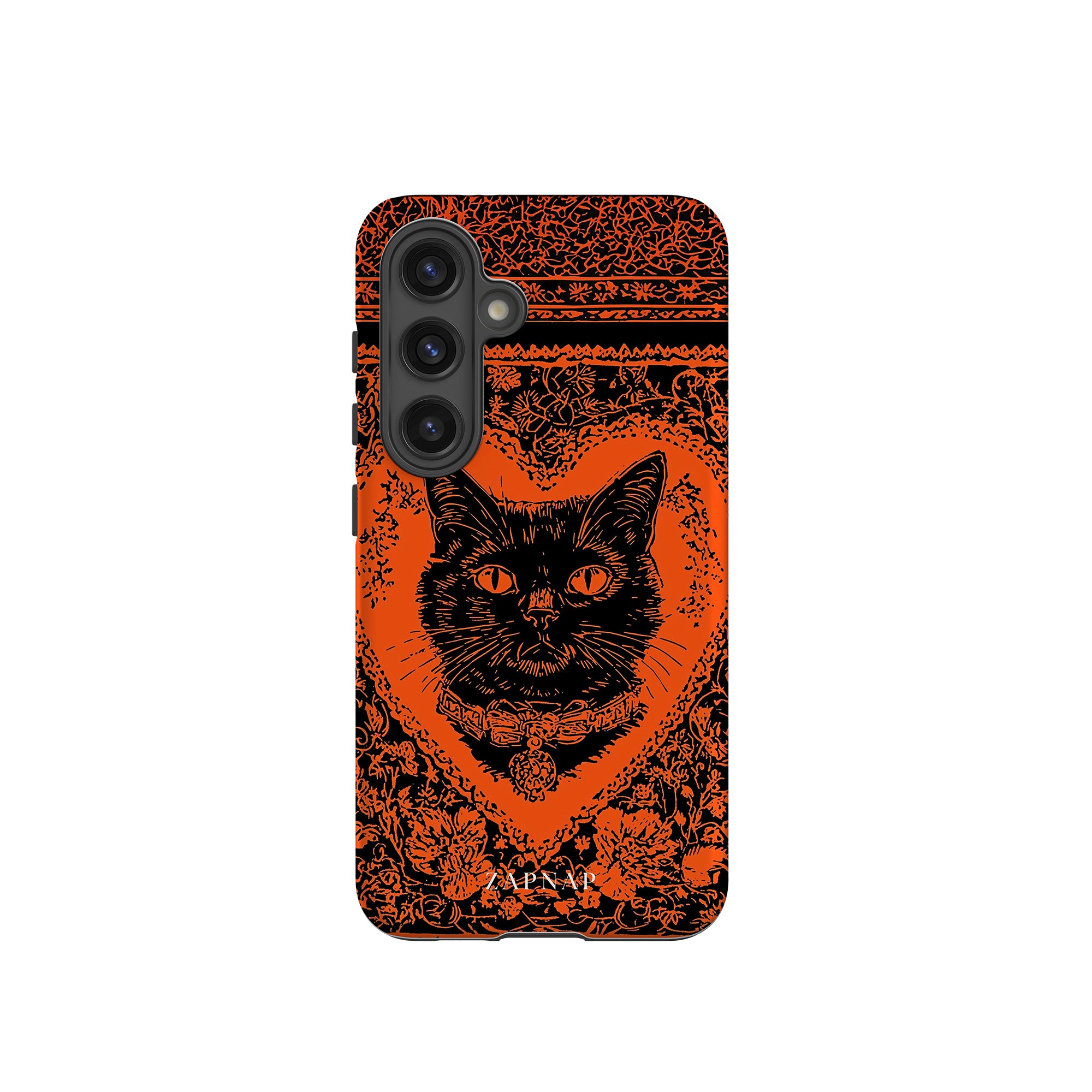 This hauntingly beautiful artwork features a black cat encased in intricate, gothic patterns, exuding mystery and allure. With bold orange and black contrasts, the cat’s intense gaze draws viewers into a world of shadows and secrets, embodying the mystique of the feline spirit.