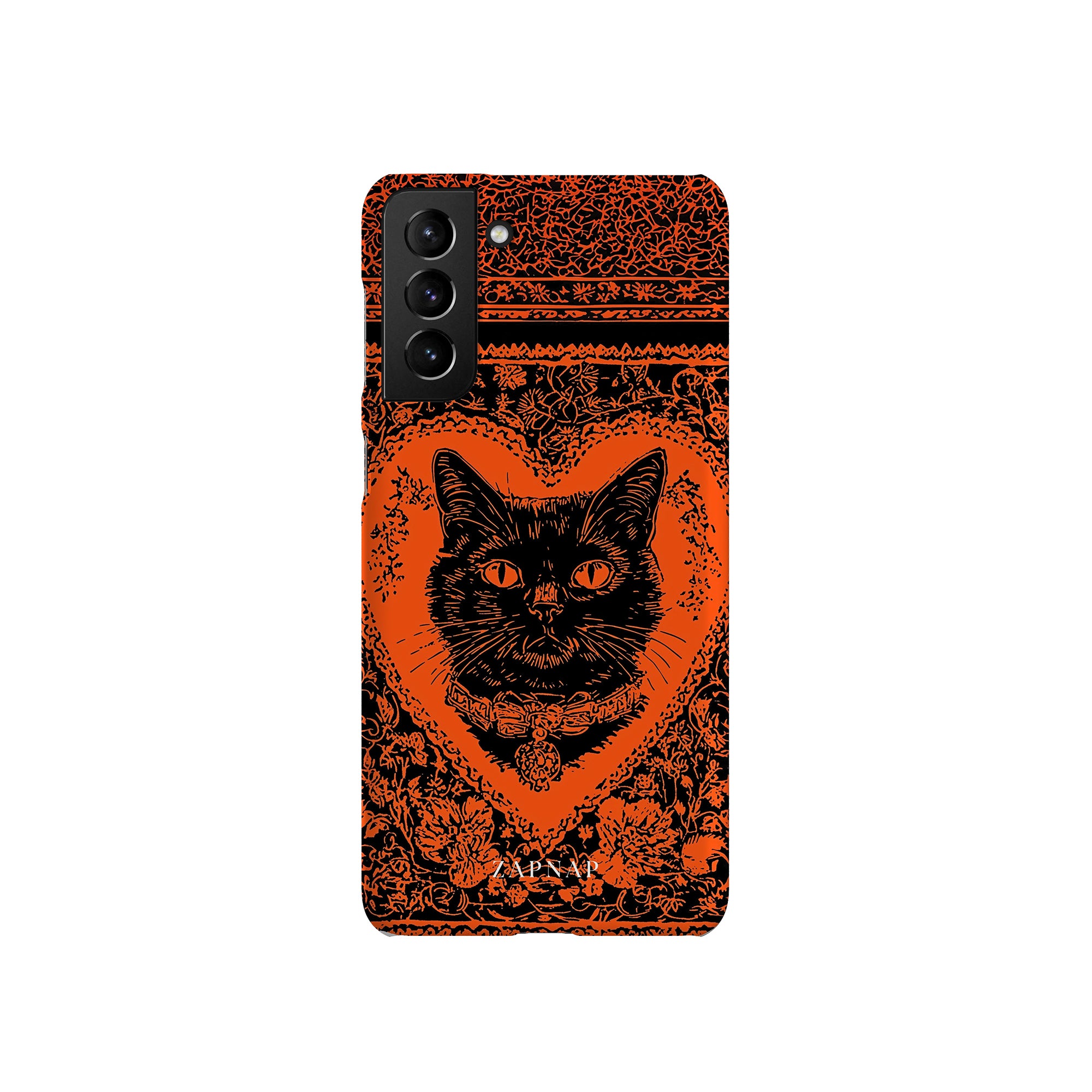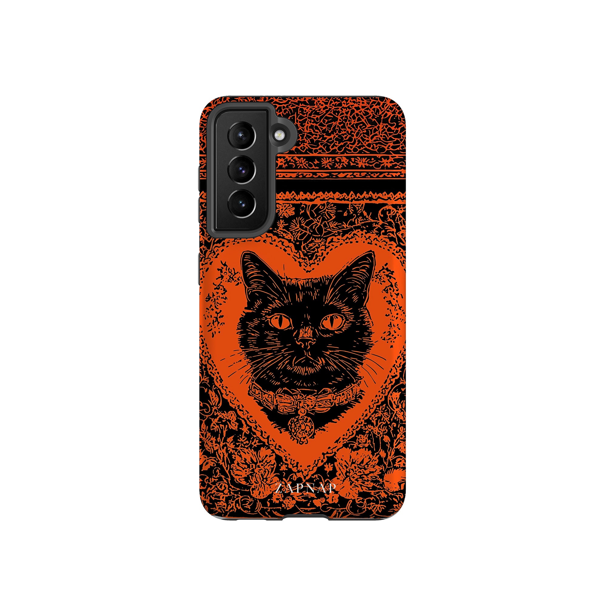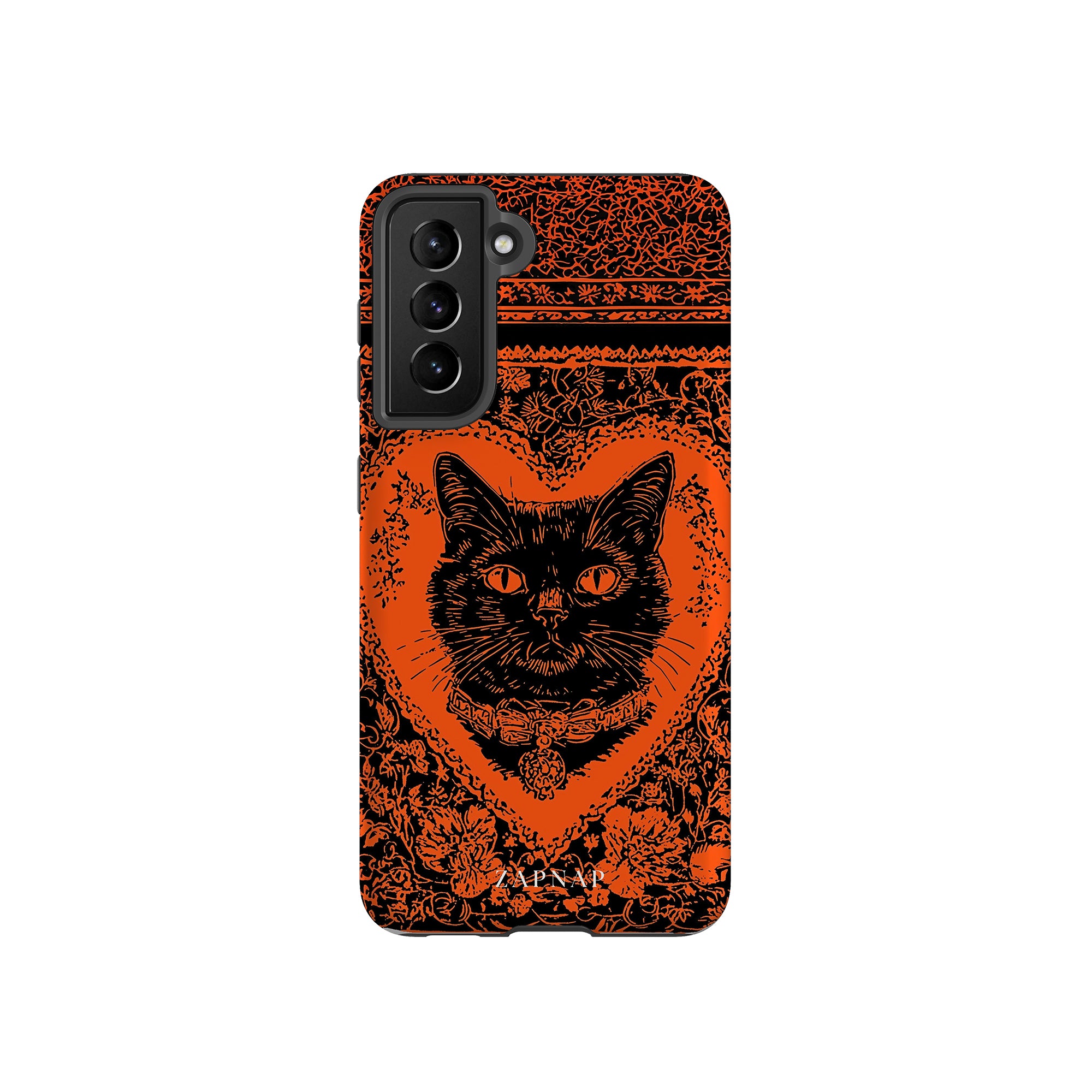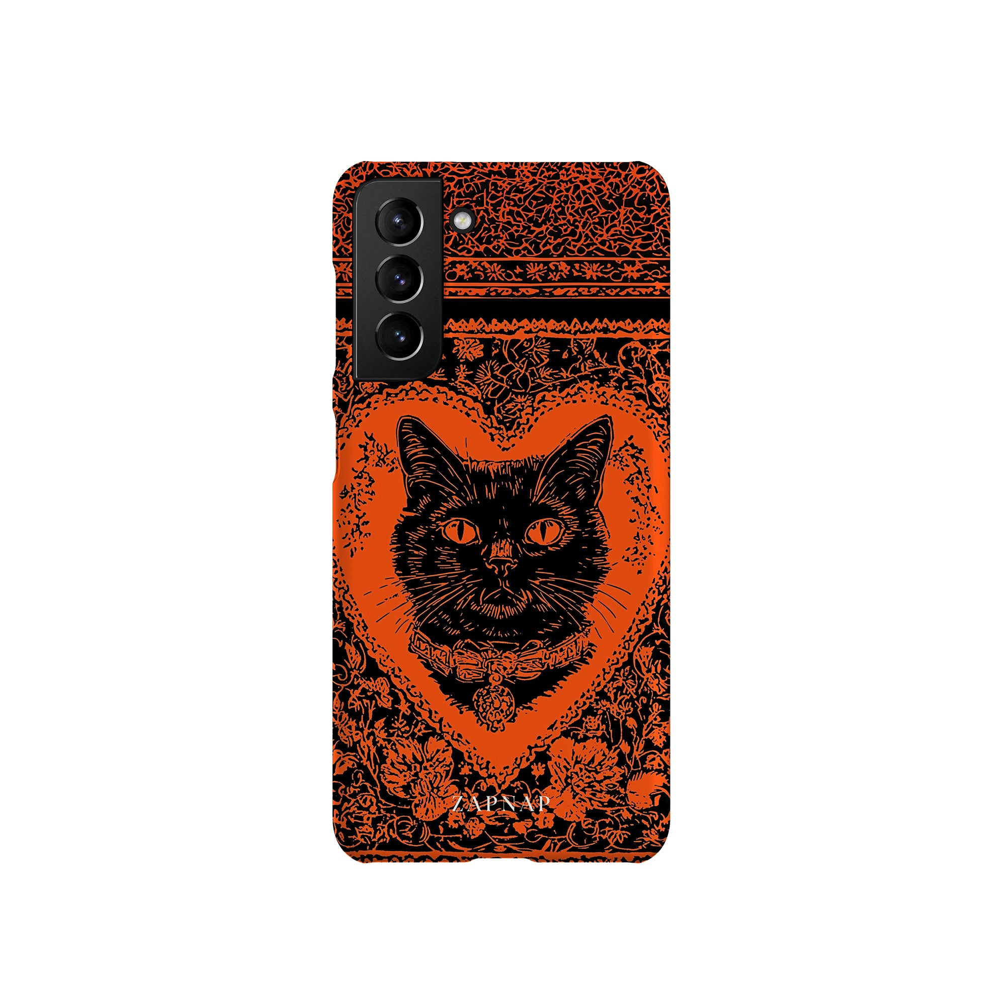 This hauntingly beautiful artwork features a black cat encased in intricate, gothic patterns, exuding mystery and allure. With bold orange and black contrasts, the cat’s intense gaze draws viewers into a world of shadows and secrets, embodying the mystique of the feline spirit.