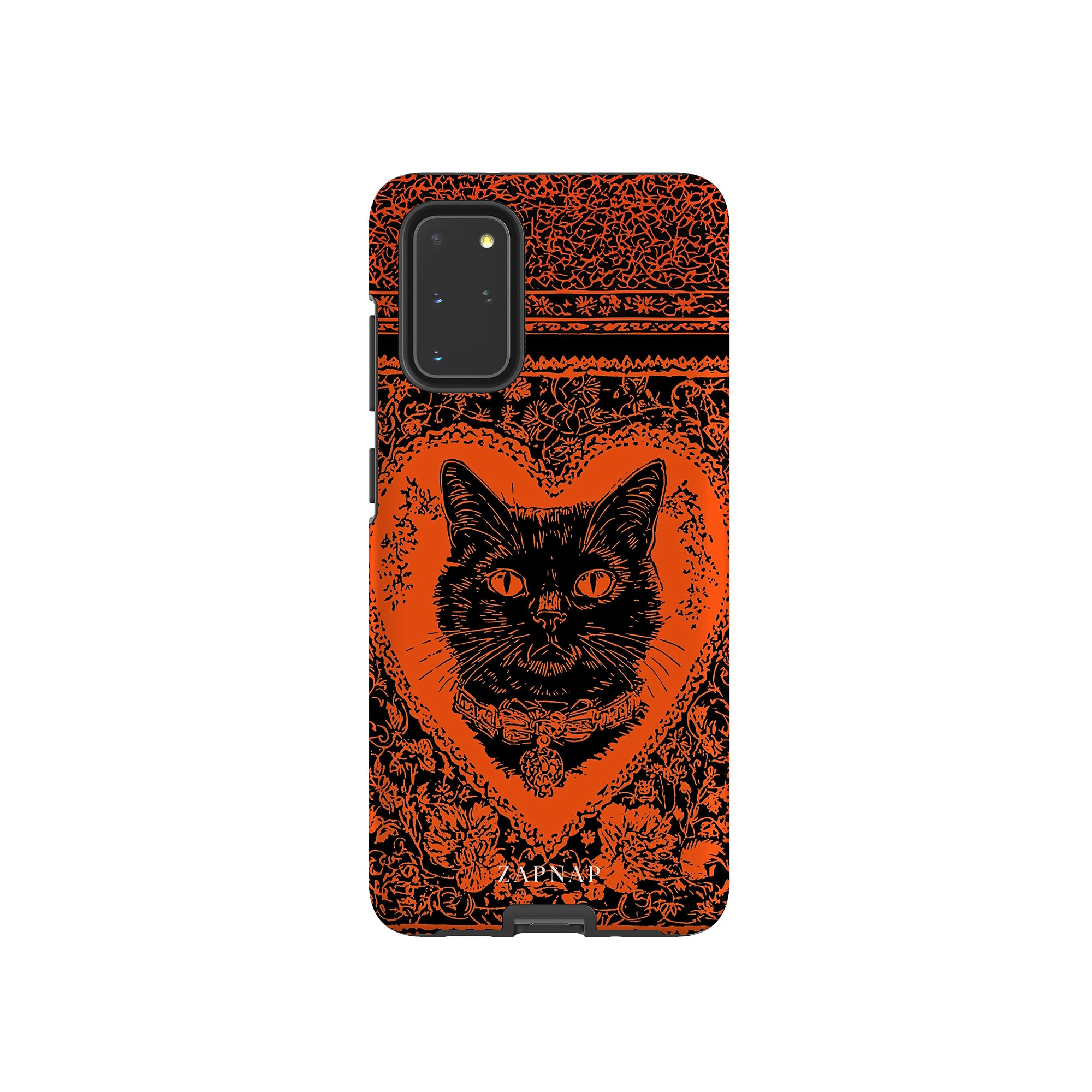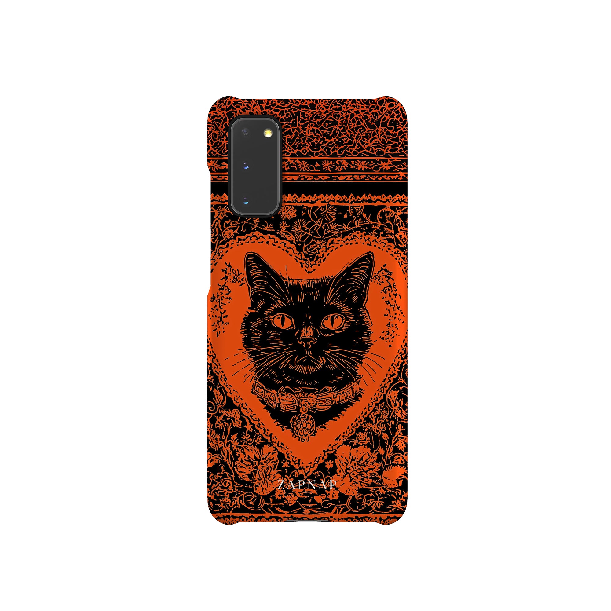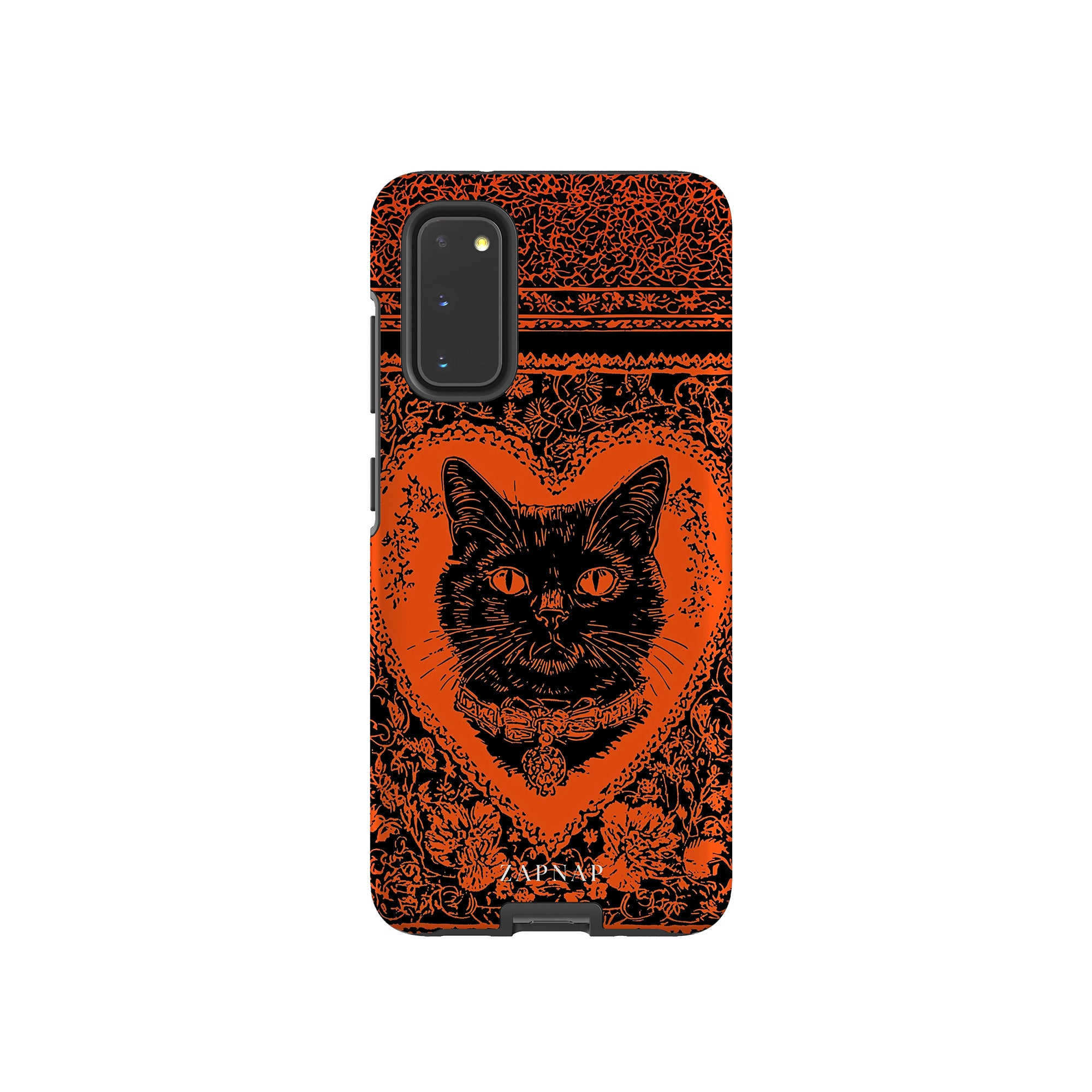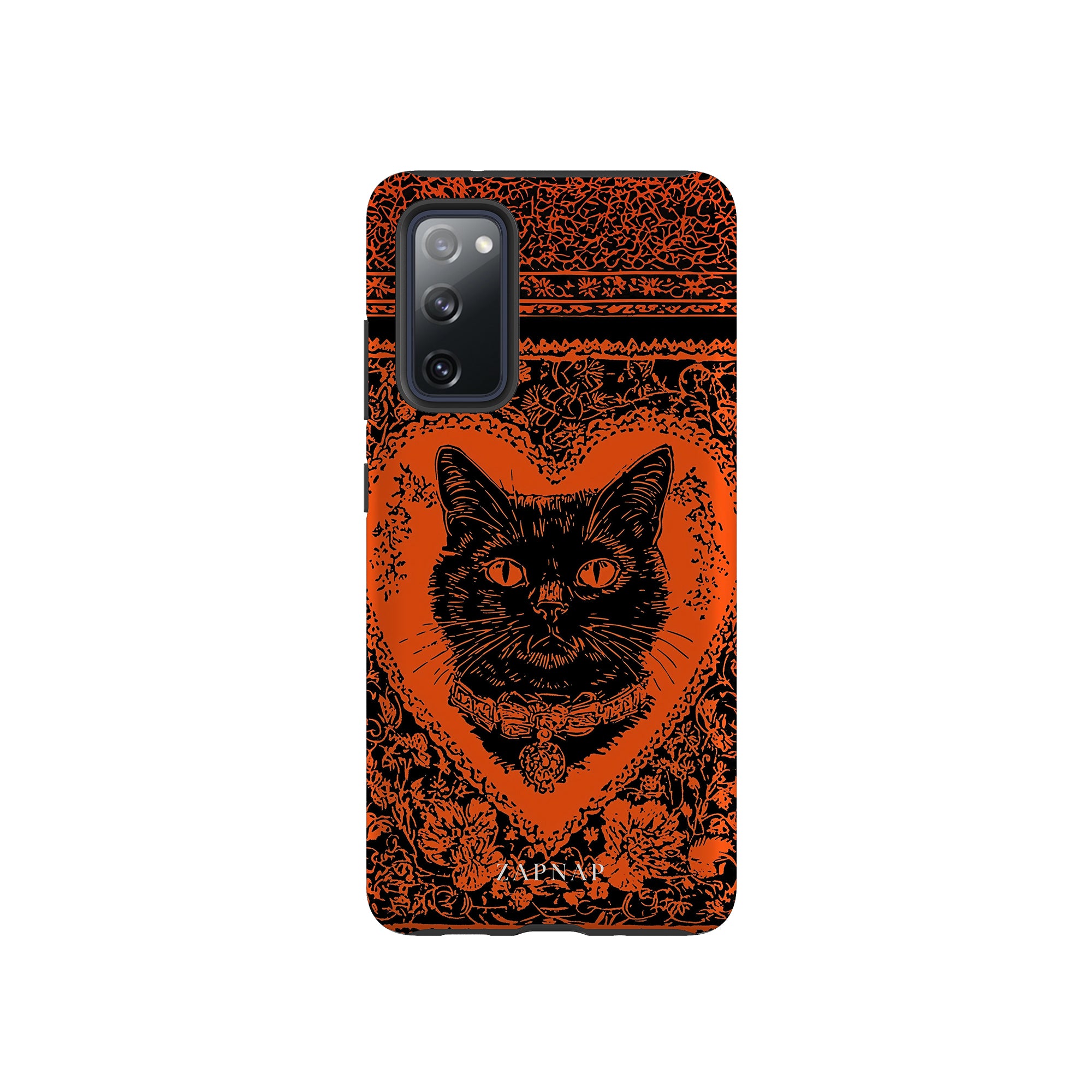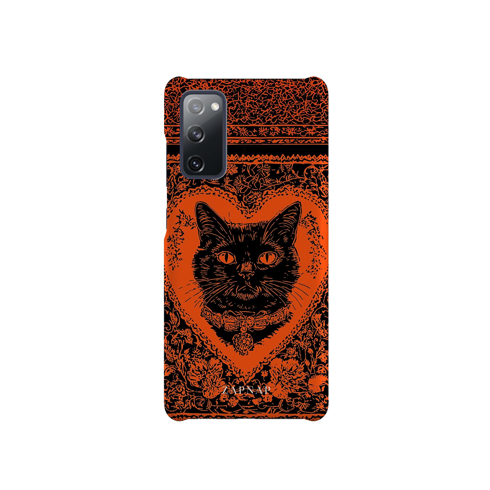 This hauntingly beautiful artwork features a black cat encased in intricate, gothic patterns, exuding mystery and allure. With bold orange and black contrasts, the cat’s intense gaze draws viewers into a world of shadows and secrets, embodying the mystique of the feline spirit.