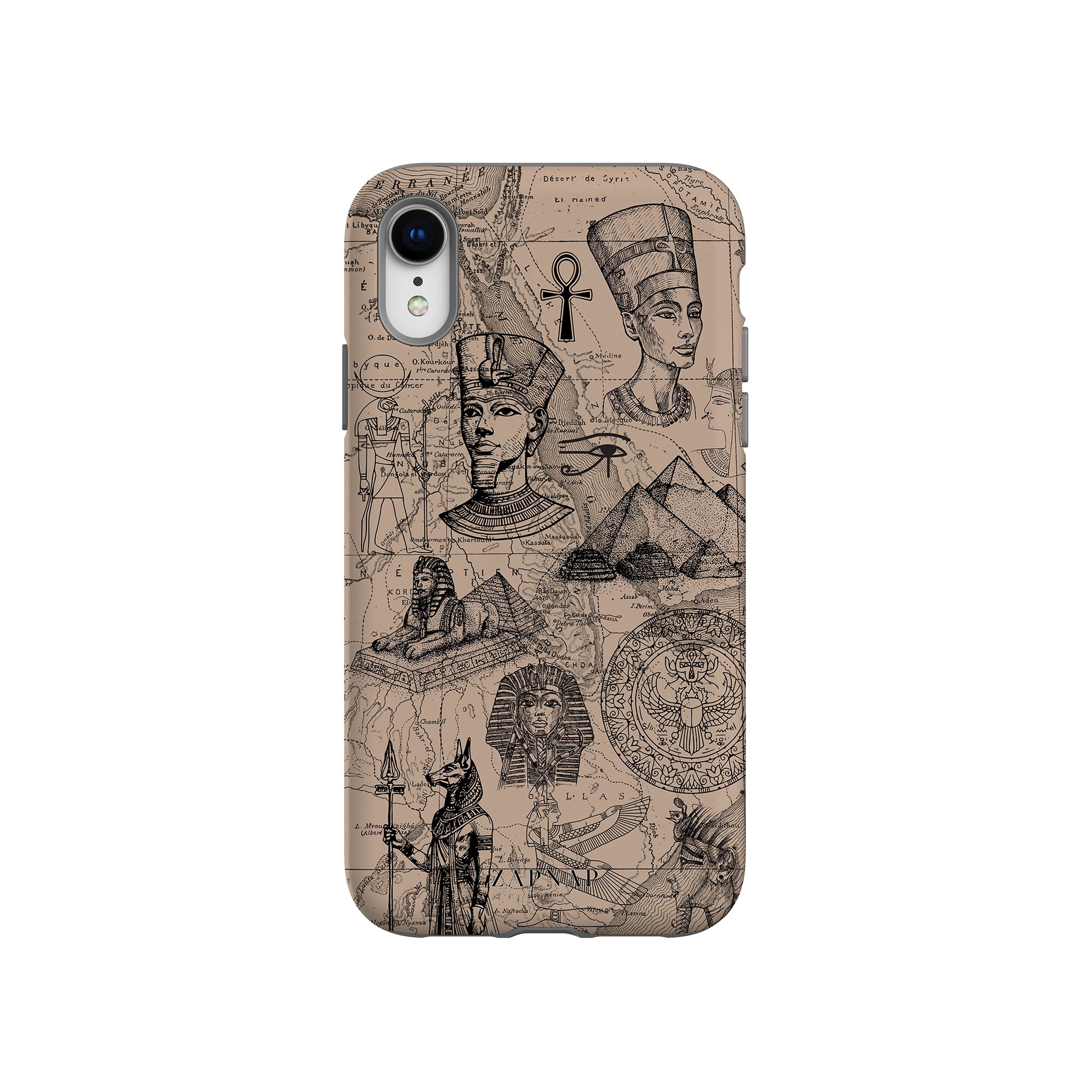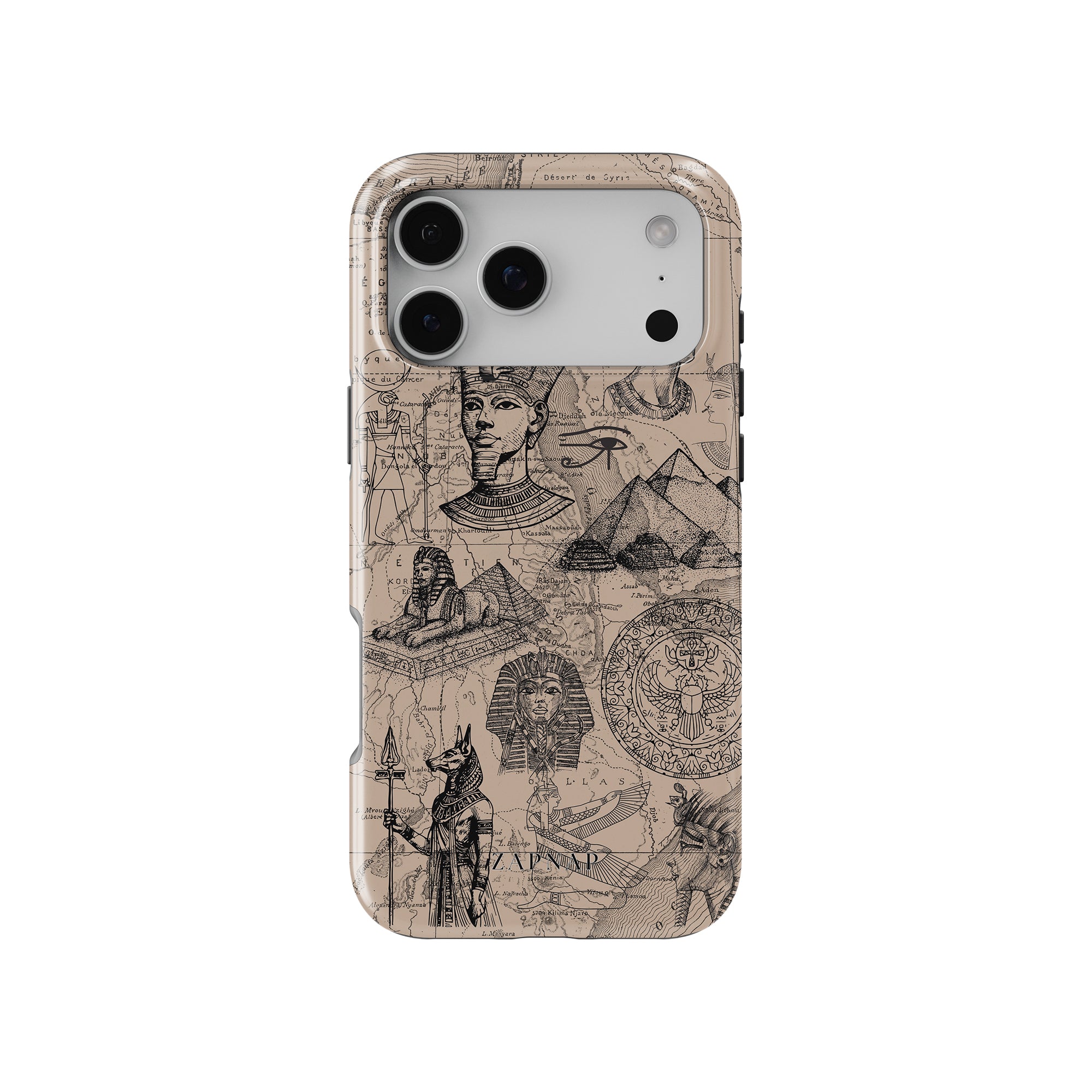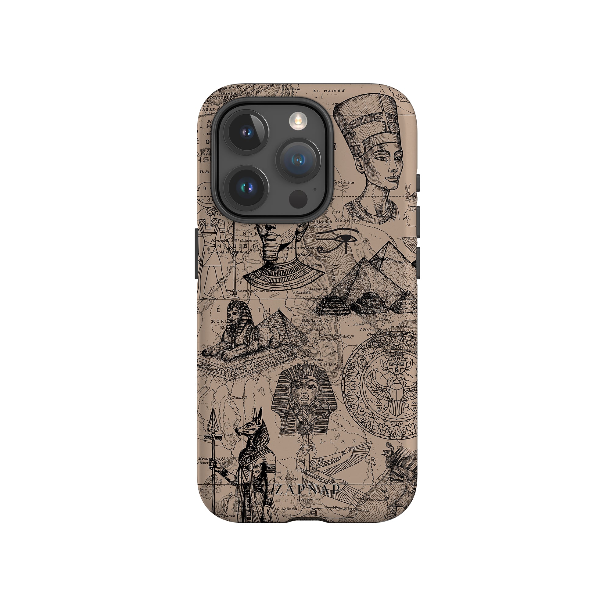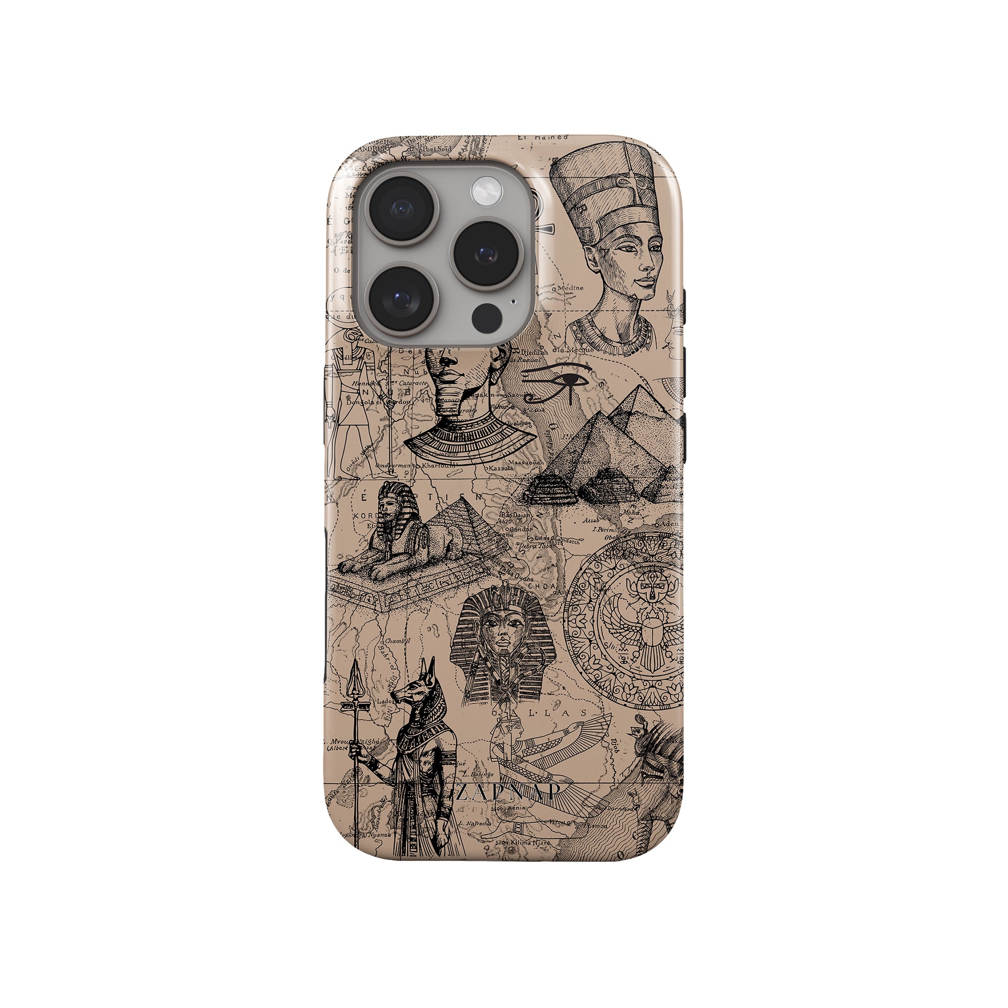 This Egyptian-themed design showcases intricate details and rich cultural symbolism. Key elements include Queen Nefertiti, the Sphinx, Anubis, pyramids, the Eye of Horus, the Ankh, and a scarab emblem, all rendered with exceptional line work. Overlaid on a vintage map of Egypt and surrounding regions, it merges historical figures, deities, and monuments seamlessly. The design captures the essence of ancient Egypt, blending artistry and heritage into a visually captivating composition.