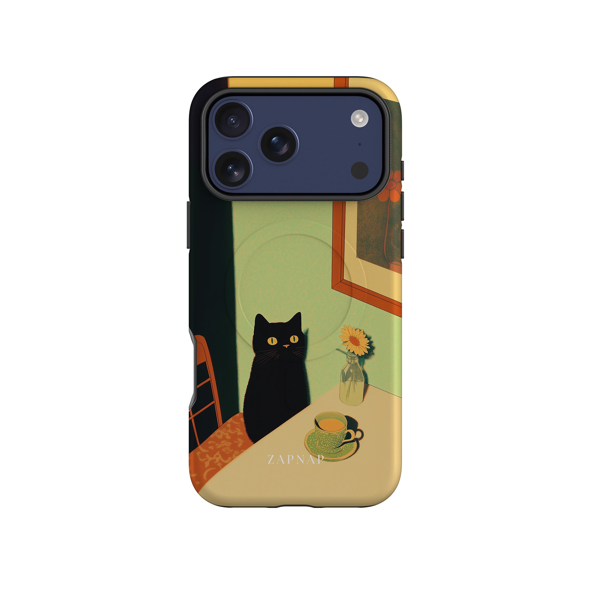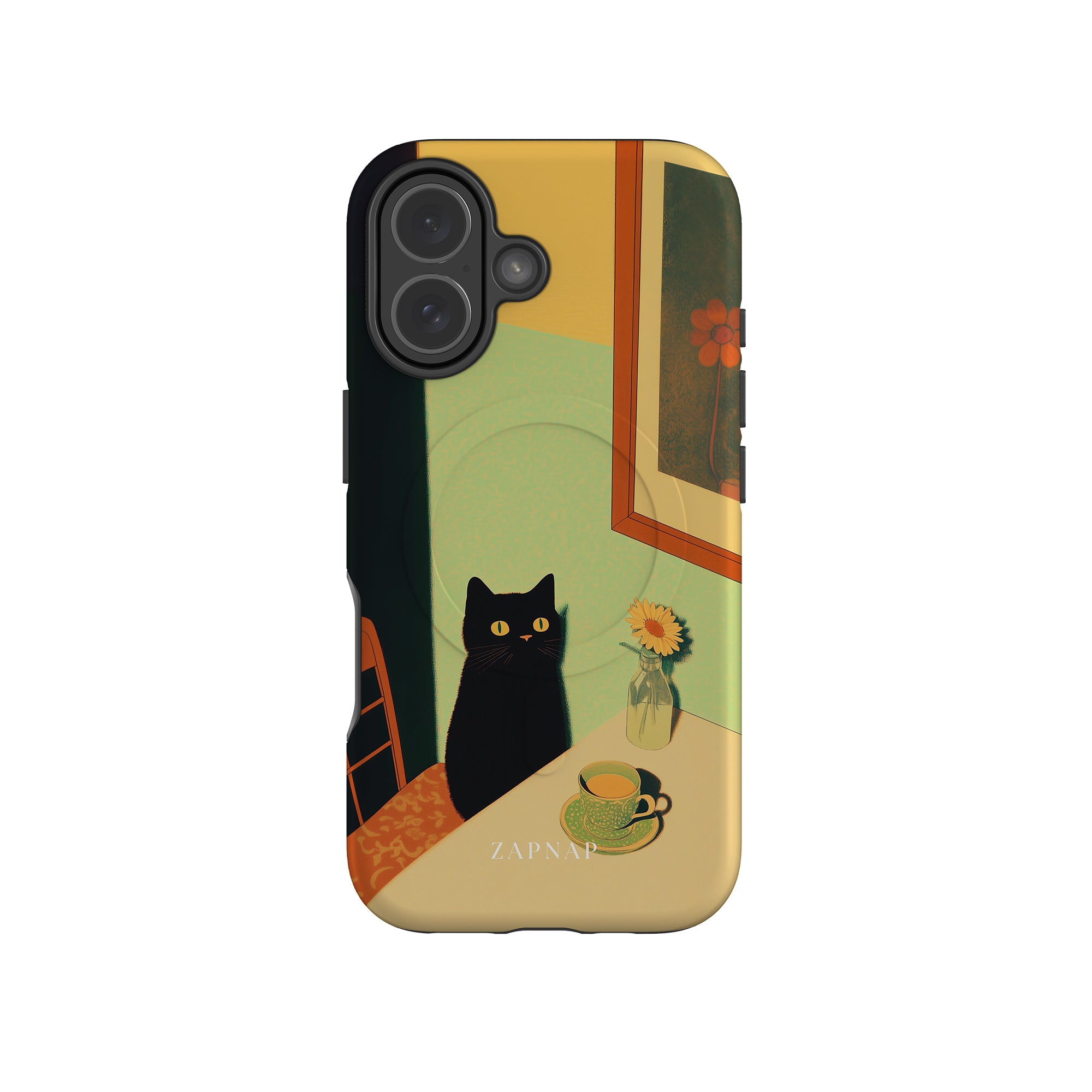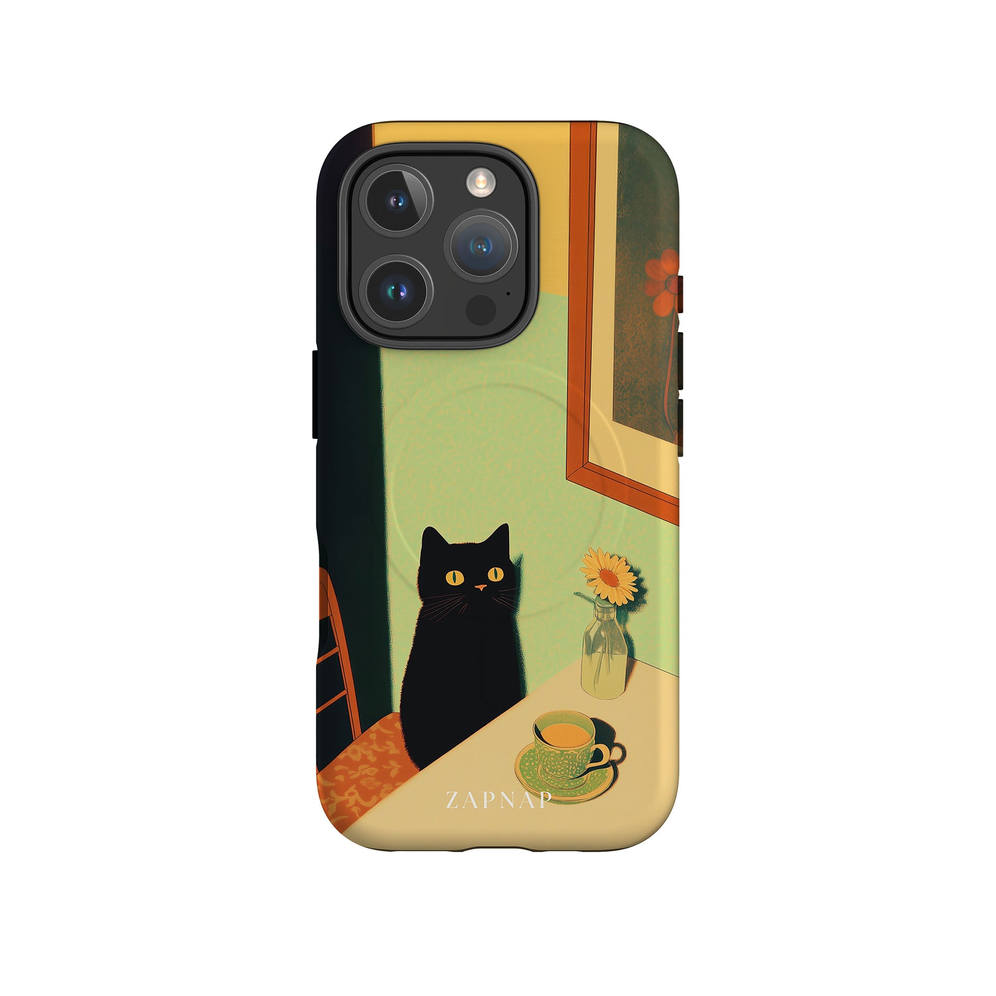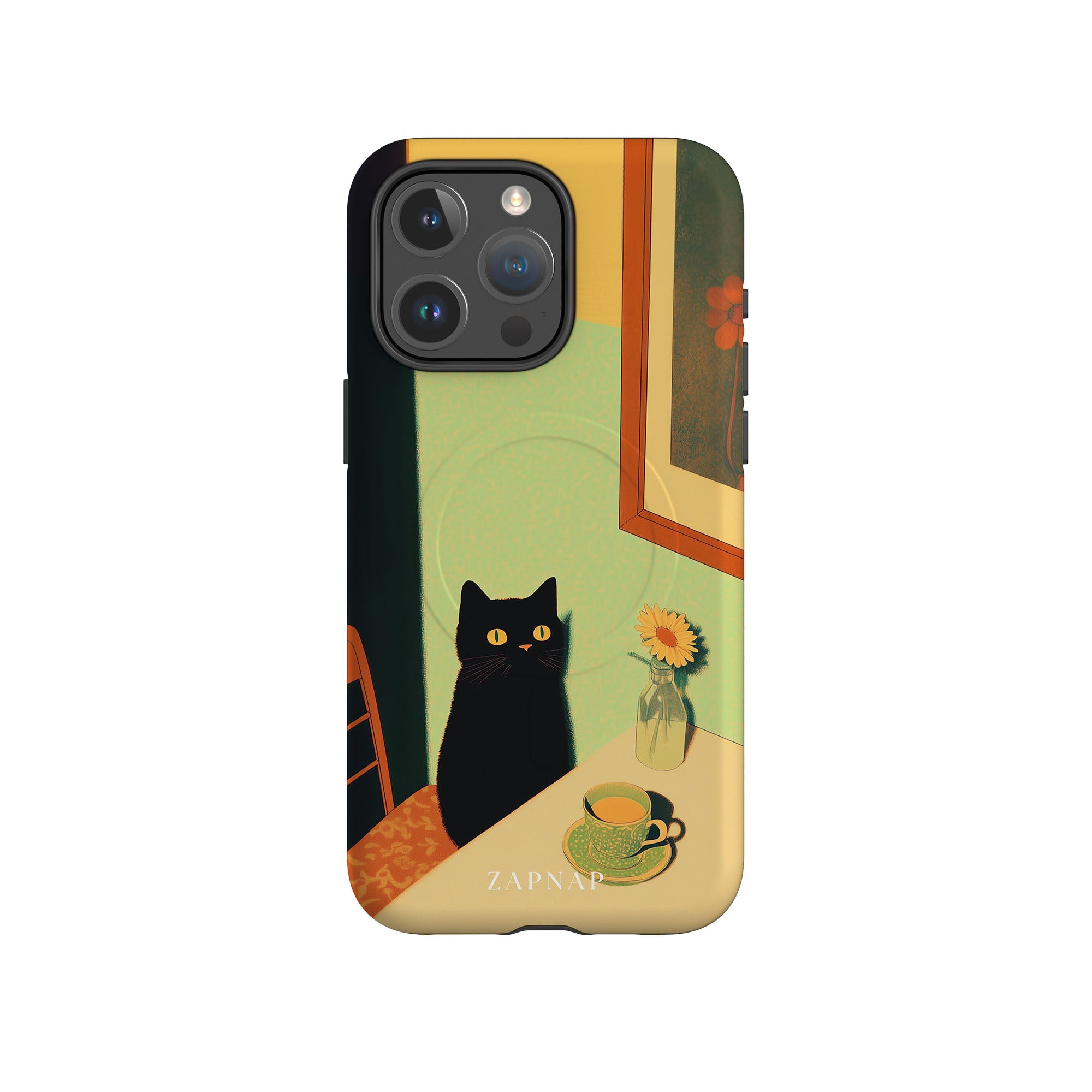 In this serene painting, a black cat sits at a sunlit table, its bright eyes quietly observing. The simple scene, with a teacup and a daisy in a bottle, evokes a sense of calm and stillness, celebrating quiet companionship.