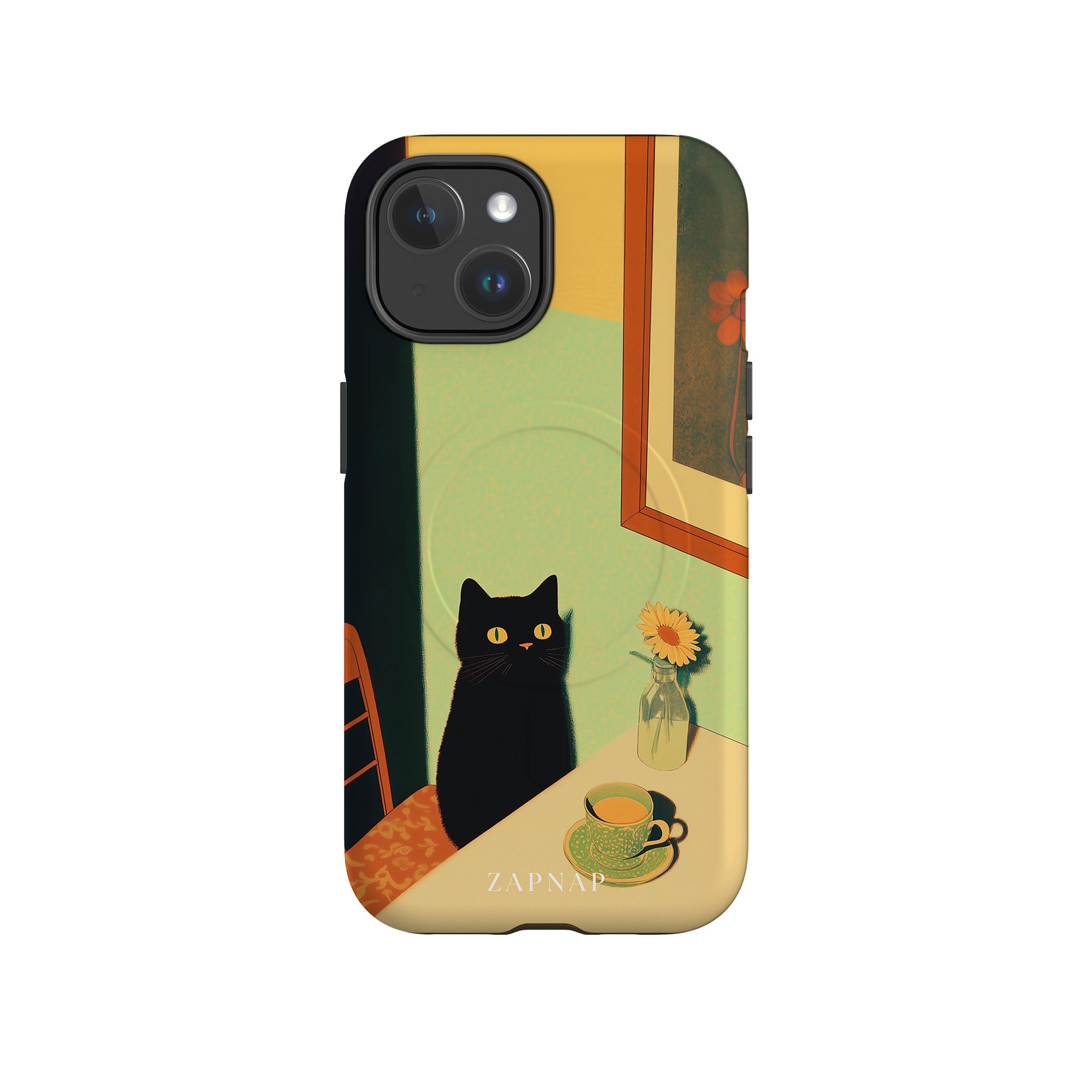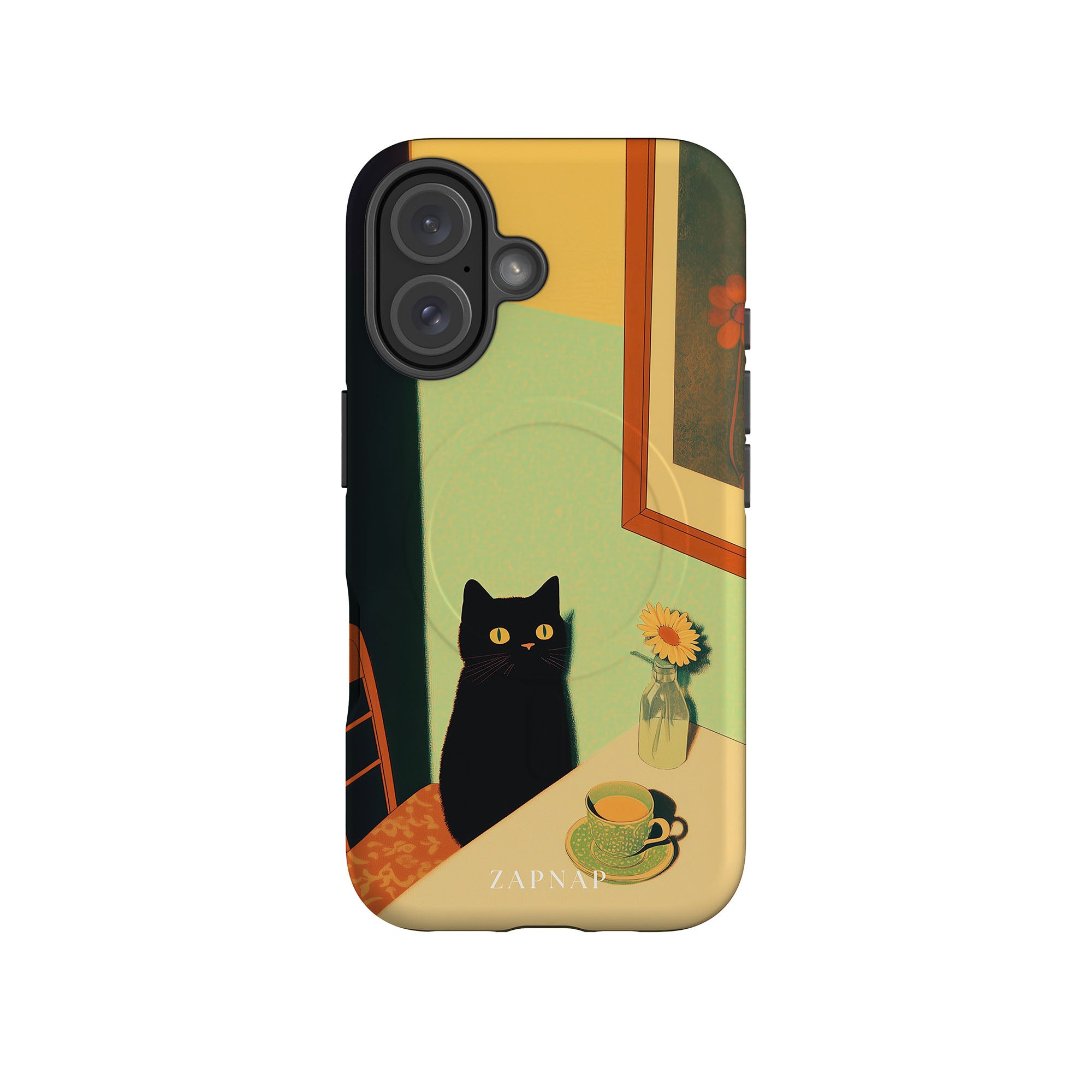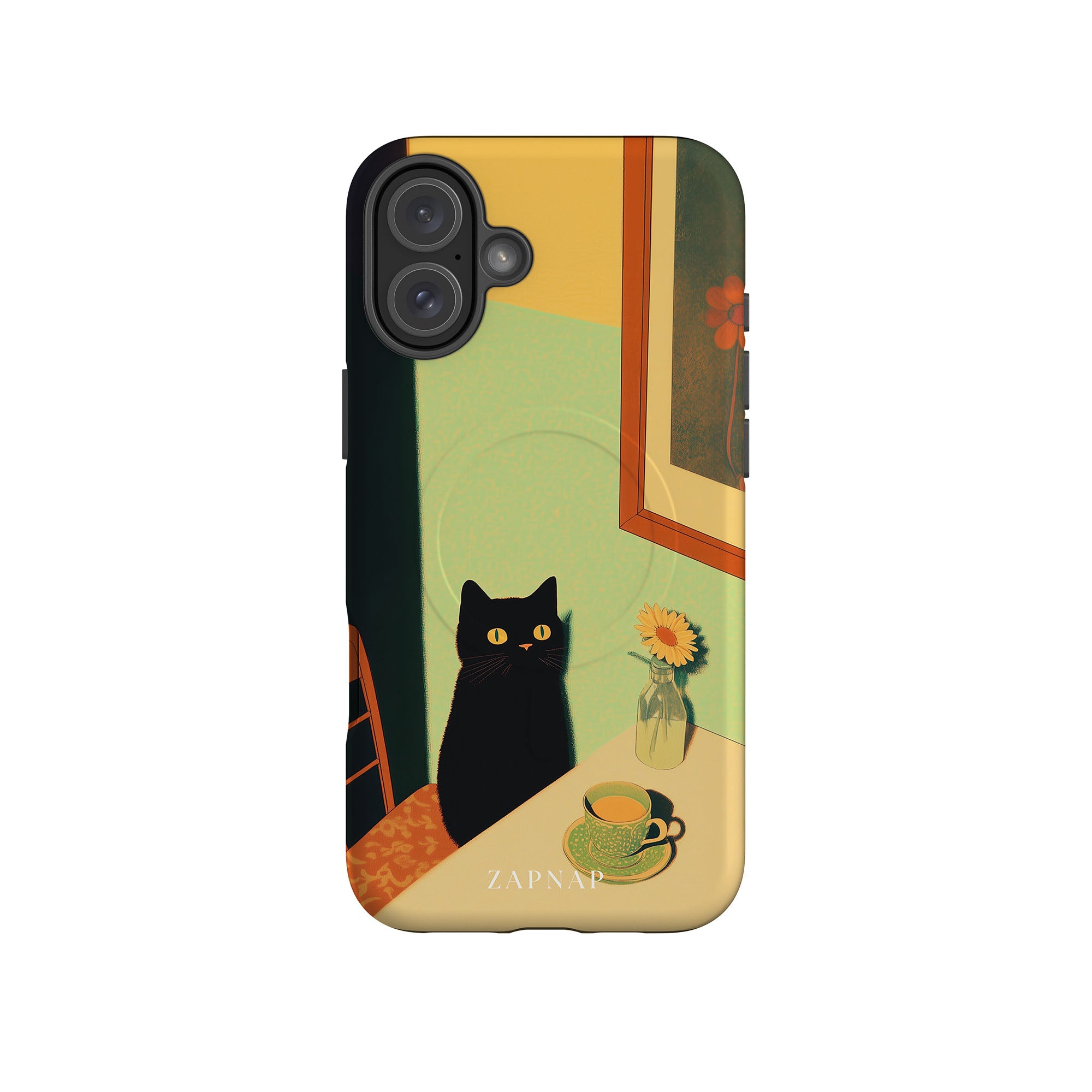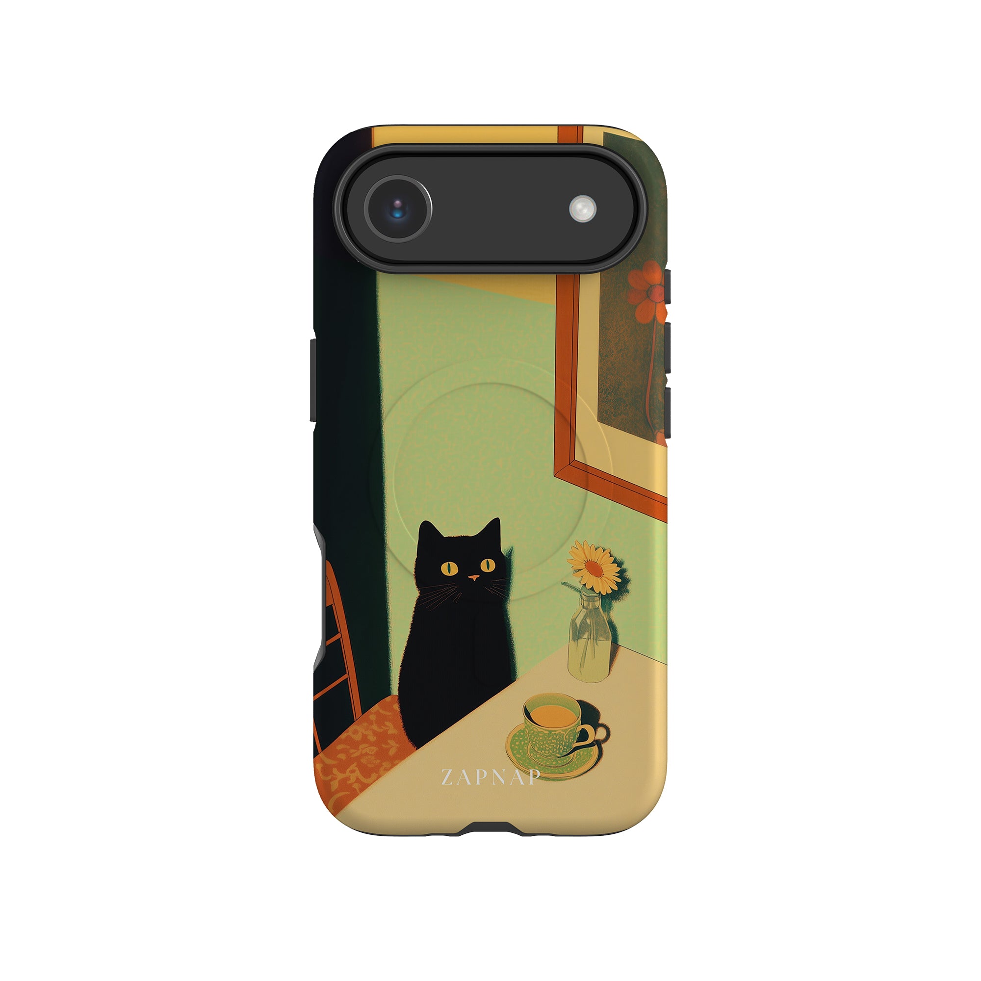In this serene painting, a black cat sits at a sunlit table, its bright eyes quietly observing. The simple scene, with a teacup and a daisy in a bottle, evokes a sense of calm and stillness, celebrating quiet companionship.