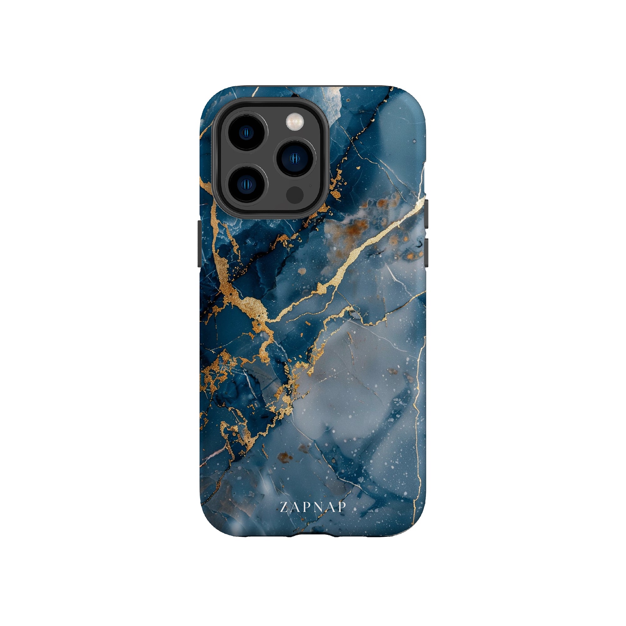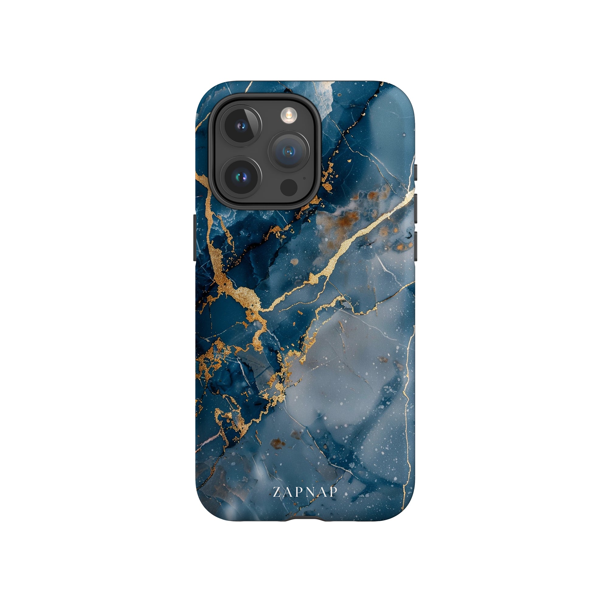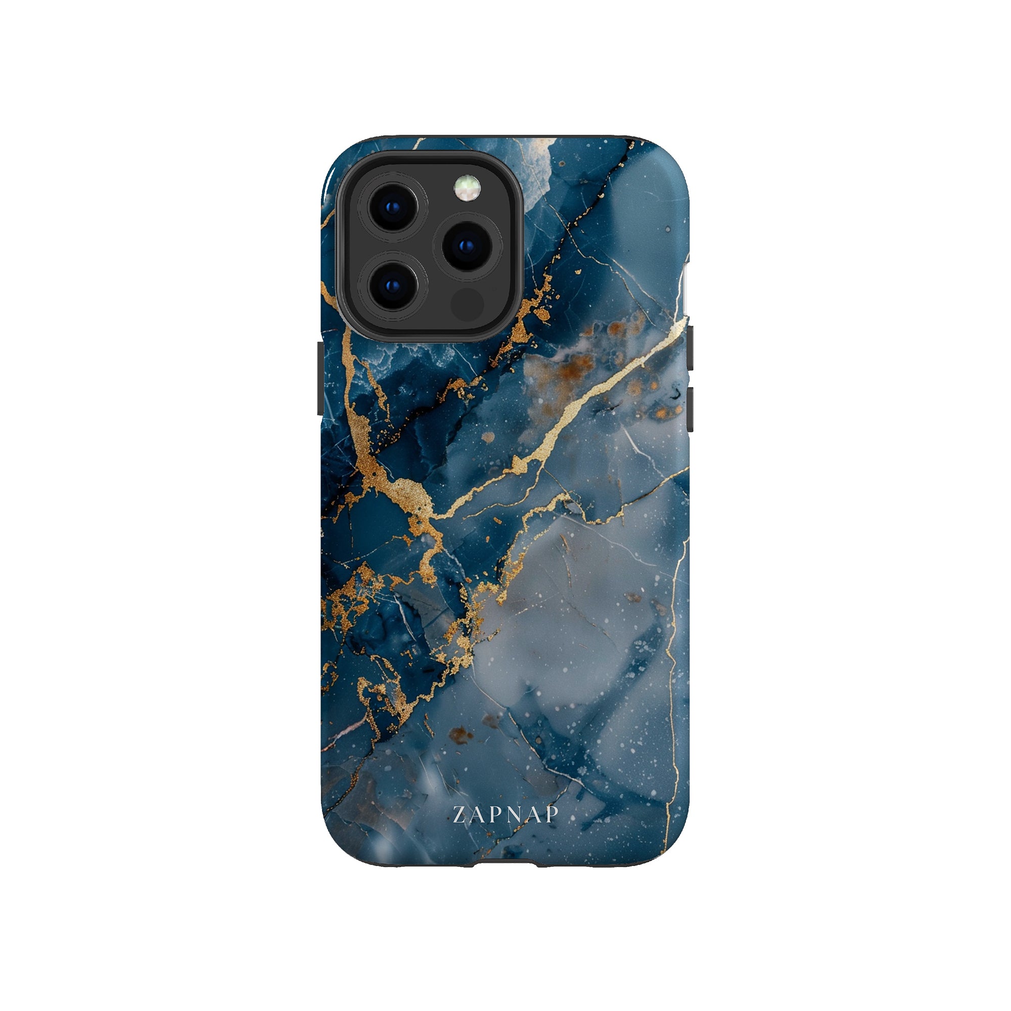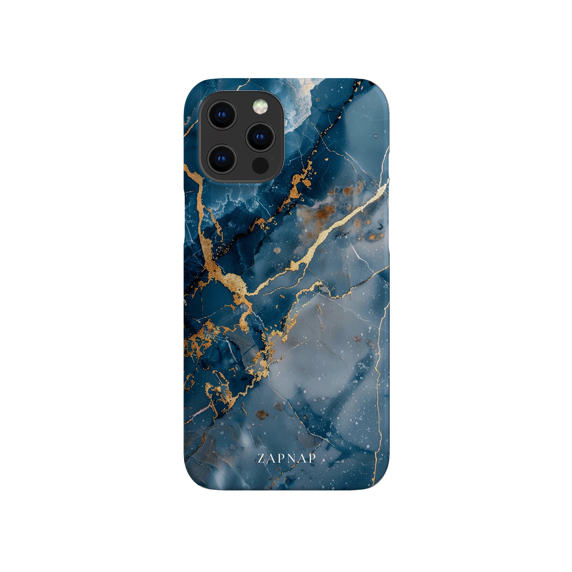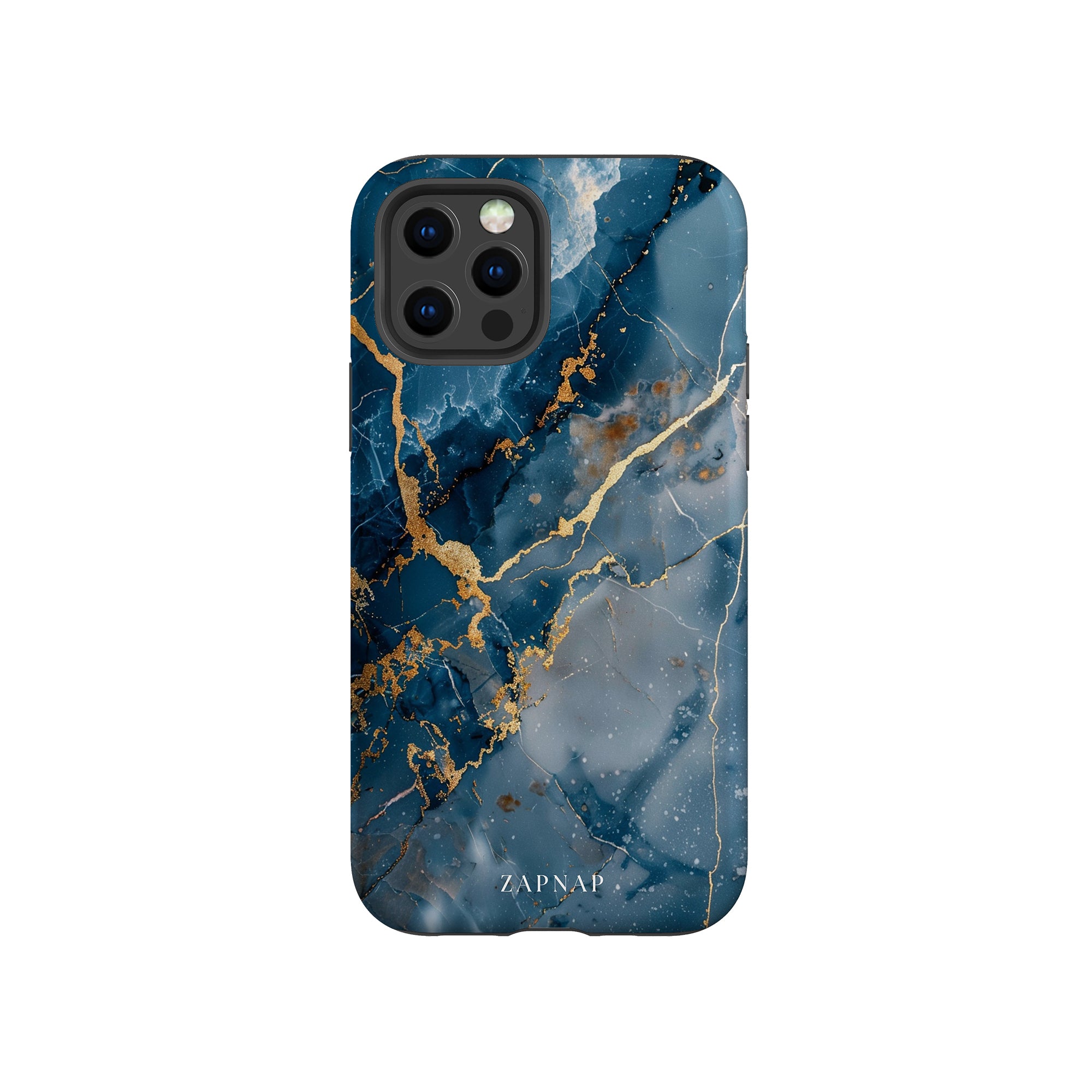 This phone case features a captivating display of deep blue marbling with stunning gold veining. The rich azure hues and luxurious gold accents create a sophisticated and elegant aesthetic. A great name for this design could be 'Azure Luxe.' This name captures the gemstone-like color scheme and the intricate, vein-like patterns, making it a perfect choice for anyone looking to add a touch of opulence and style to their device. Ideal for those who appreciate refined and unique designs, 'Azure Luxe' is sure to make a striking statement.