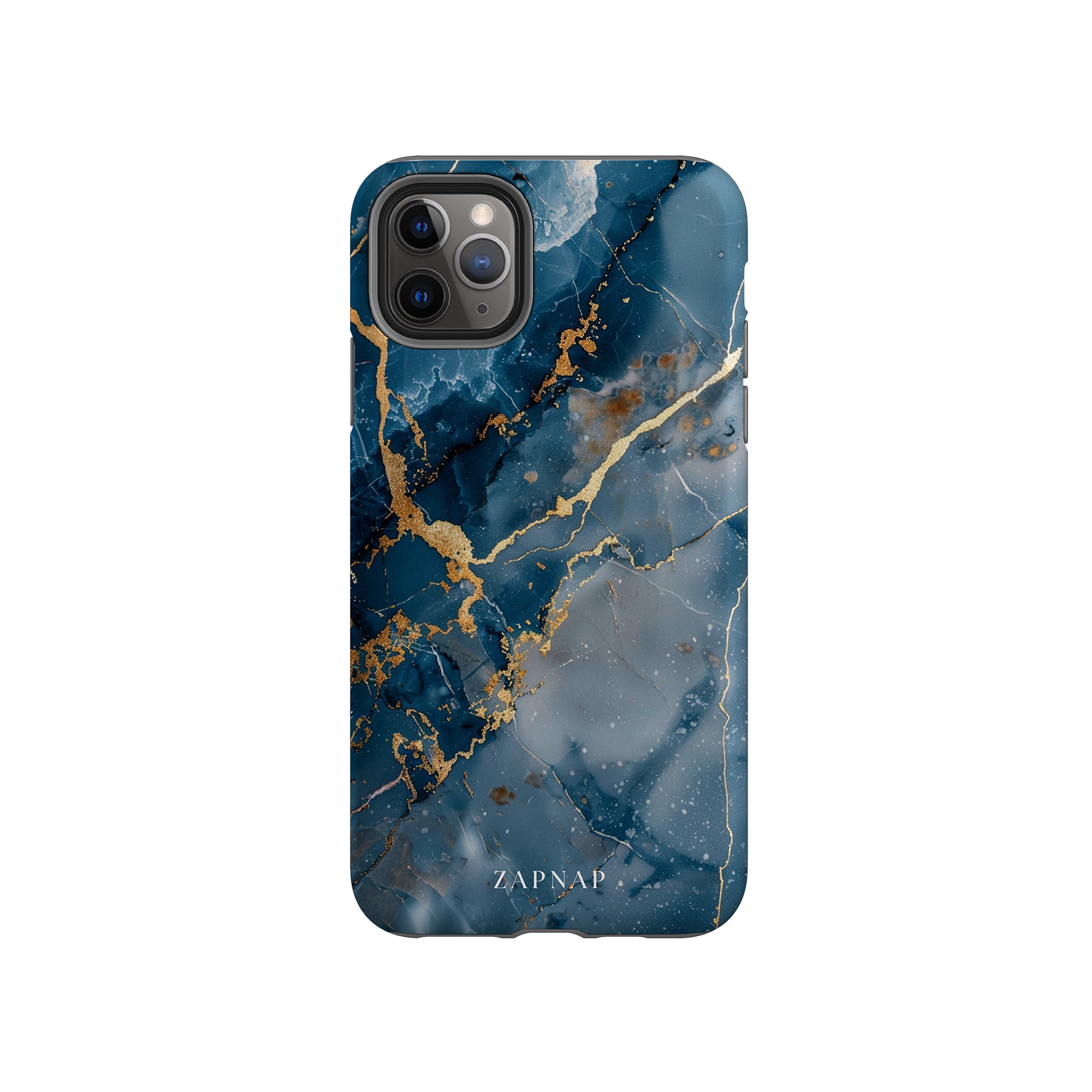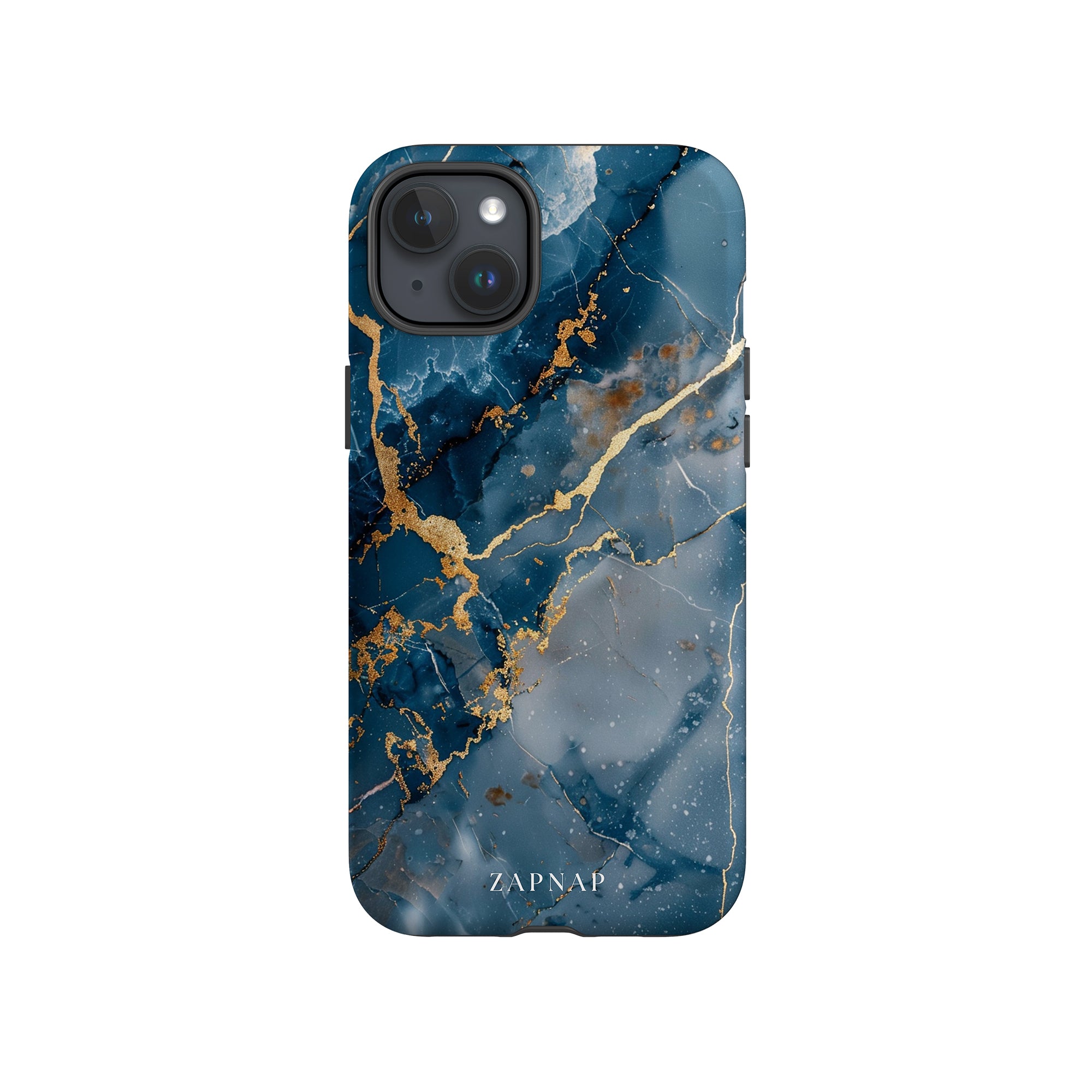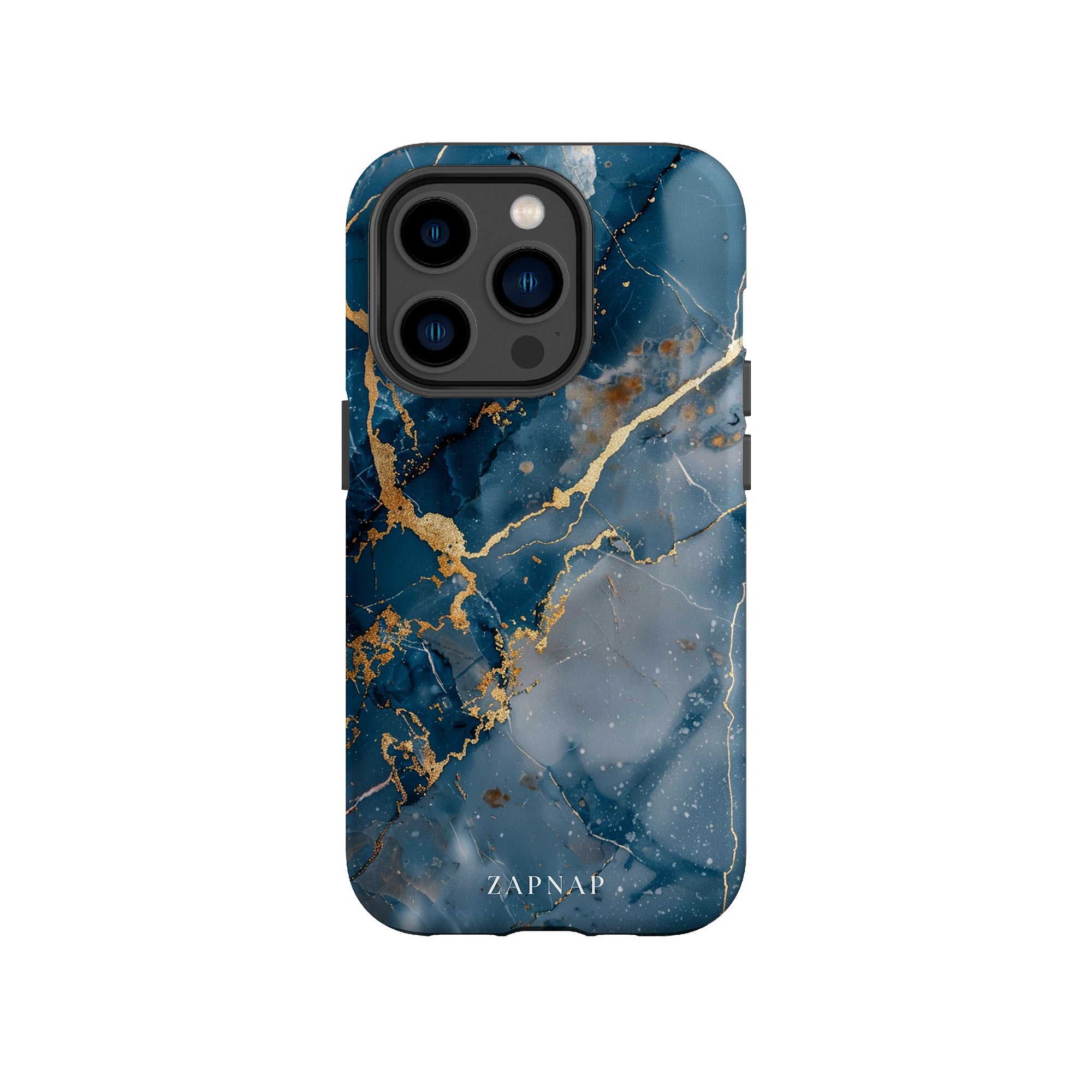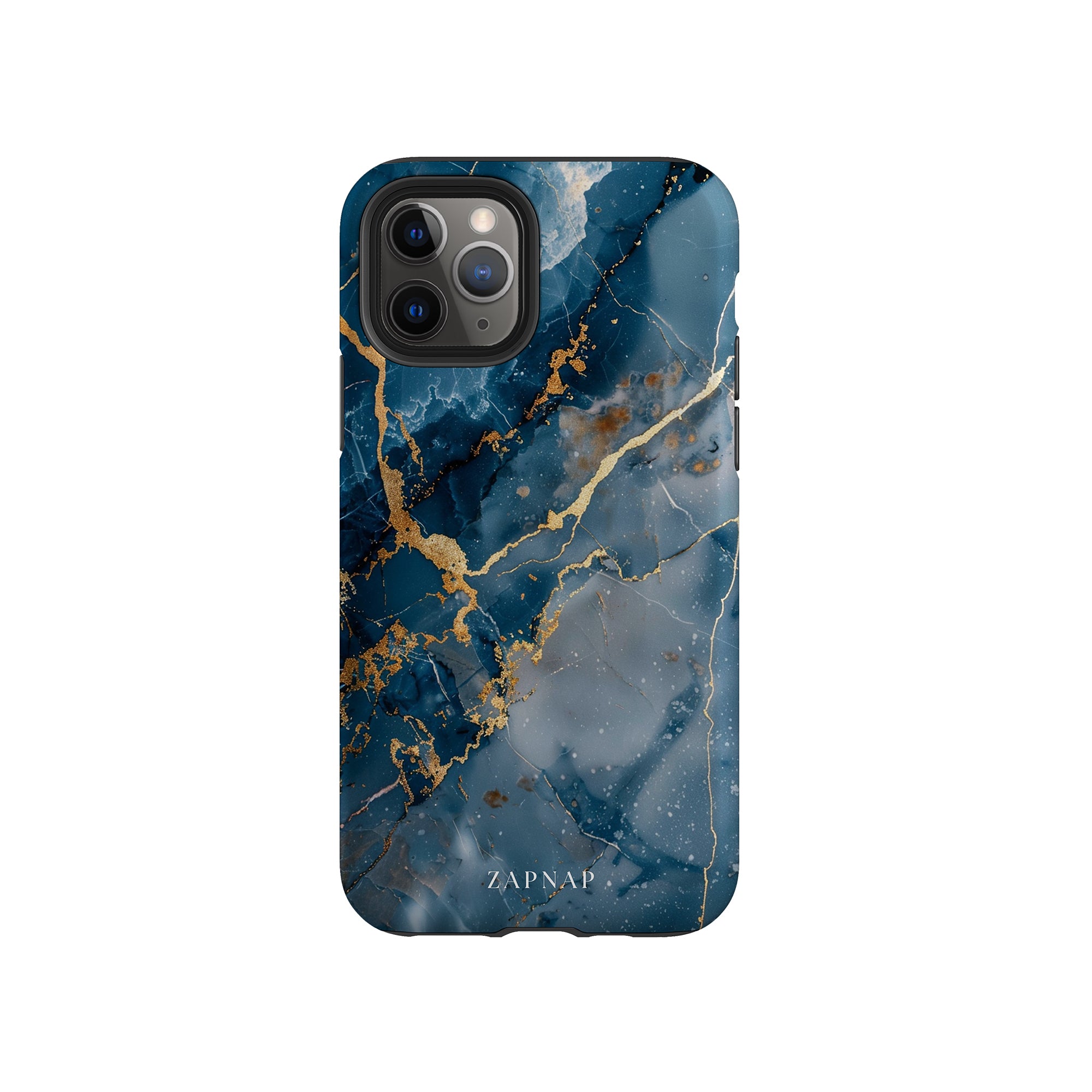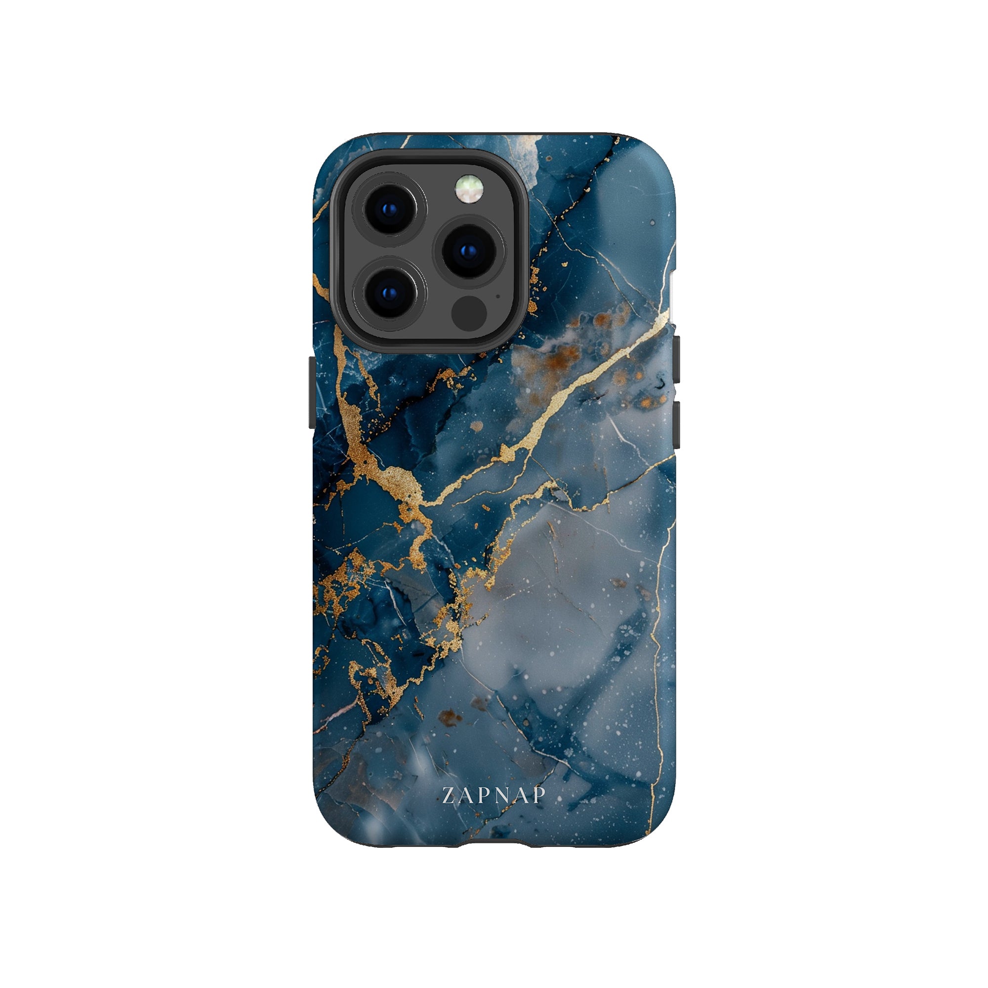 This phone case features a captivating display of deep blue marbling with stunning gold veining. The rich azure hues and luxurious gold accents create a sophisticated and elegant aesthetic. A great name for this design could be 'Azure Luxe.' This name captures the gemstone-like color scheme and the intricate, vein-like patterns, making it a perfect choice for anyone looking to add a touch of opulence and style to their device. Ideal for those who appreciate refined and unique designs, 'Azure Luxe' is sure to make a striking statement.