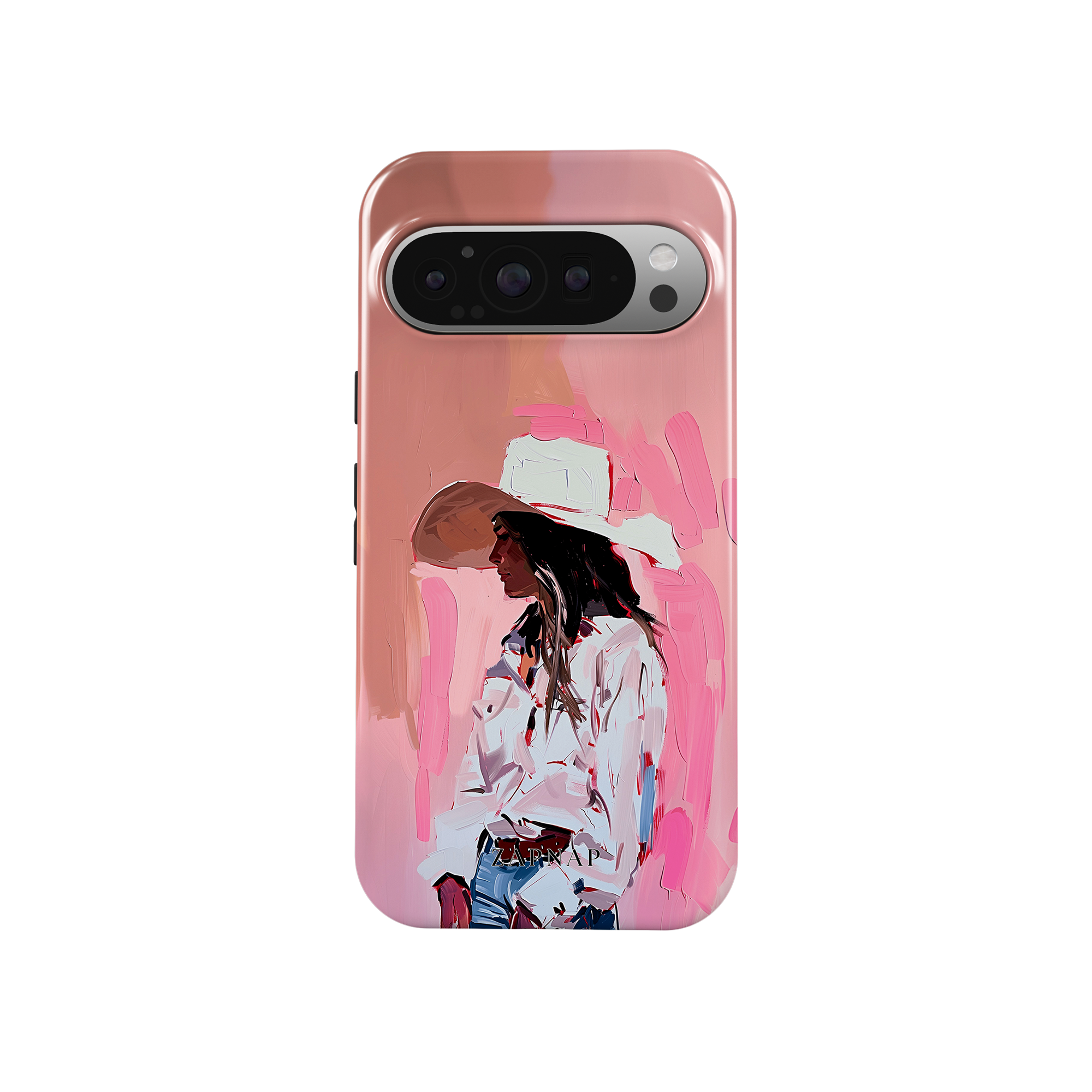 Texas Serenade portrays a contemplative cowgirl, capturing the essence of quiet strength and grace against a backdrop of soft, flowing pinks. The subtle brushstrokes highlight her poised demeanour and the timeless spirit of the Lone Star State.