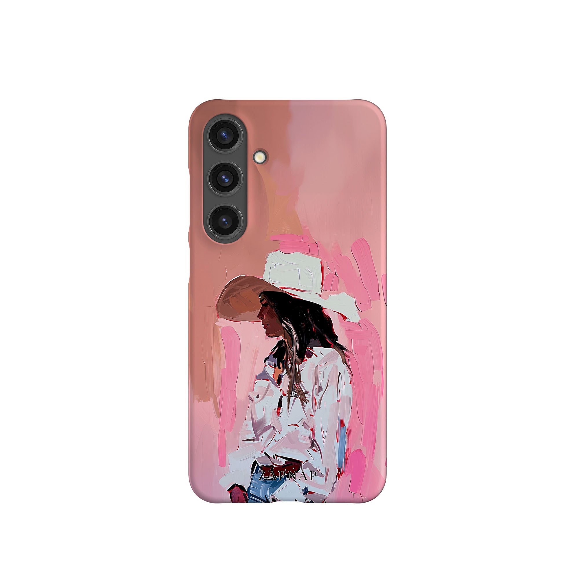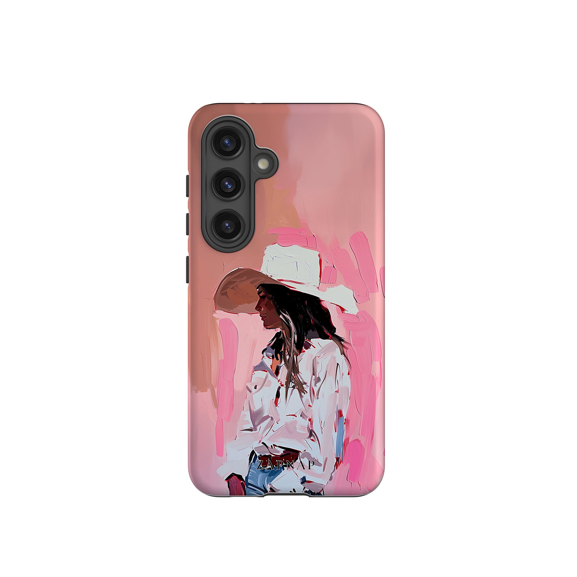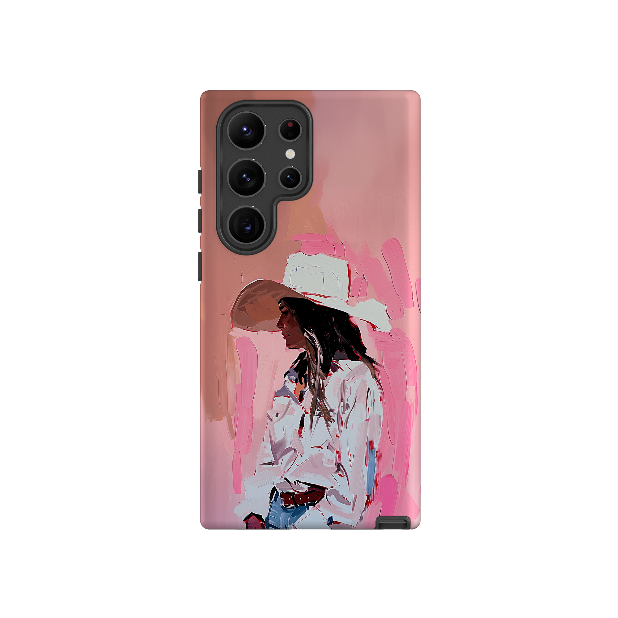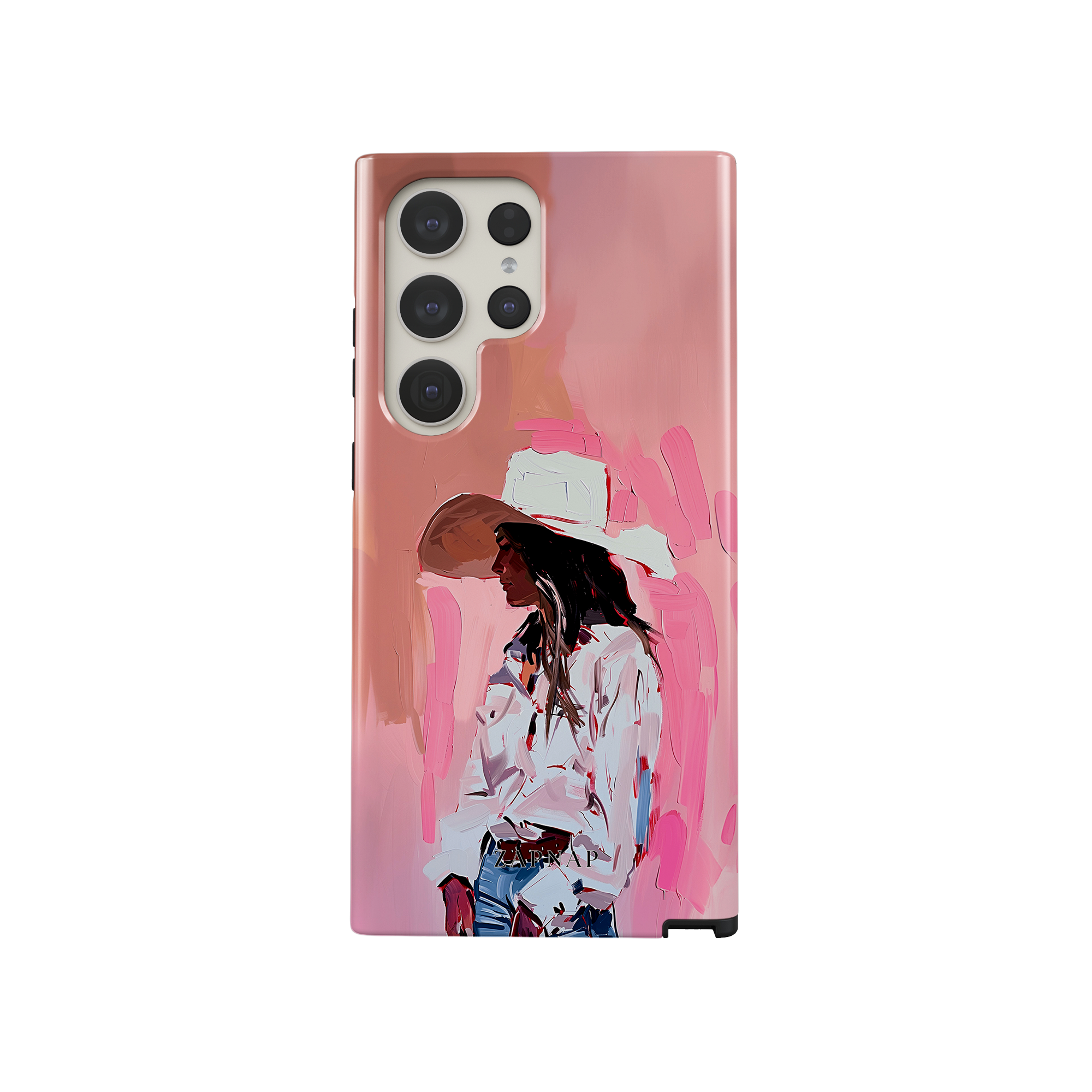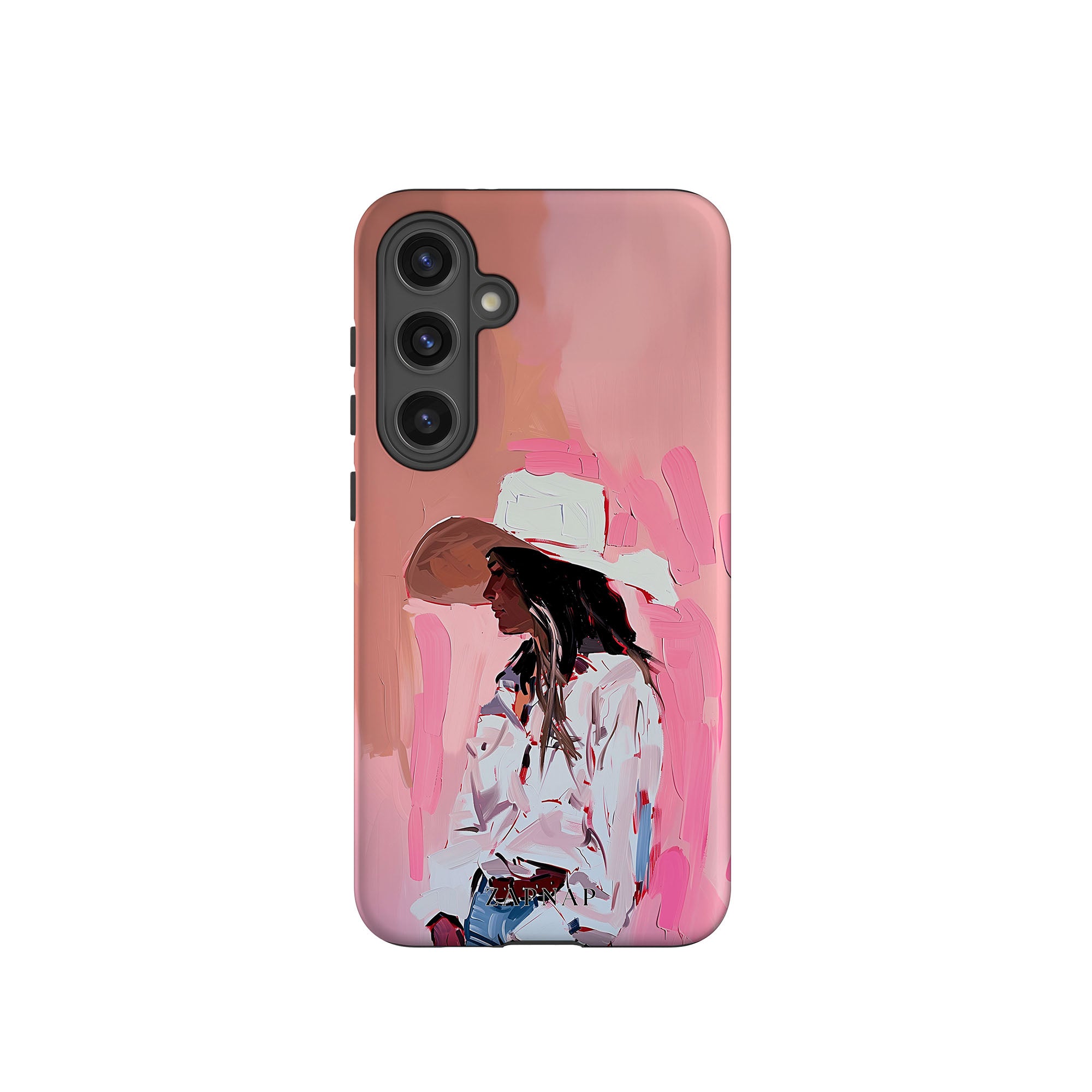 Texas Serenade portrays a contemplative cowgirl, capturing the essence of quiet strength and grace against a backdrop of soft, flowing pinks. The subtle brushstrokes highlight her poised demeanour and the timeless spirit of the Lone Star State.