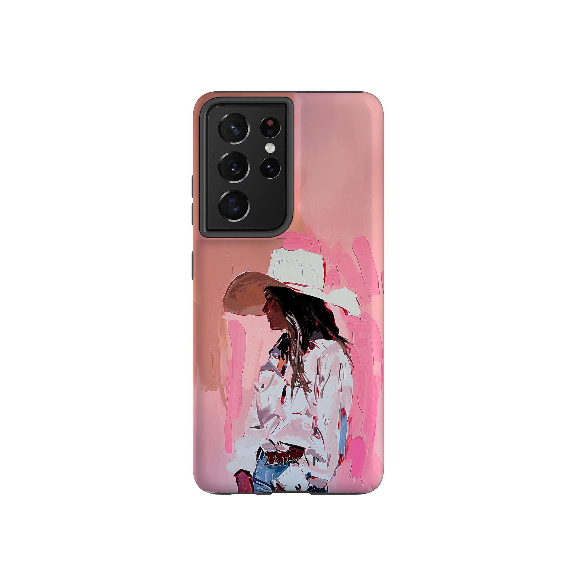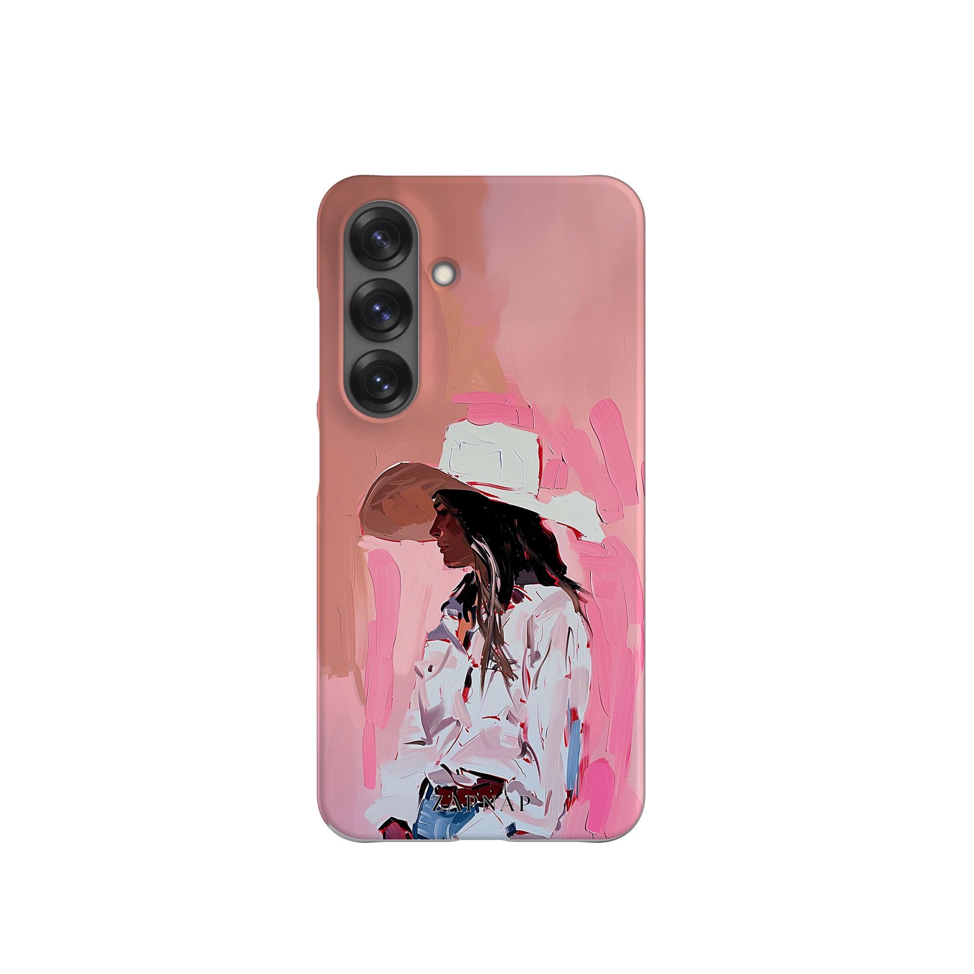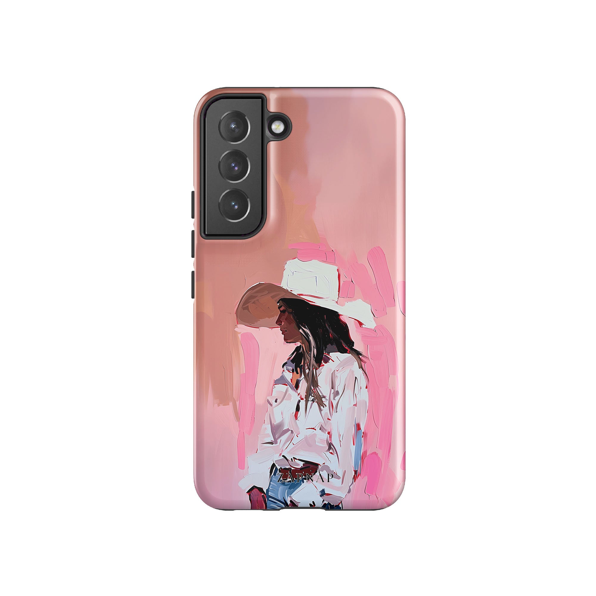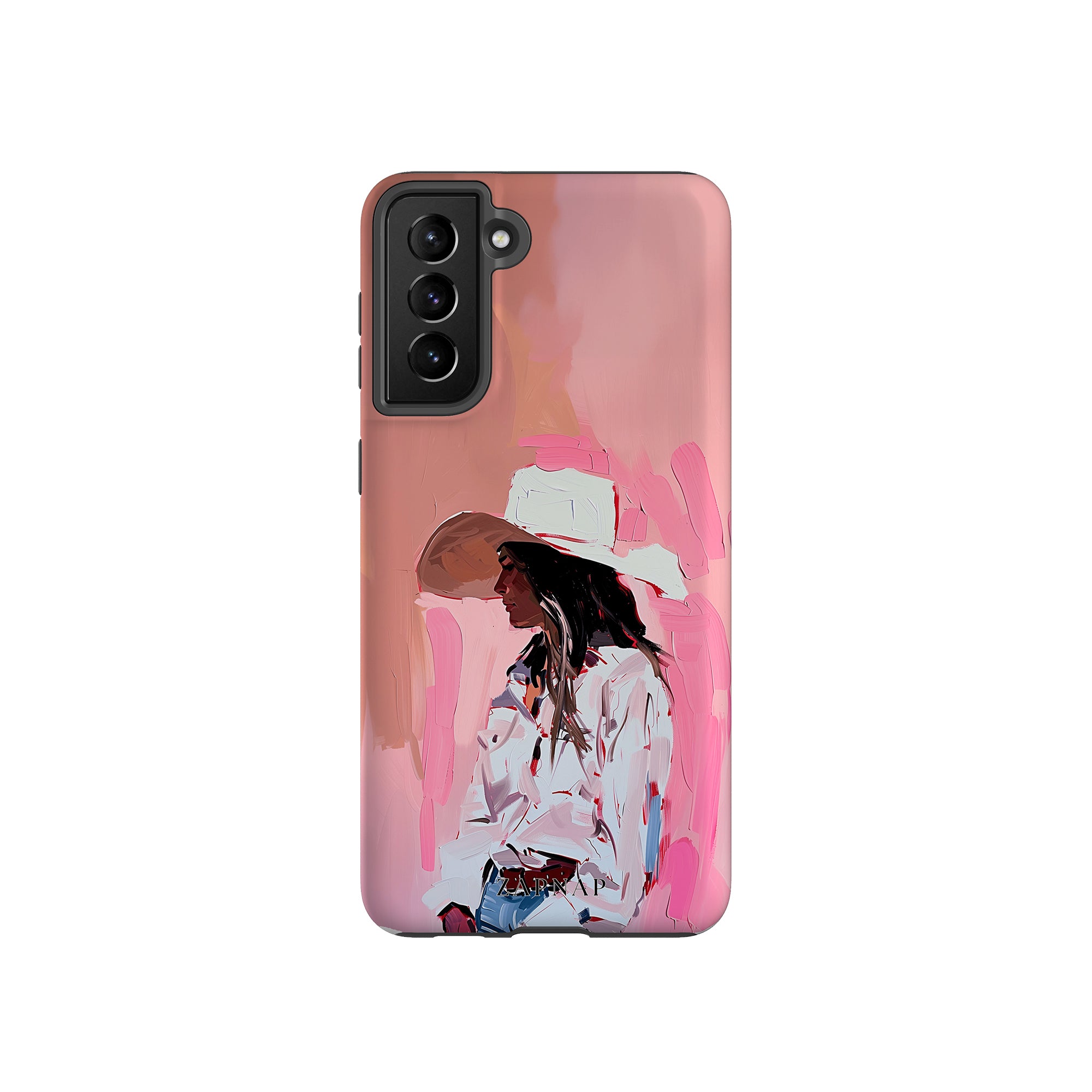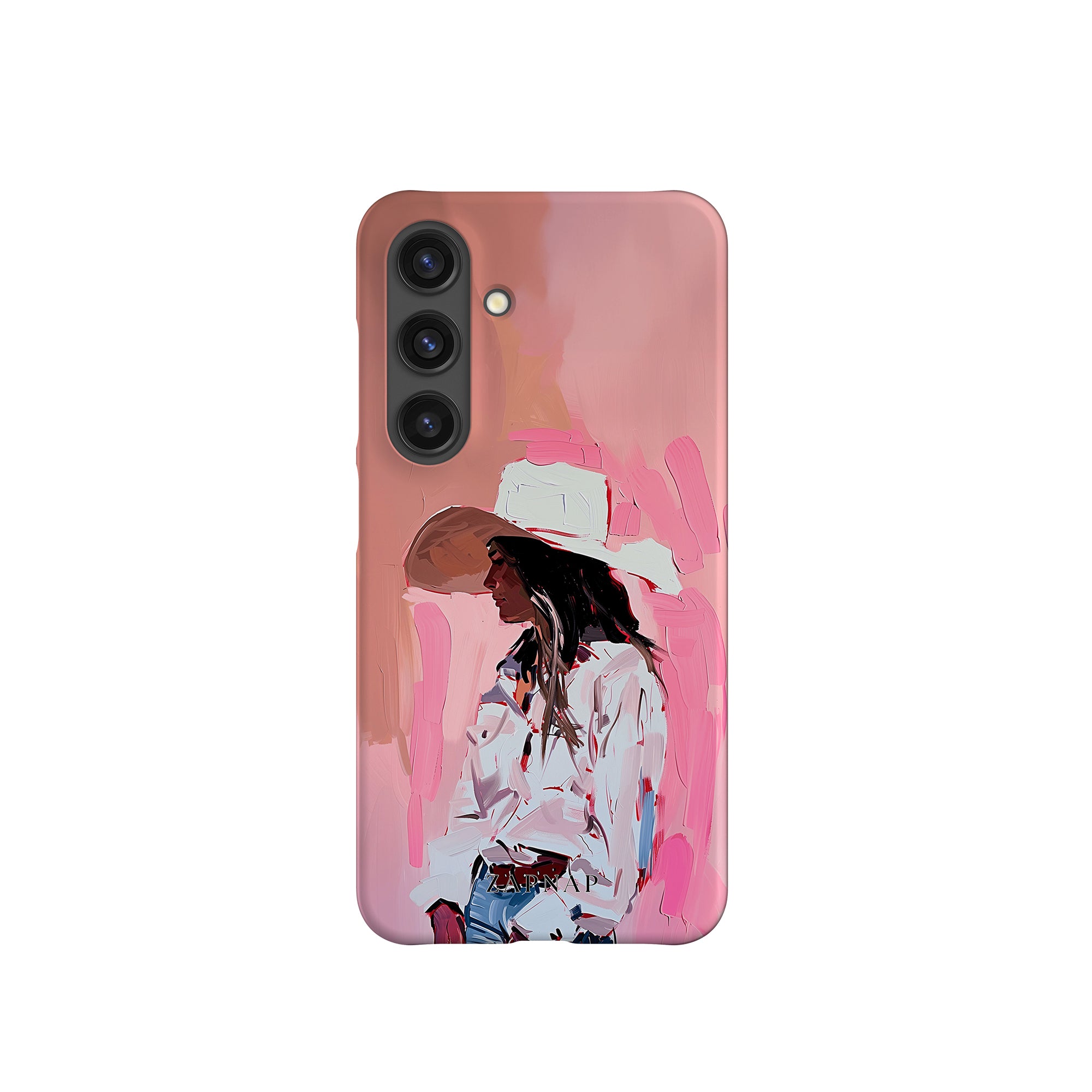 Texas Serenade portrays a contemplative cowgirl, capturing the essence of quiet strength and grace against a backdrop of soft, flowing pinks. The subtle brushstrokes highlight her poised demeanour and the timeless spirit of the Lone Star State.