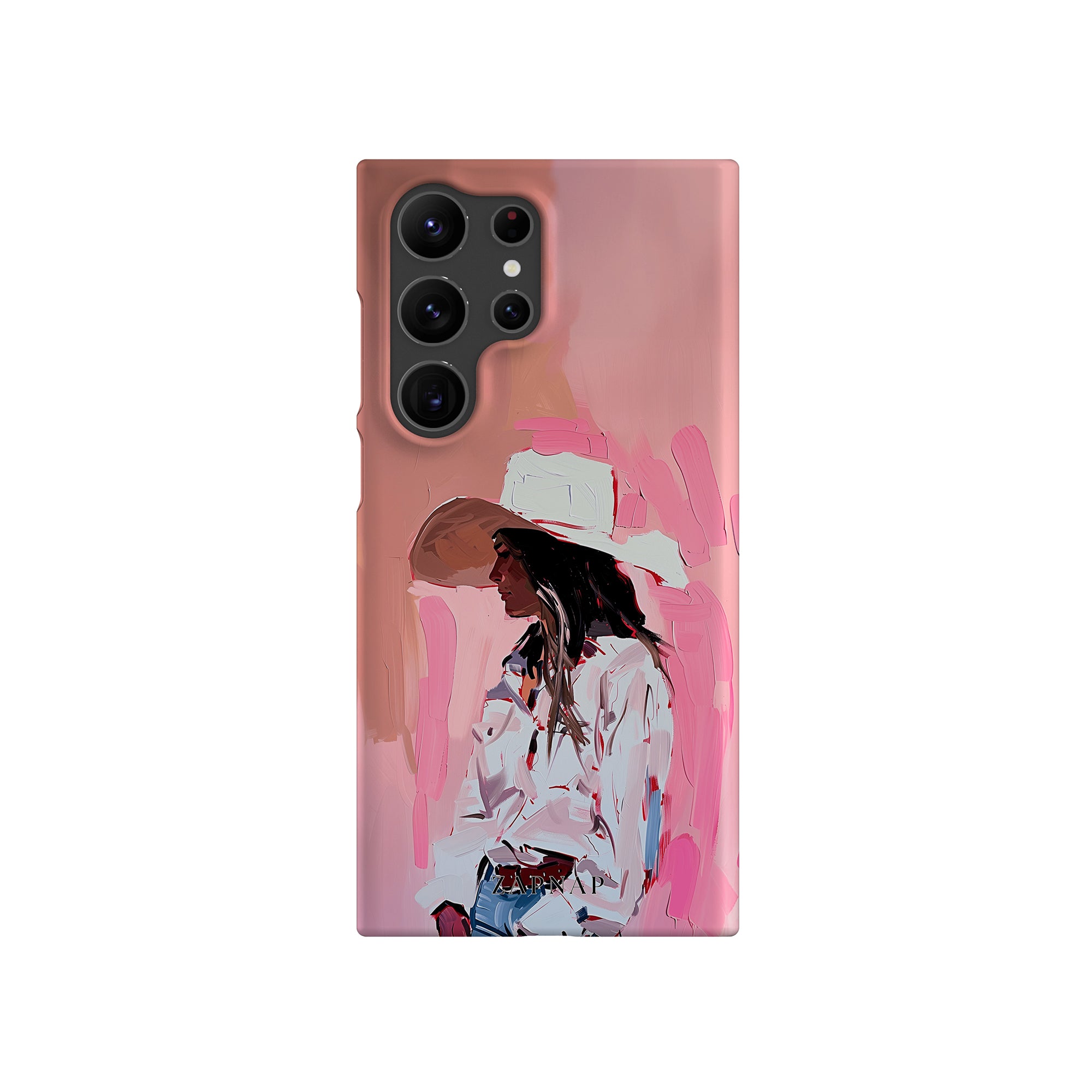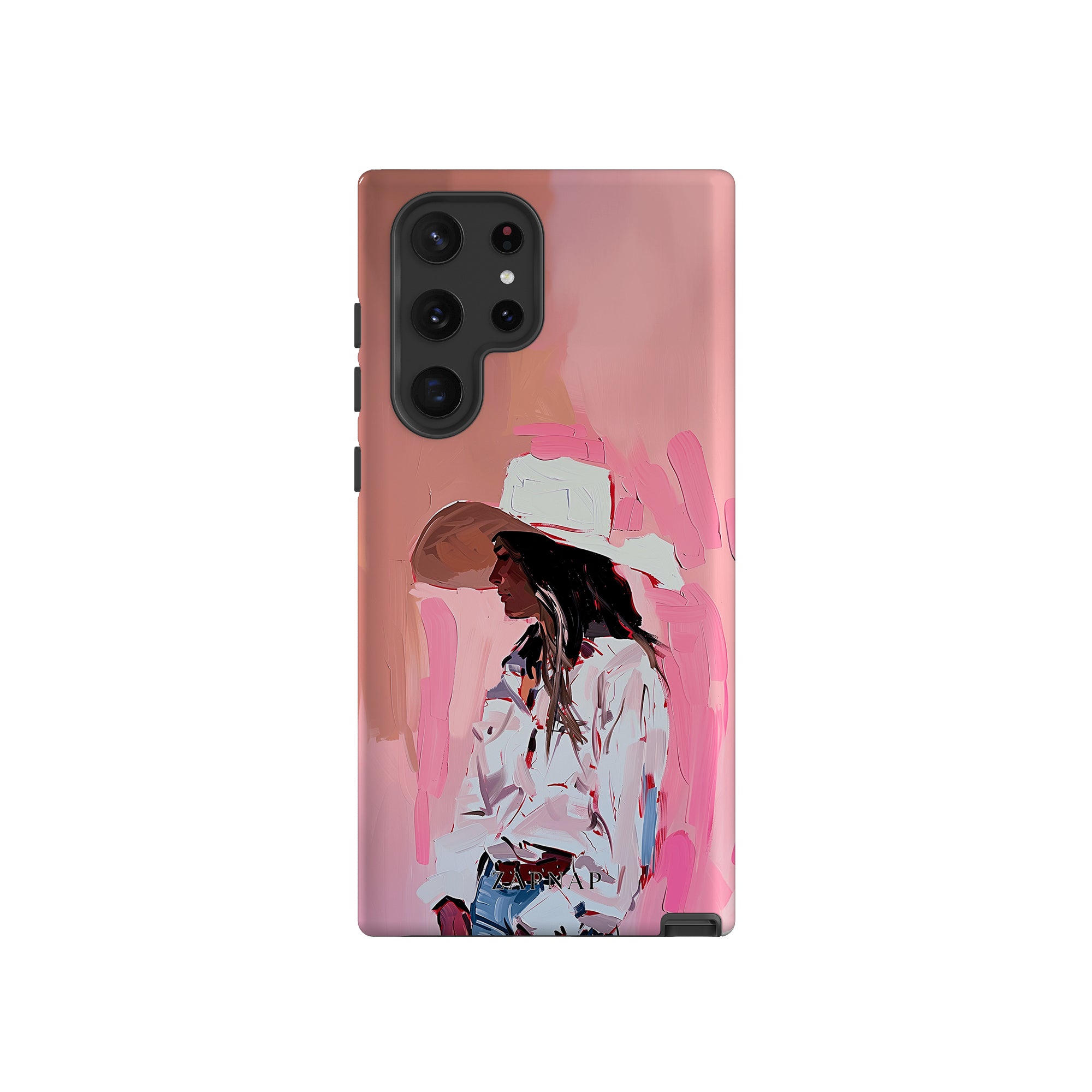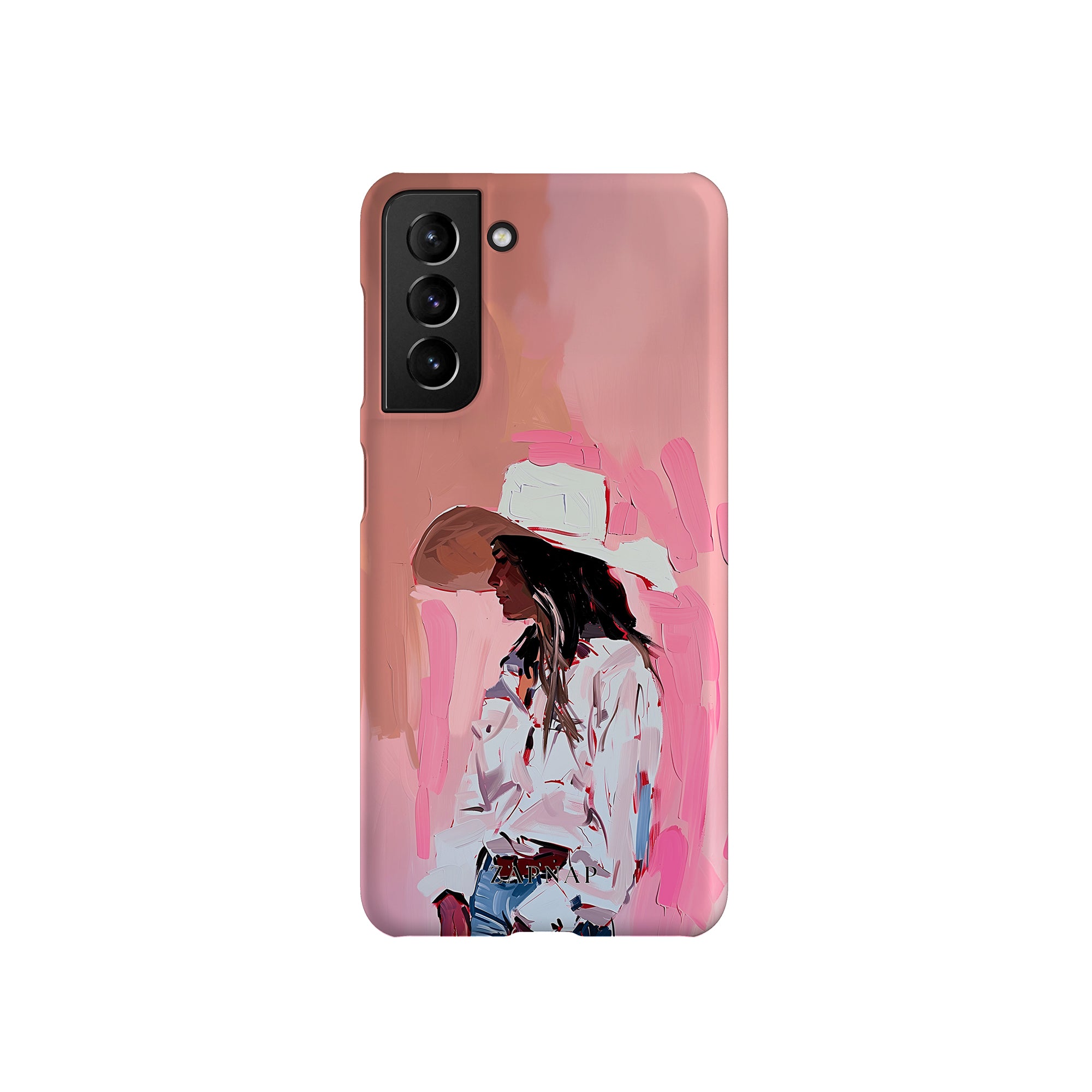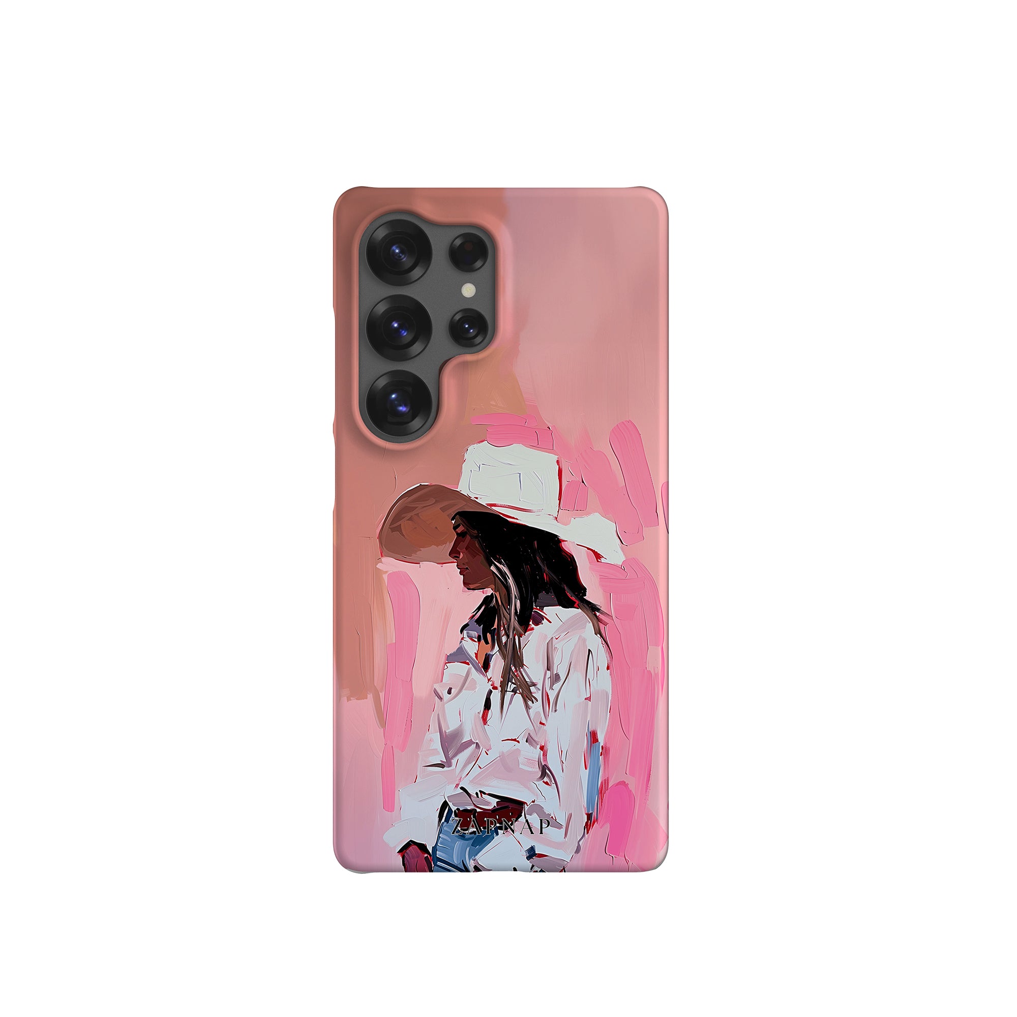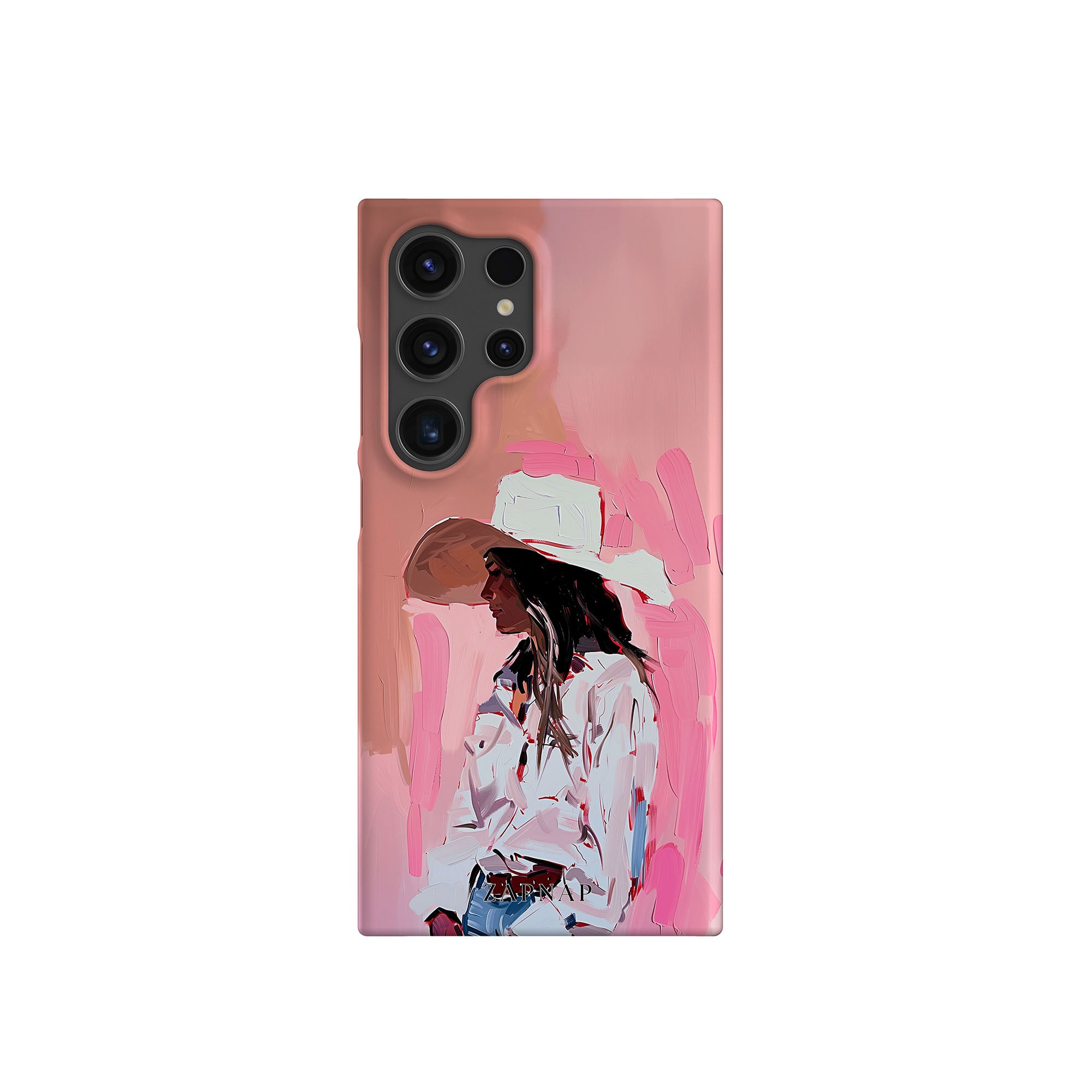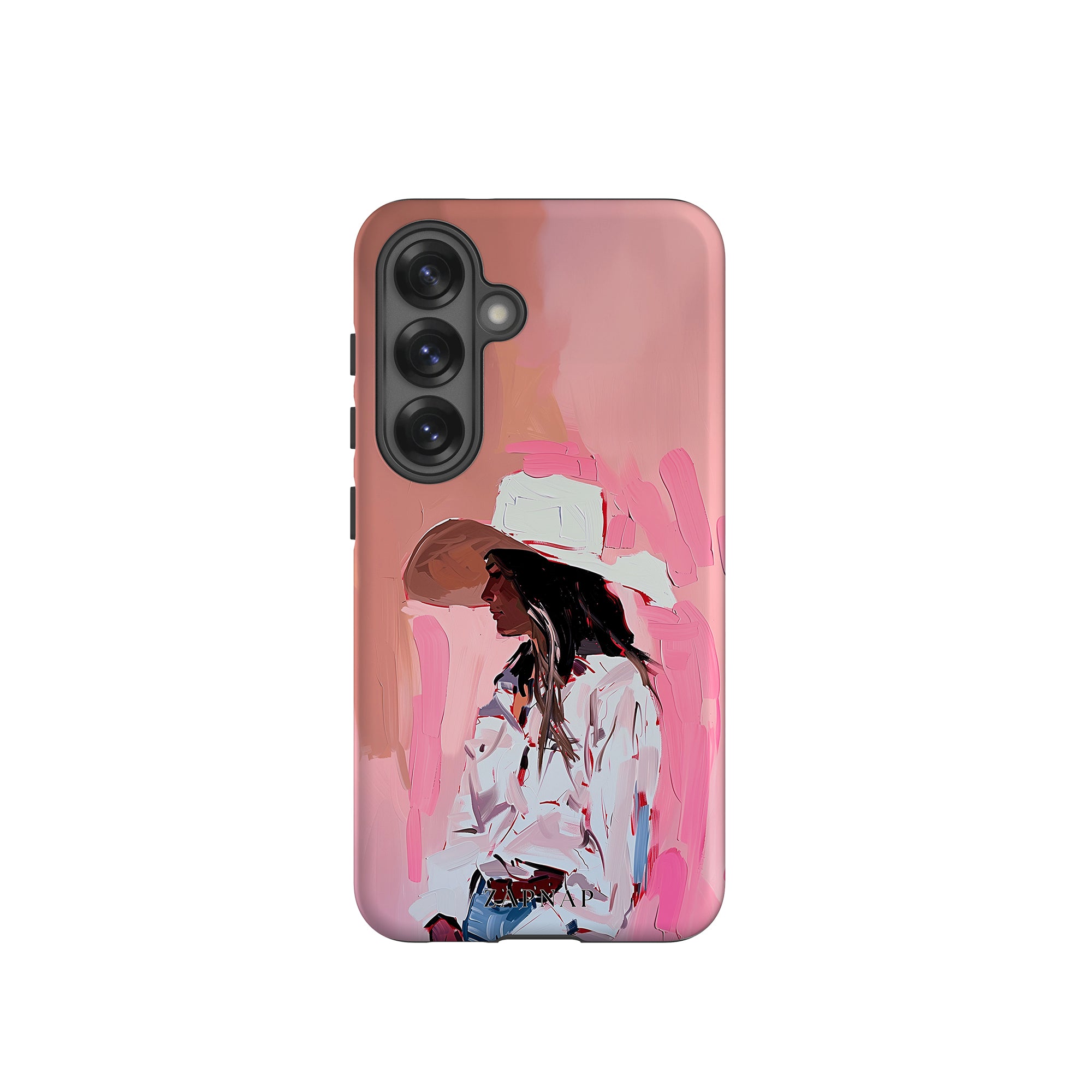 Texas Serenade portrays a contemplative cowgirl, capturing the essence of quiet strength and grace against a backdrop of soft, flowing pinks. The subtle brushstrokes highlight her poised demeanour and the timeless spirit of the Lone Star State.
