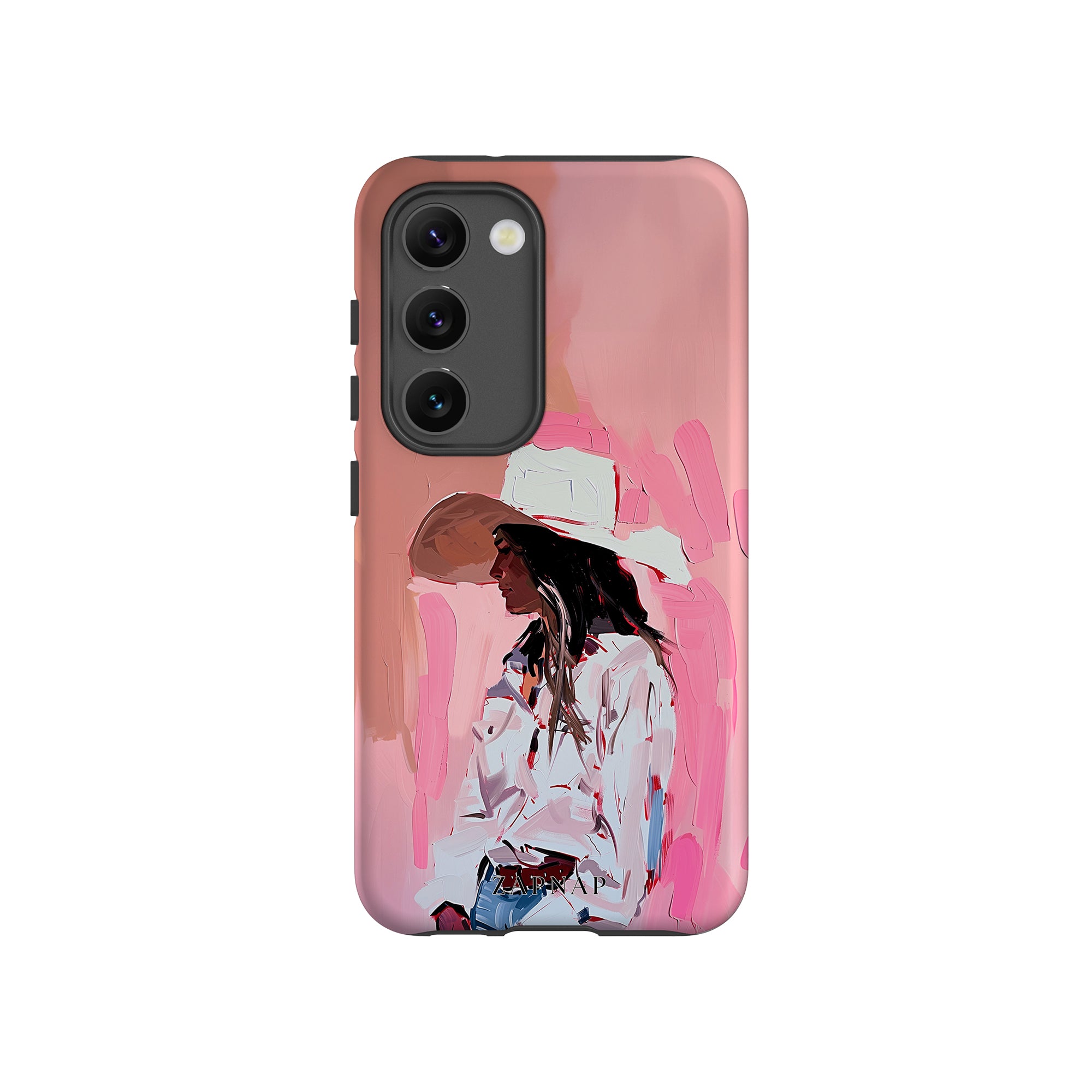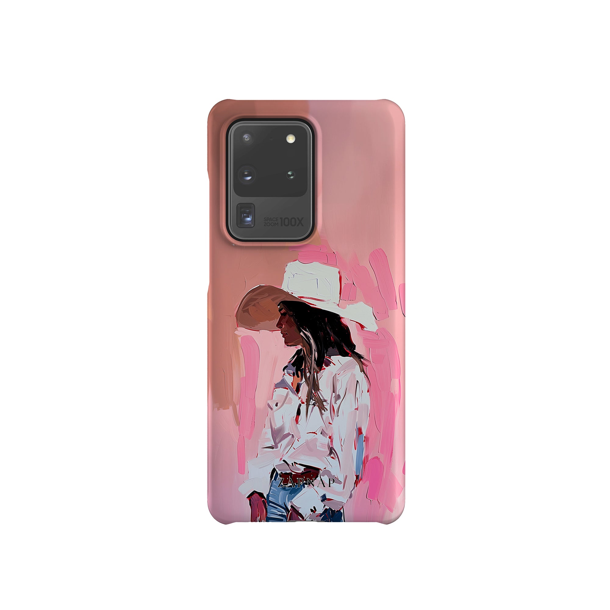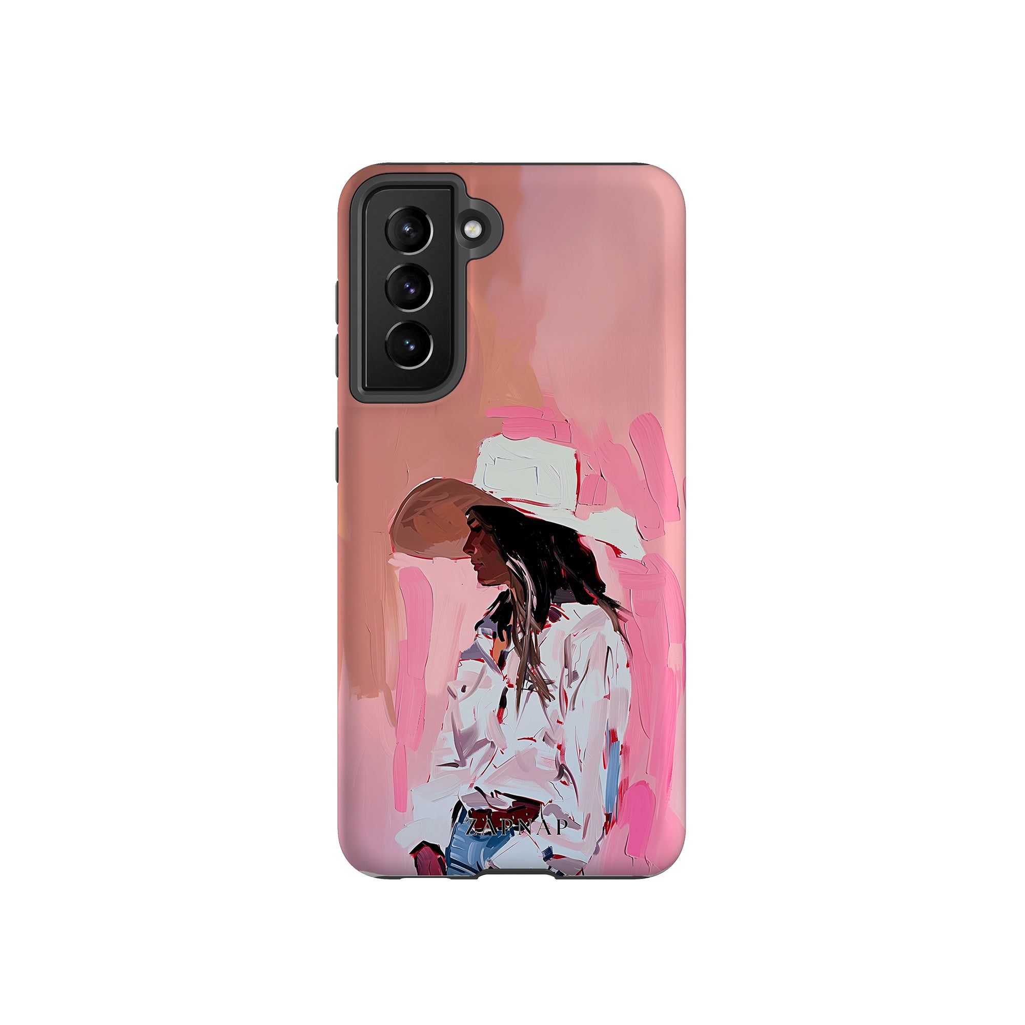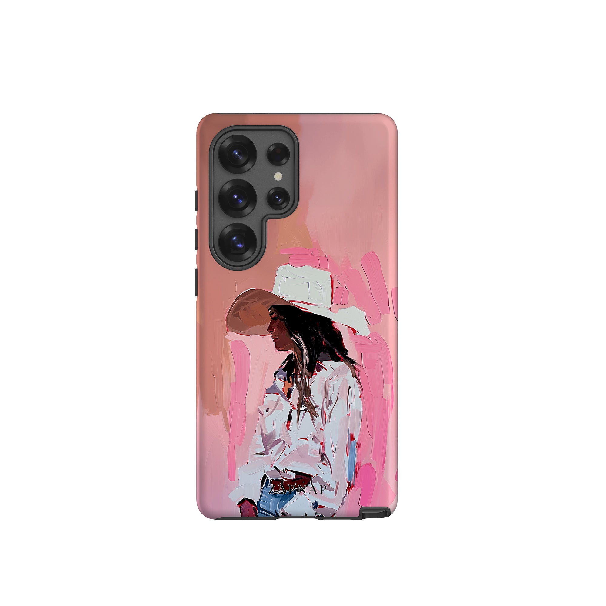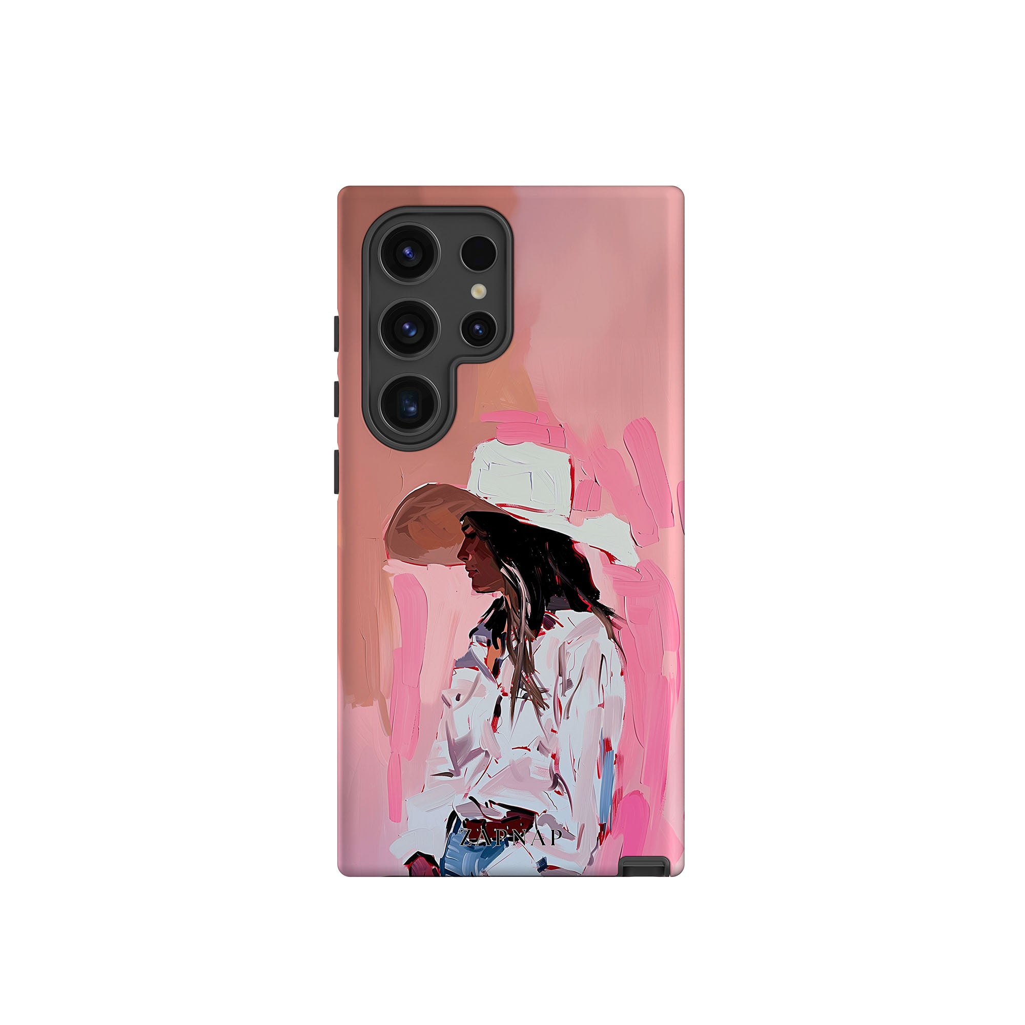 Texas Serenade portrays a contemplative cowgirl, capturing the essence of quiet strength and grace against a backdrop of soft, flowing pinks. The subtle brushstrokes highlight her poised demeanour and the timeless spirit of the Lone Star State.