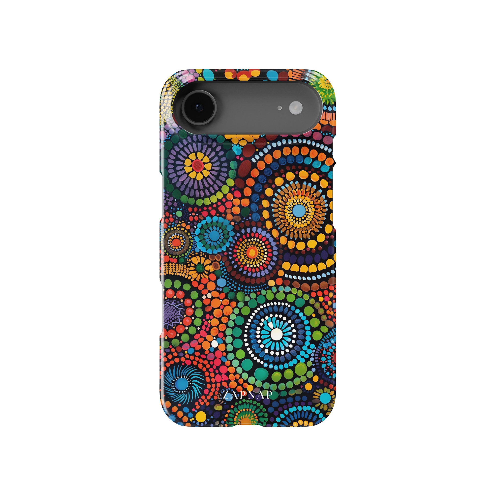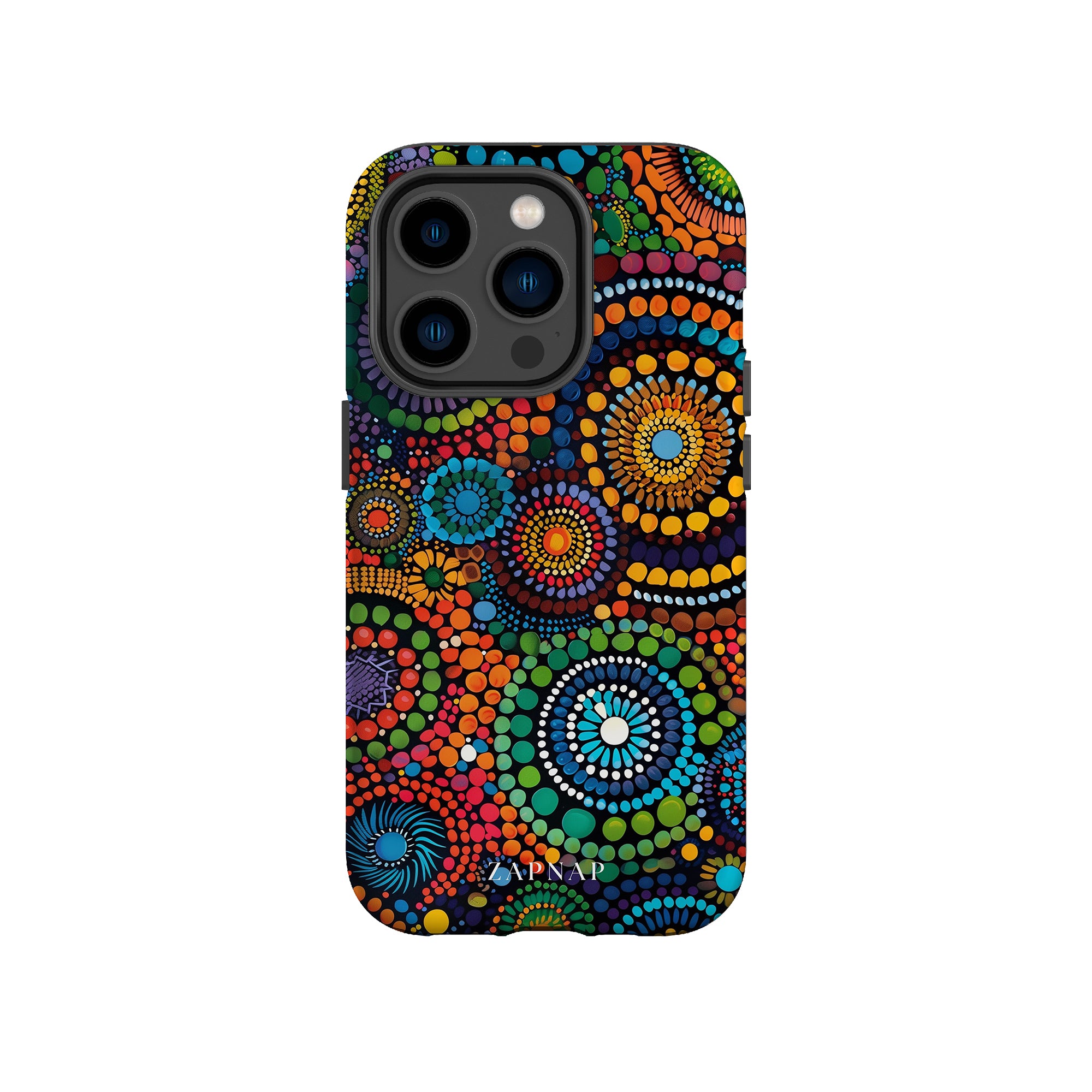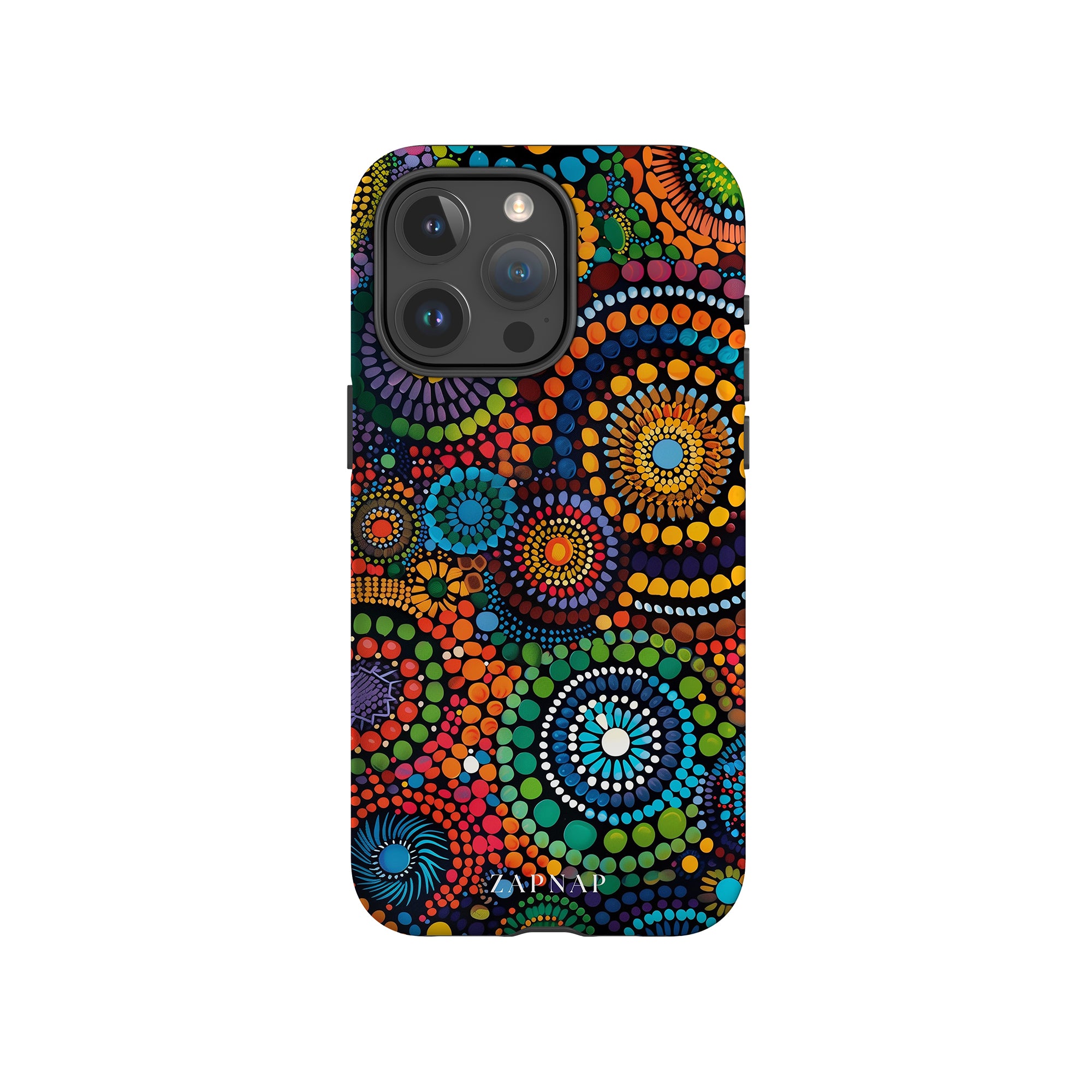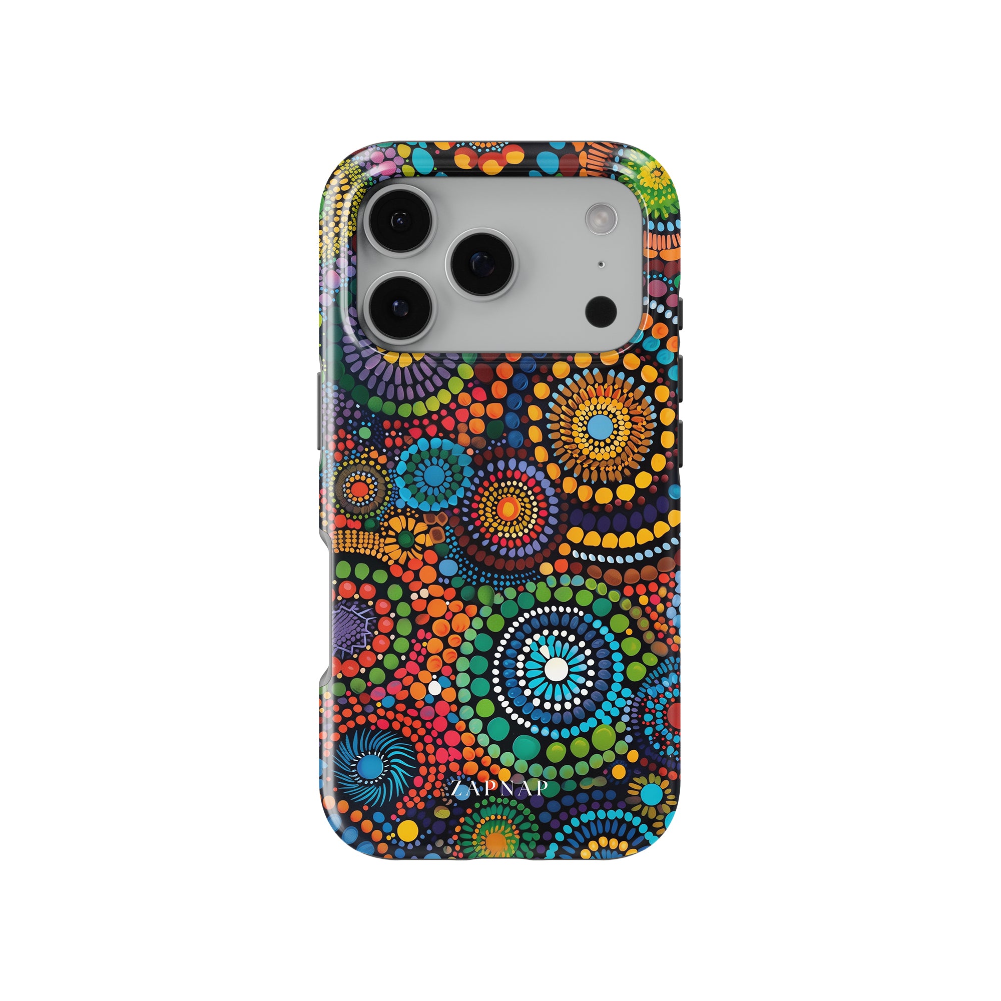 This vibrant artwork captures the energy and warmth of the sun, depicted through intricate circular patterns that radiate in a dazzling array of colours. The composition evokes the powerful connection between light, life, and the land, celebrating the essence of renewal and vitality in nature.