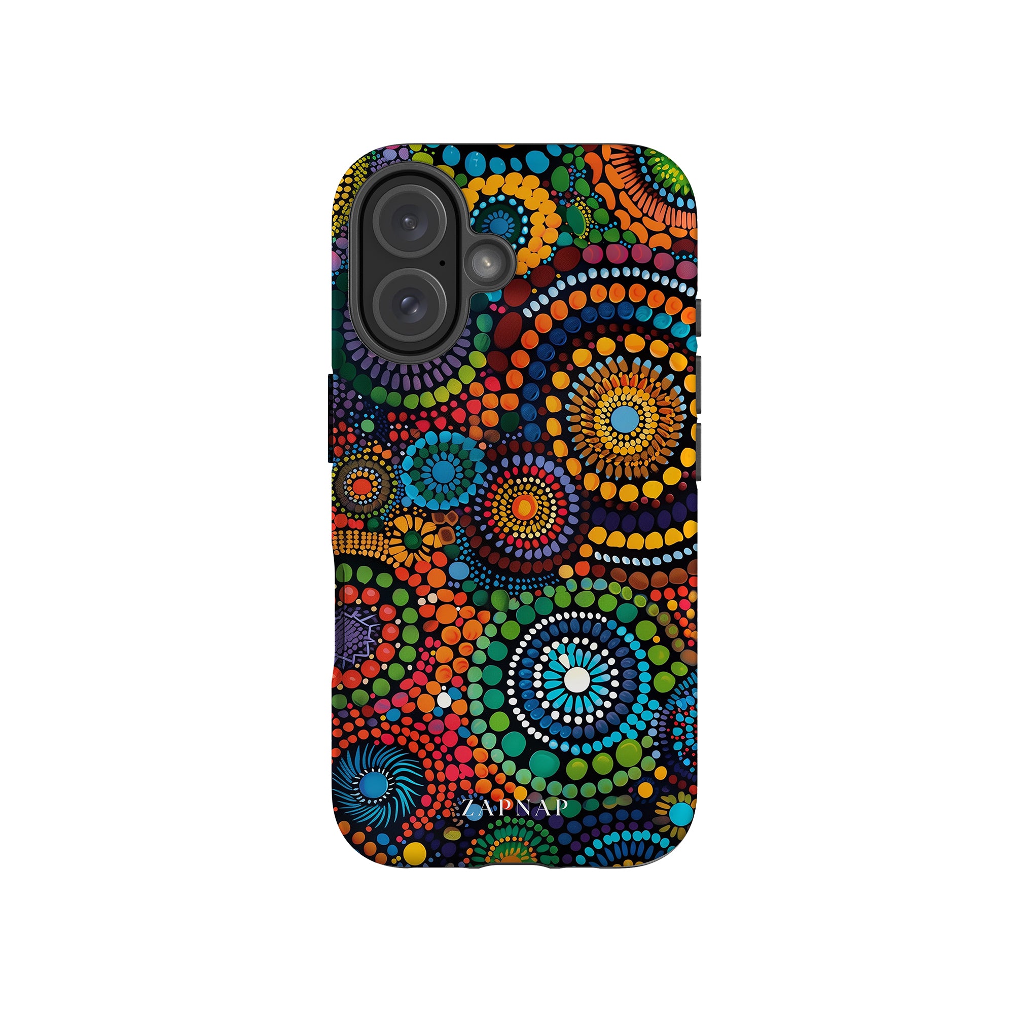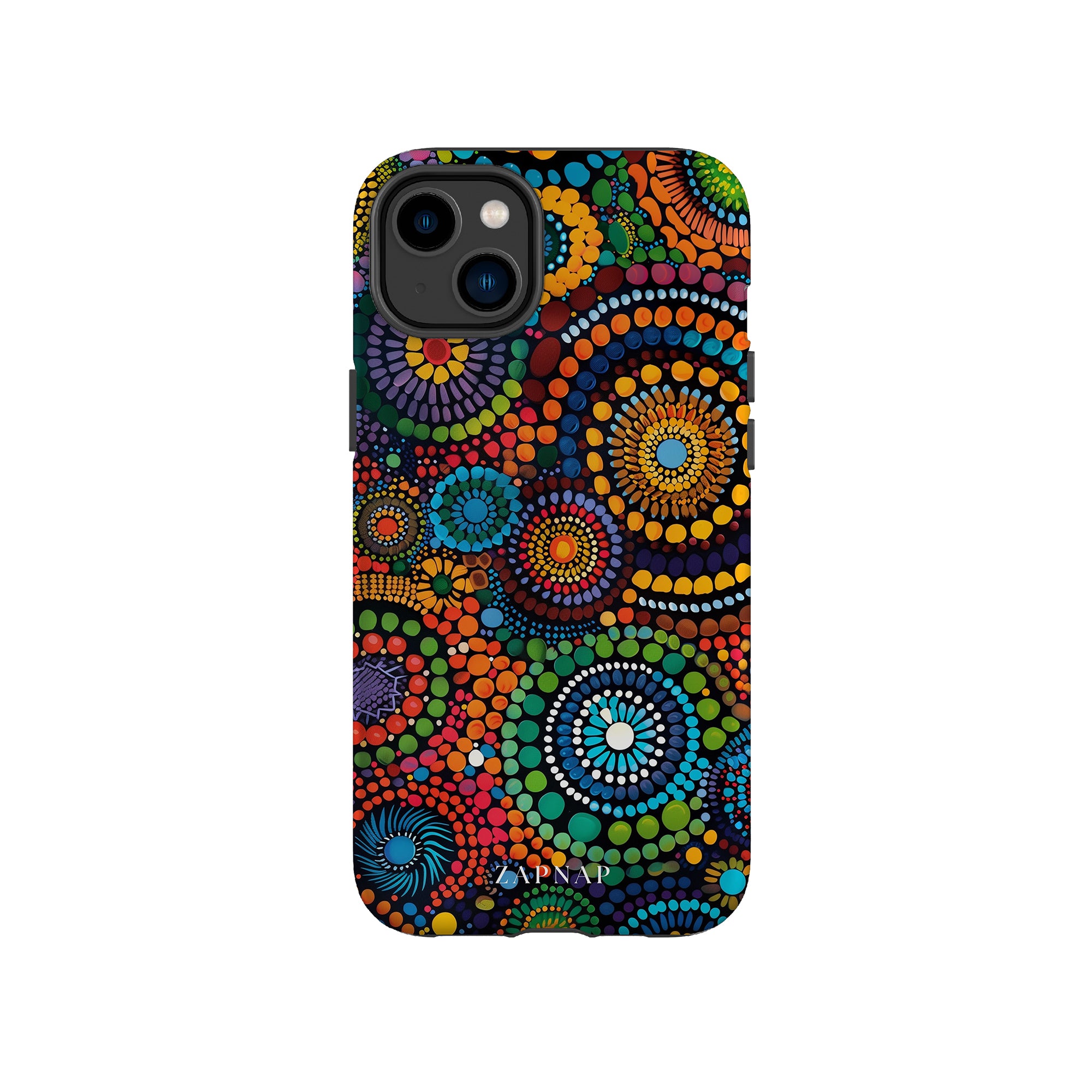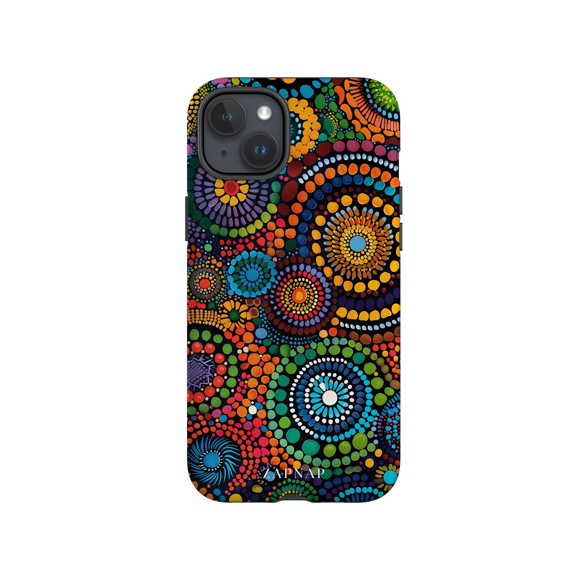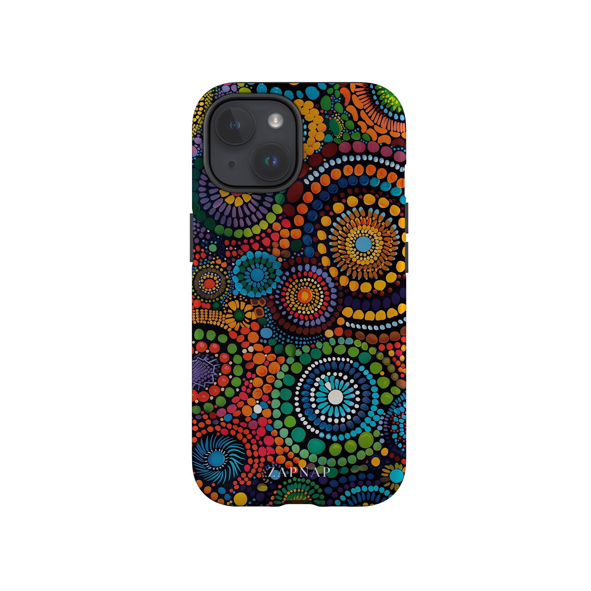 This vibrant artwork captures the energy and warmth of the sun, depicted through intricate circular patterns that radiate in a dazzling array of colours. The composition evokes the powerful connection between light, life, and the land, celebrating the essence of renewal and vitality in nature.