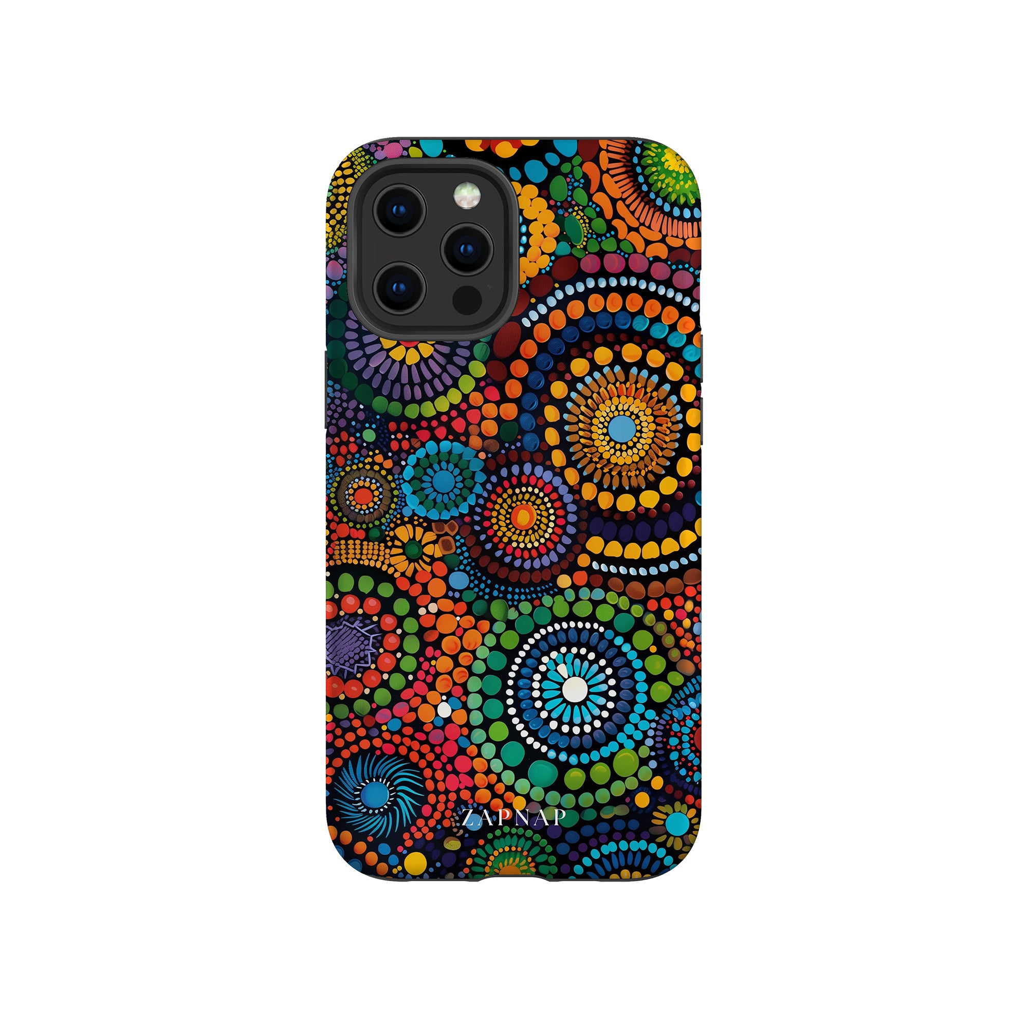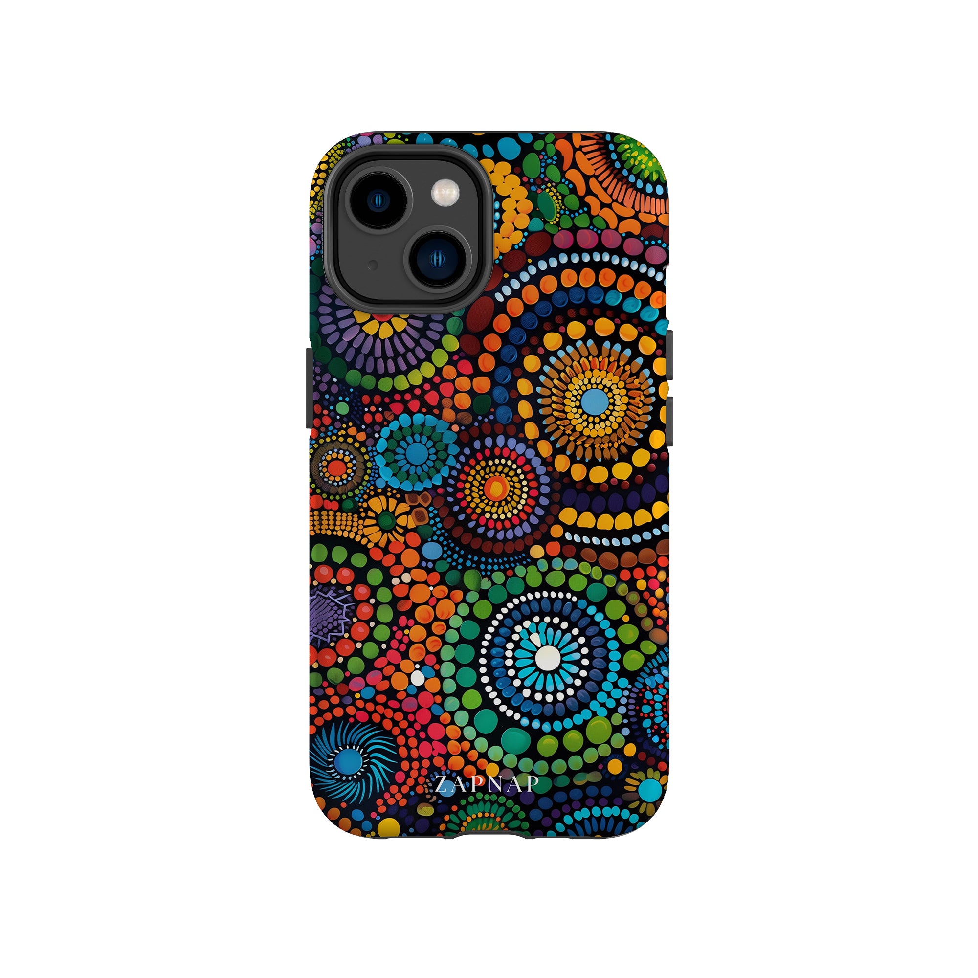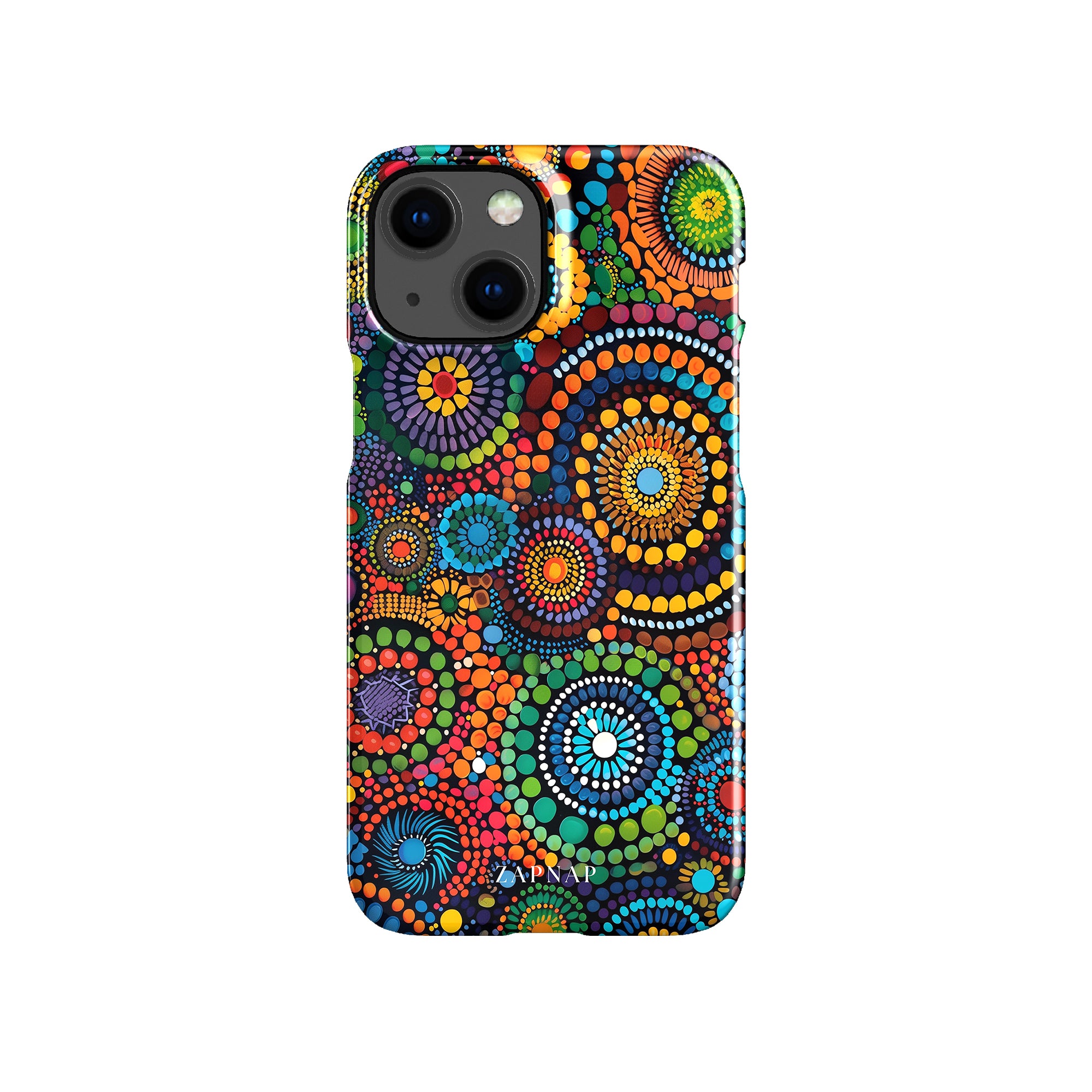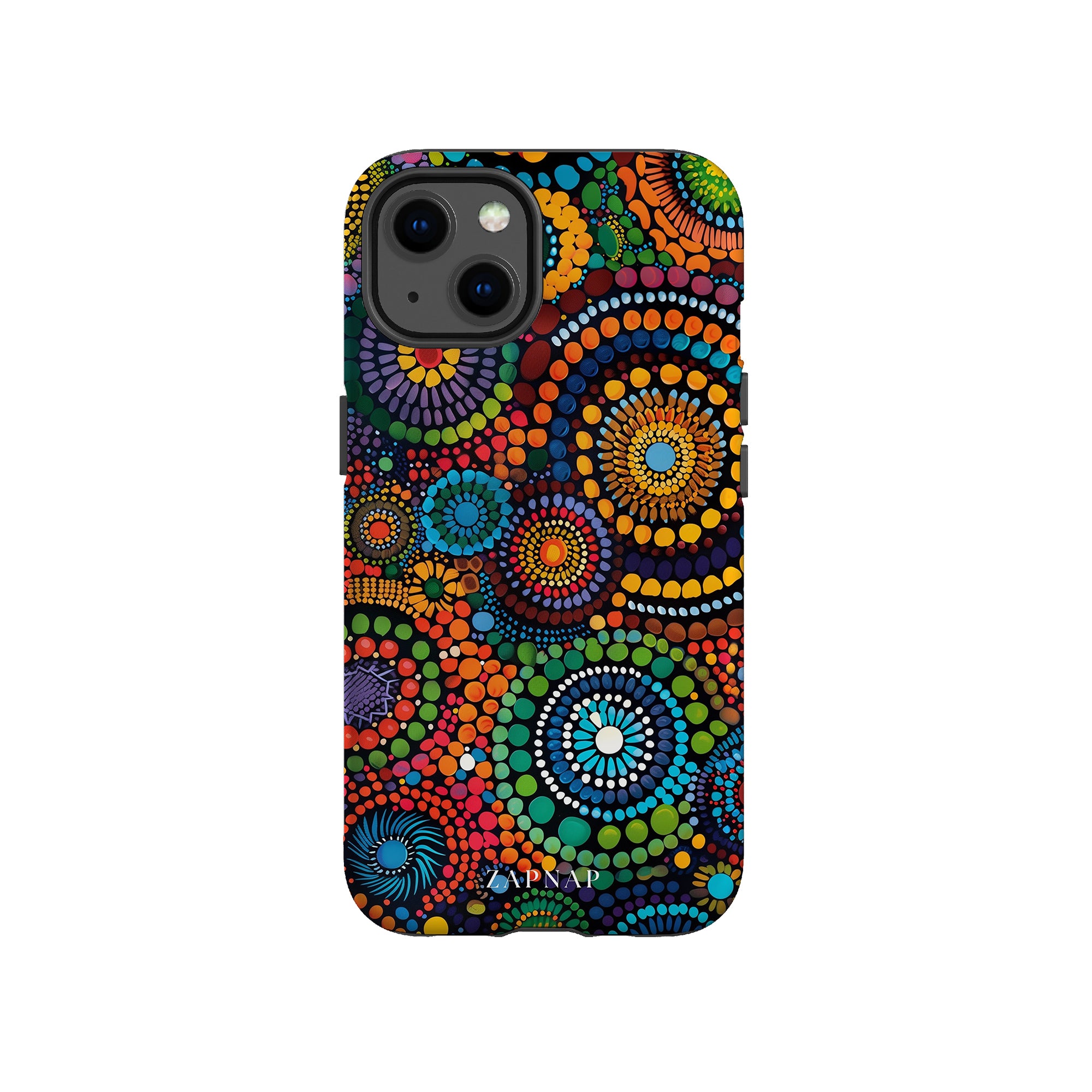 This vibrant artwork captures the energy and warmth of the sun, depicted through intricate circular patterns that radiate in a dazzling array of colours. The composition evokes the powerful connection between light, life, and the land, celebrating the essence of renewal and vitality in nature.