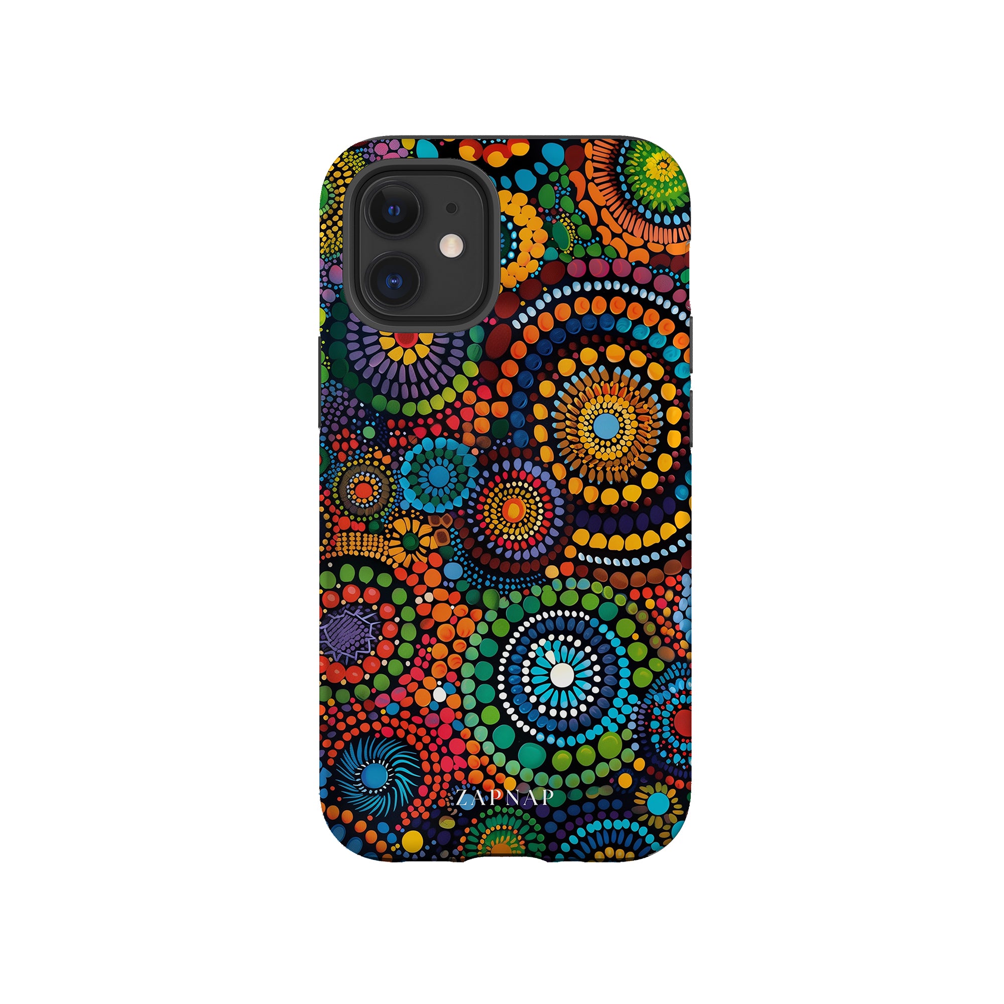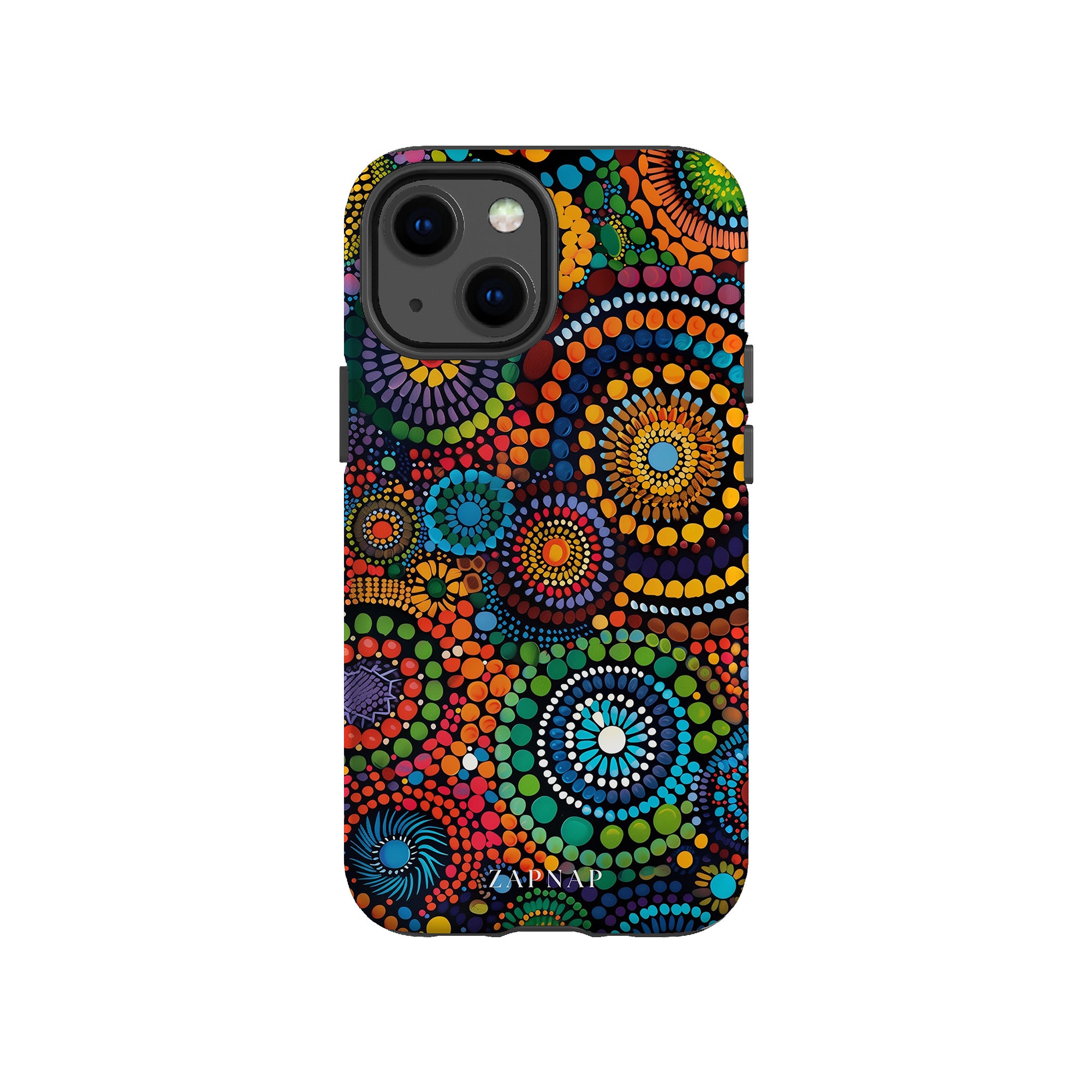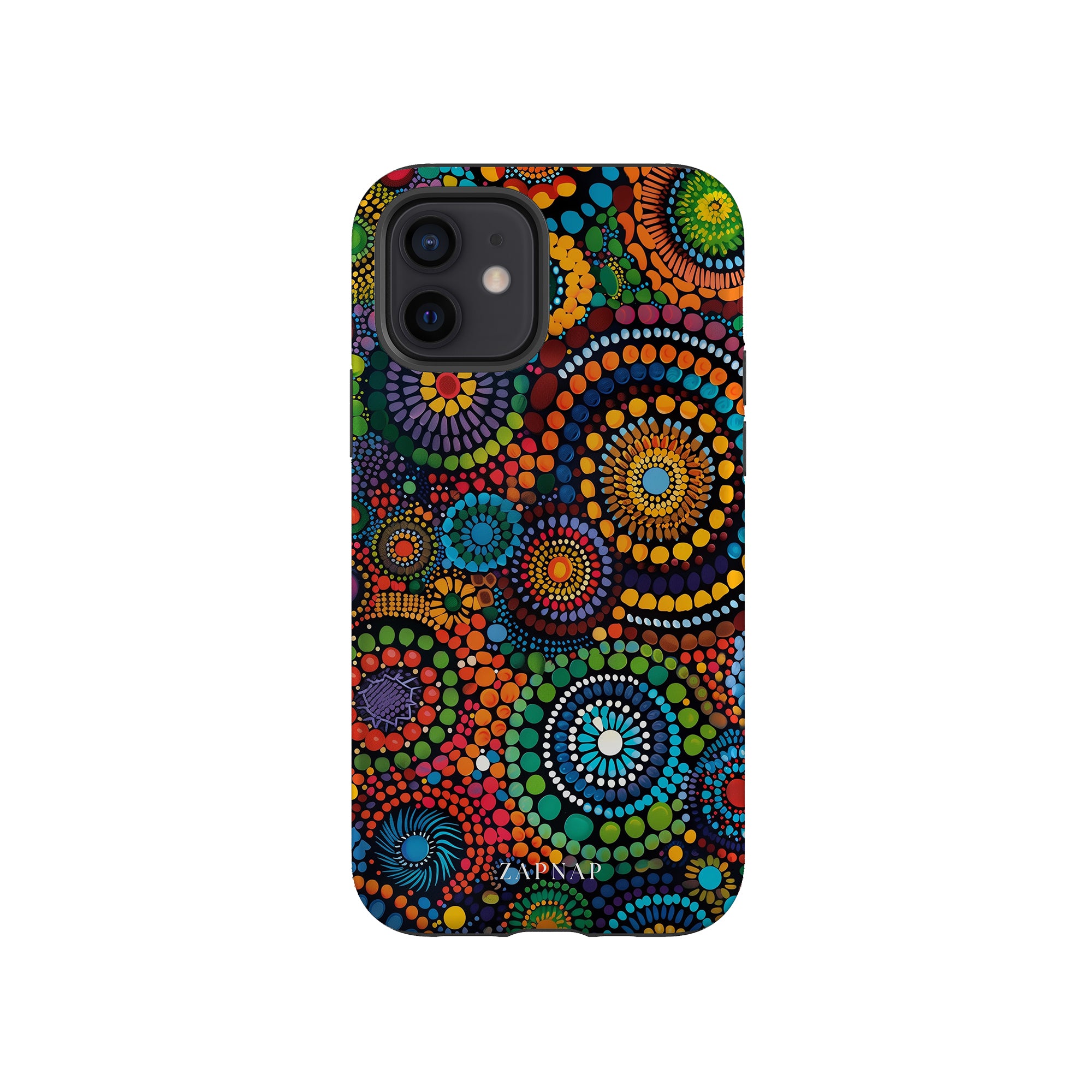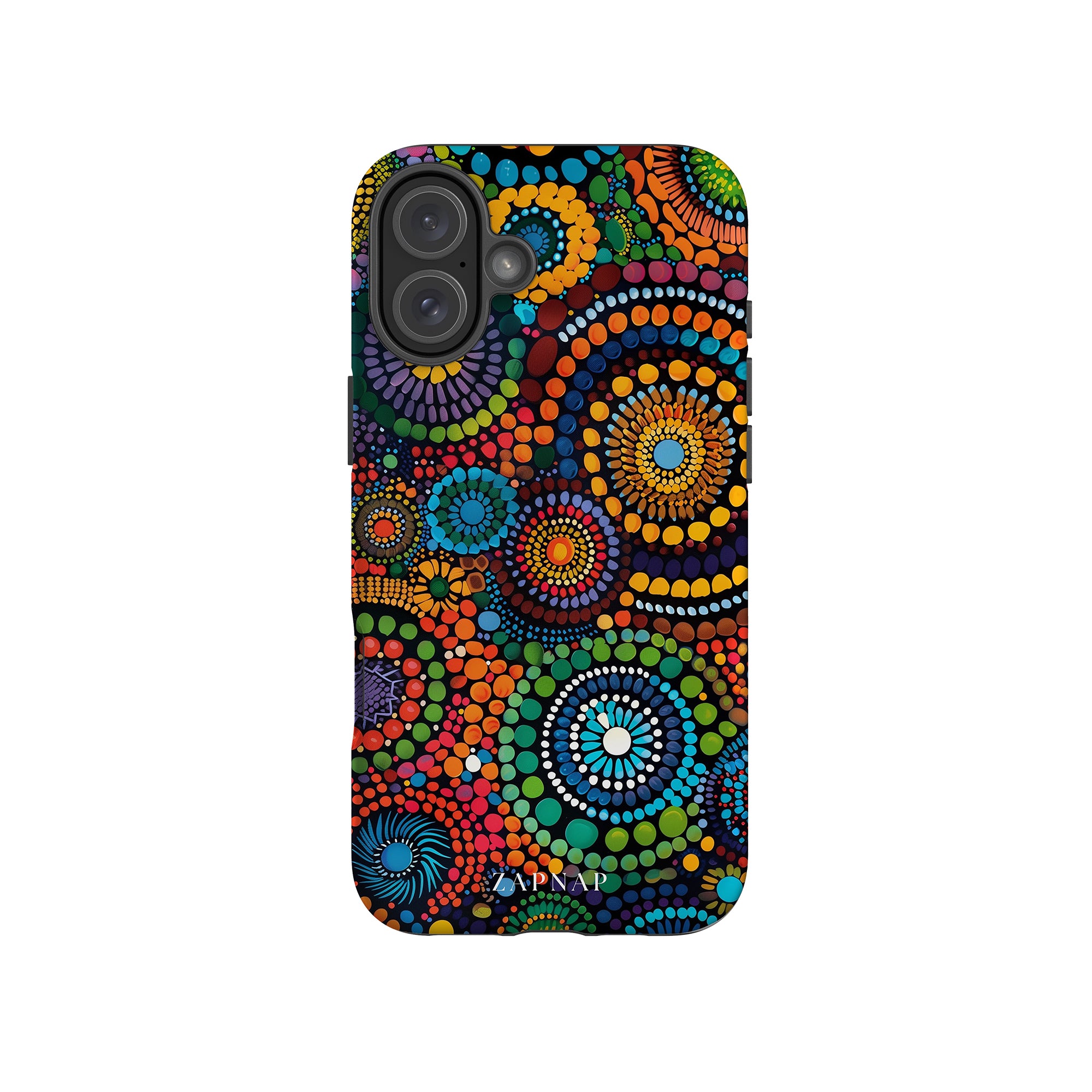 This vibrant artwork captures the energy and warmth of the sun, depicted through intricate circular patterns that radiate in a dazzling array of colours. The composition evokes the powerful connection between light, life, and the land, celebrating the essence of renewal and vitality in nature.