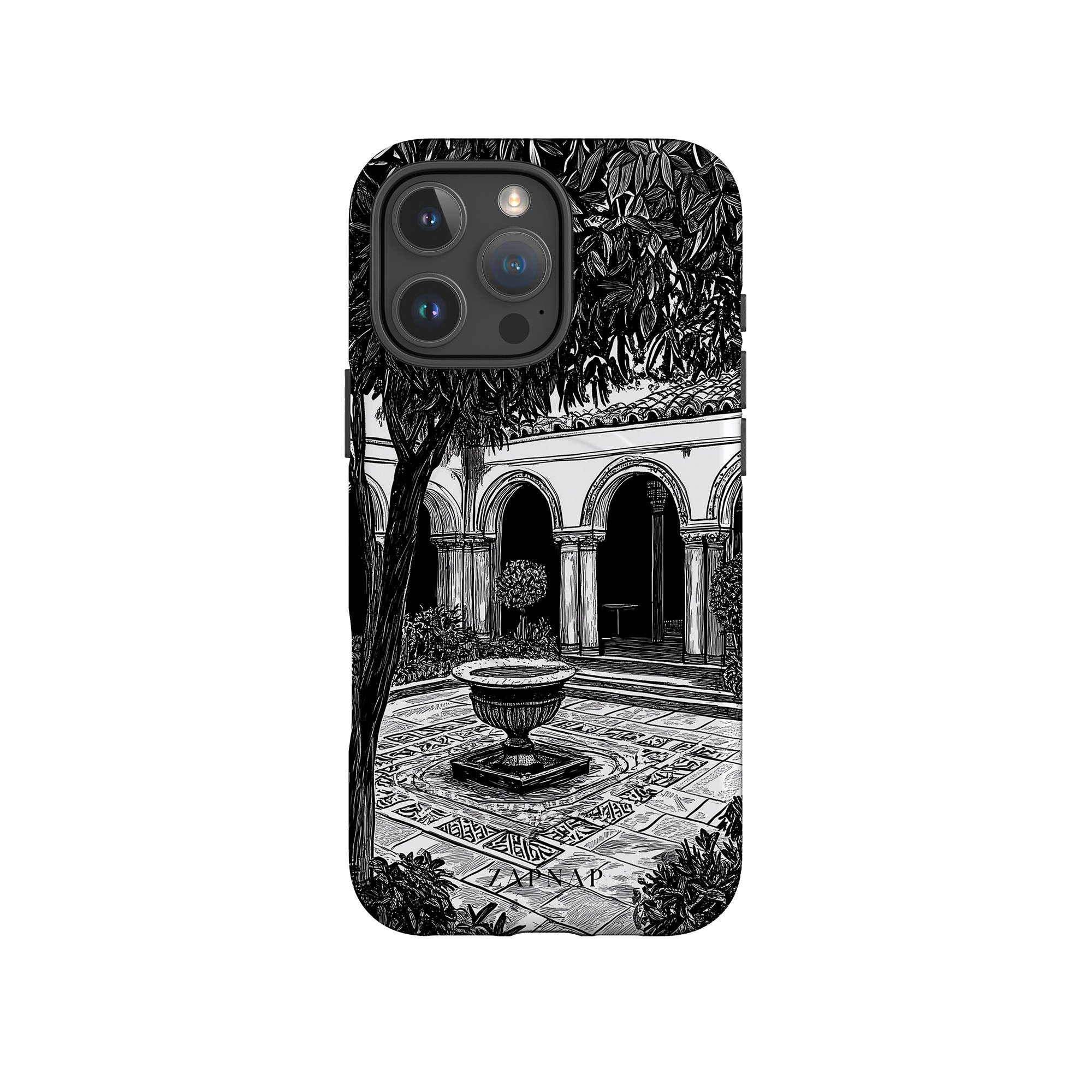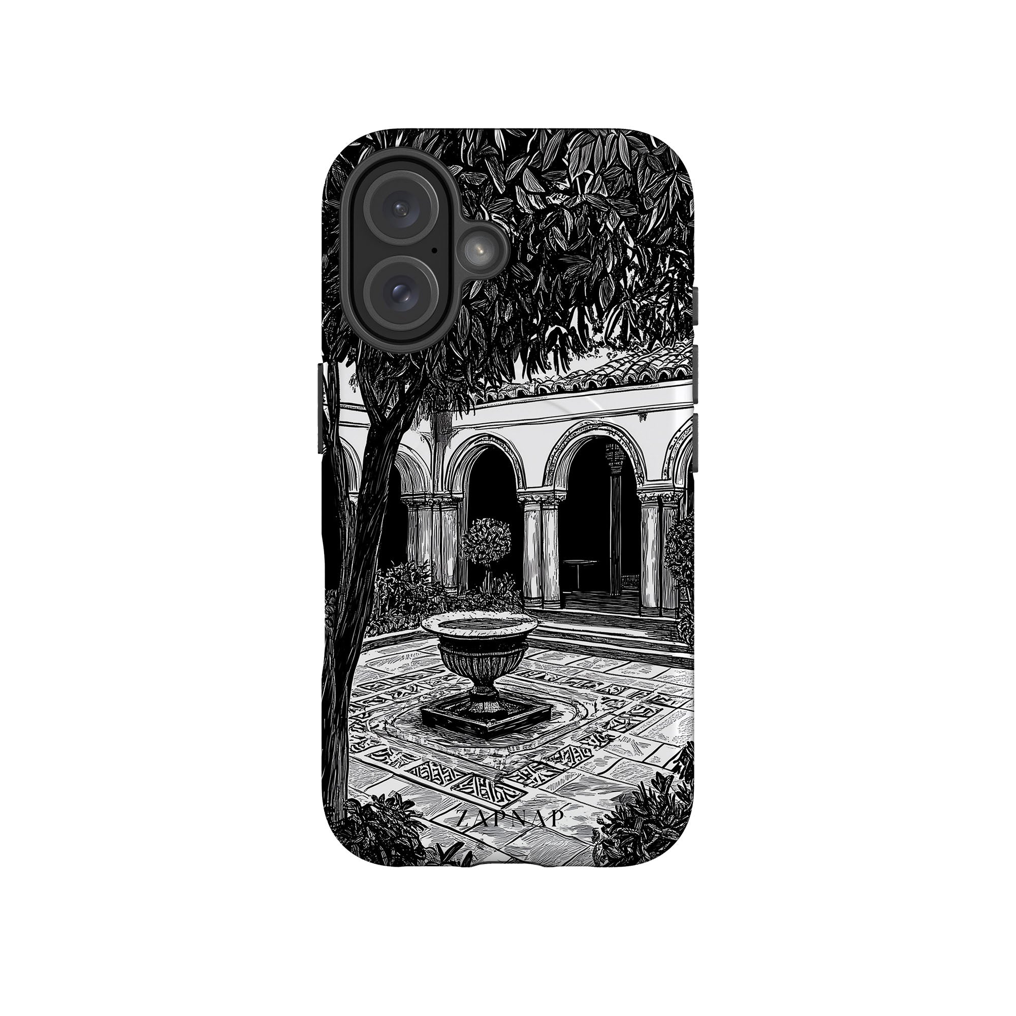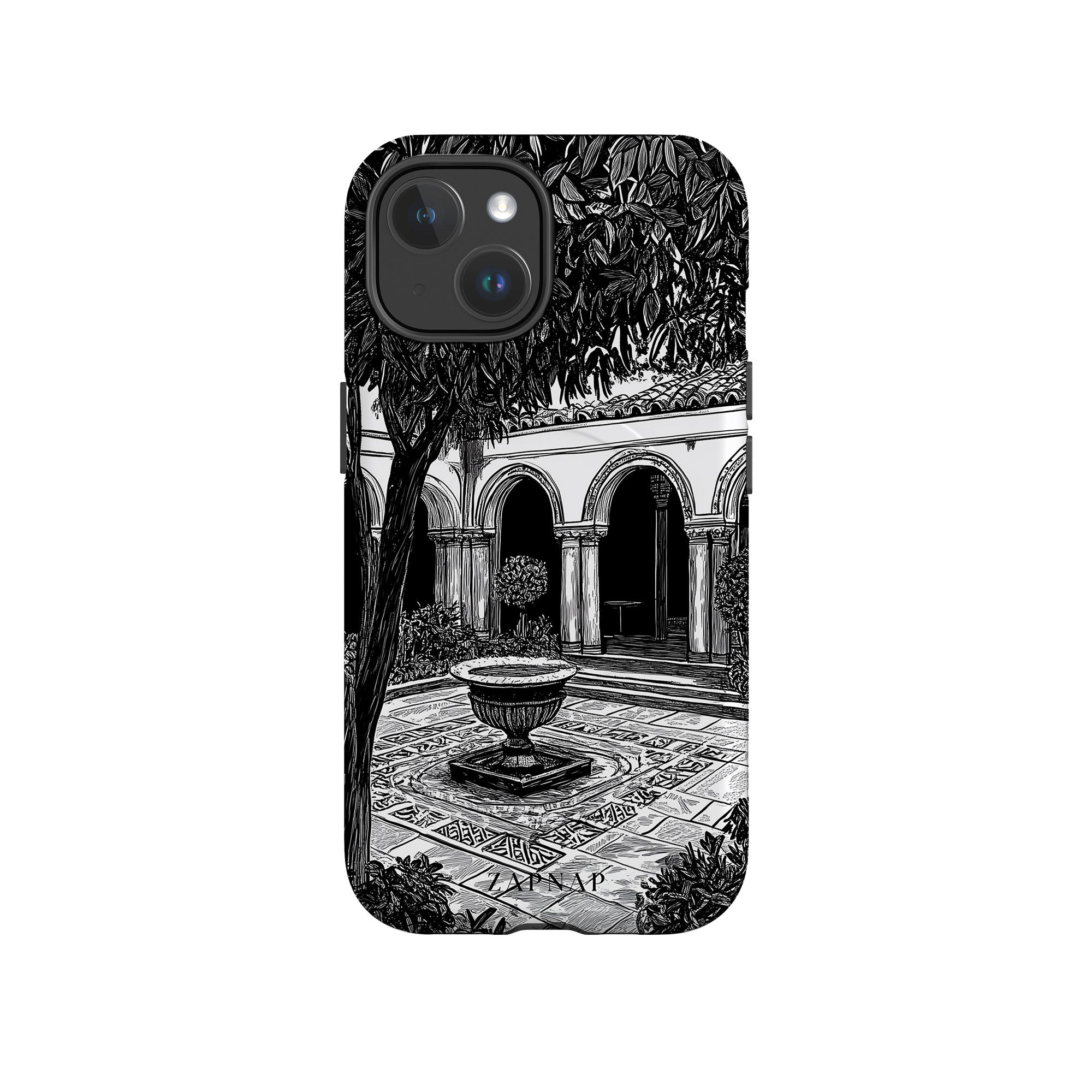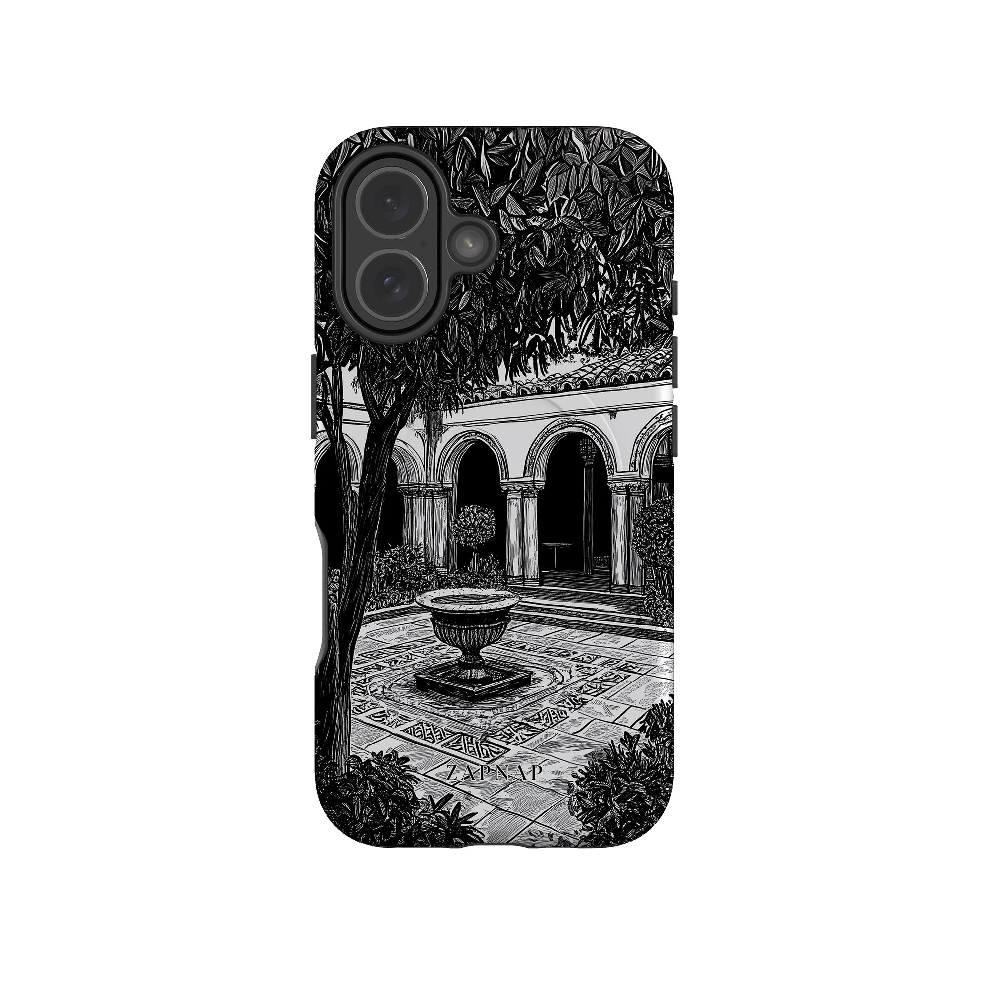 This black-and-white artwork depicts a tranquil courtyard with arched walkways, lush plants, and a central fountain. The fine line work and shadowing create a peaceful atmosphere, capturing the quiet elegance of a hidden sanctuary.