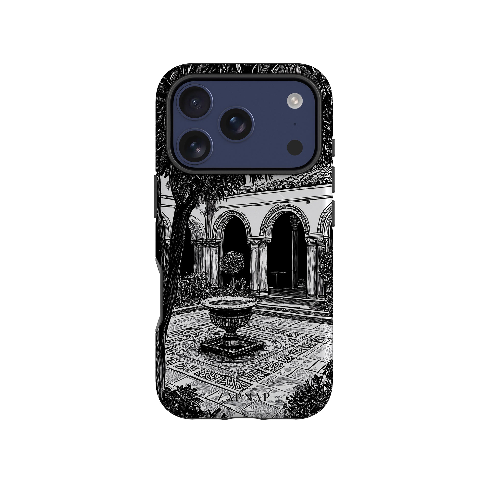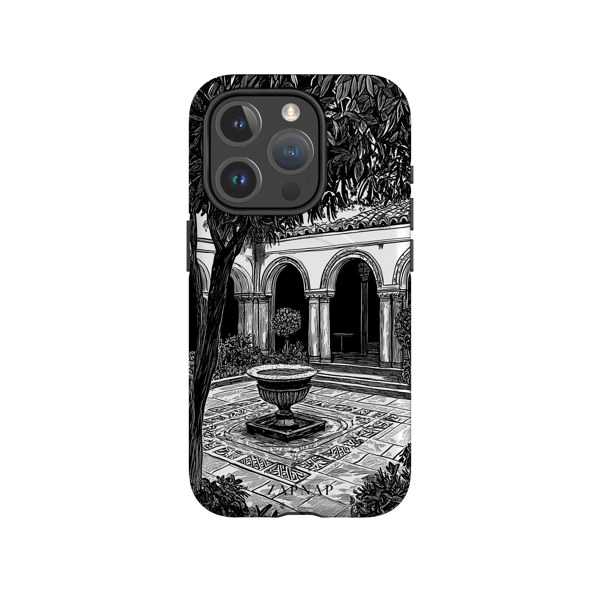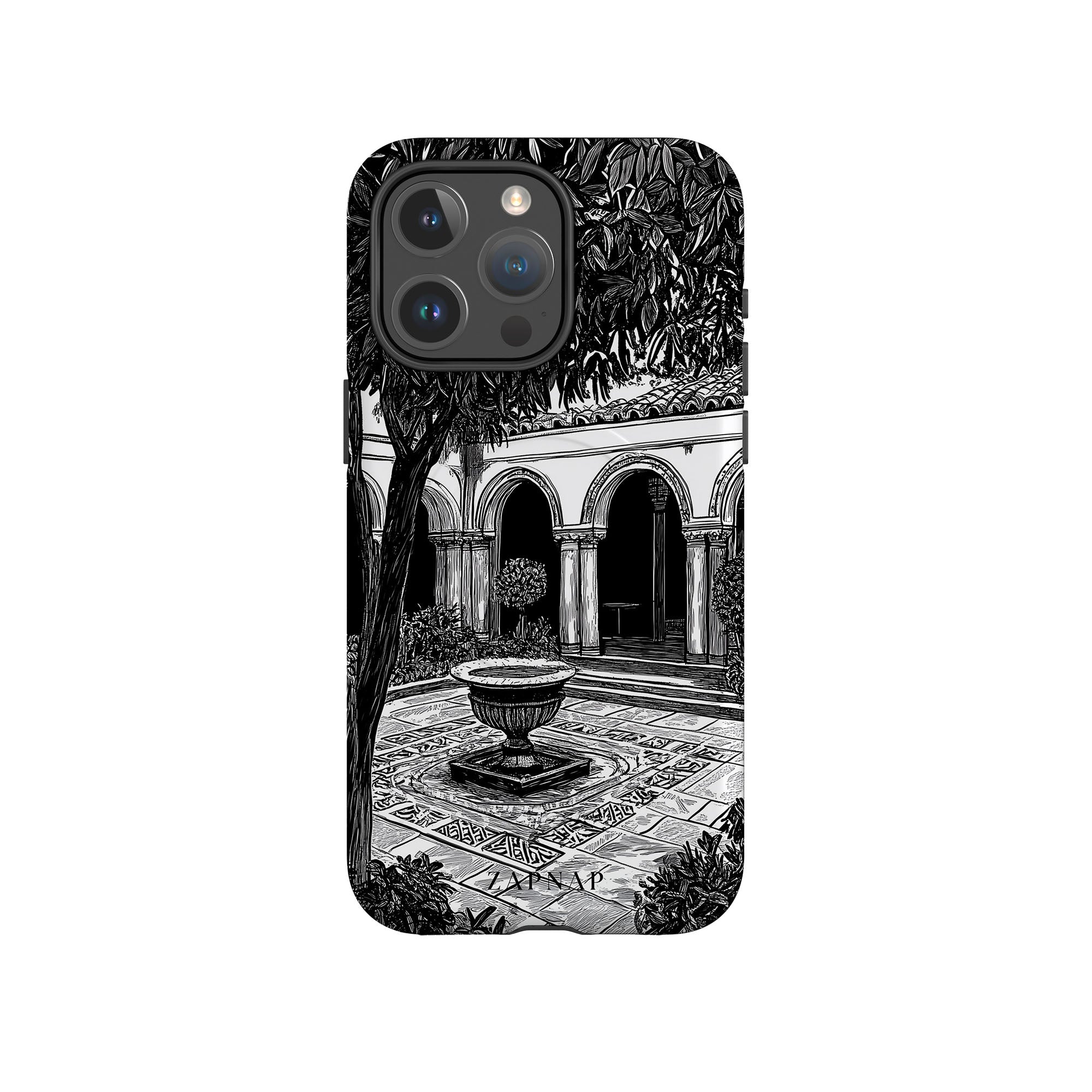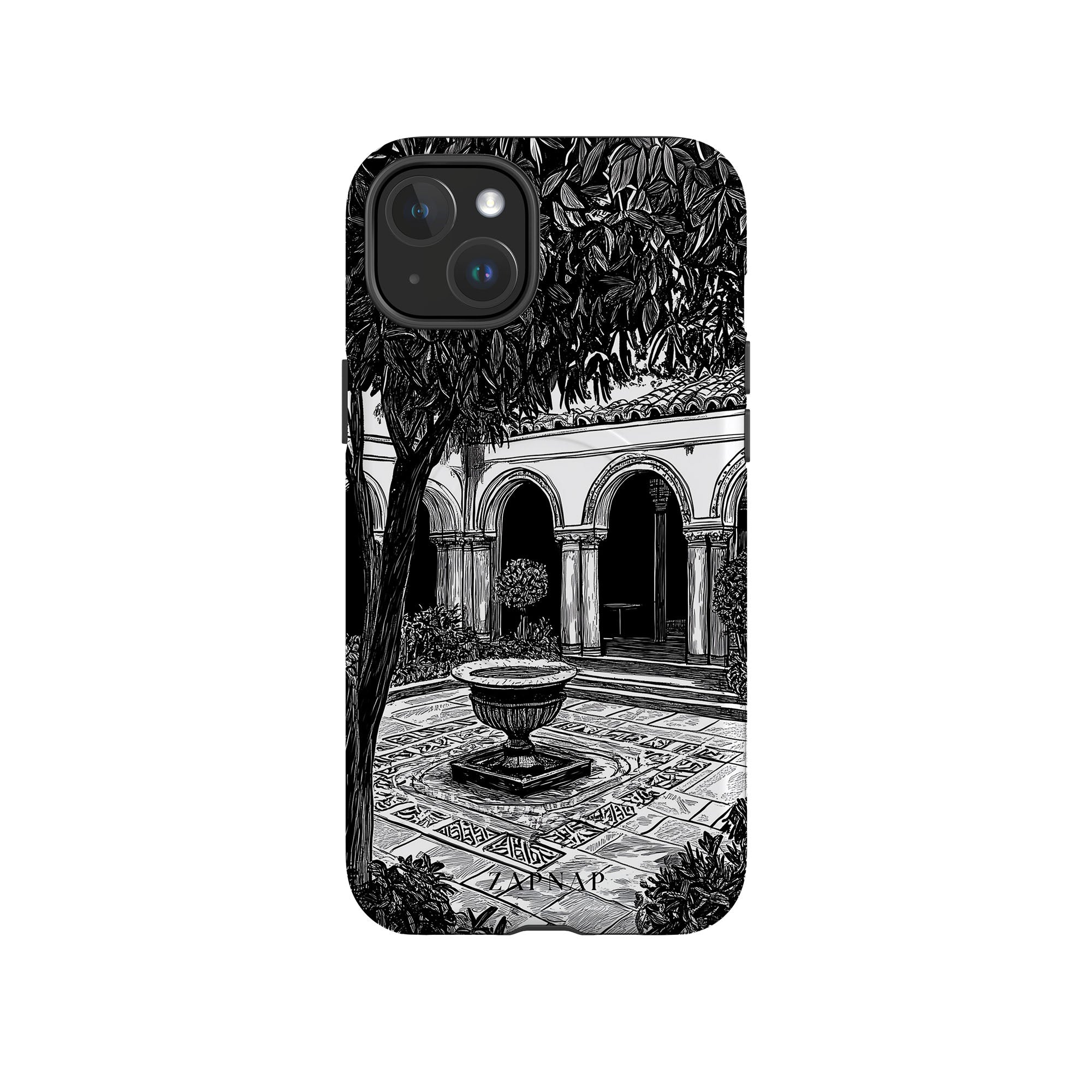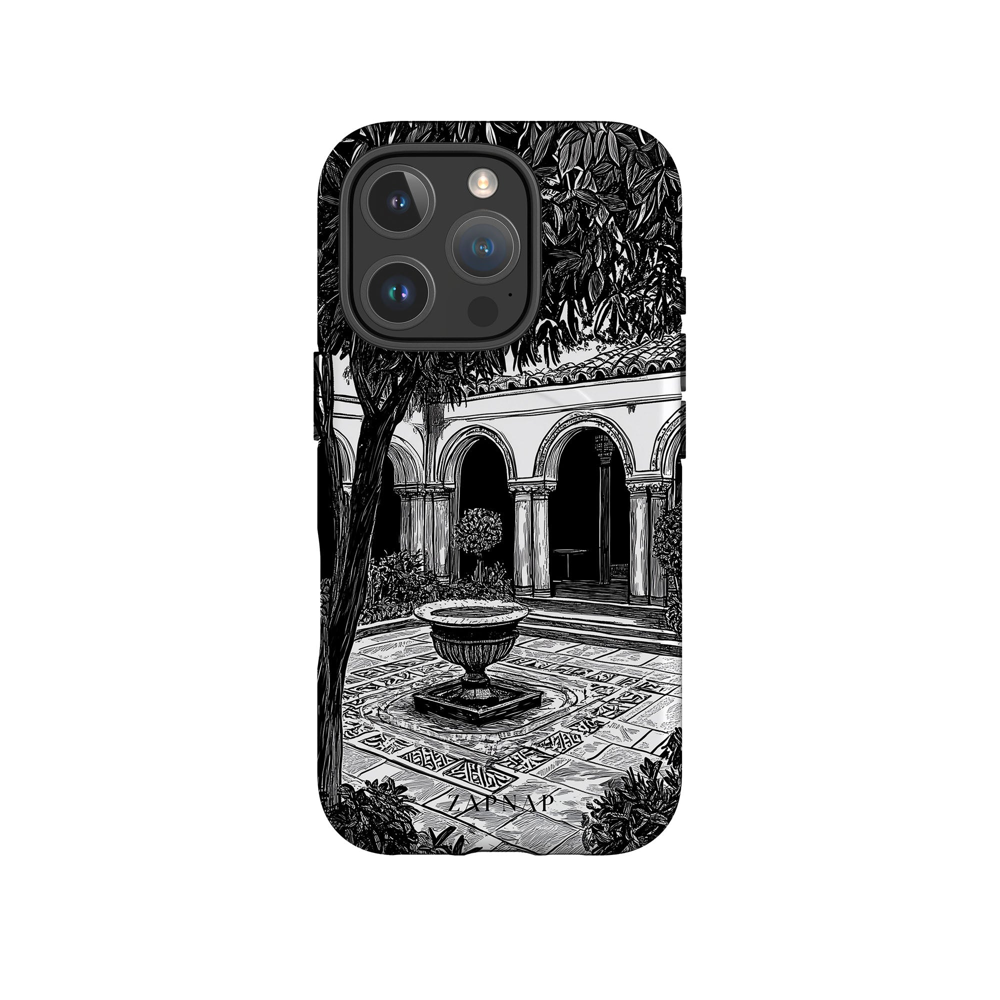 This black-and-white artwork depicts a tranquil courtyard with arched walkways, lush plants, and a central fountain. The fine line work and shadowing create a peaceful atmosphere, capturing the quiet elegance of a hidden sanctuary.