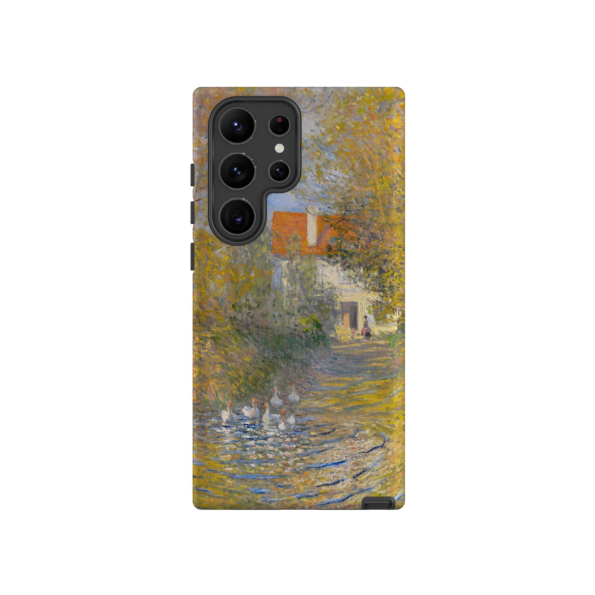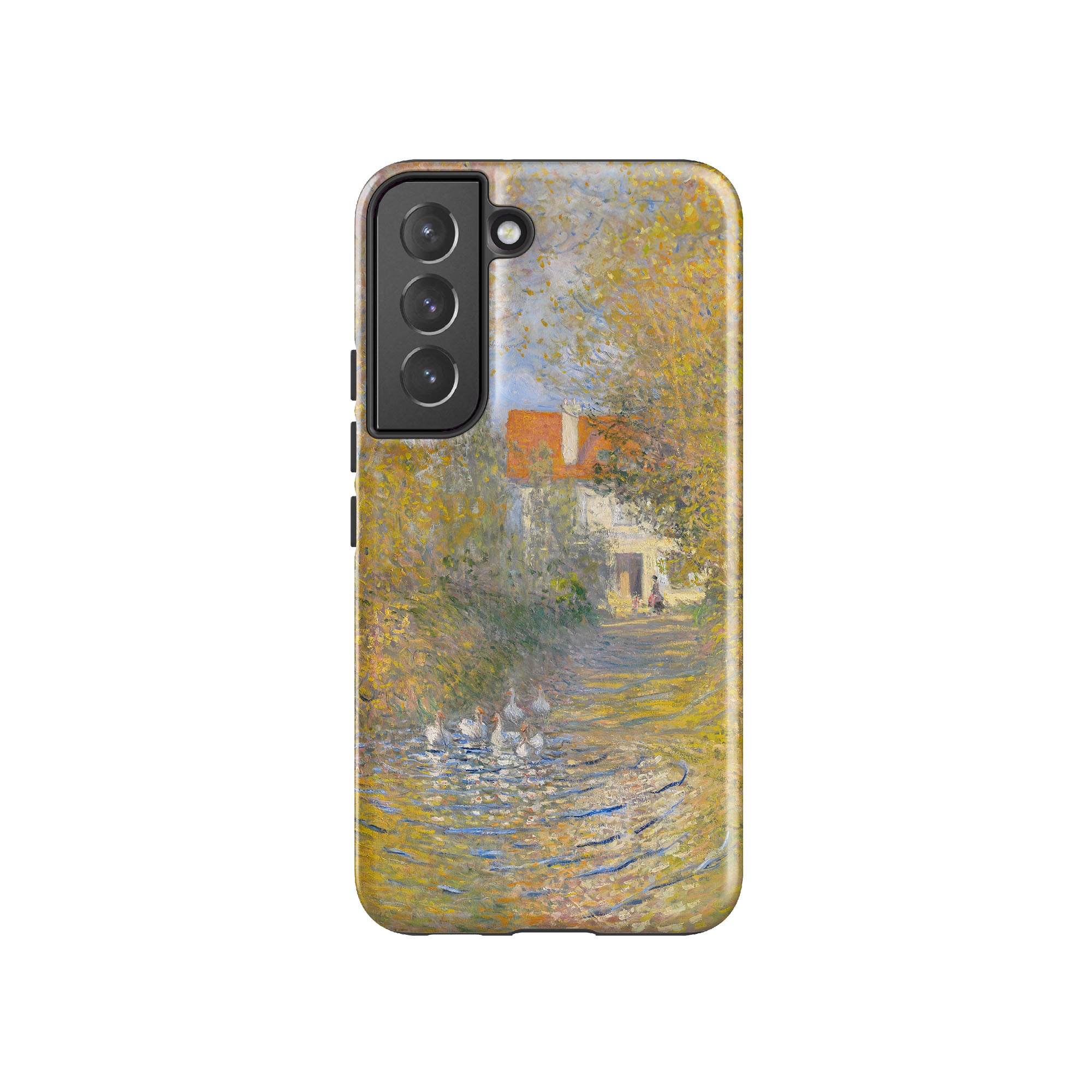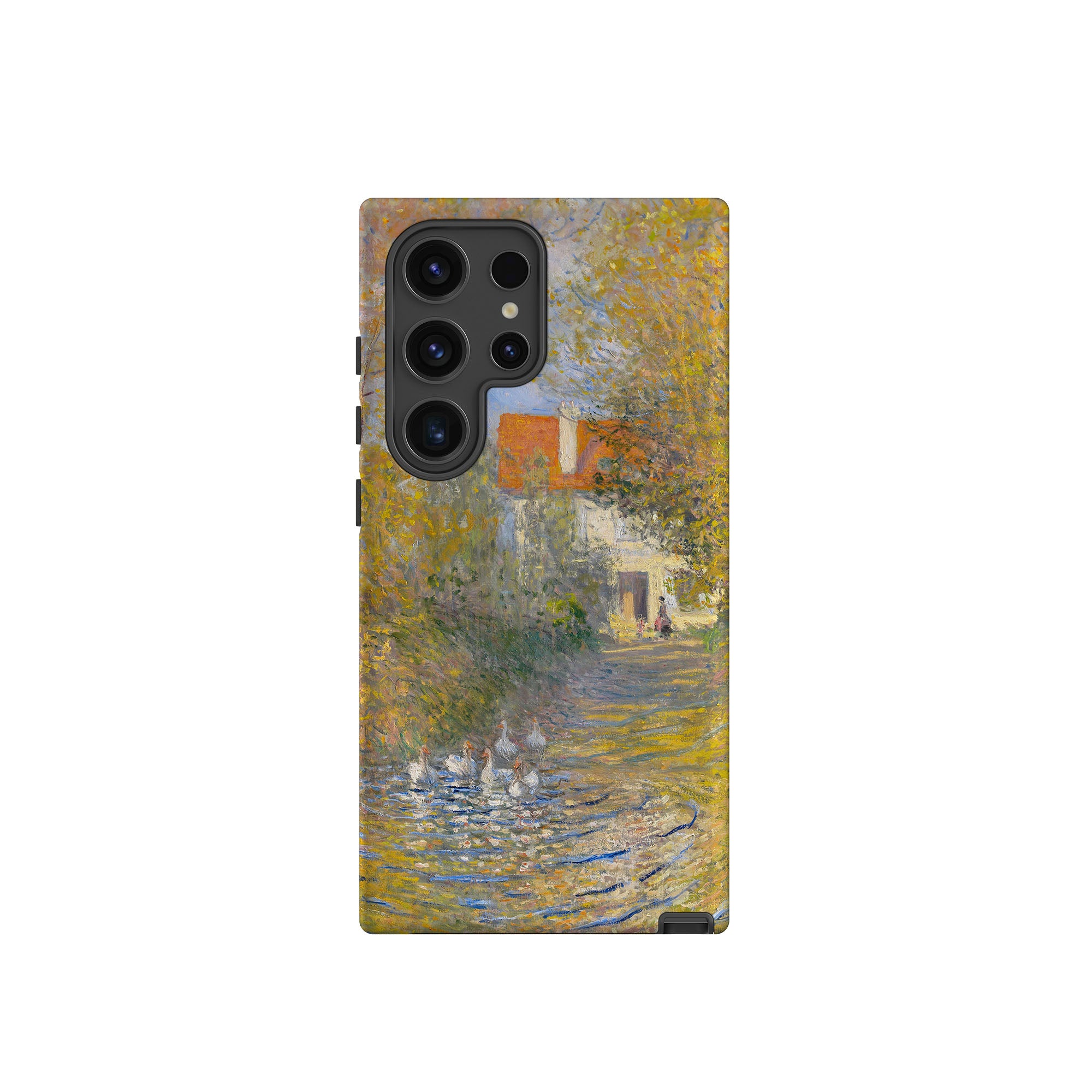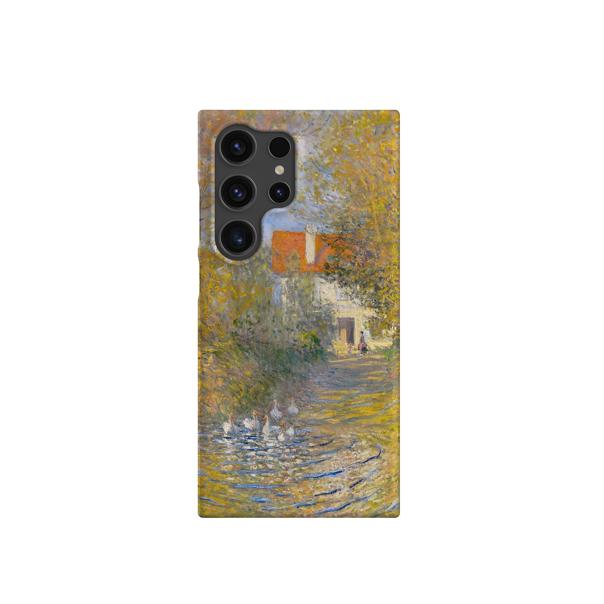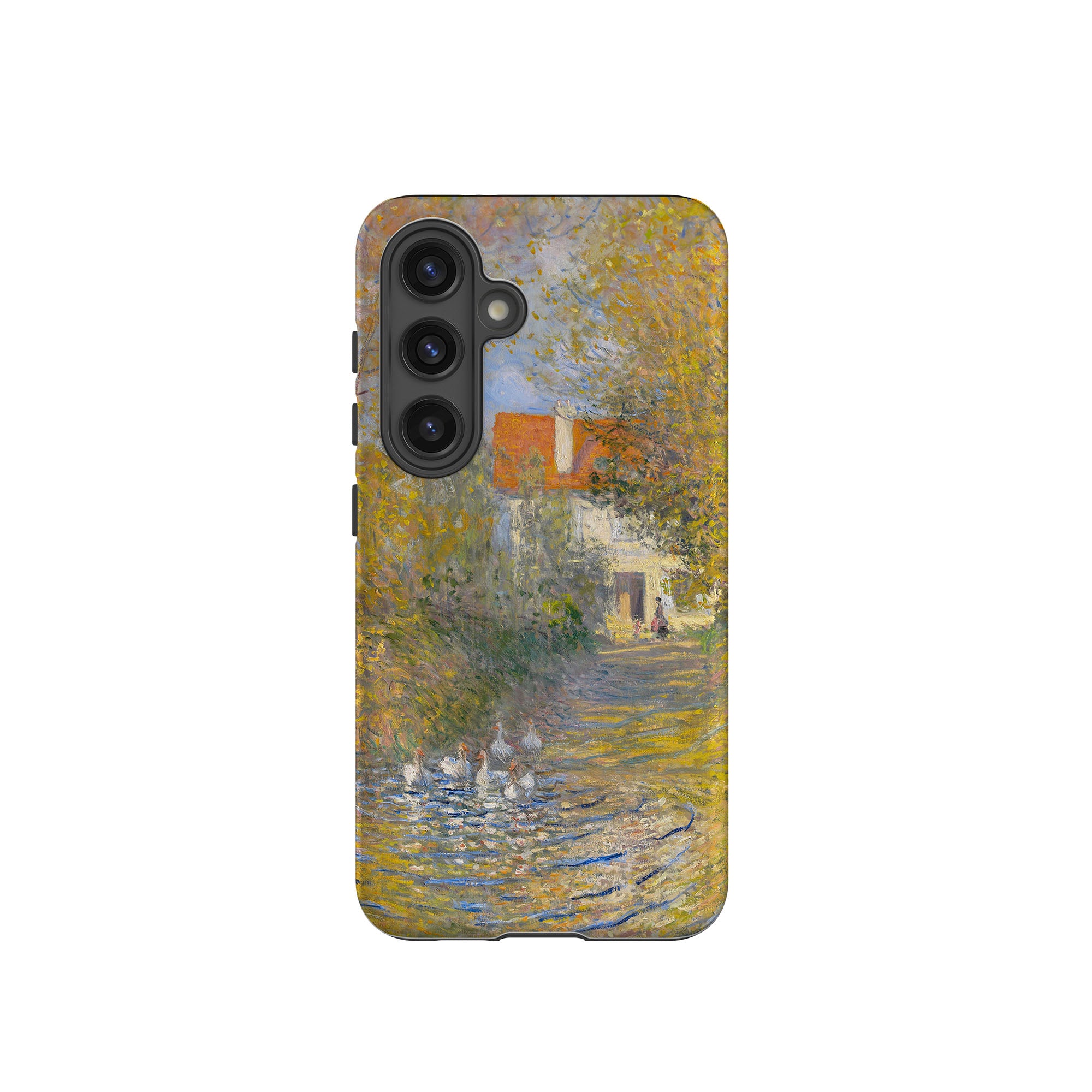 Claude Monet’s “The Geese” depicts a tranquil rural scene with geese swimming in a sunlit pond, surrounded by lush autumn foliage. The soft brushstrokes and warm colors create a peaceful, idyllic atmosphere, capturing the beauty of nature and the serenity of countryside life.