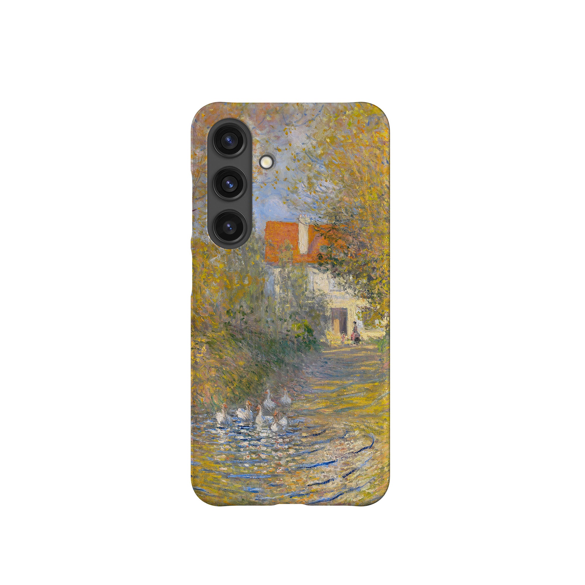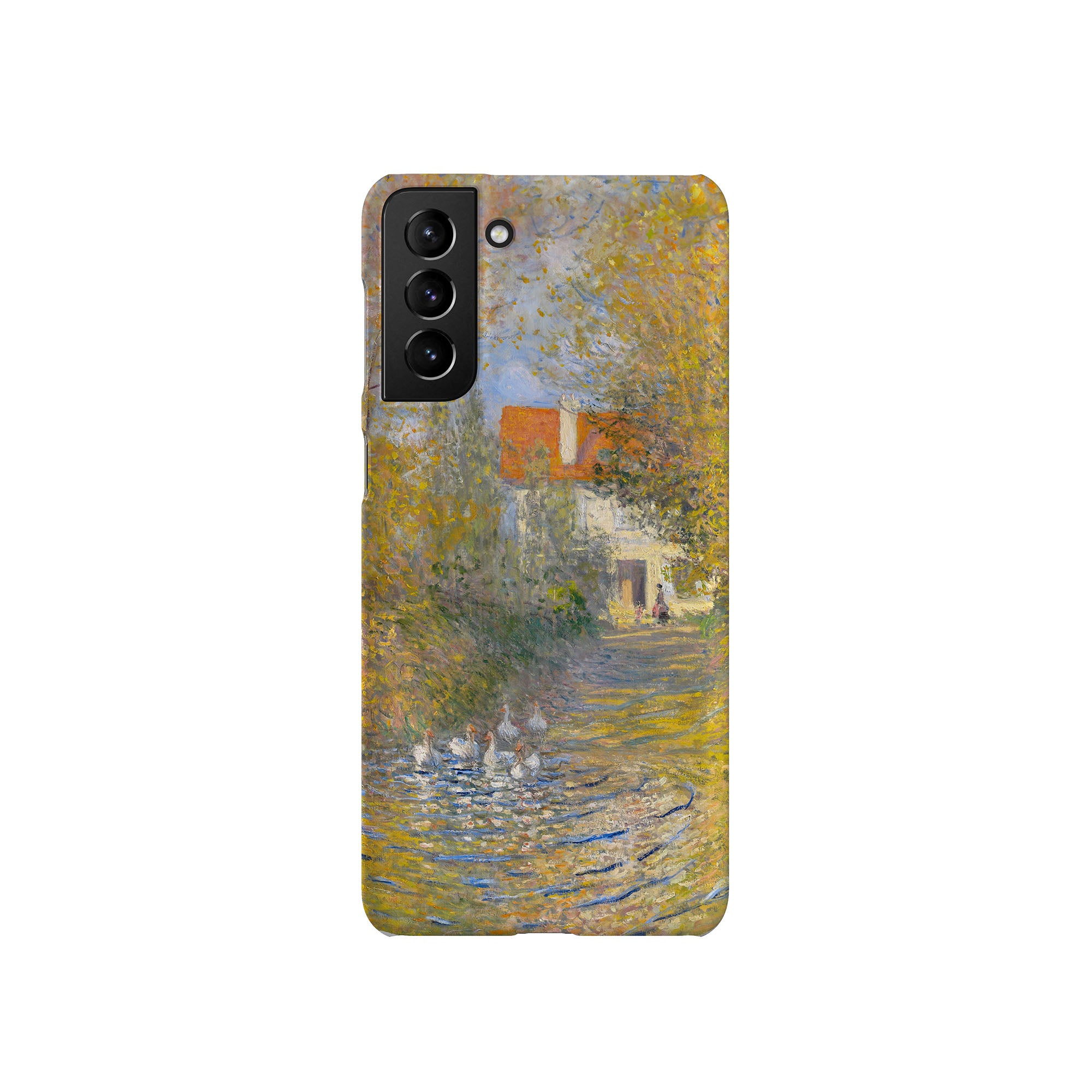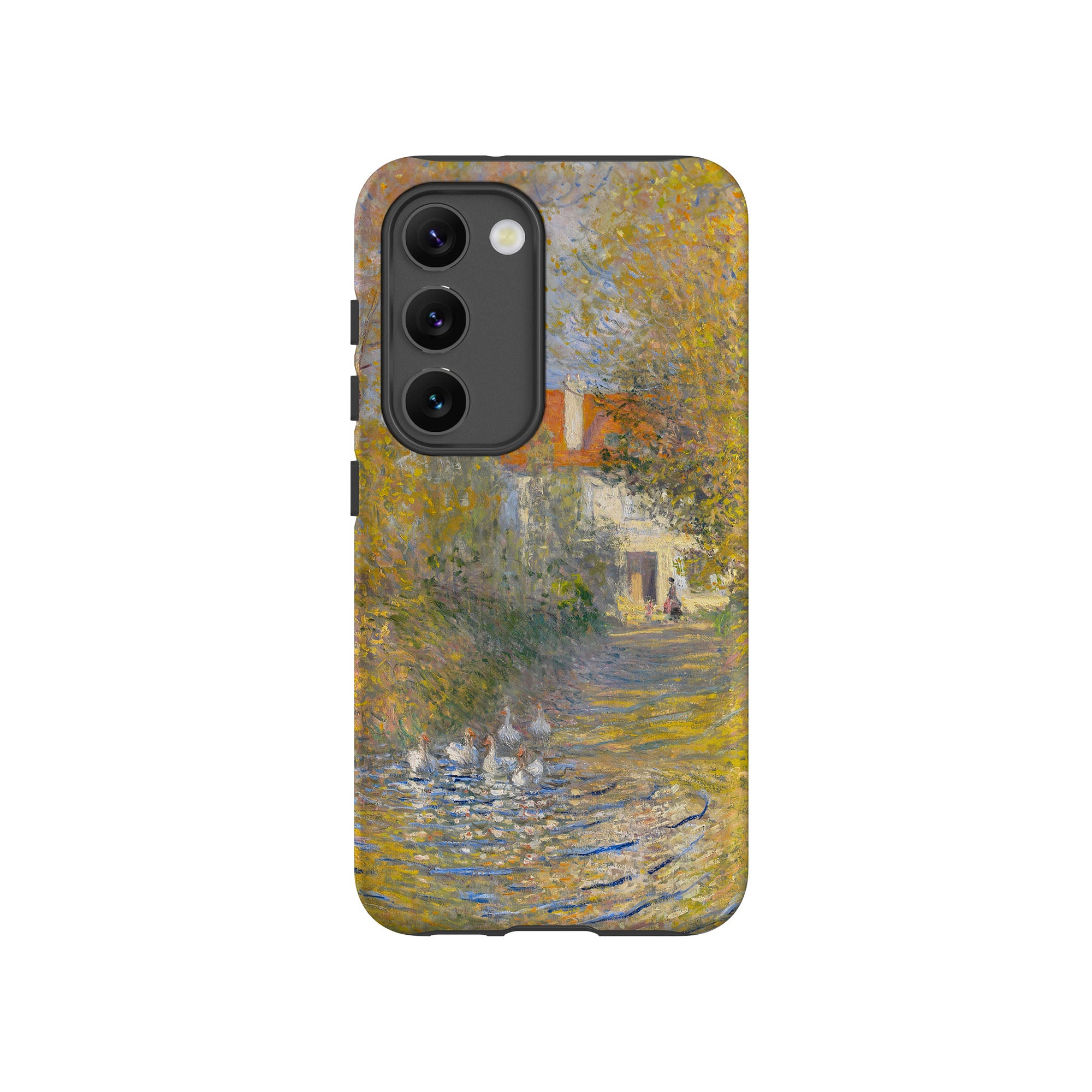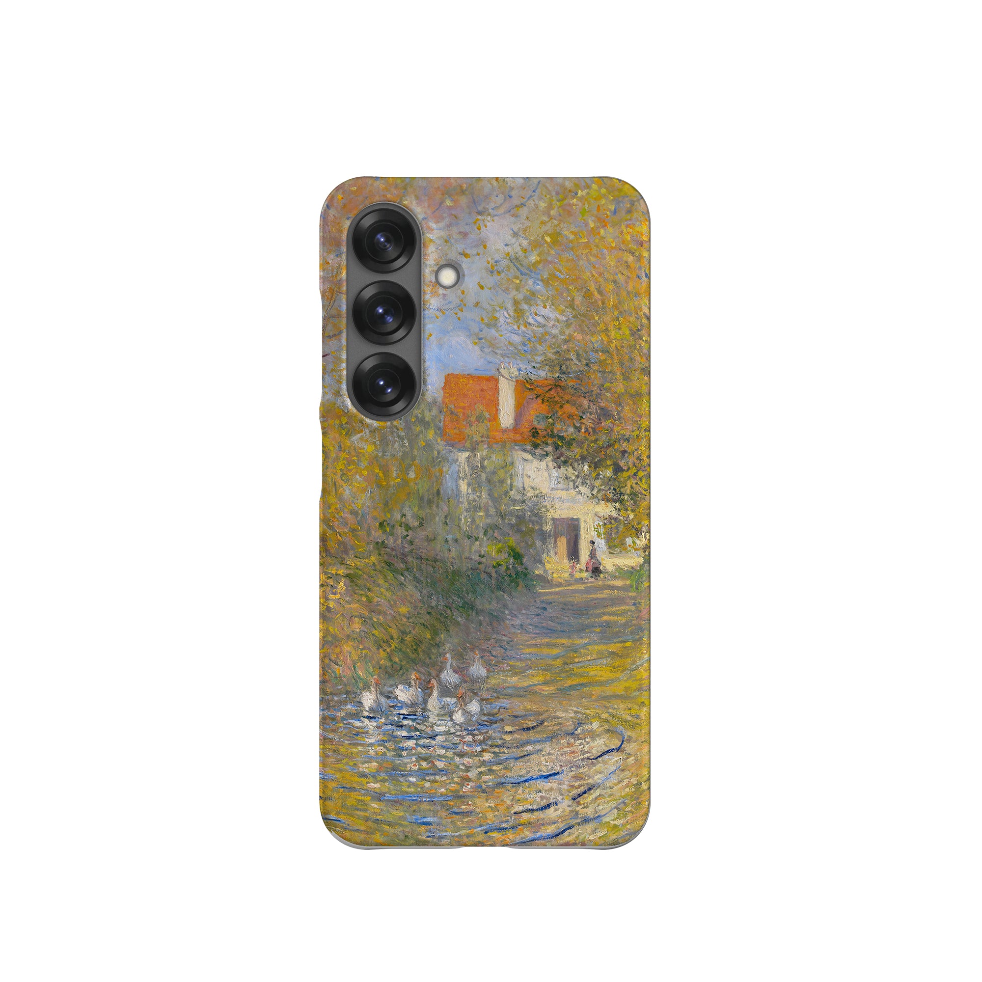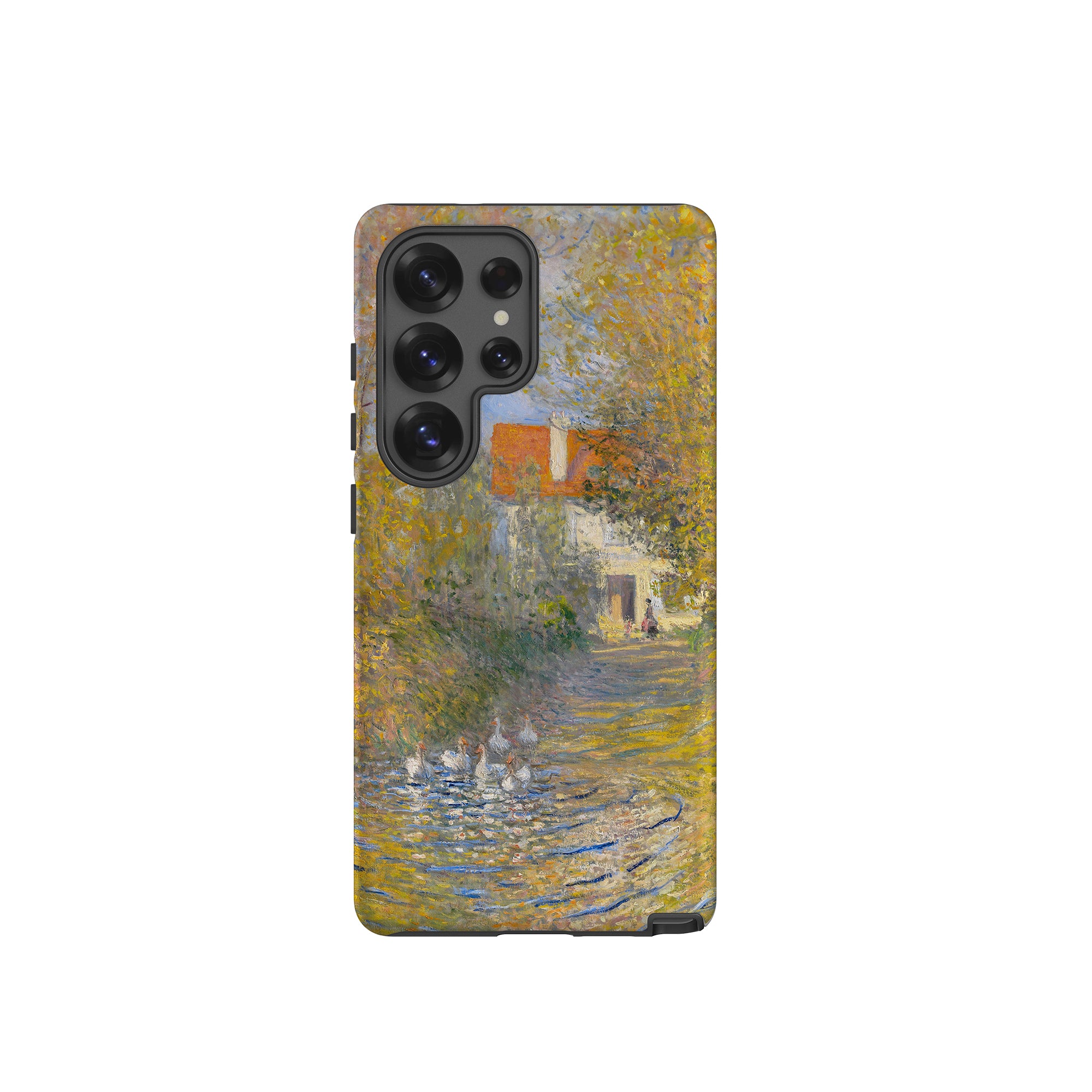 Claude Monet’s “The Geese” depicts a tranquil rural scene with geese swimming in a sunlit pond, surrounded by lush autumn foliage. The soft brushstrokes and warm colors create a peaceful, idyllic atmosphere, capturing the beauty of nature and the serenity of countryside life.