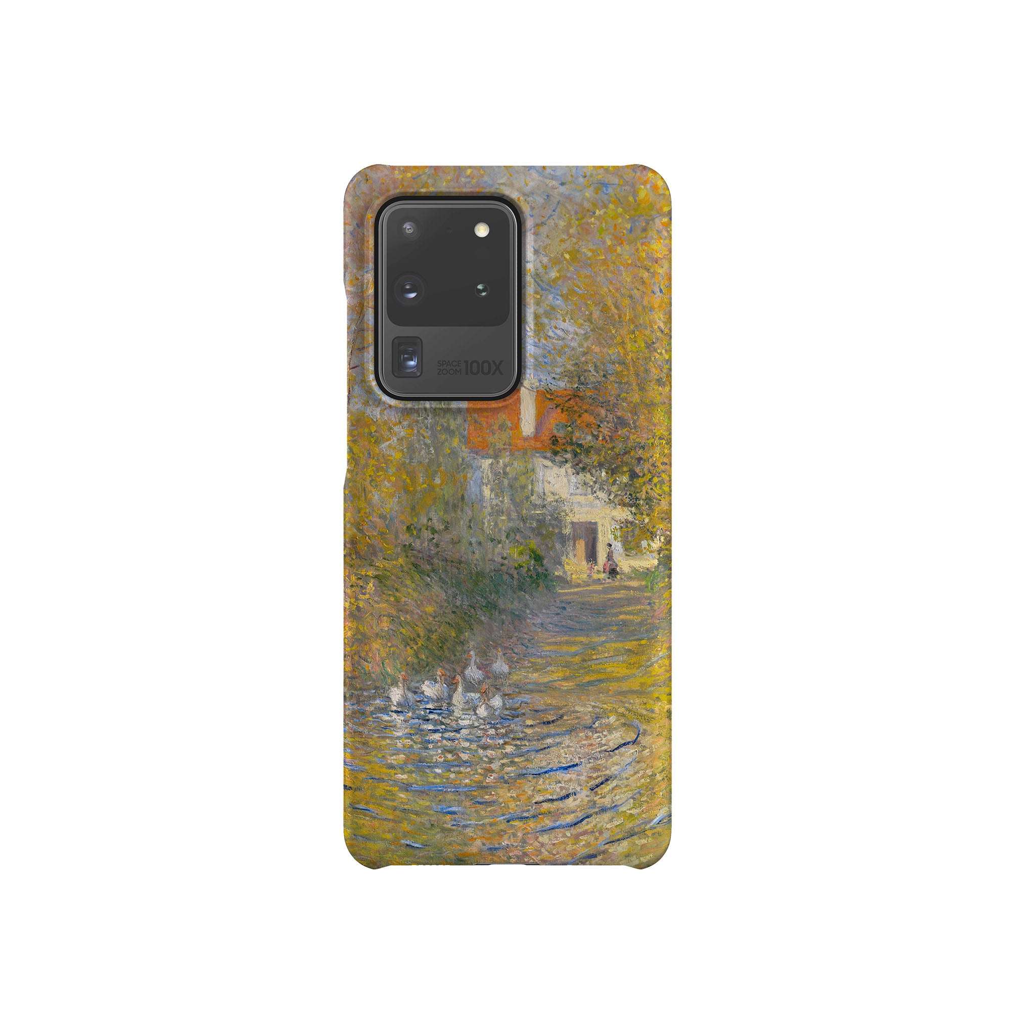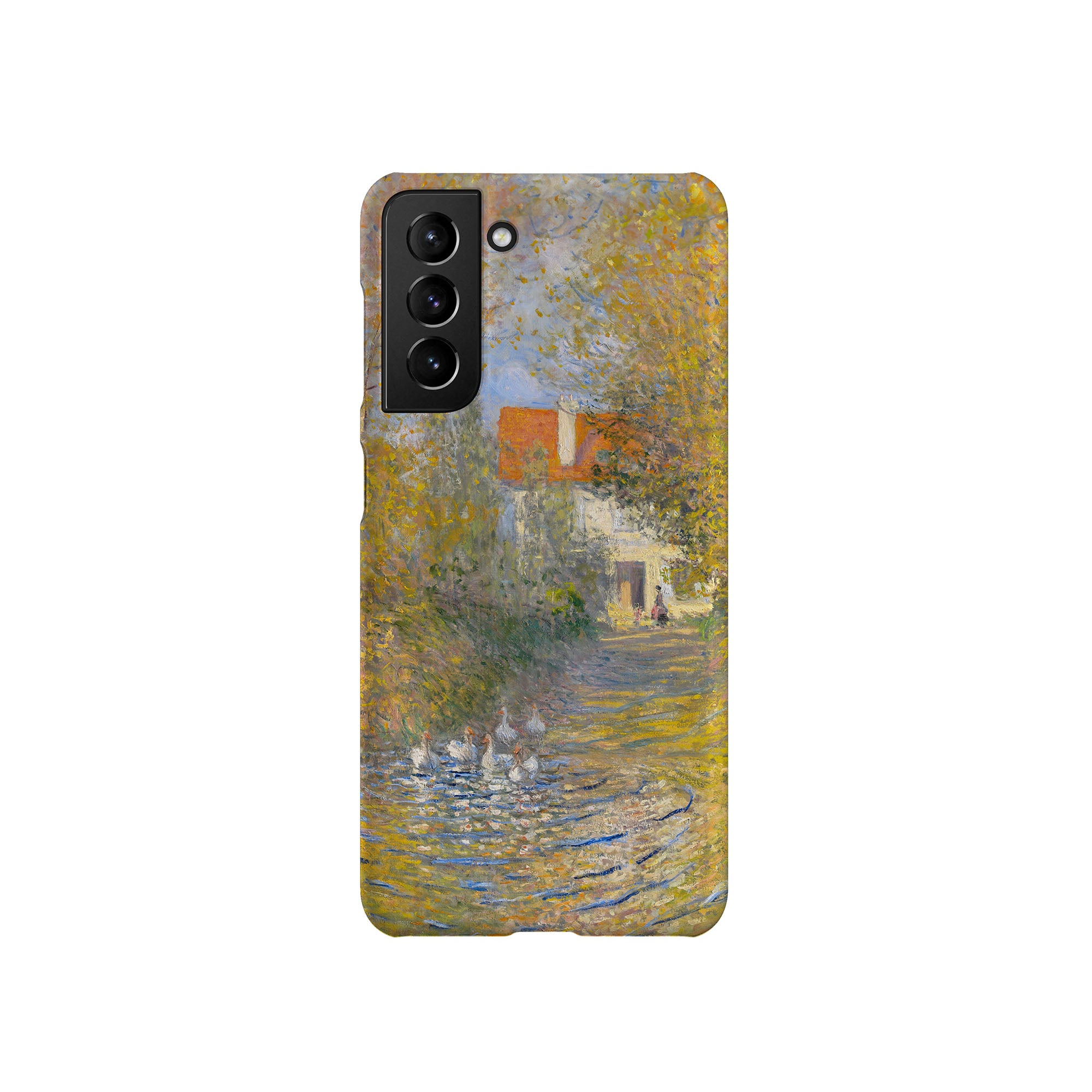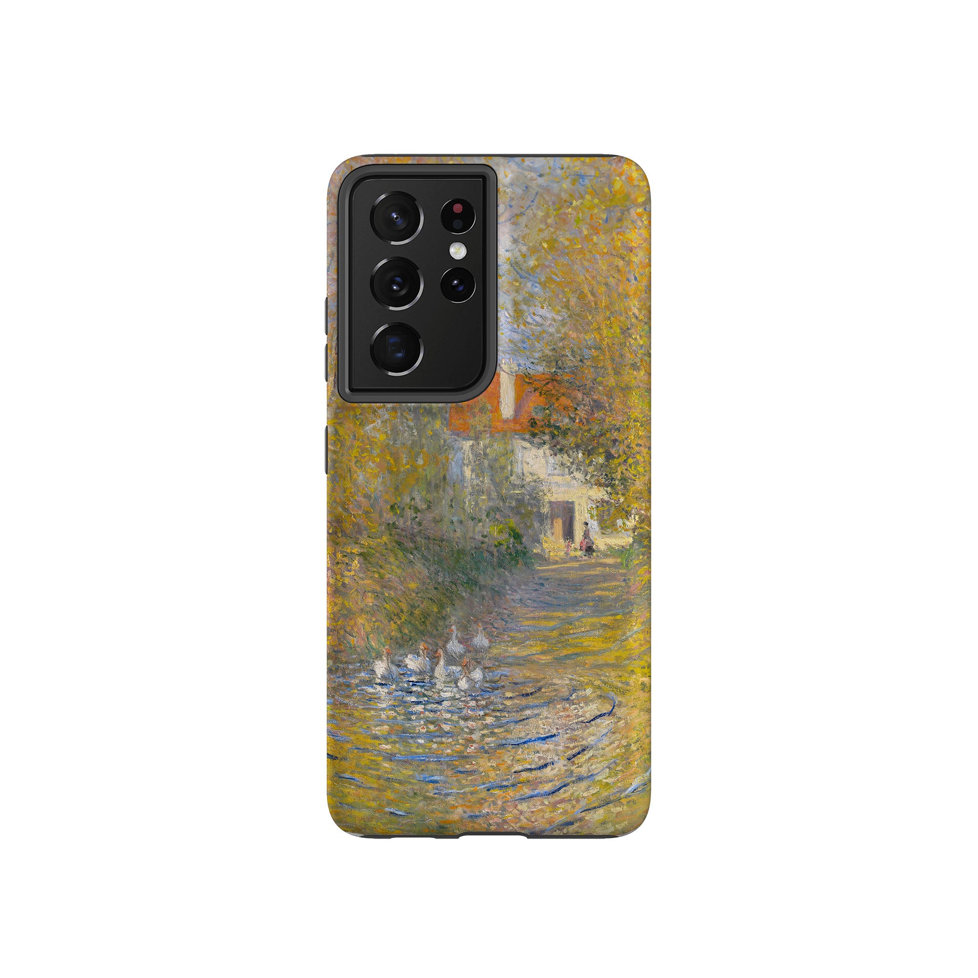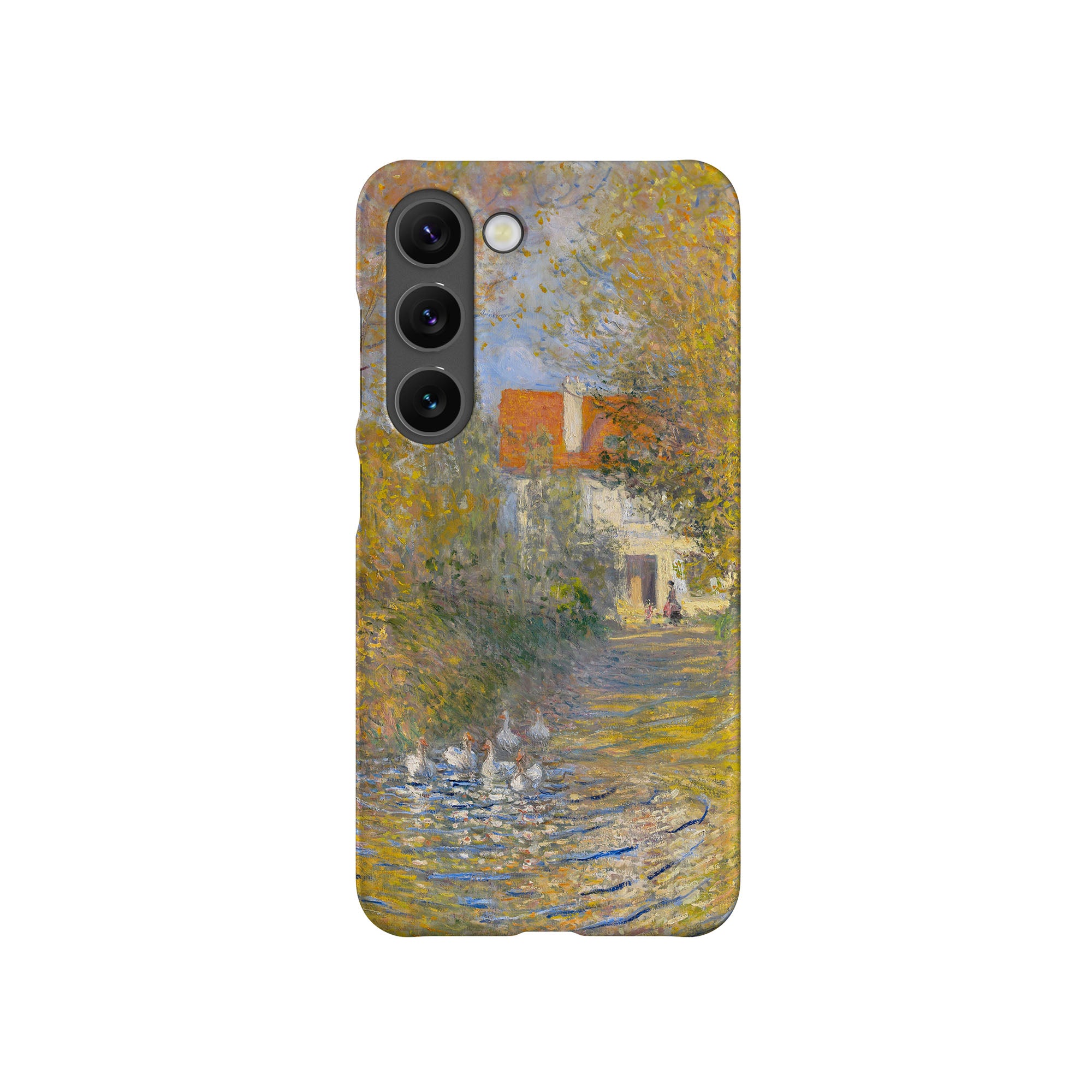 Claude Monet’s “The Geese” depicts a tranquil rural scene with geese swimming in a sunlit pond, surrounded by lush autumn foliage. The soft brushstrokes and warm colors create a peaceful, idyllic atmosphere, capturing the beauty of nature and the serenity of countryside life.