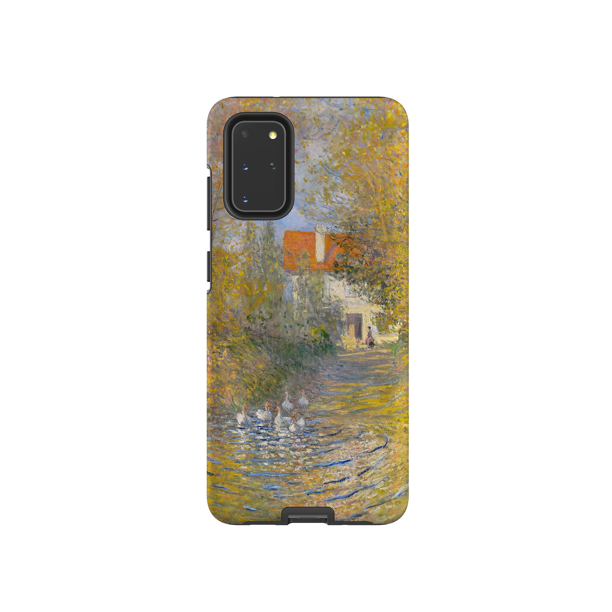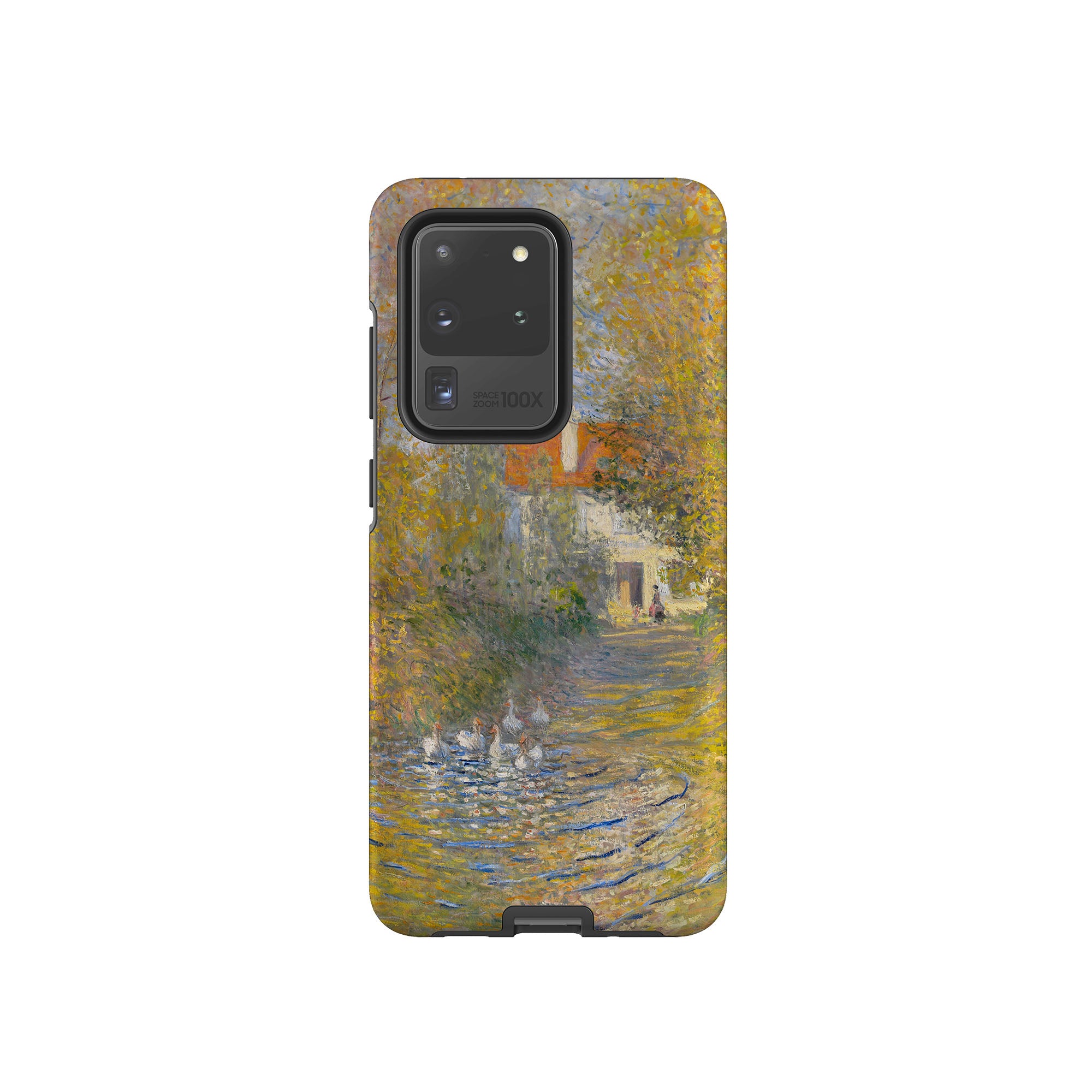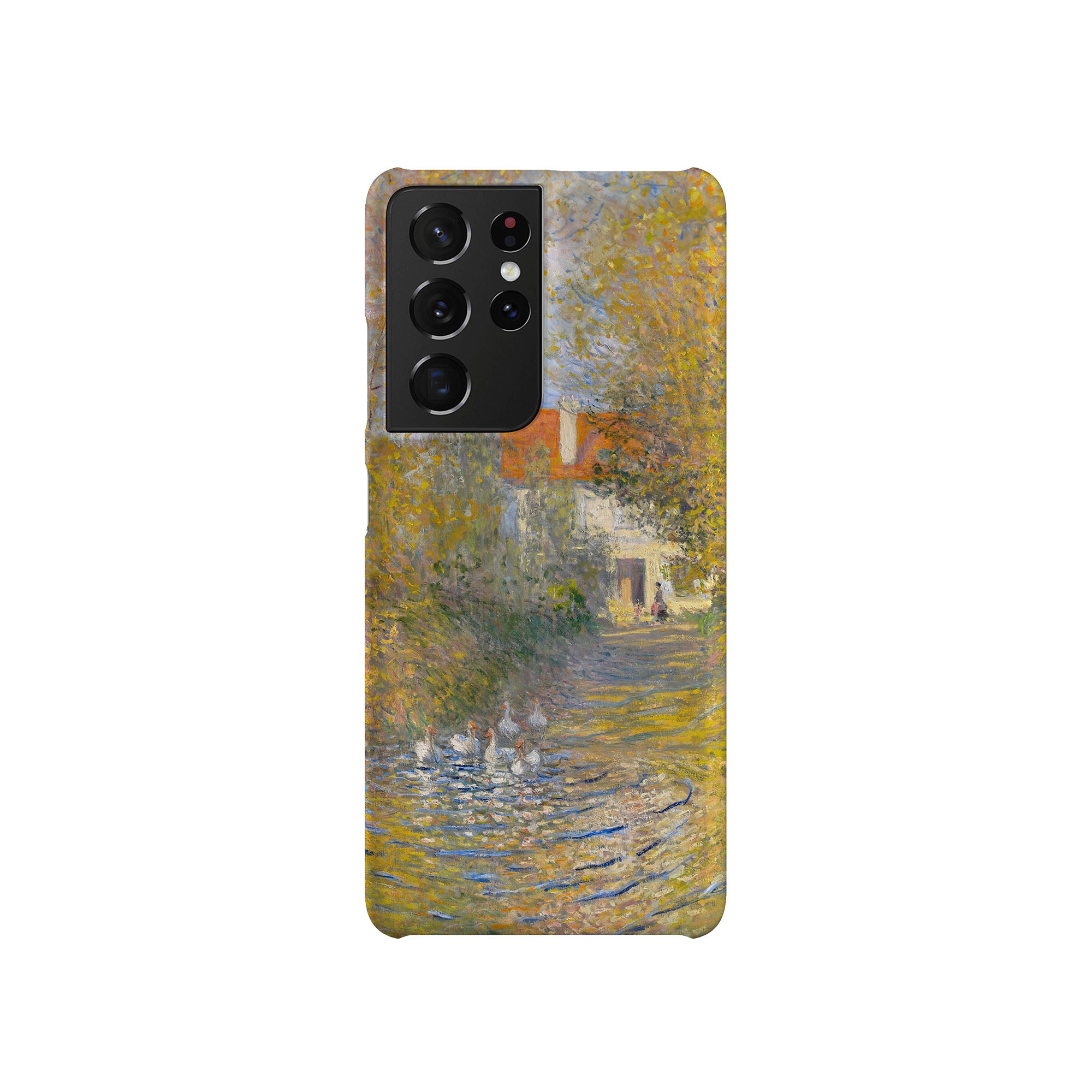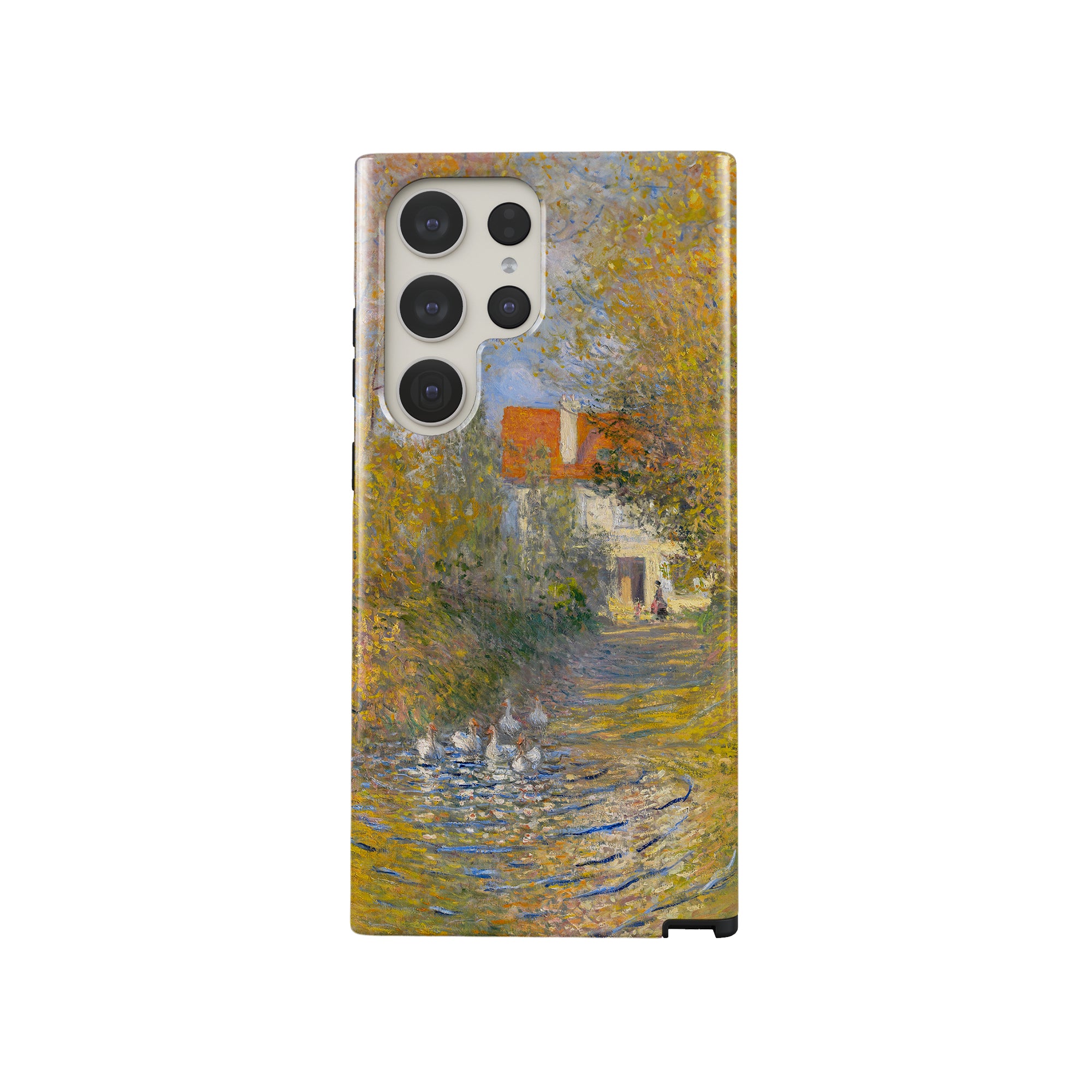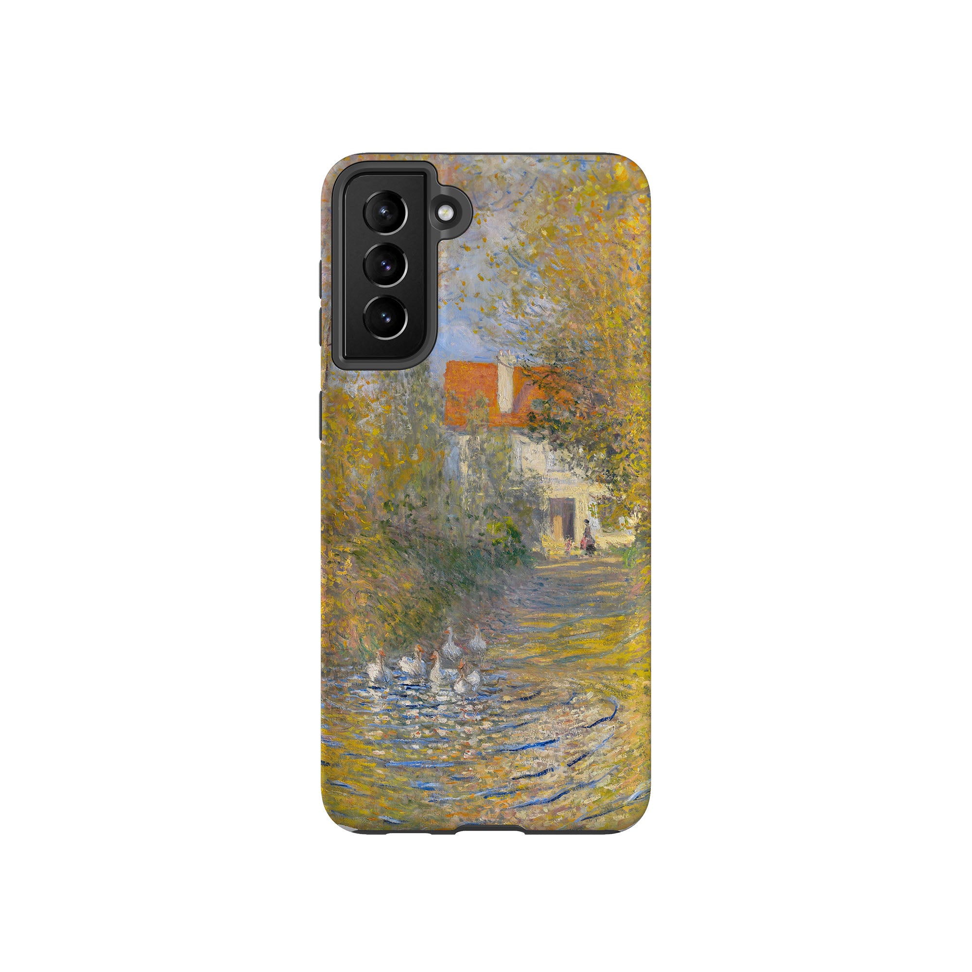 Claude Monet’s “The Geese” depicts a tranquil rural scene with geese swimming in a sunlit pond, surrounded by lush autumn foliage. The soft brushstrokes and warm colors create a peaceful, idyllic atmosphere, capturing the beauty of nature and the serenity of countryside life.