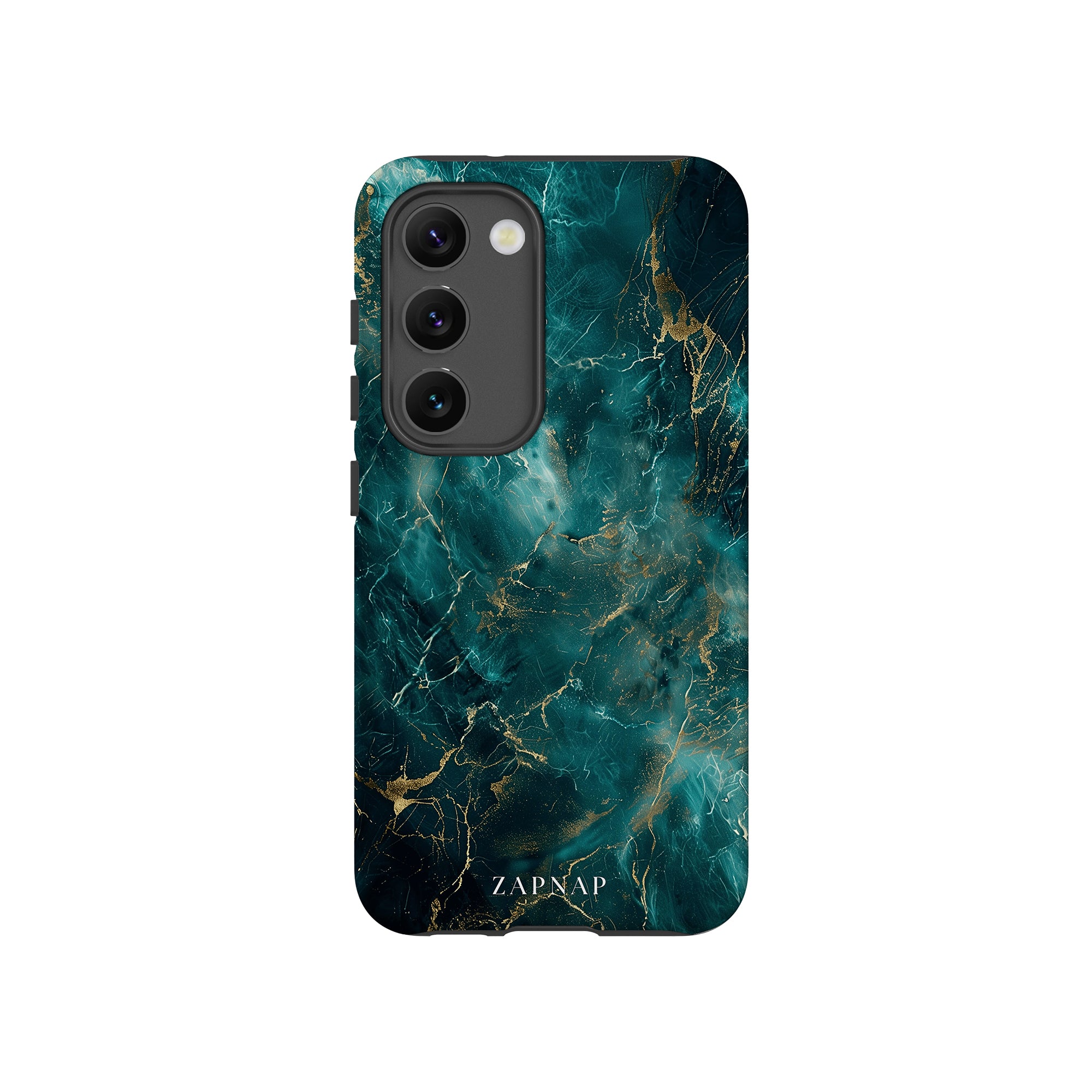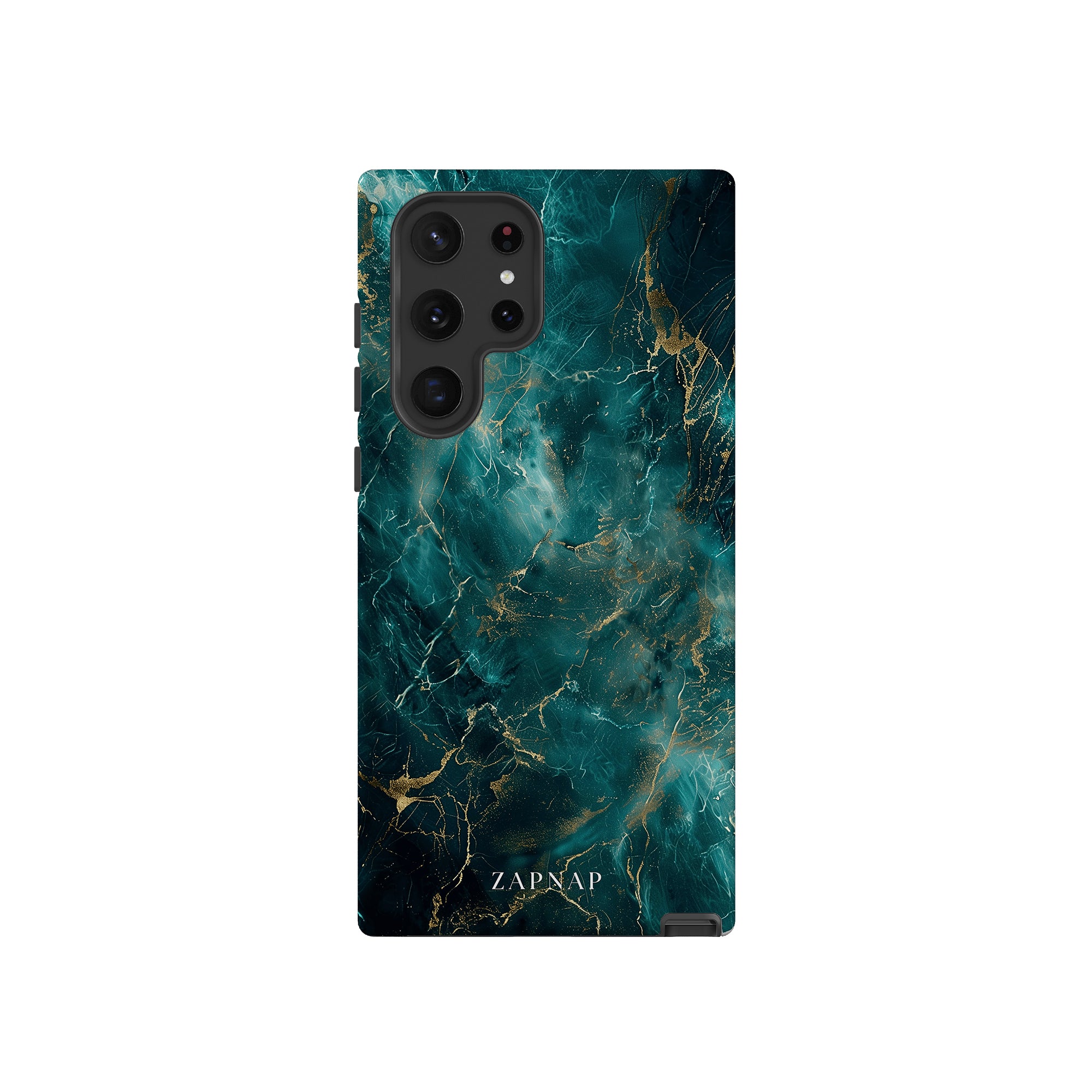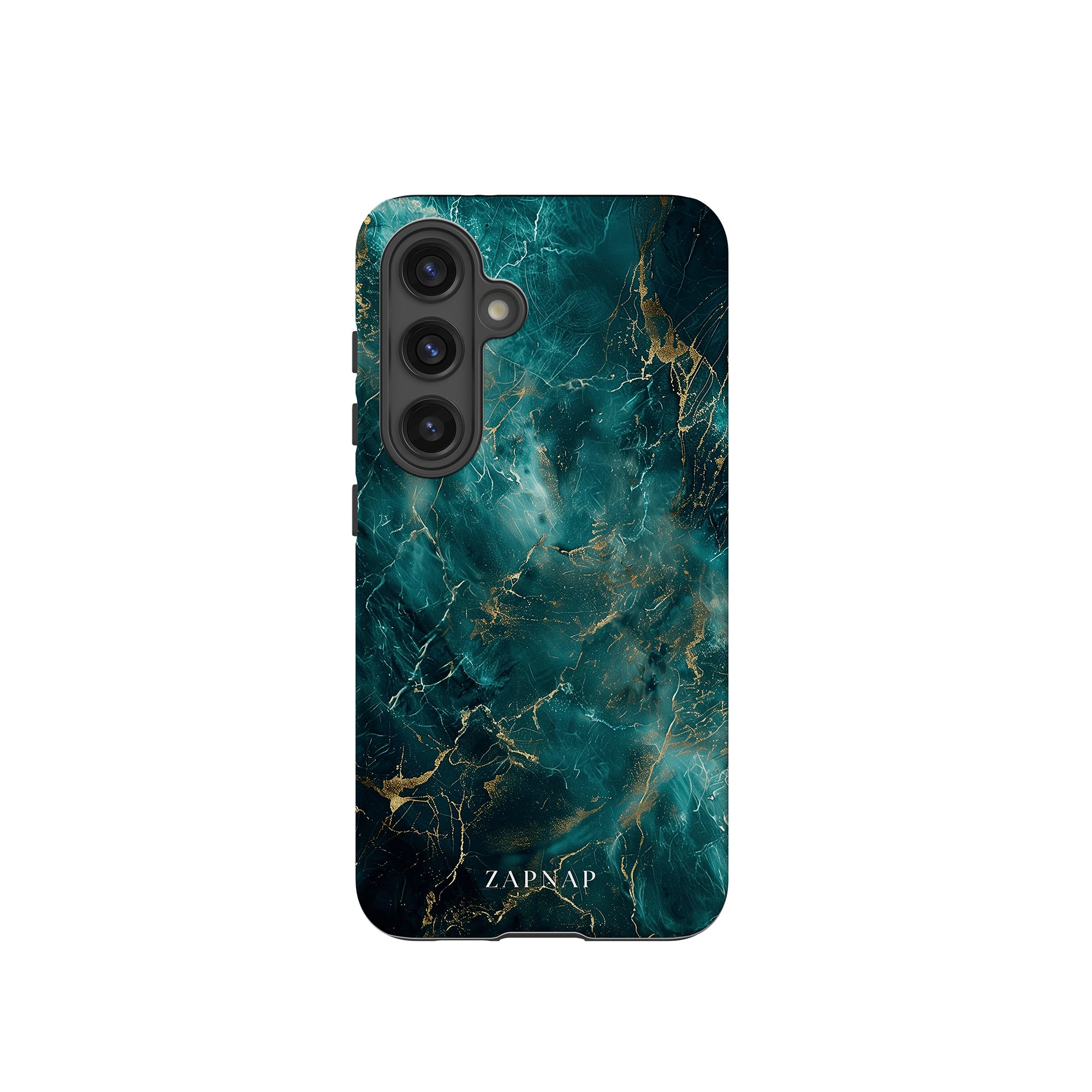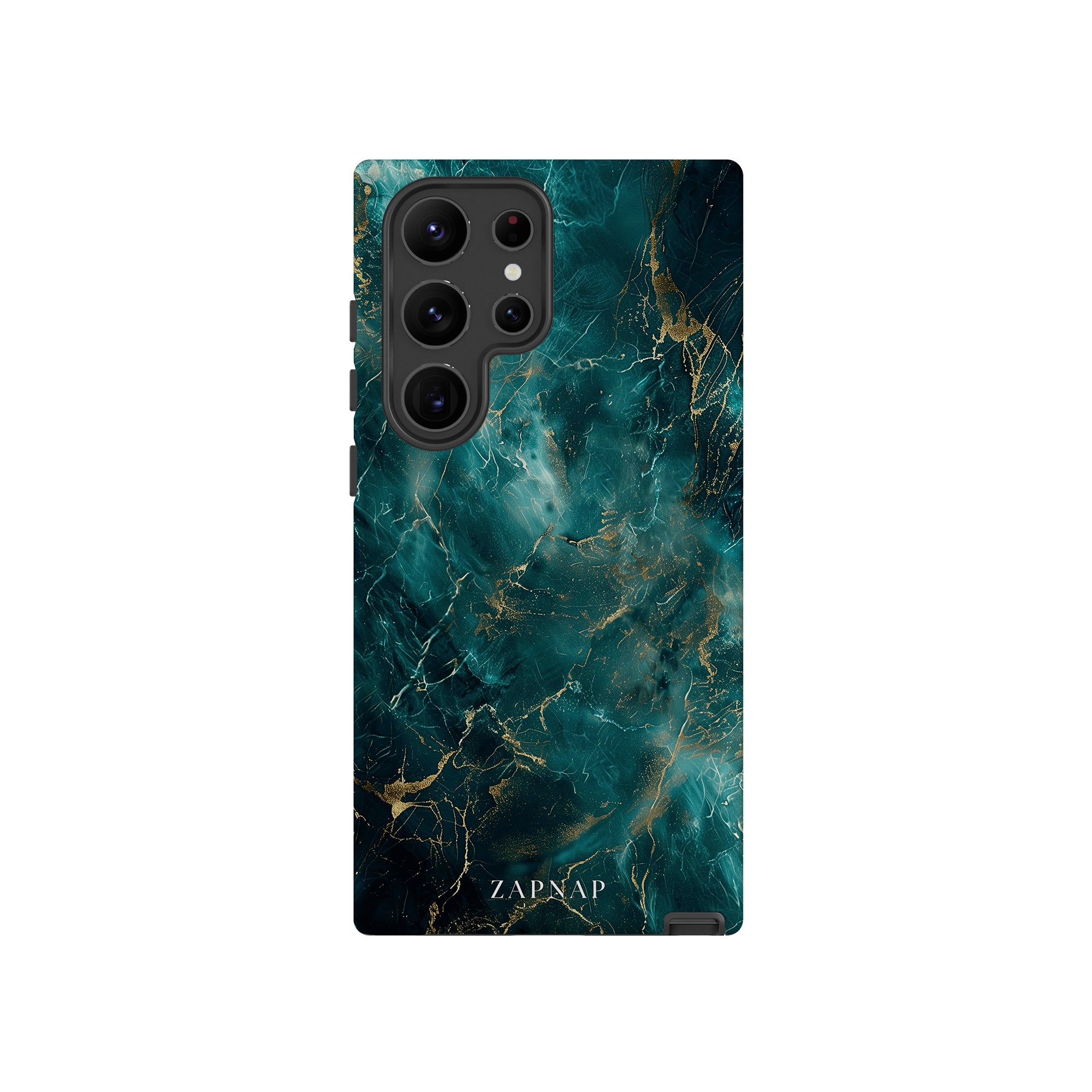 Nebula Streams is a captivating marble design reminiscent of a distant galaxy. Deep teal and turquoise hues swirl together like interstellar clouds, accented by shimmering gold veins that mimic the twinkling of stars. The intricate patterns and flowing forms create a cosmic landscape, evoking the awe and mystery of the universe.