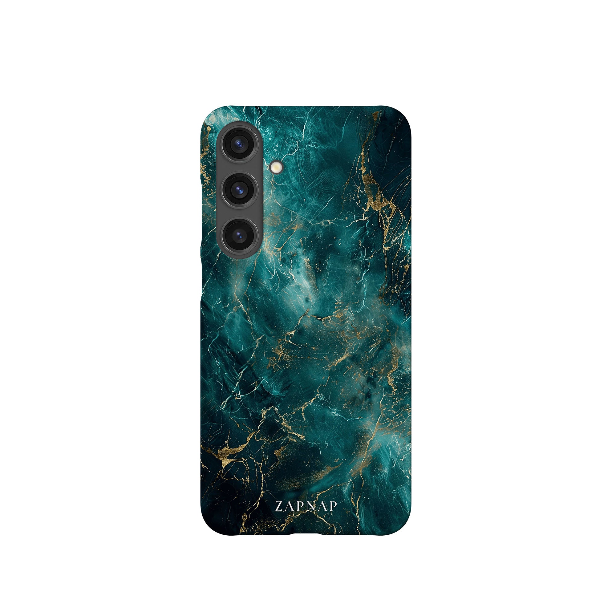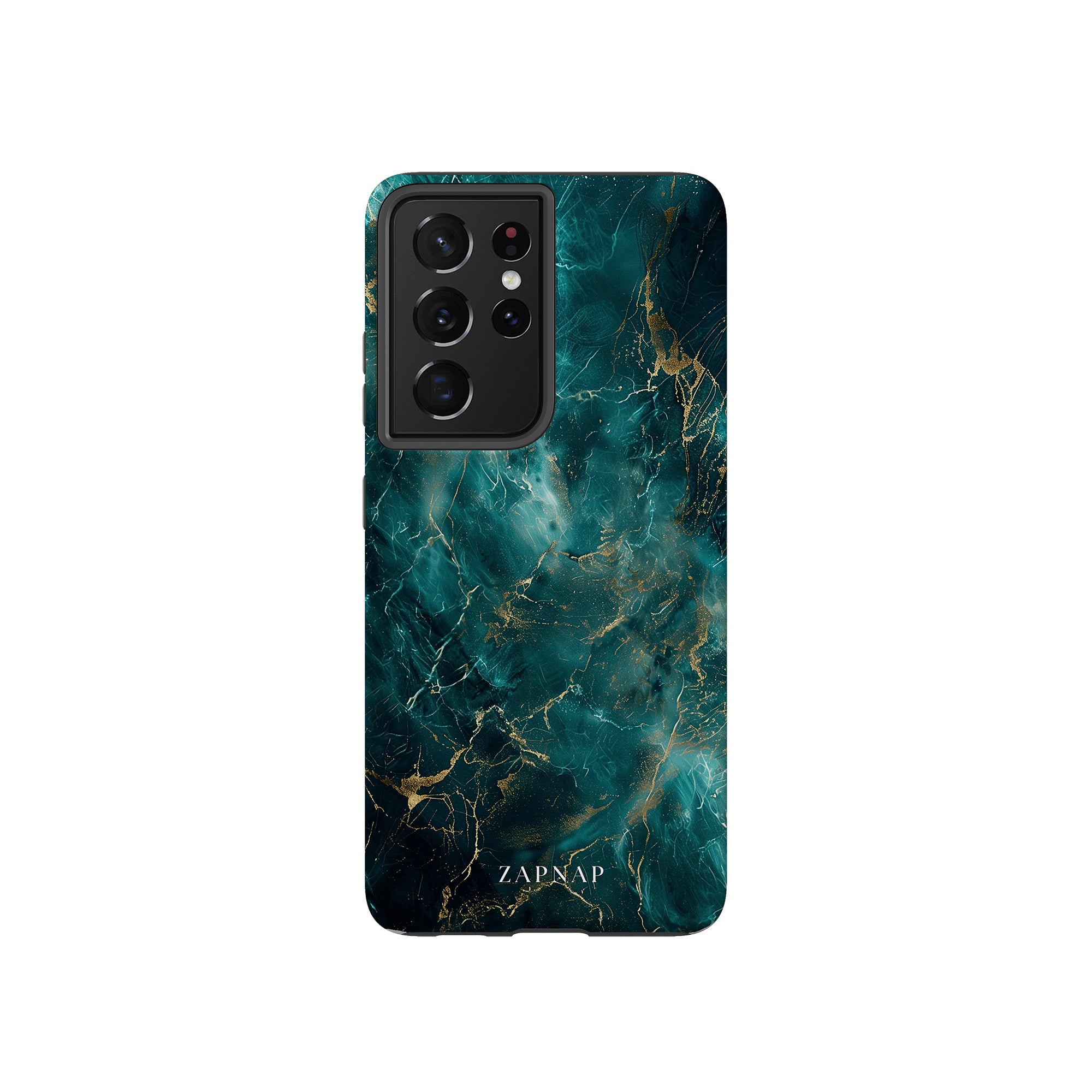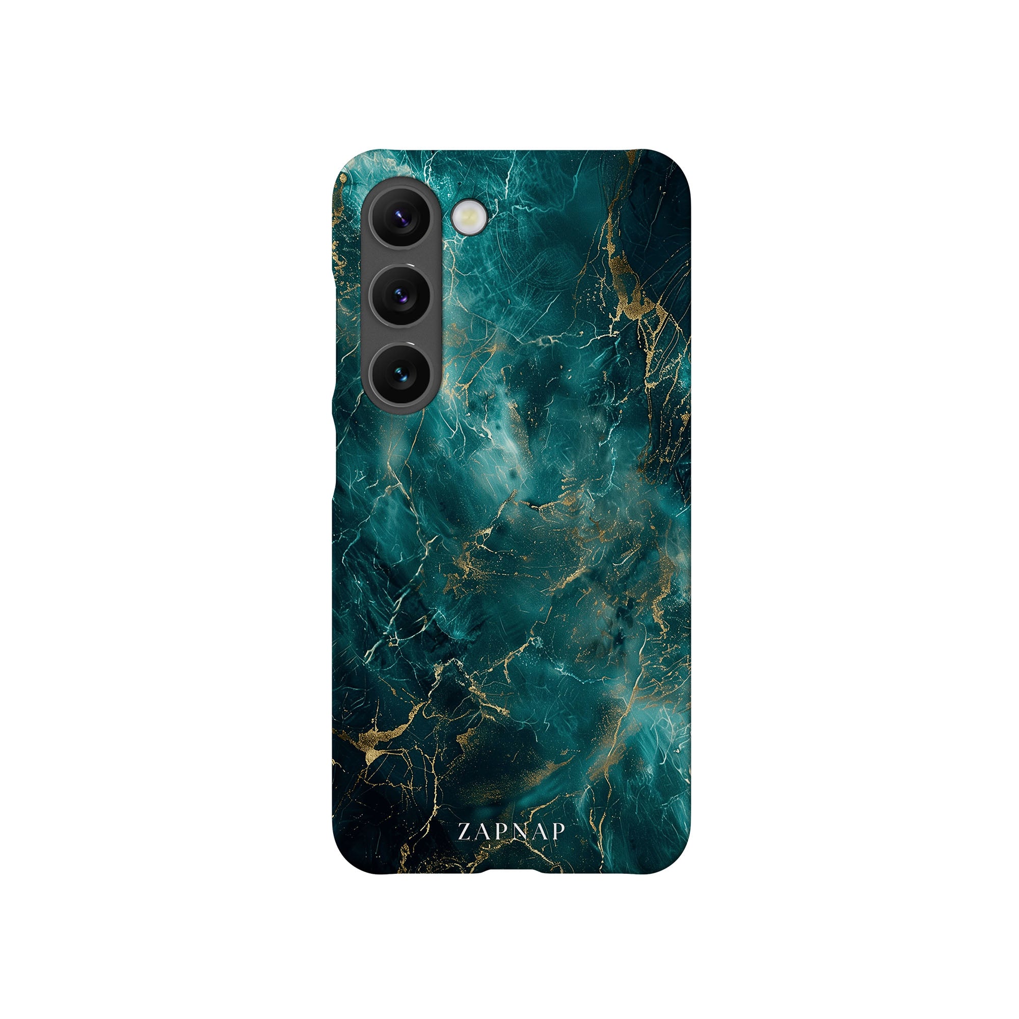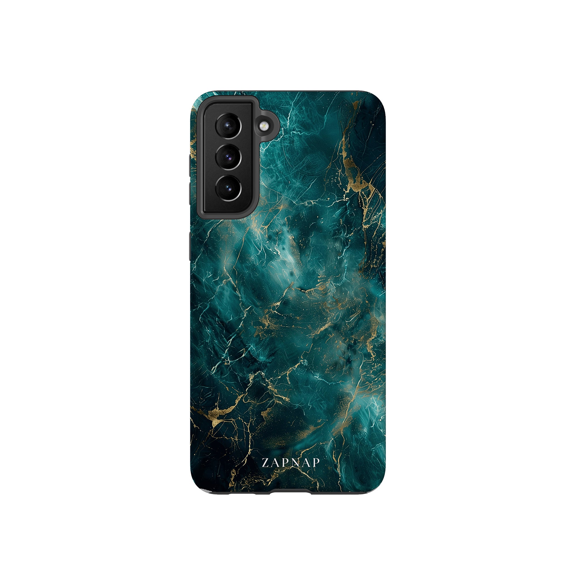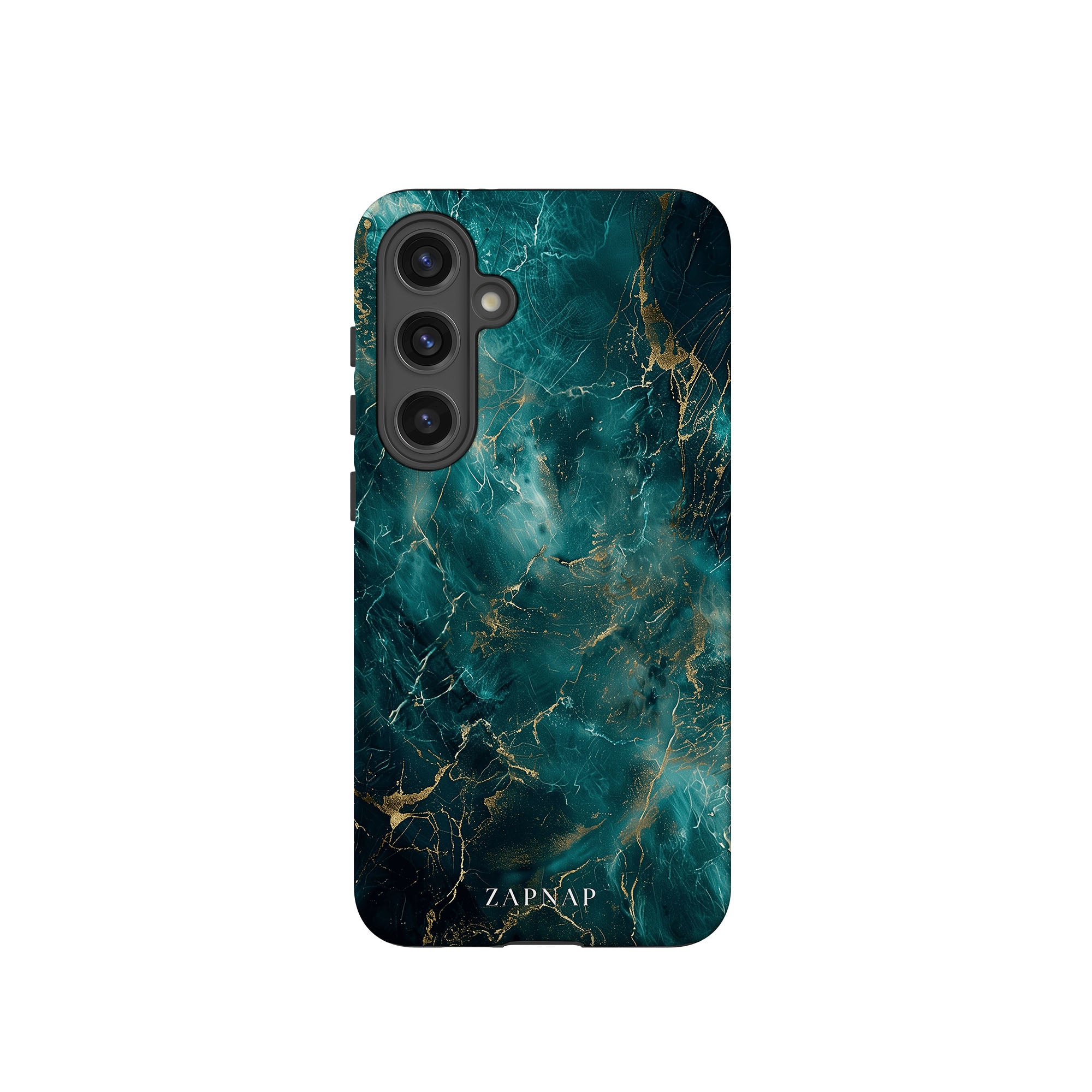 Nebula Streams is a captivating marble design reminiscent of a distant galaxy. Deep teal and turquoise hues swirl together like interstellar clouds, accented by shimmering gold veins that mimic the twinkling of stars. The intricate patterns and flowing forms create a cosmic landscape, evoking the awe and mystery of the universe.