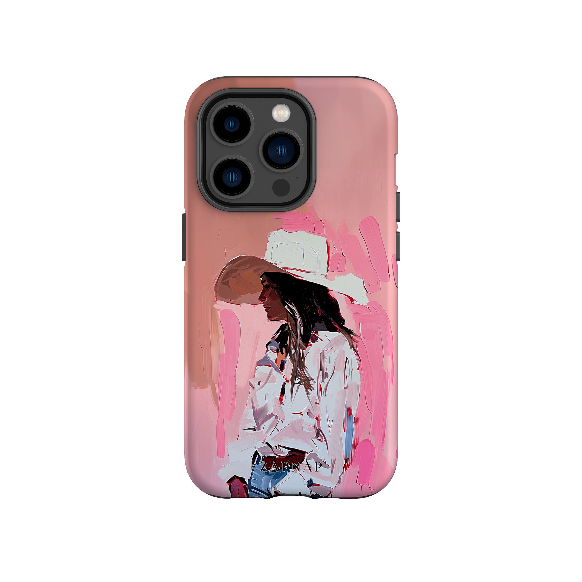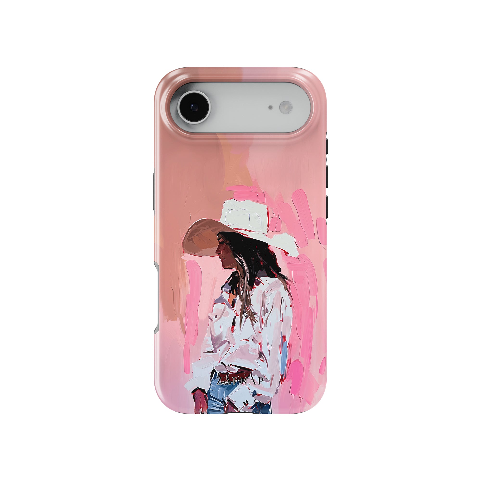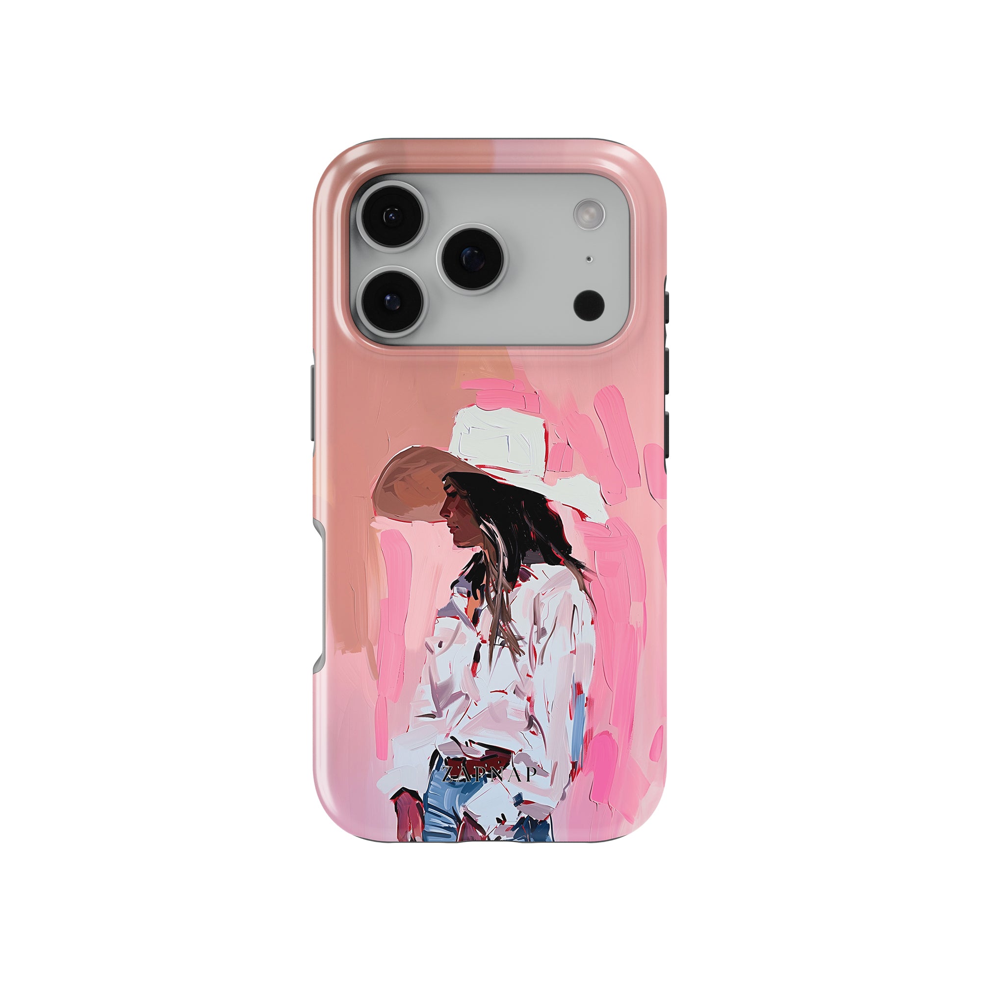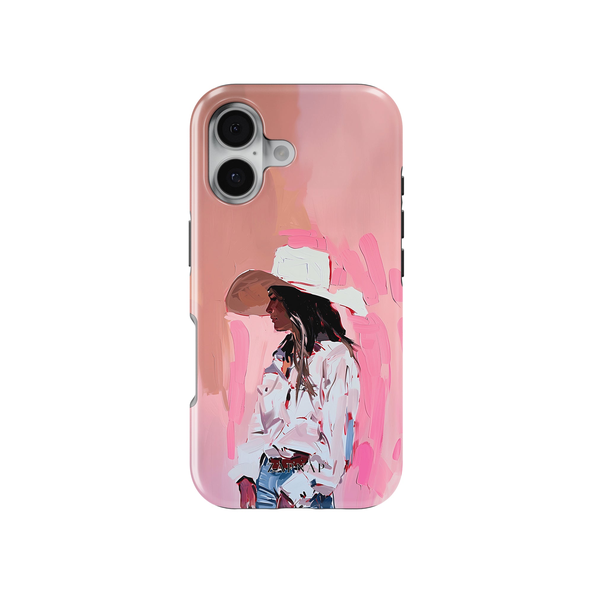 Texas Serenade portretteert een contemplatieve cowgirl, die de essentie van stille kracht en gratie vastlegt tegen een achtergrond van zachte, vloeiende roze tinten. De subtiele penseelstreken benadrukken haar evenwichtige houding en de tijdloze geest van de Lone Star State.