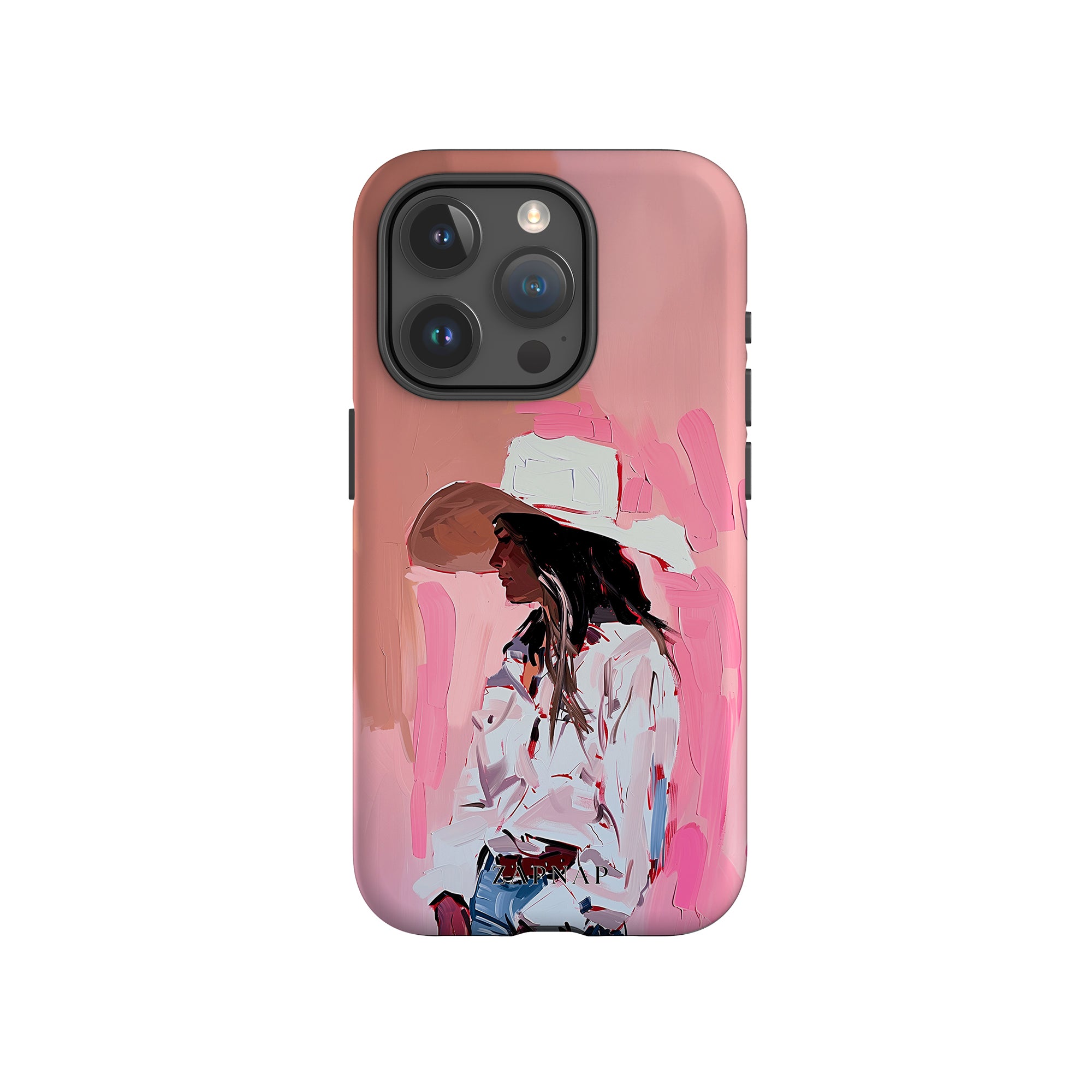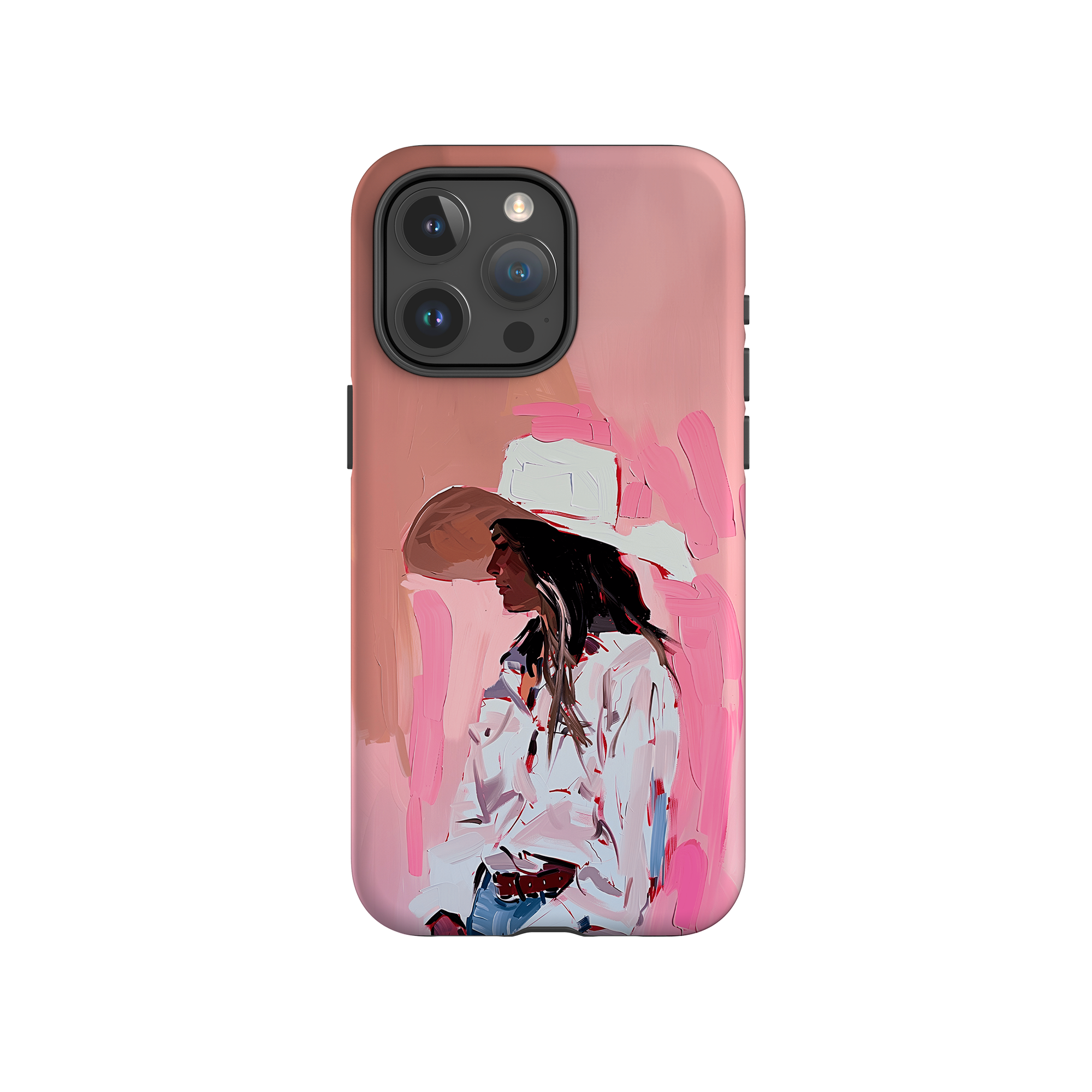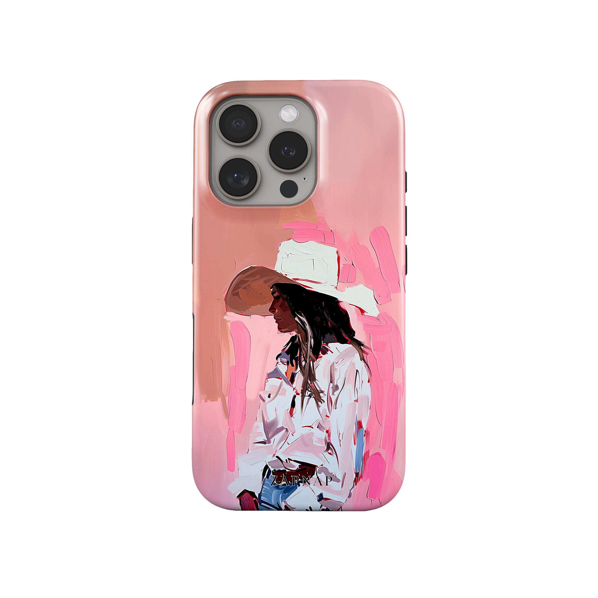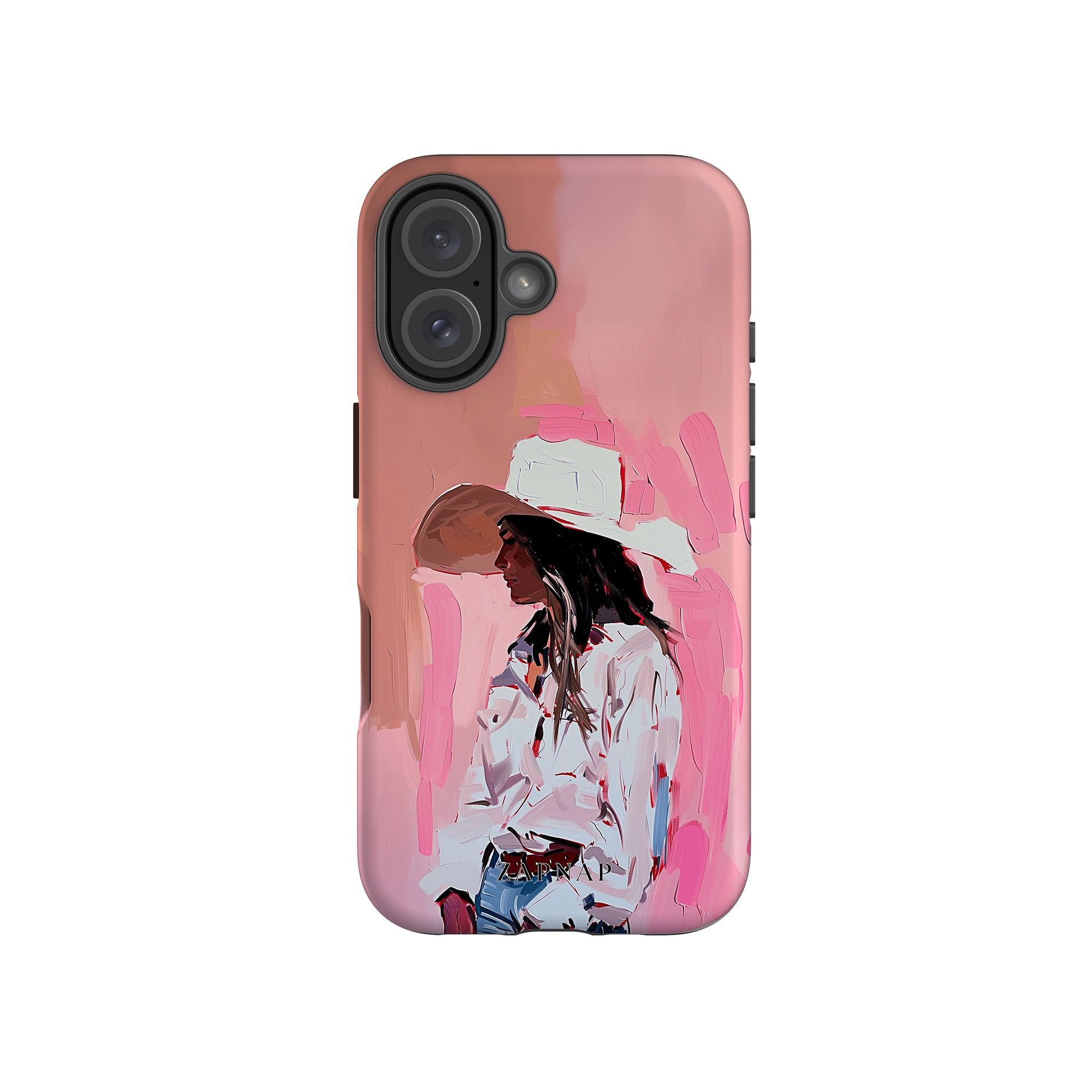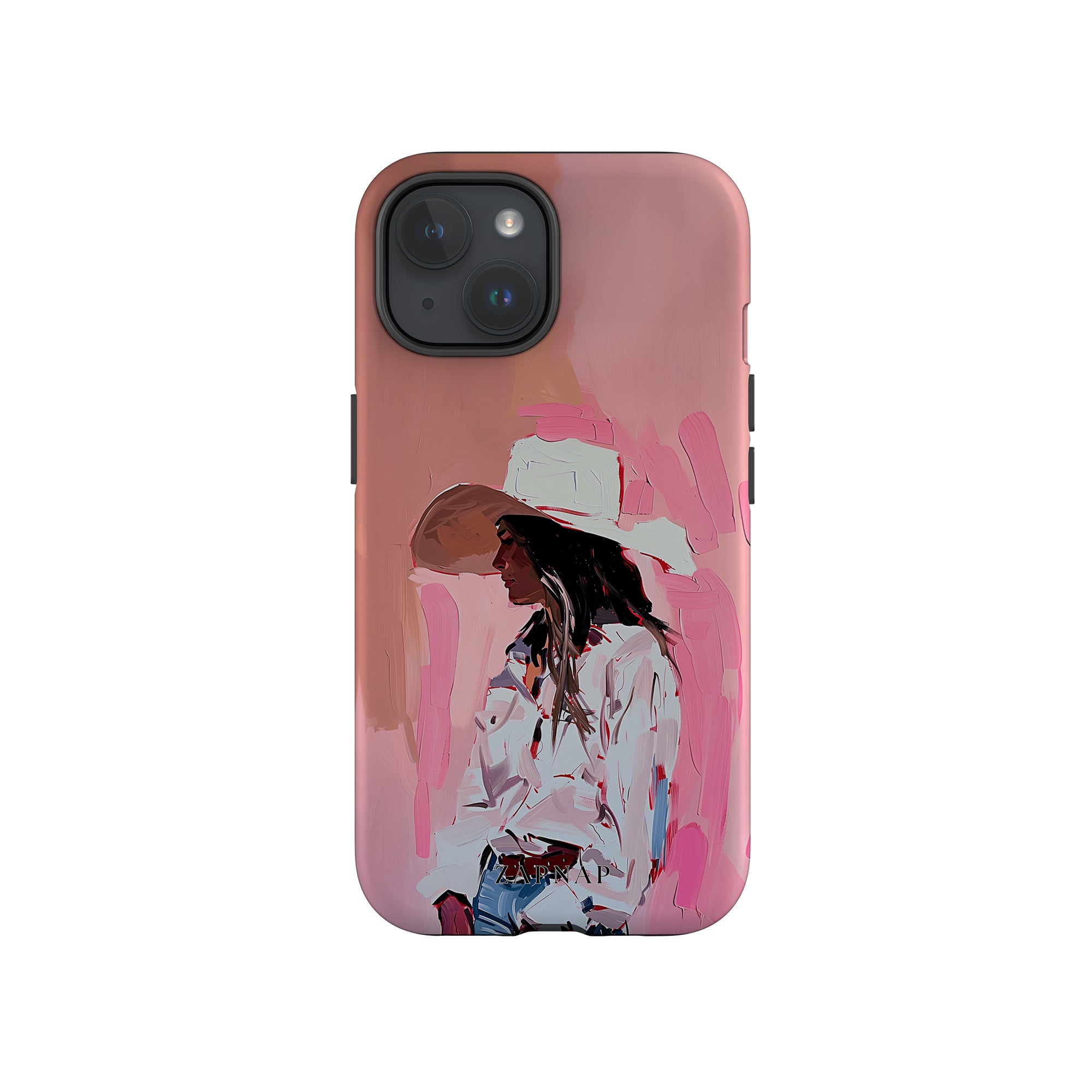 Texas Serenade portretteert een contemplatieve cowgirl, die de essentie van stille kracht en gratie vastlegt tegen een achtergrond van zachte, vloeiende roze tinten. De subtiele penseelstreken benadrukken haar evenwichtige houding en de tijdloze geest van de Lone Star State.