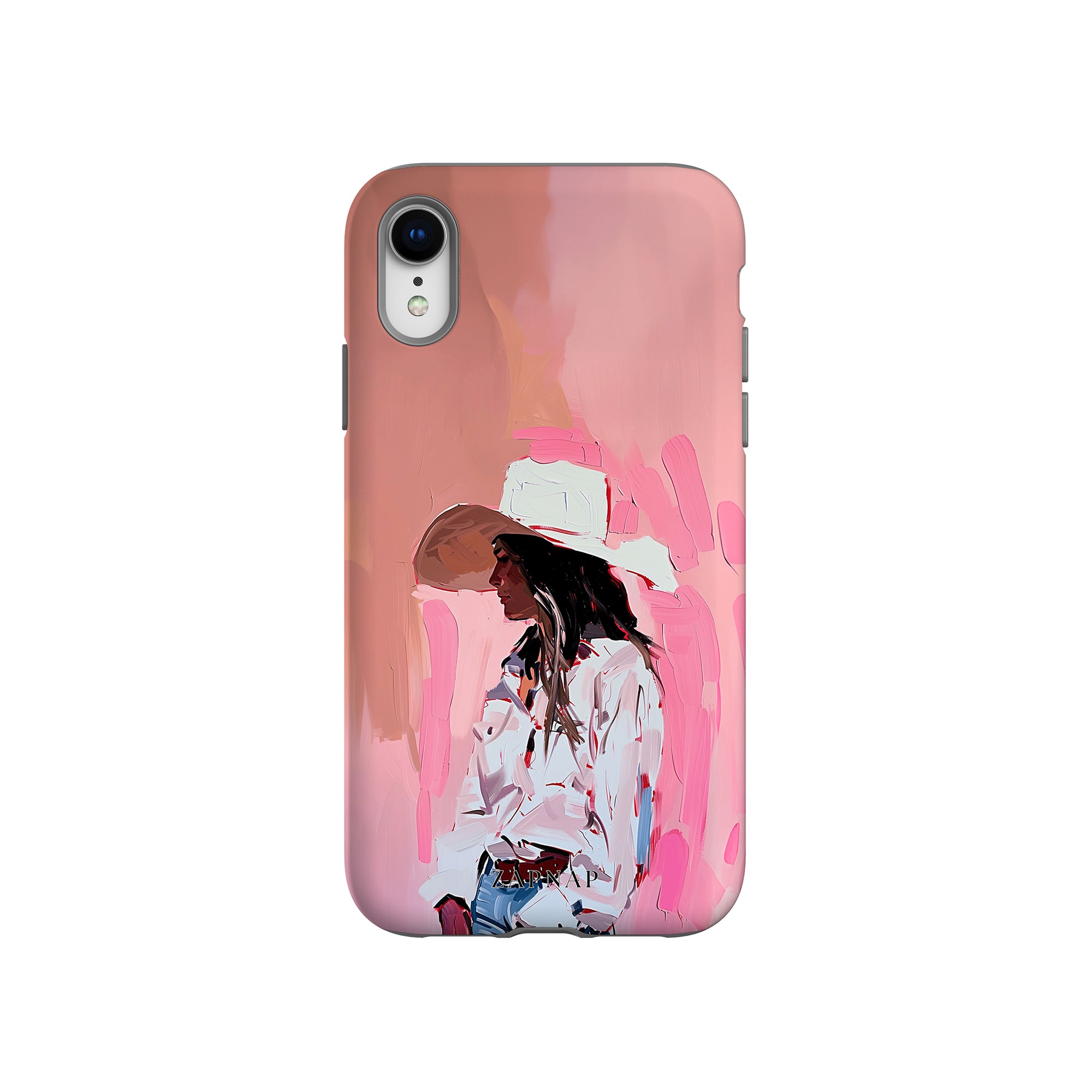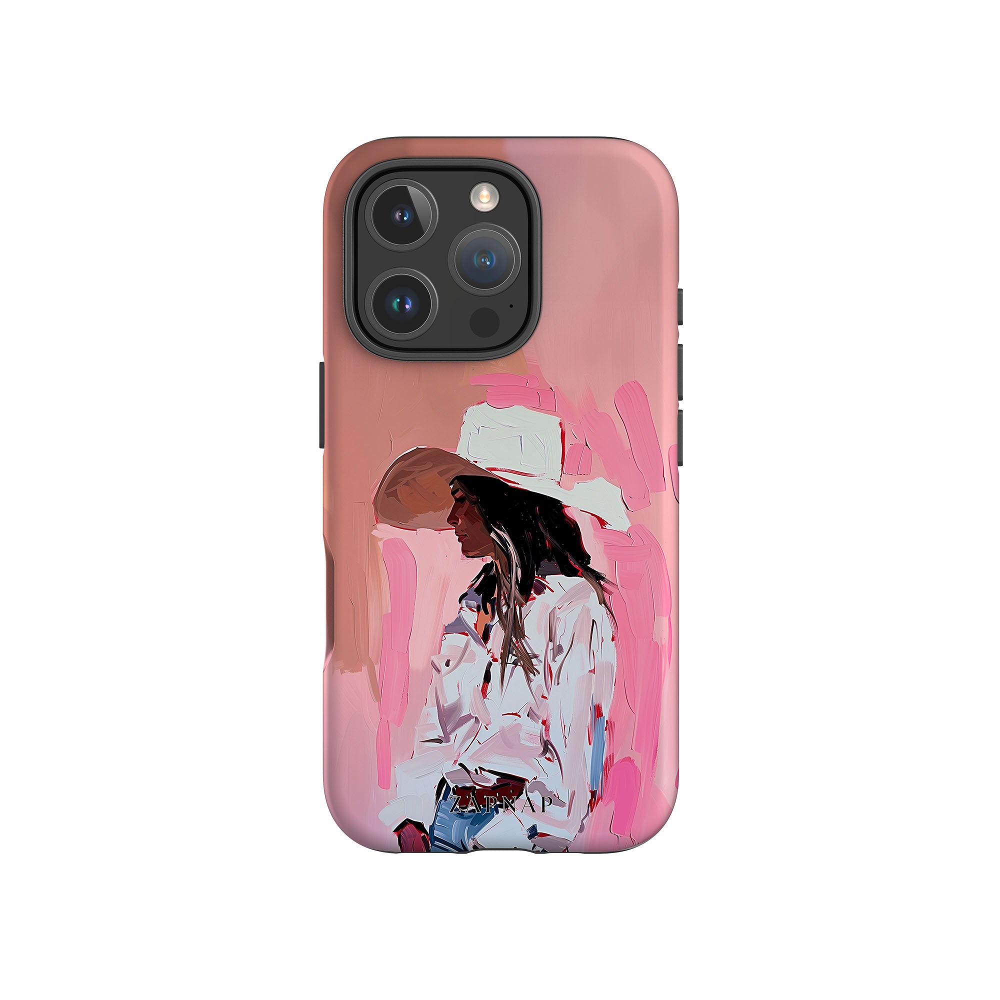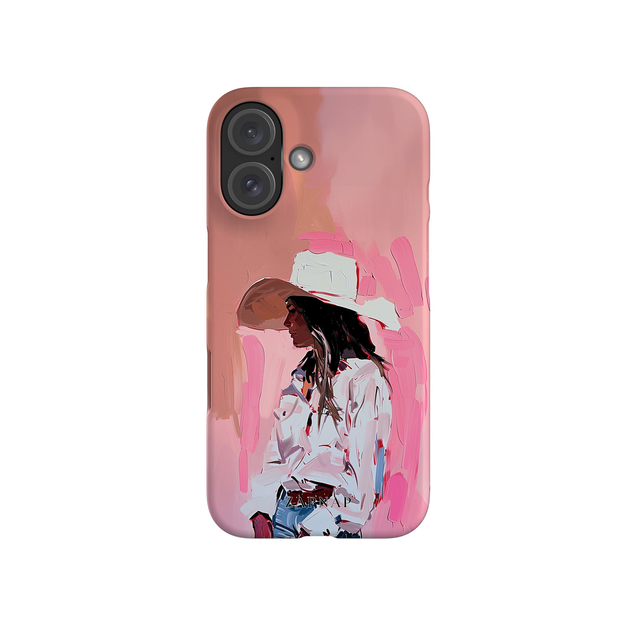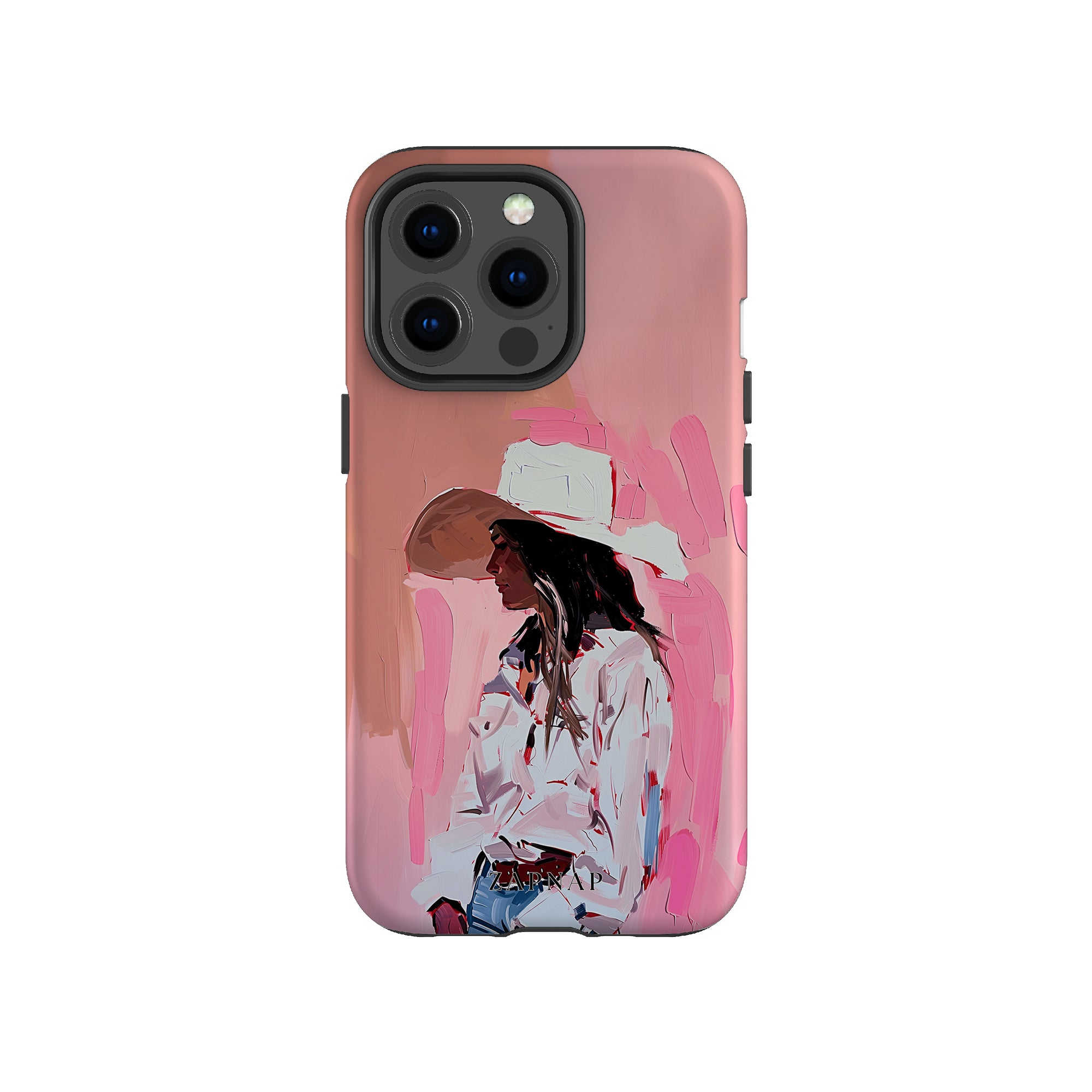 Texas Serenade portretteert een contemplatieve cowgirl, die de essentie van stille kracht en gratie vastlegt tegen een achtergrond van zachte, vloeiende roze tinten. De subtiele penseelstreken benadrukken haar evenwichtige houding en de tijdloze geest van de Lone Star State.
